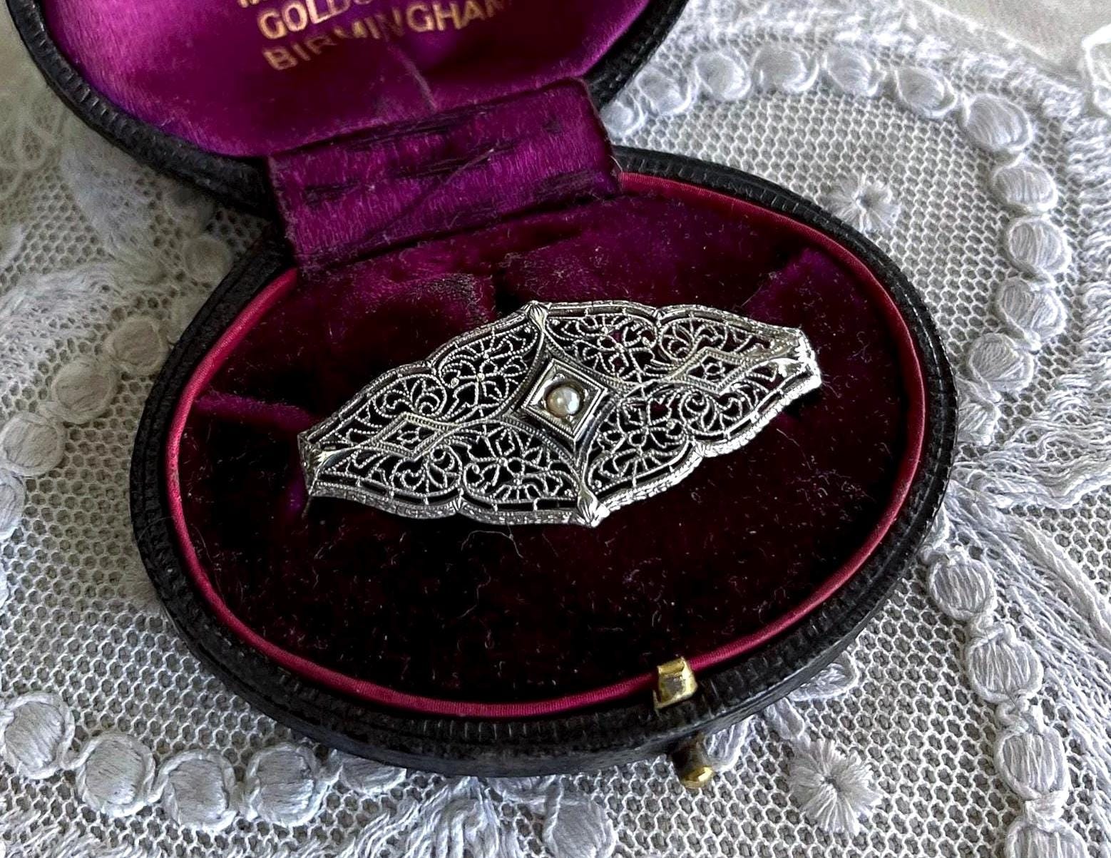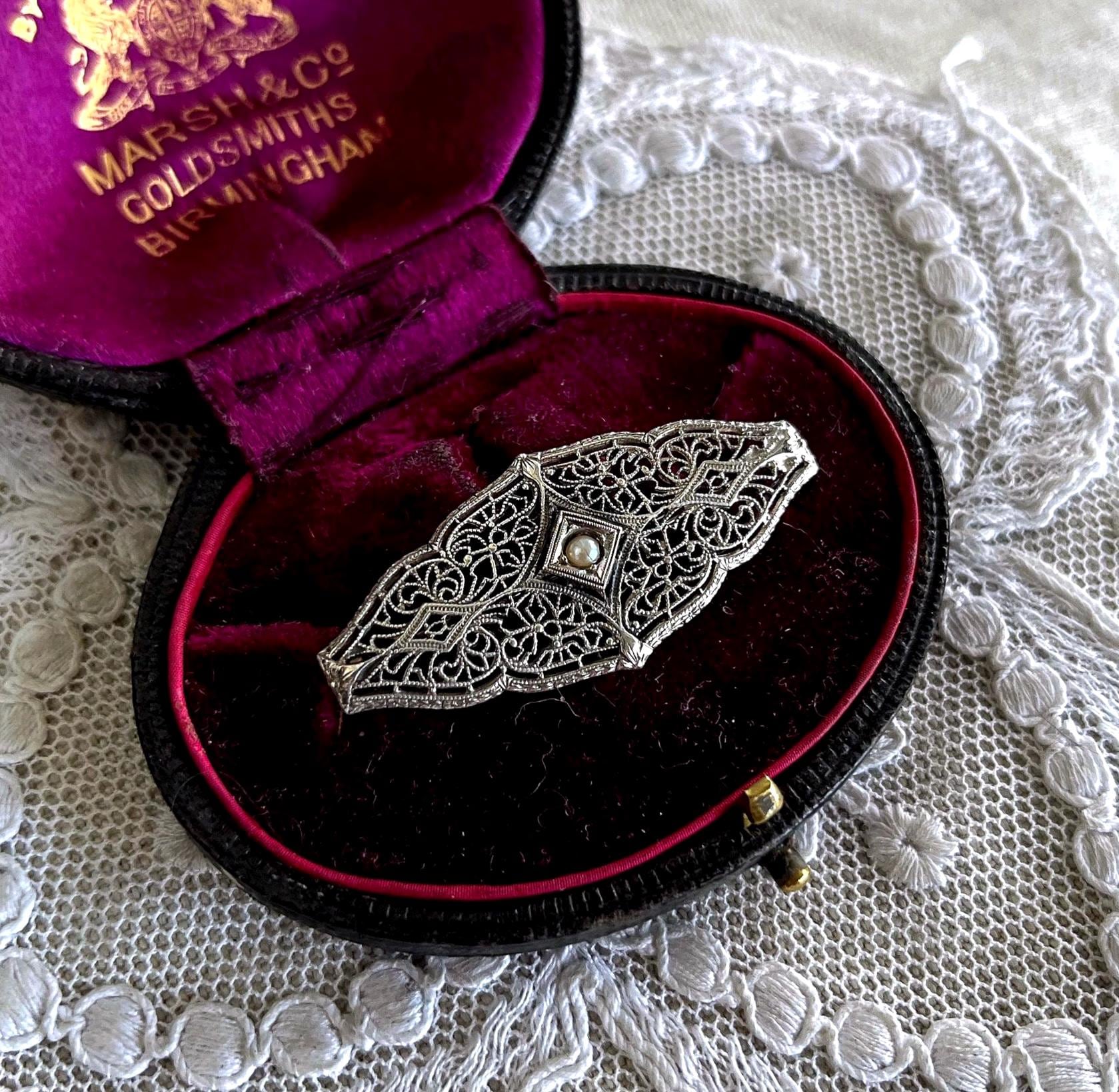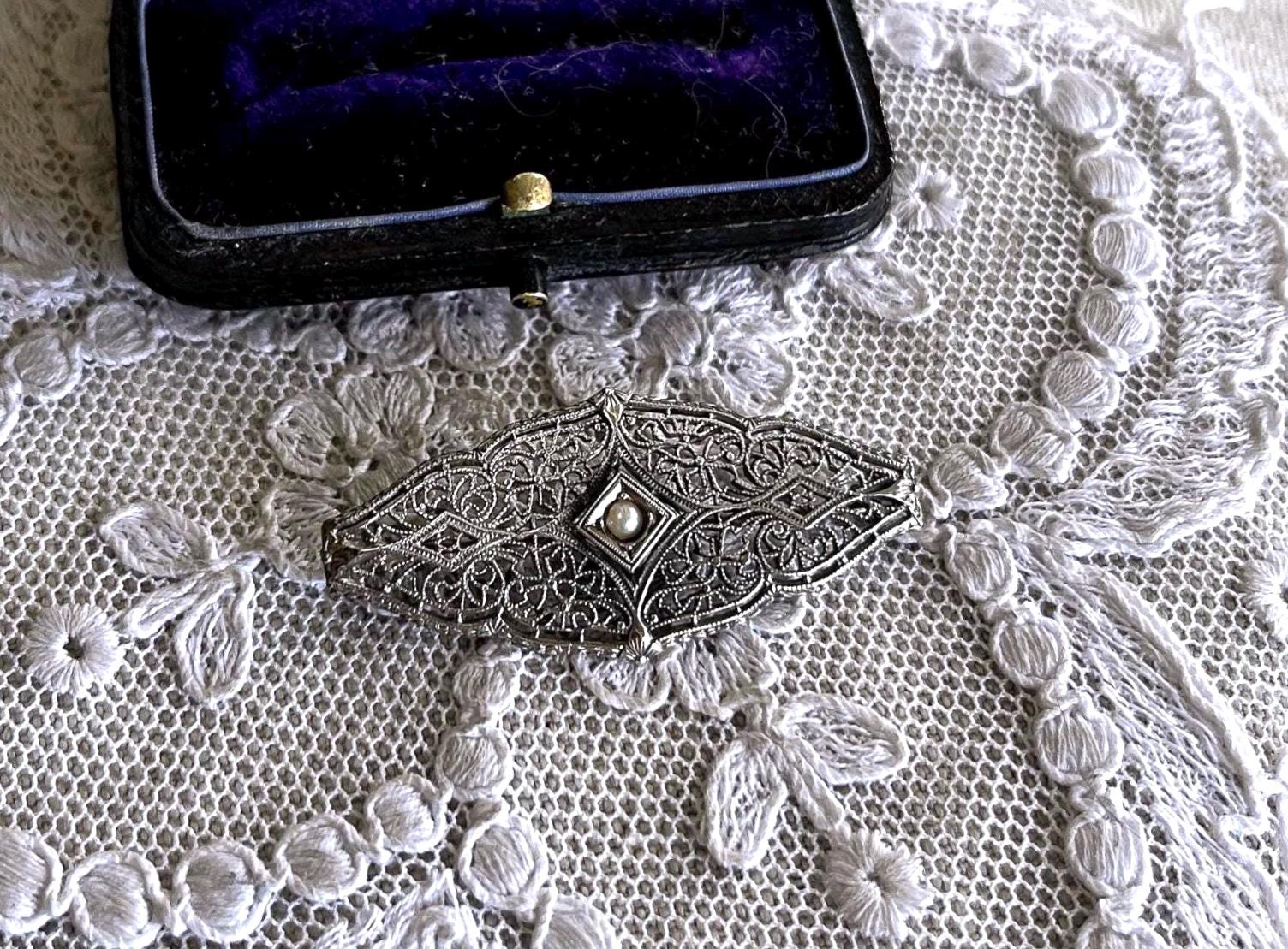 Featuring a lovely vintage 1930s Art Deco Edwardian design delicate rhodium plated sterling silver filigree lapel brooch accented with a luminous genuine seed pearl. Brooch measures approximately 1.8 inches long at 2.52 grams respectively and is in excellent antique condition with virtually no wear, a functional Clasp with all stones intact and accounted for. Brooch is unsigned, beautifully made and wonderful collectible piece!