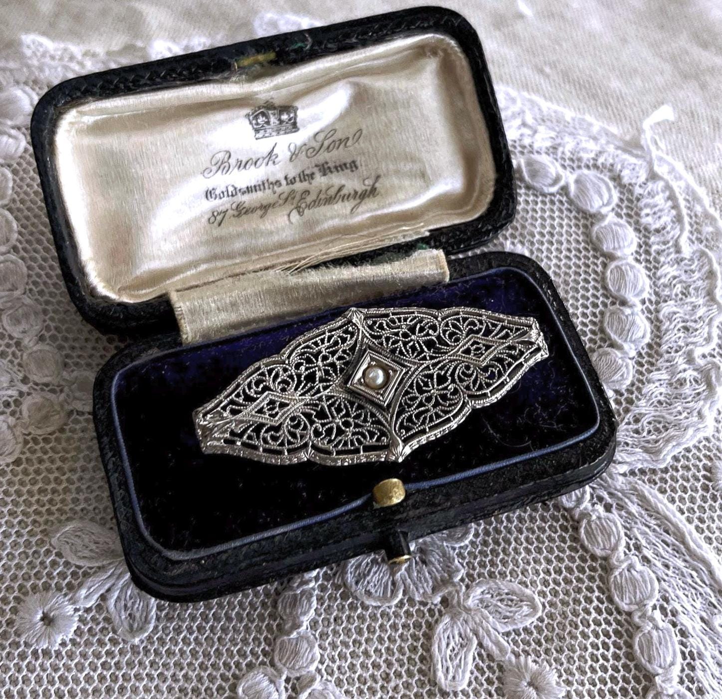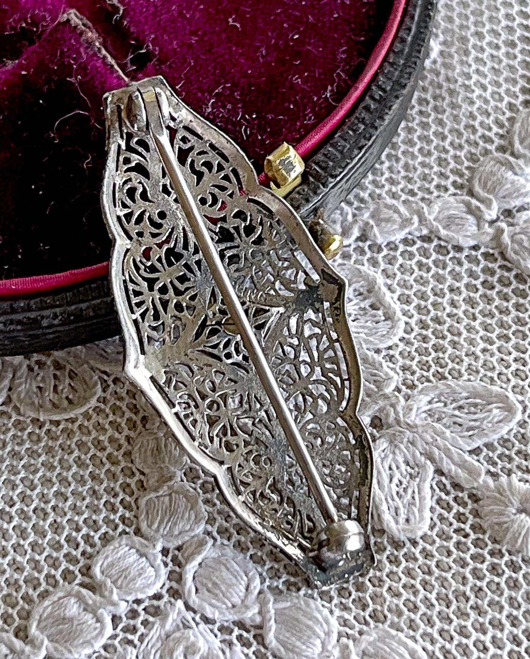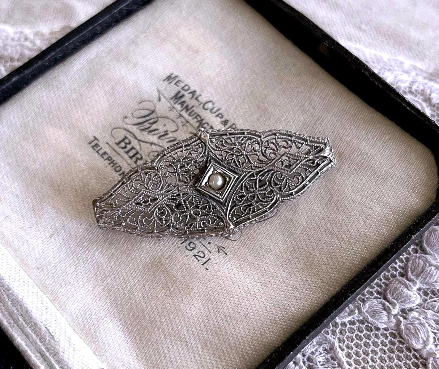 Featuring a lovely vintage 1930s Art Deco Edwardian design delicate rhodium plated sterling silver filigree lapel brooch accented with a luminous genuine seed pearl. Brooch measures approximately 1.8 inches long at 2.52 grams respectively and is in excellent antique condition with virtually no wear, a functional Clasp with all stones intact and accounted for. Brooch is unsigned, beautifully made and wonderful collectible piece!