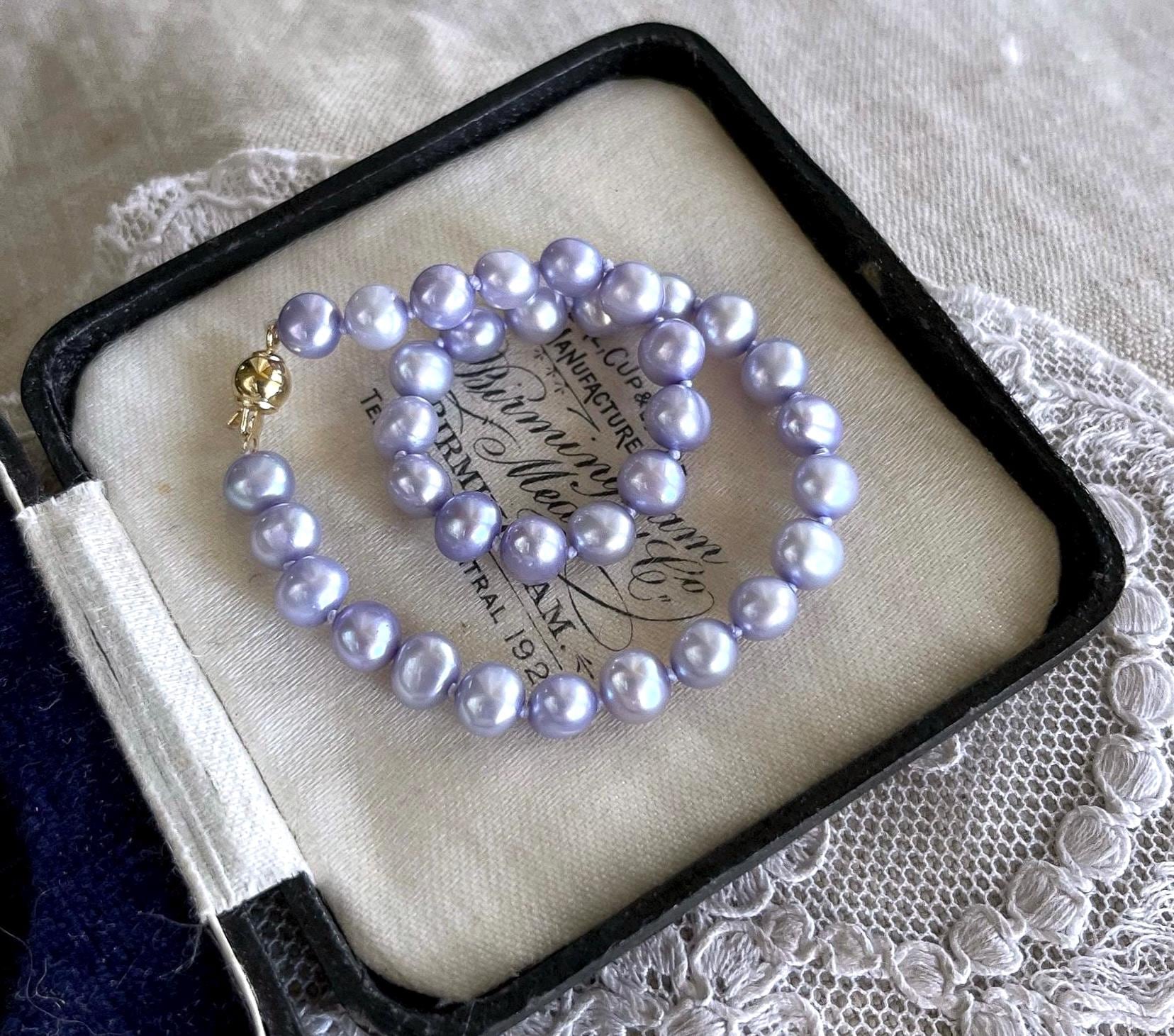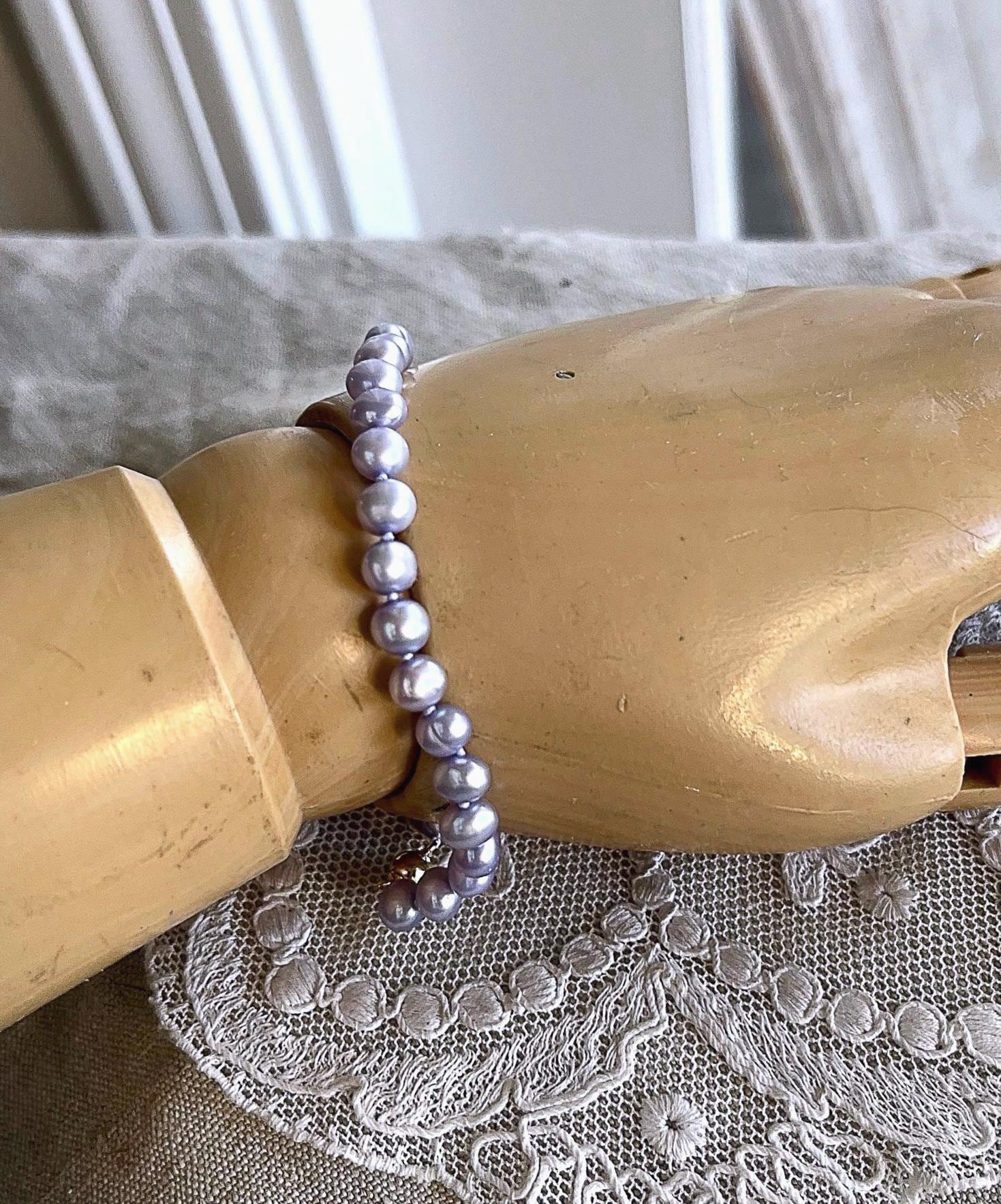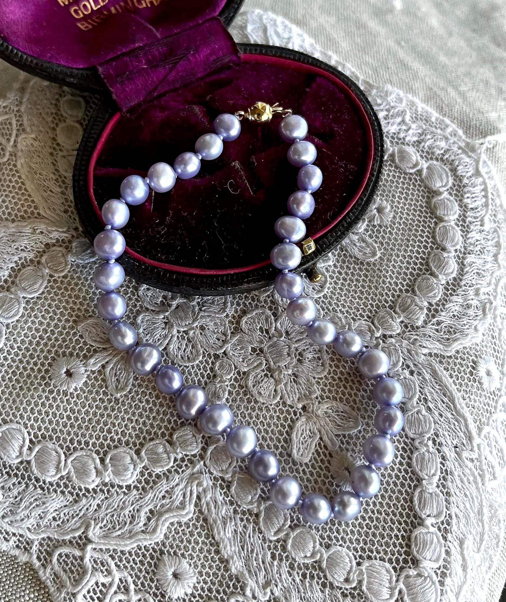 Featuring a retired Jacmel Mauritius luminous genuine Lavender Pearl hand knotted bracelet adorned with a solid 14k gold clasp. Bracelet is in beautiful condition with a functional clasp, virtually no wear with all components intact, hallmarked on clasp. Timeless Haute Couture, this elegant piece measures approximately 7.5 inches around at 7.50 grams respectively, collectible and wearable!