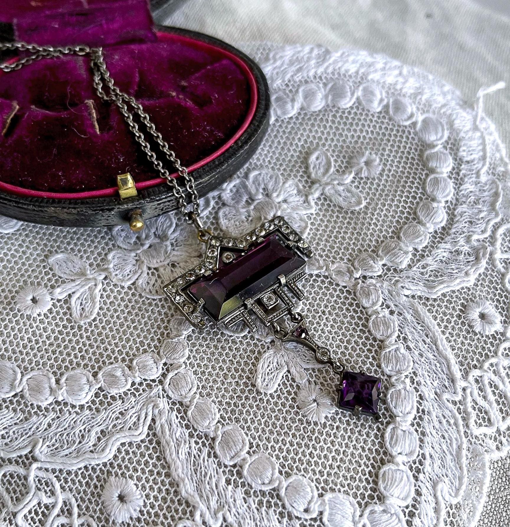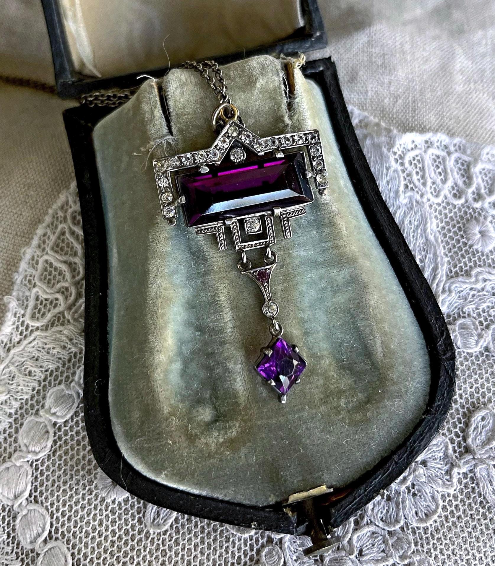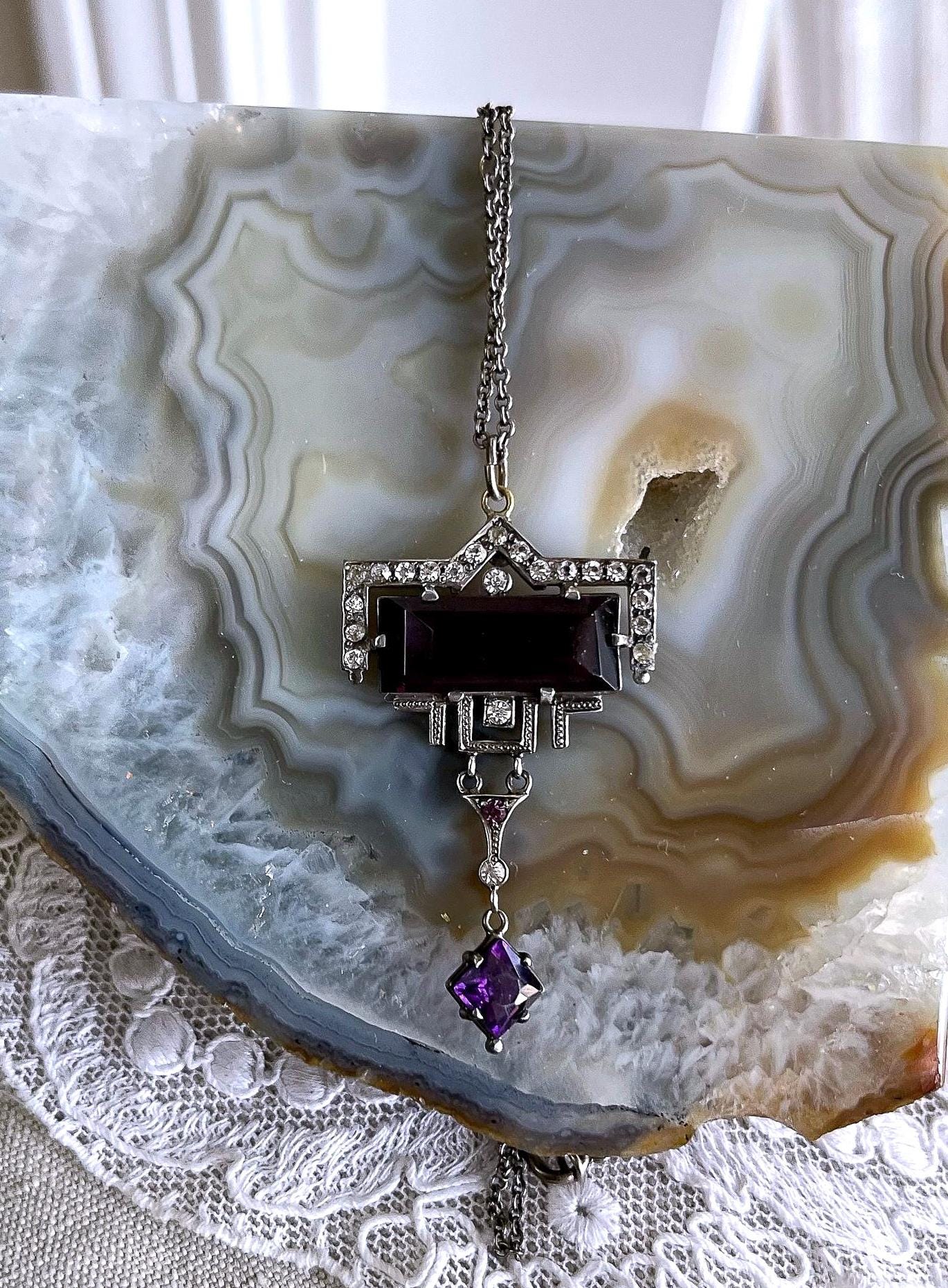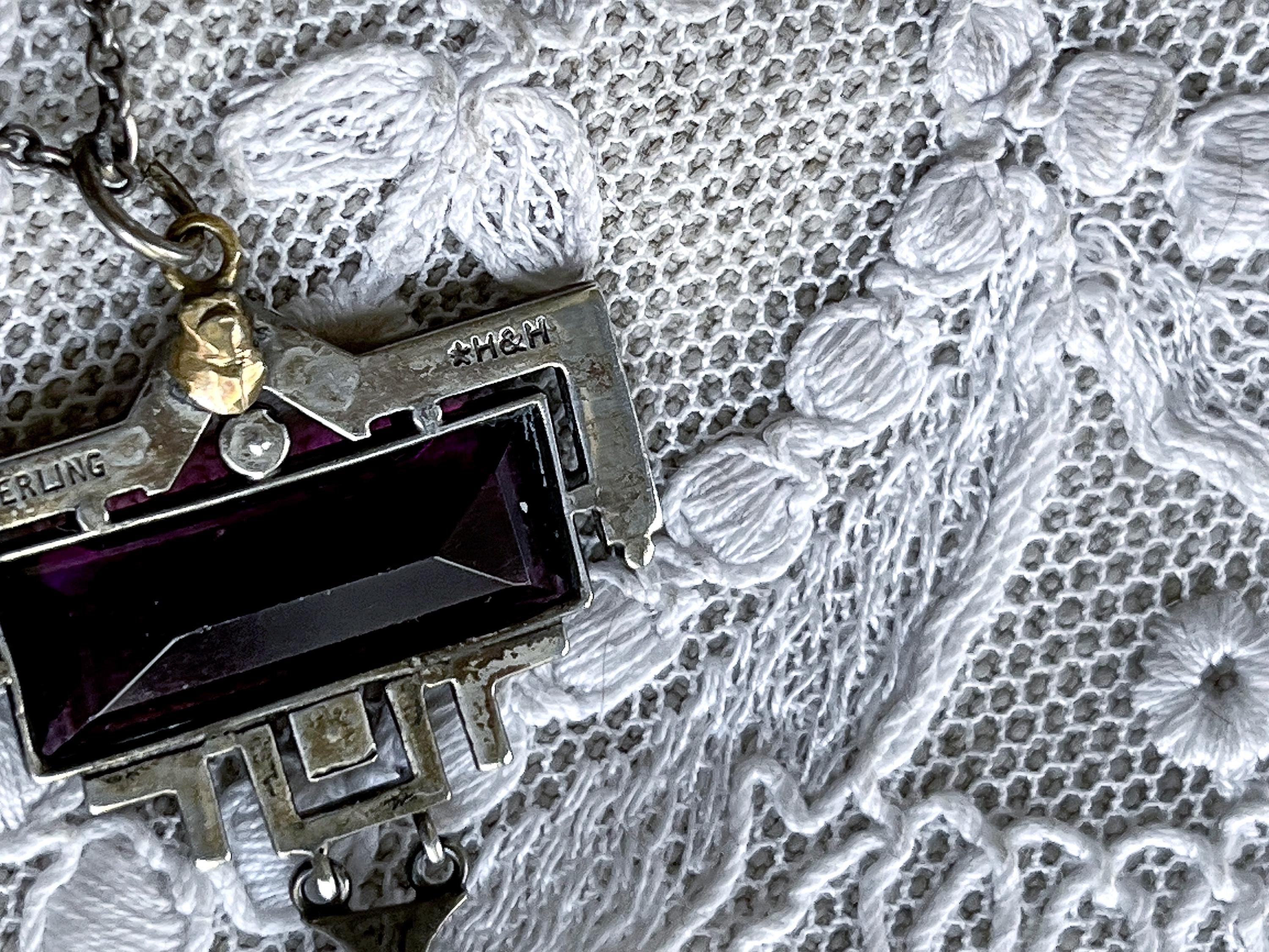 Featuring a lovely antique H&H Hamilton & Hamilton Jr Inc. fine sterling silver pendant necklace adorned with a beautiful Amethyst purple and white Paste Stone crystals set in a decorative Sterling setting. Necklace measures approximately 17 inches around with pendant measuring approximately 2.1 inches at 7.48 grams respectively. This lovely collectible necklace is in excellent antique condition with a functional stamped C spring clasp, a slight patina with all stones intact and accounted for, stamped *H&H/STERLING on the reverse of pendant . Elegant, collectible and wearable, this is a beautifully designed and elegant antique necklace!