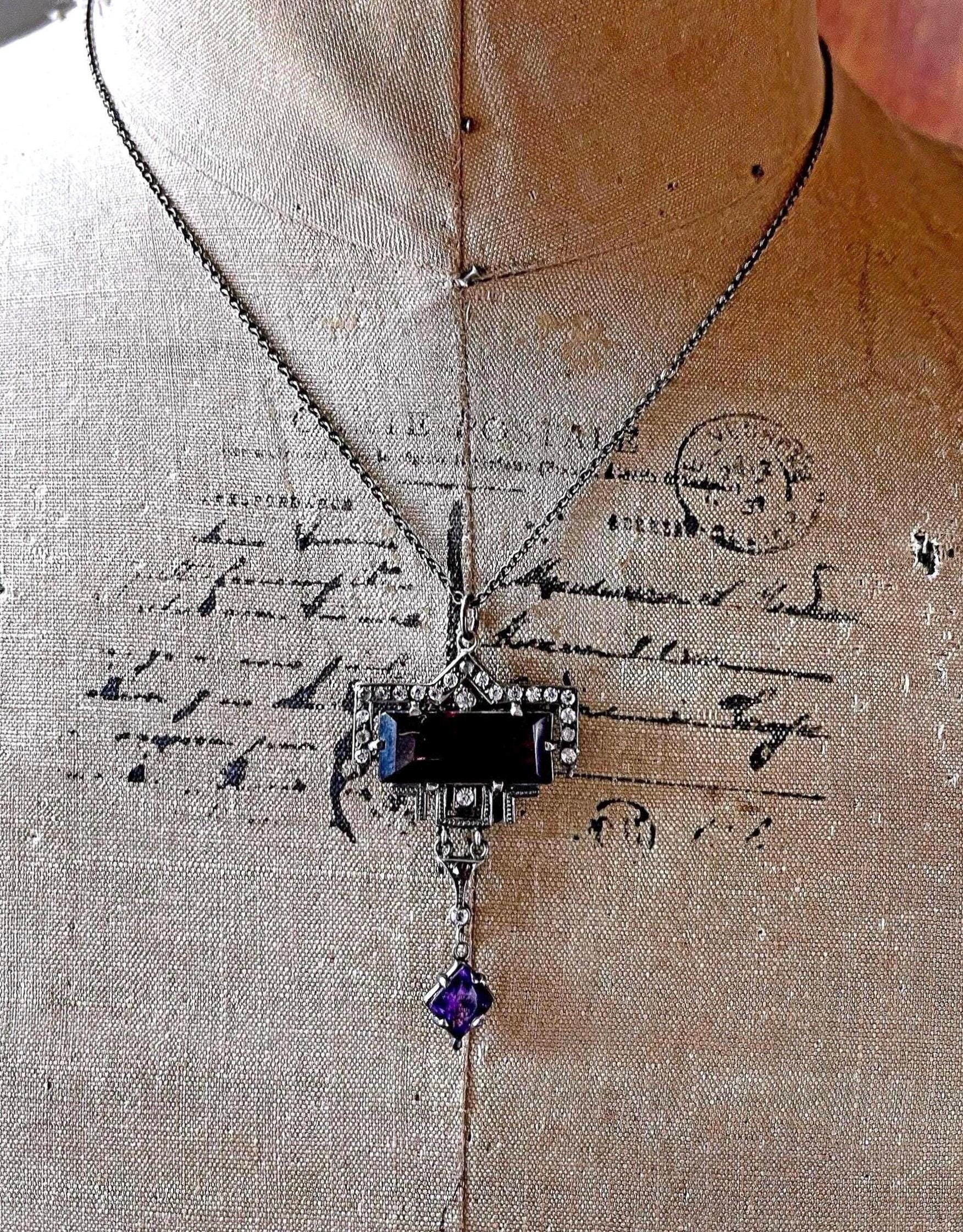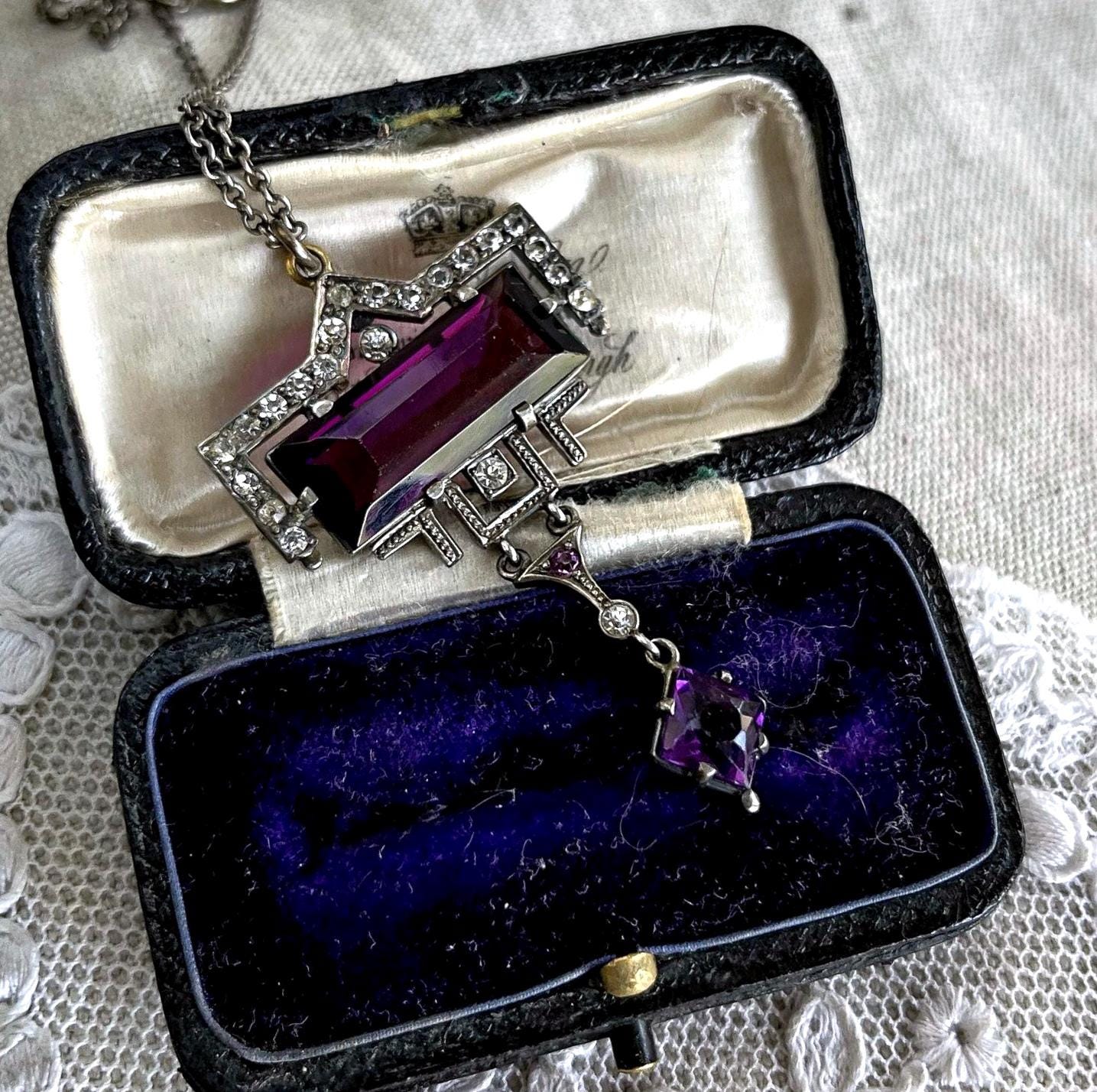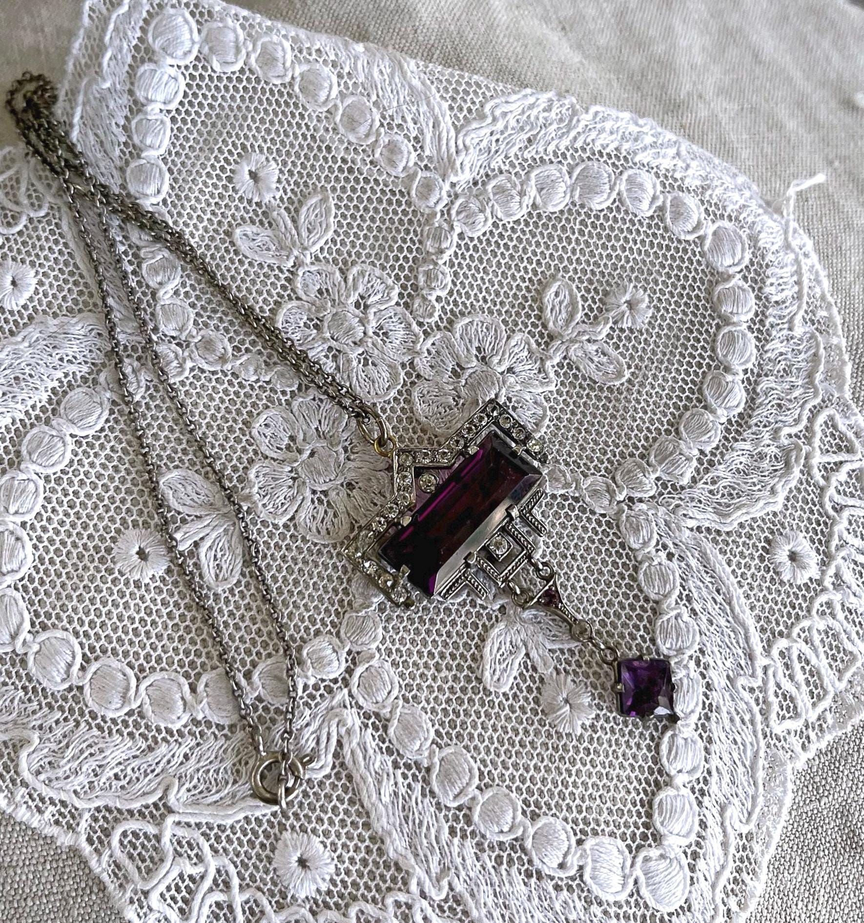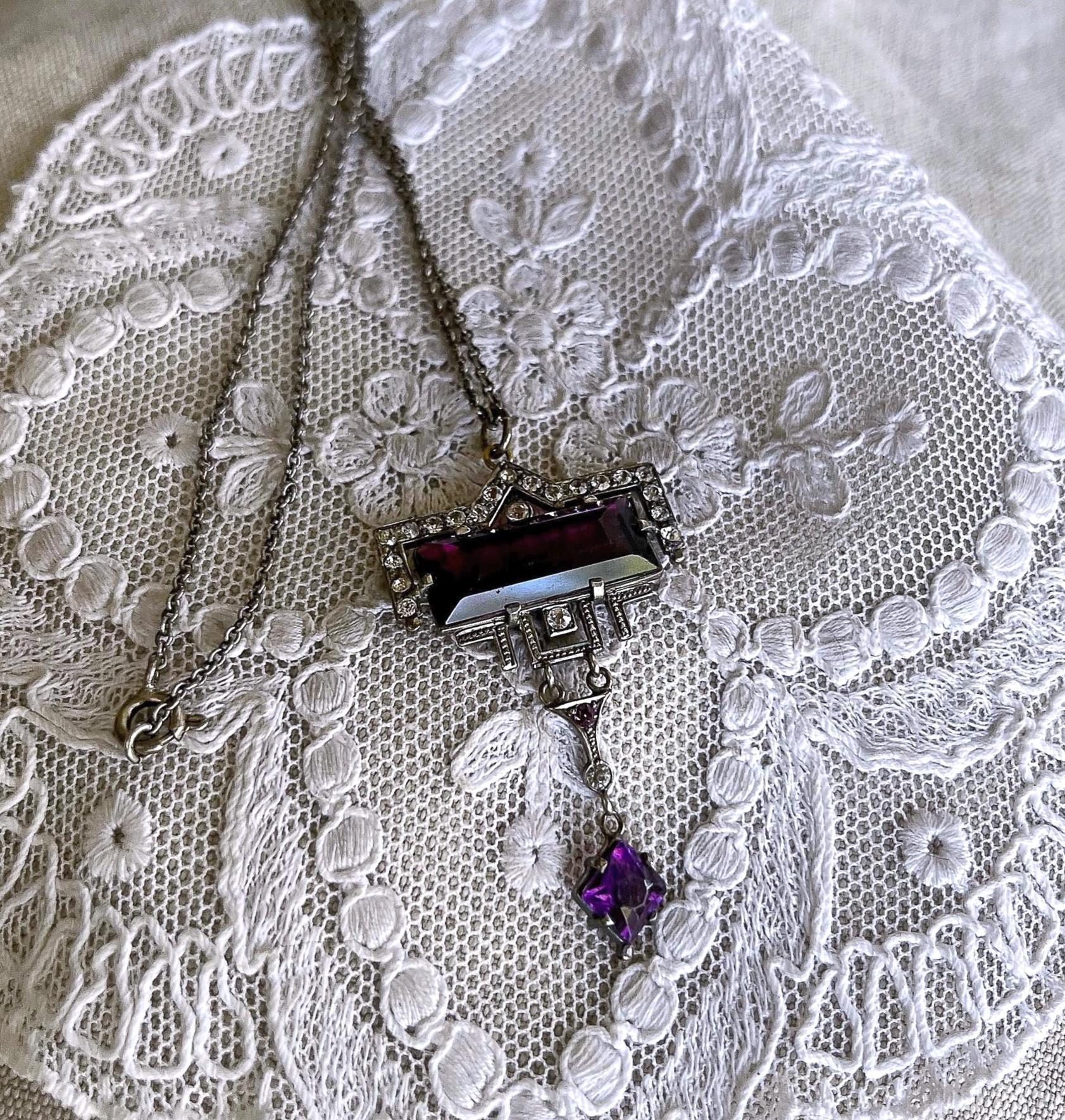 Featuring a lovely antique H&H Hamilton & Hamilton Jr Inc. fine sterling silver pendant necklace adorned with a beautiful Amethyst purple and white Paste Stone crystals set in a decorative Sterling setting. Necklace measures approximately 17 inches around with pendant measuring approximately 2.1 inches at 7.48 grams respectively. This lovely collectible necklace is in excellent antique condition with a functional stamped C spring clasp, a slight patina with all stones intact and accounted for, stamped *H&H/STERLING on the reverse of pendant . Elegant, collectible and wearable, this is a beautifully designed and elegant antique necklace!