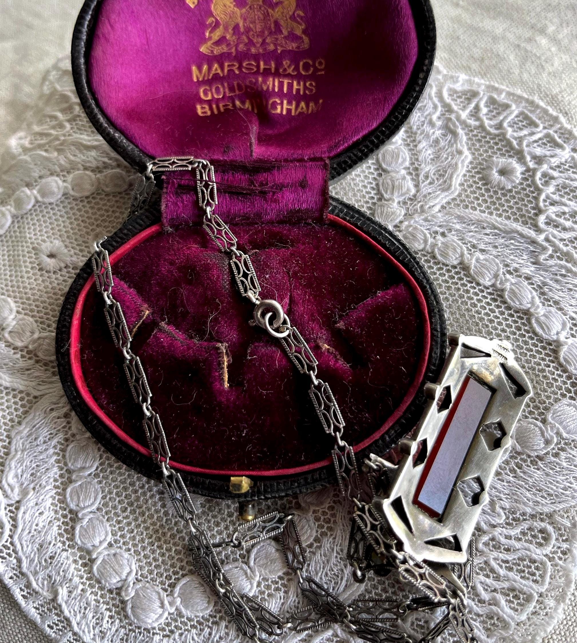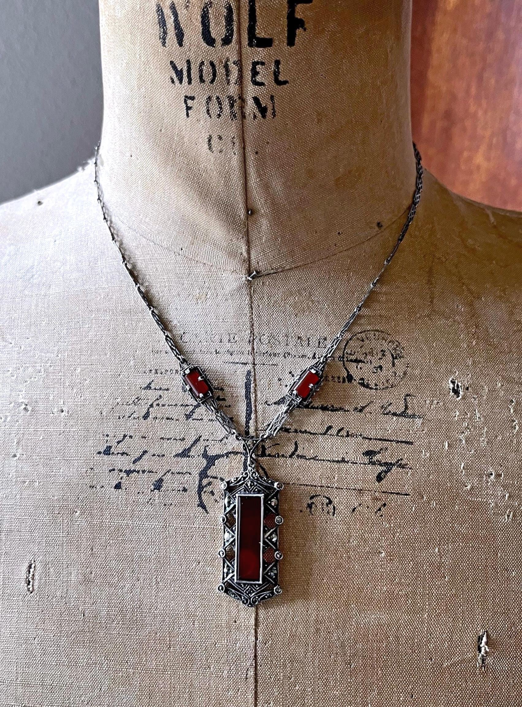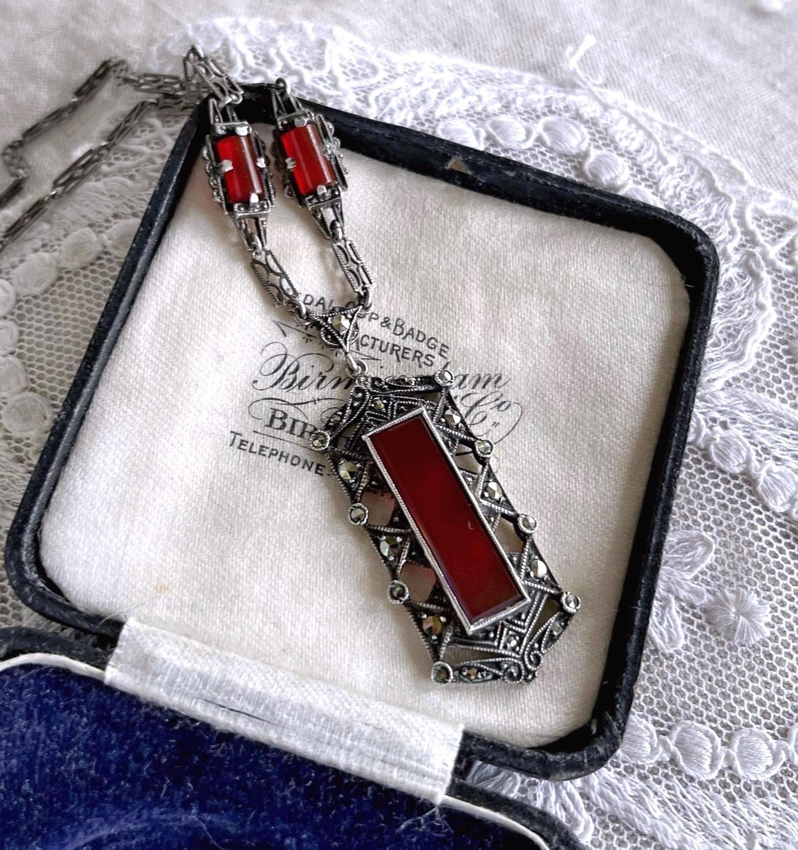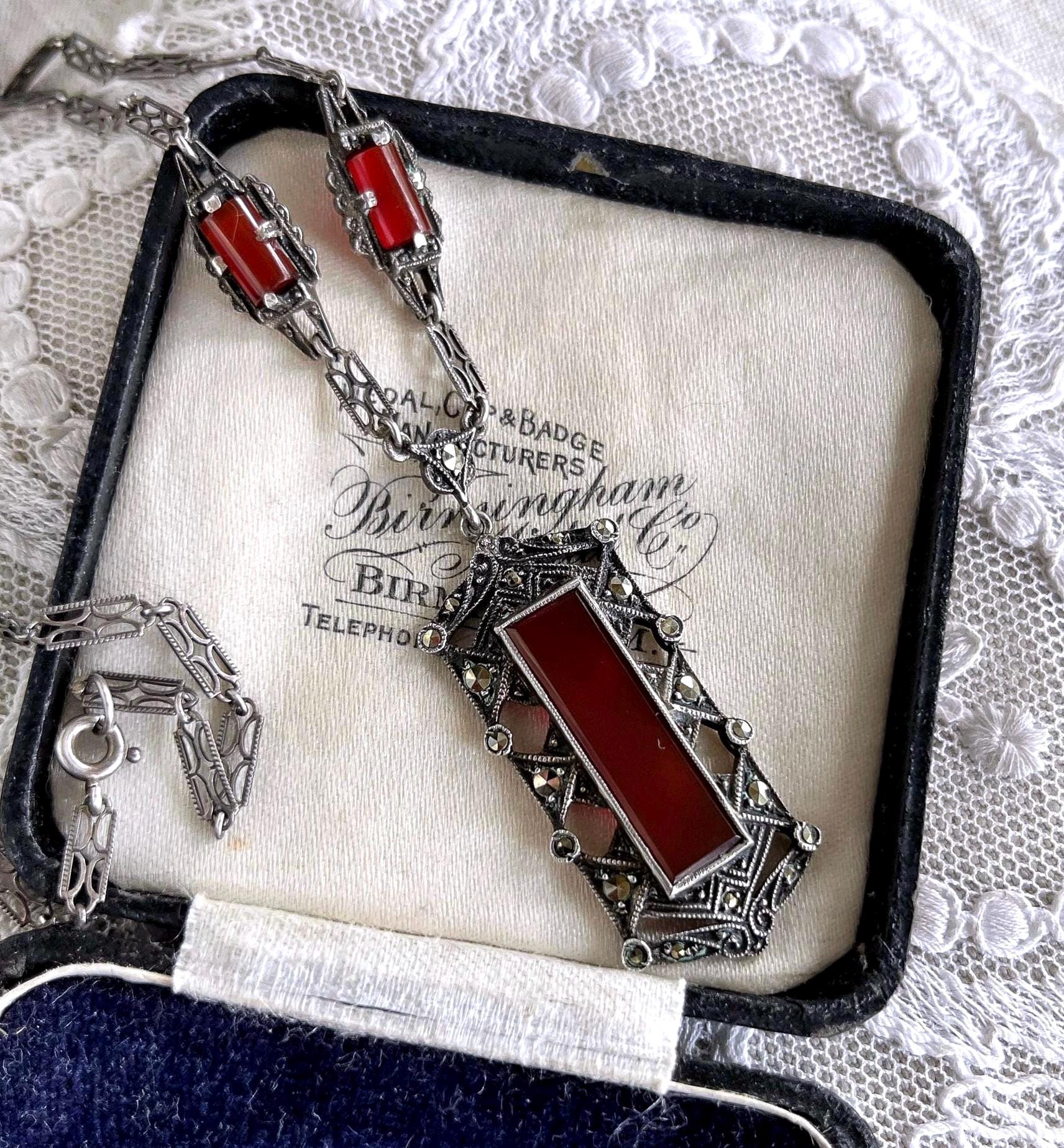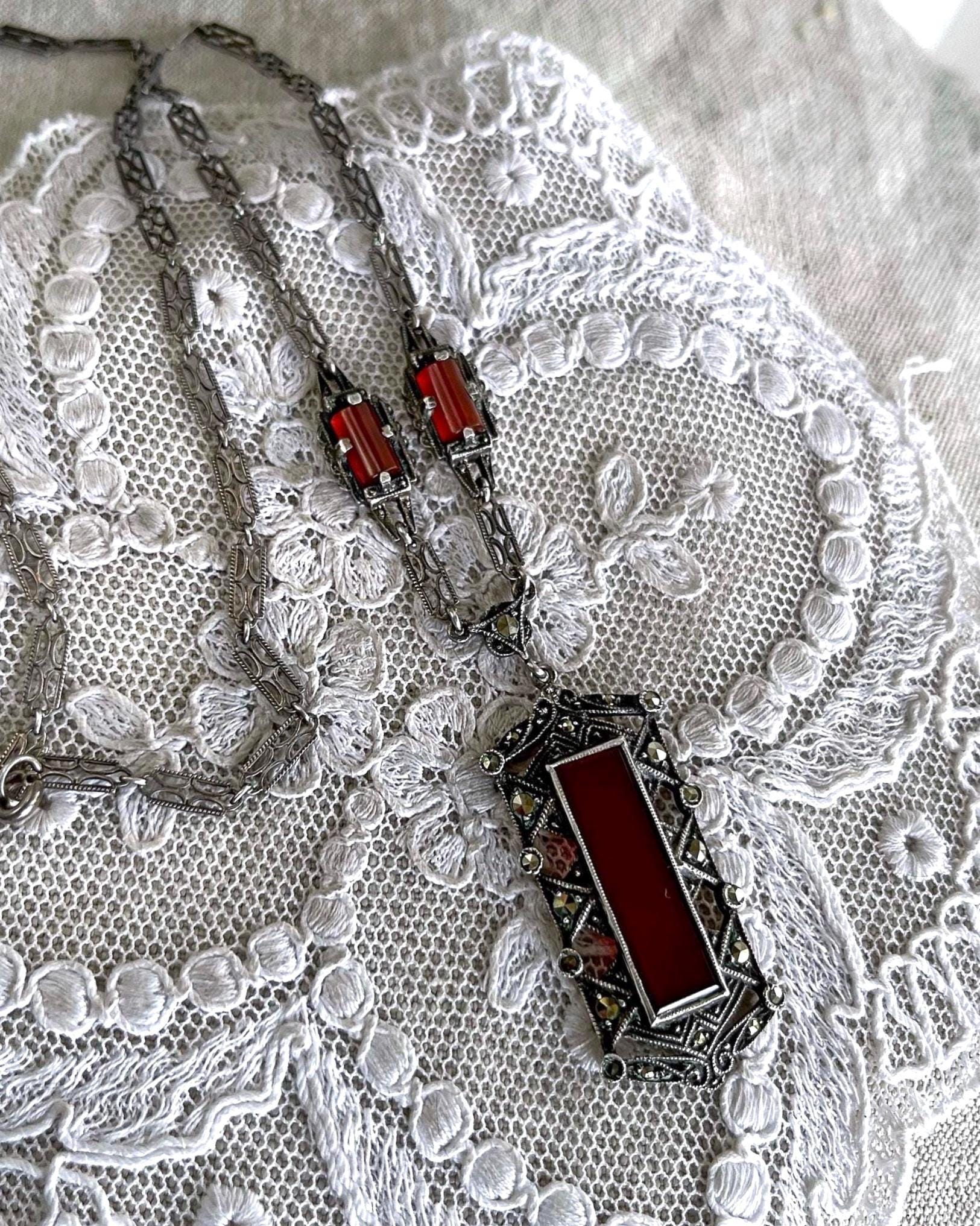 Featuring a gorgeous vintage Germany intricate sterling silver filigree Lavaliere Necklace adorned with a beautiful luminous genuine Carnelian Chalcedony gemstone accented with brilliant sparkling faceted marcasite crystals. Necklace measures approximately 18 inches around with a 2.2 inch pendant drop at 12 grams respectively. This necklace is in excellent vintage condition with a lovely patina, functional C spring clasp with all stones intact and accounted for. Beautifully designed and handcrafted this necklace, hallmarked STERLING/GERMANY on the reverse of pendant ready to wear and appreciate!