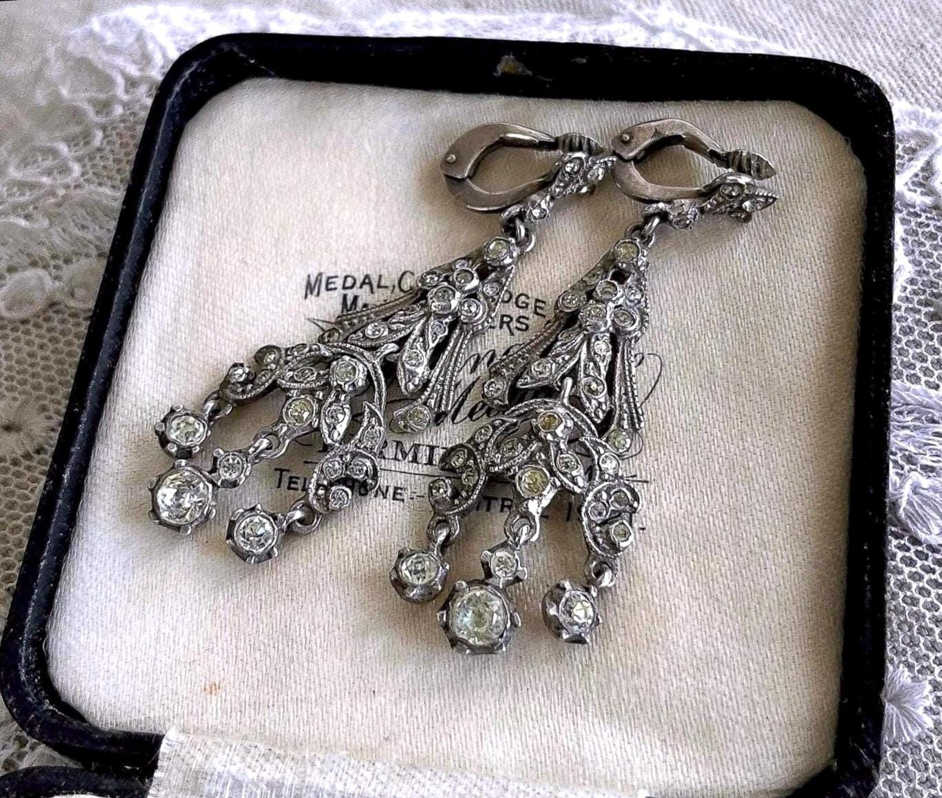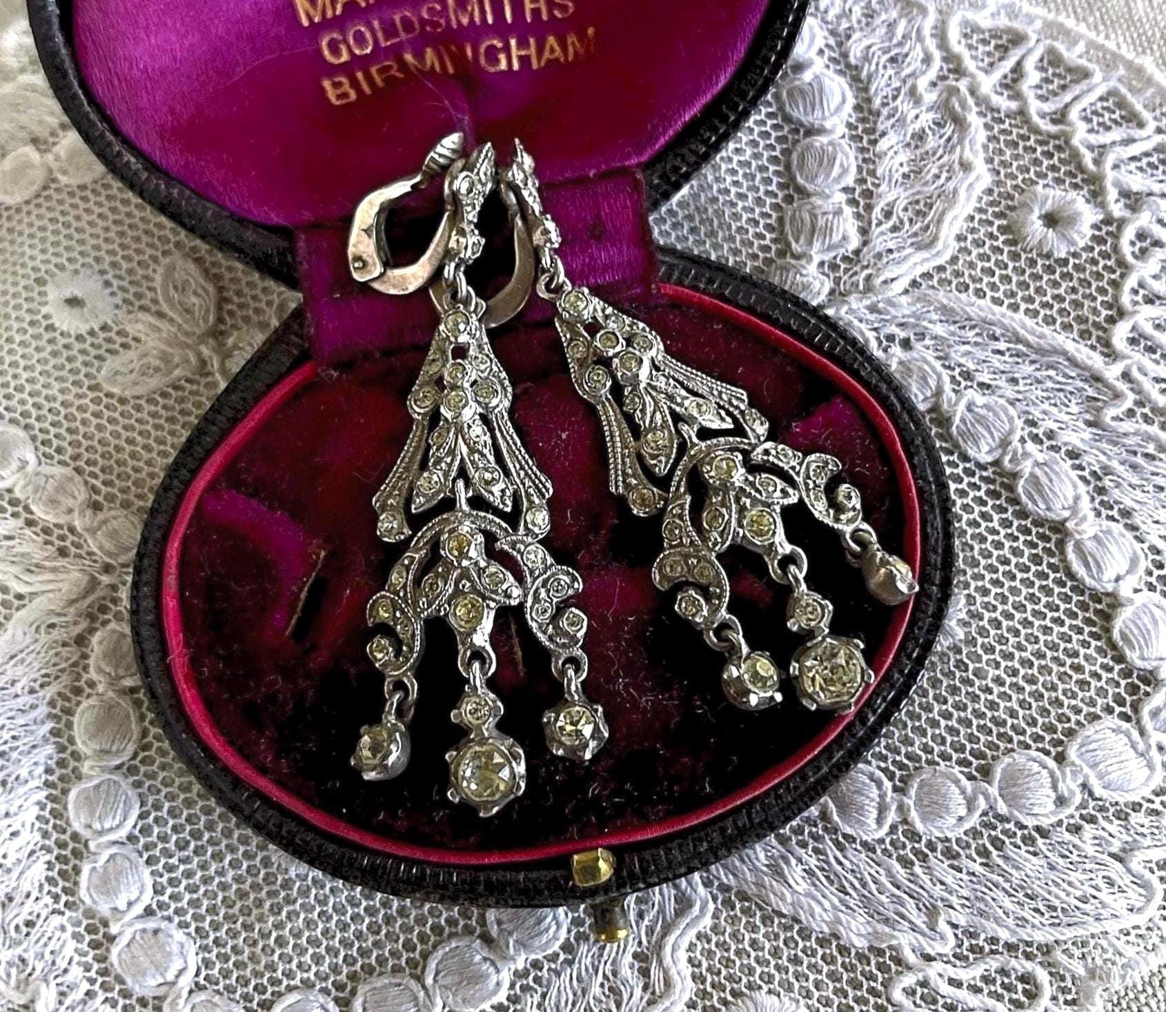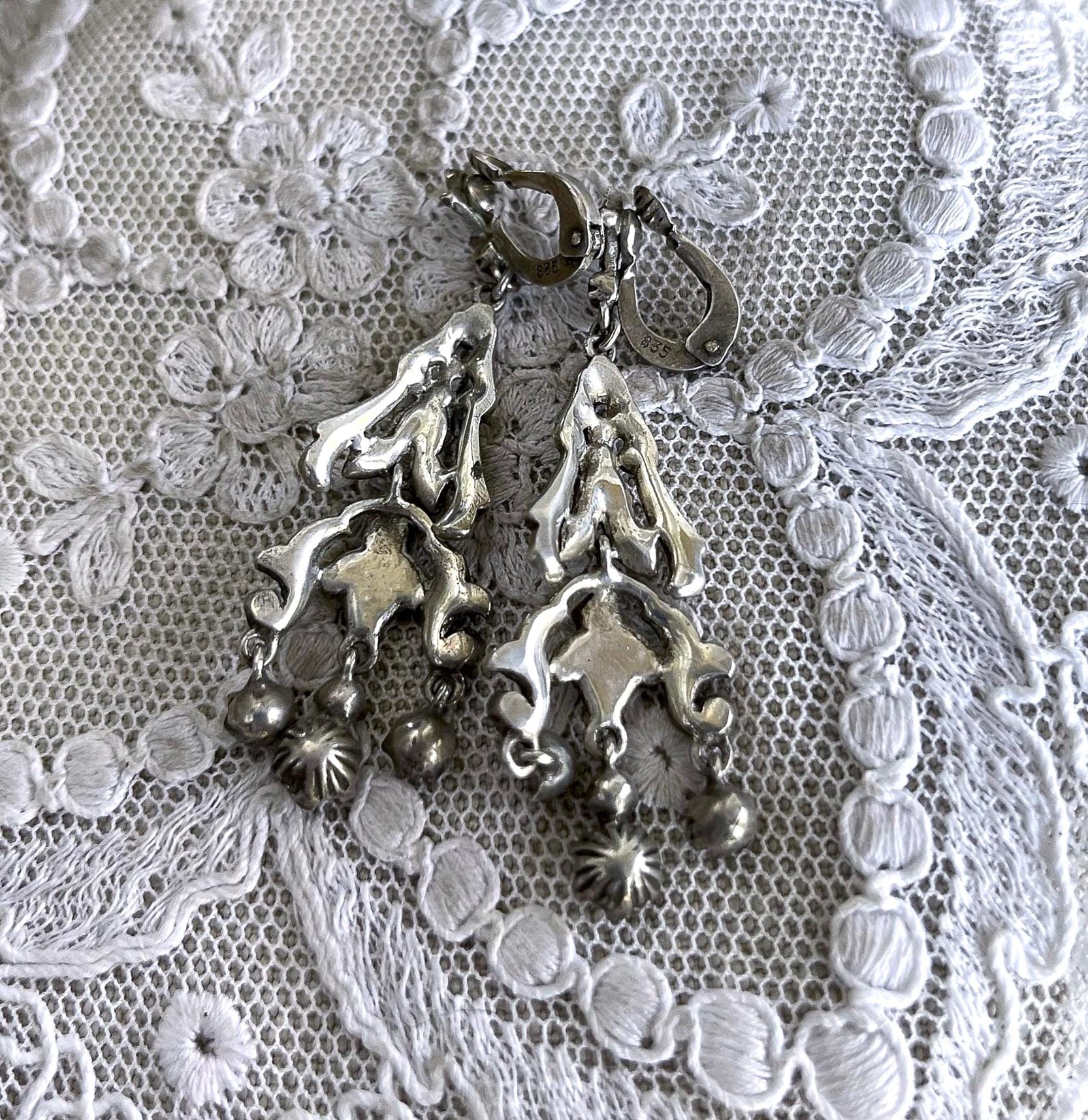 Featuring a wonderful pair of antique 1920s Georgian Revival European hallmarked 830 silver clip drop earrings adorned with brilliant sparkling faceted paste stones set in closed back settings. Earrings measure approximately 2 inches long at 10.44 grams respectively with both pieces in excellent antique condition with a lovely patina, all stones intact with functional clasps. These beauties are just stunning, collectible and ready to wear!