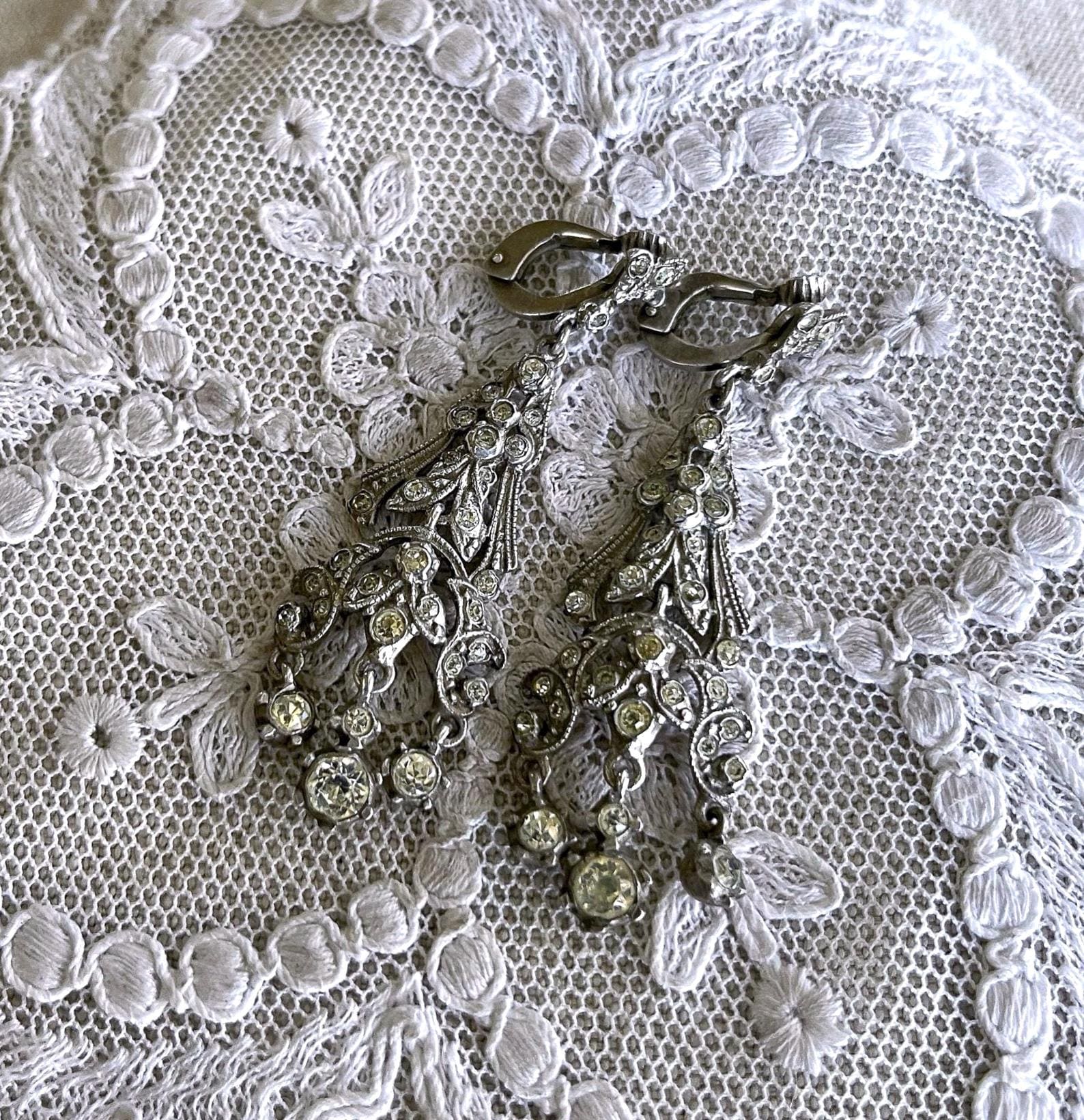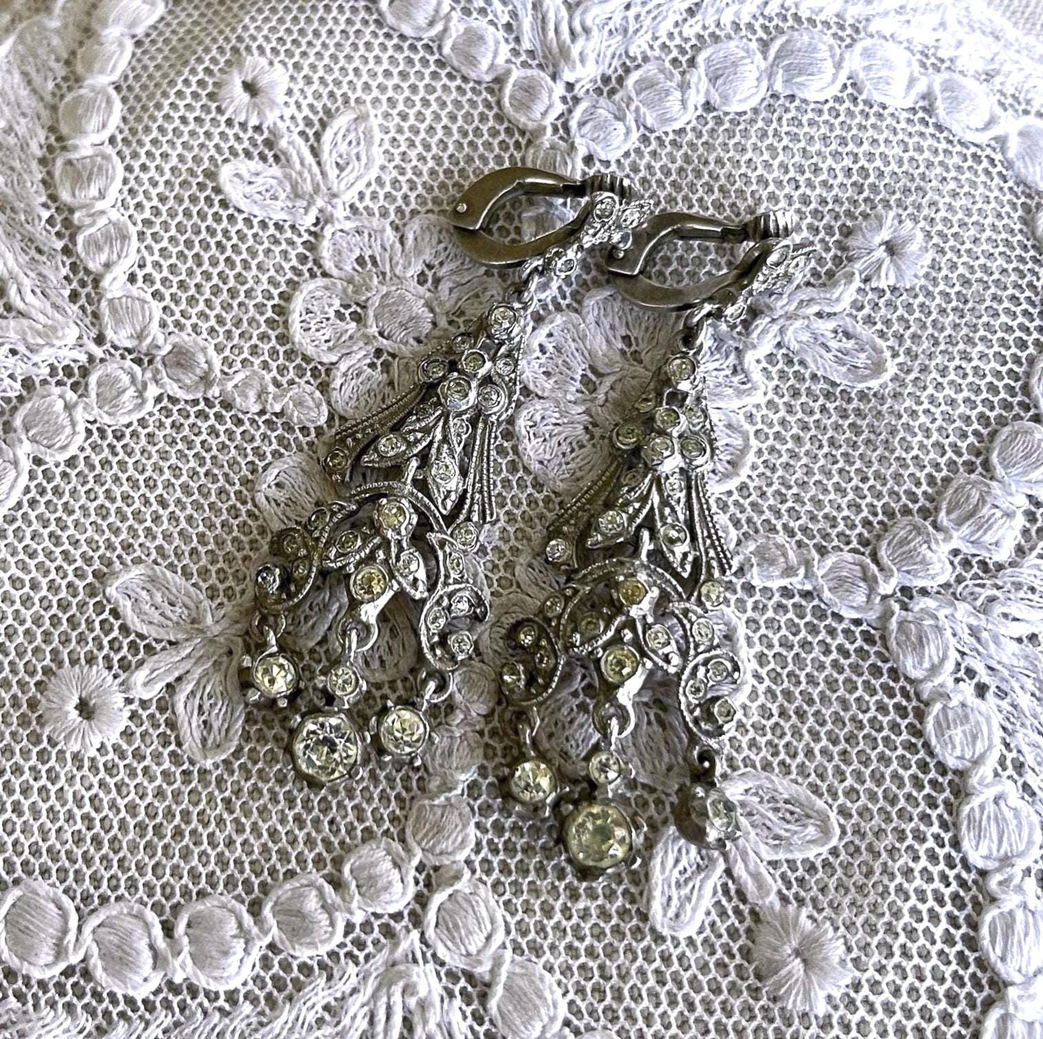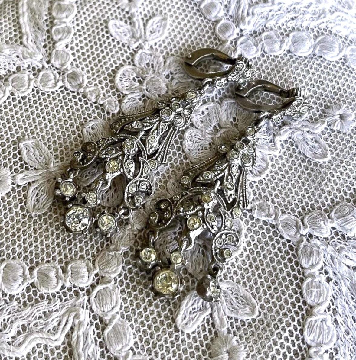 Featuring a wonderful pair of antique 1920s Georgian Revival European hallmarked 830 silver clip drop earrings adorned with brilliant sparkling faceted paste stones set in closed back settings. Earrings measure approximately 2 inches long at 10.44 grams respectively with both pieces in excellent antique condition with a lovely patina, all stones intact with functional clasps. These beauties are just stunning, collectible and ready to wear!