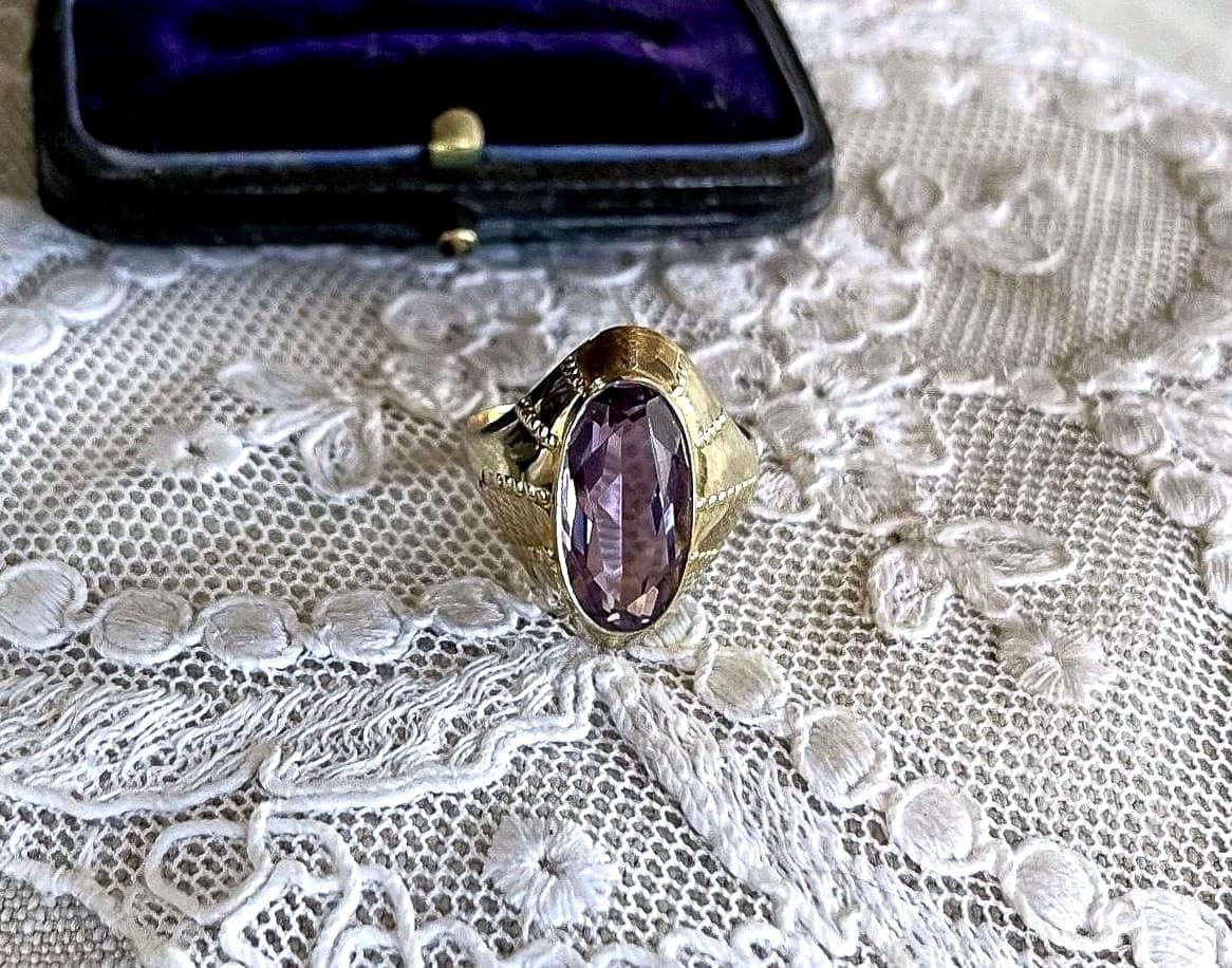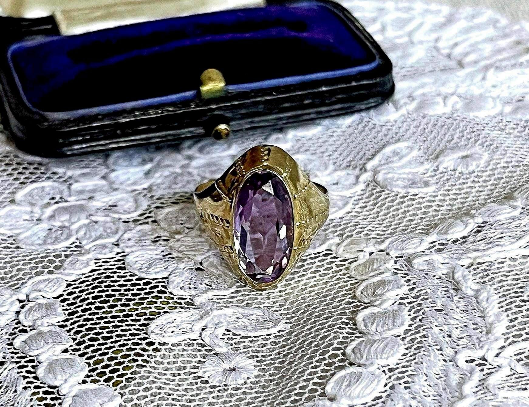 Featuring a gorgeous vintage Mid Century Modern beautifully made 9k yellow Gold Solitaire ring adorned with a beautiful genuine faceted Amethyst gemstone set in a solid gold bezel modernist setting. Ring is in excellent vintage condition with stone intact, approximately size 6 at 2.5 grams respectively. Stamped 333 on the inside of band this is a beautiful piece, demure and romantic!