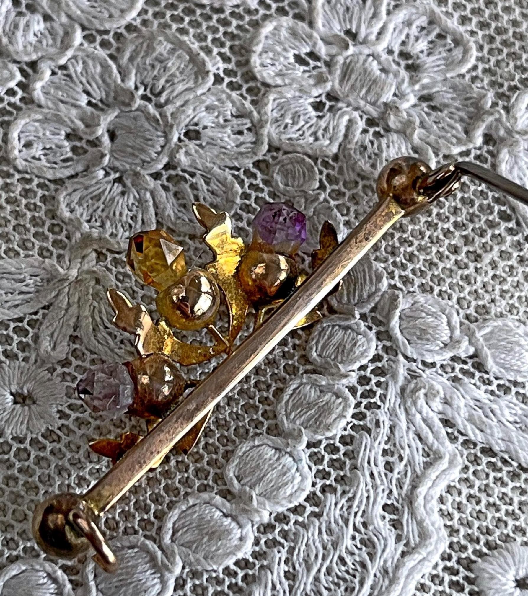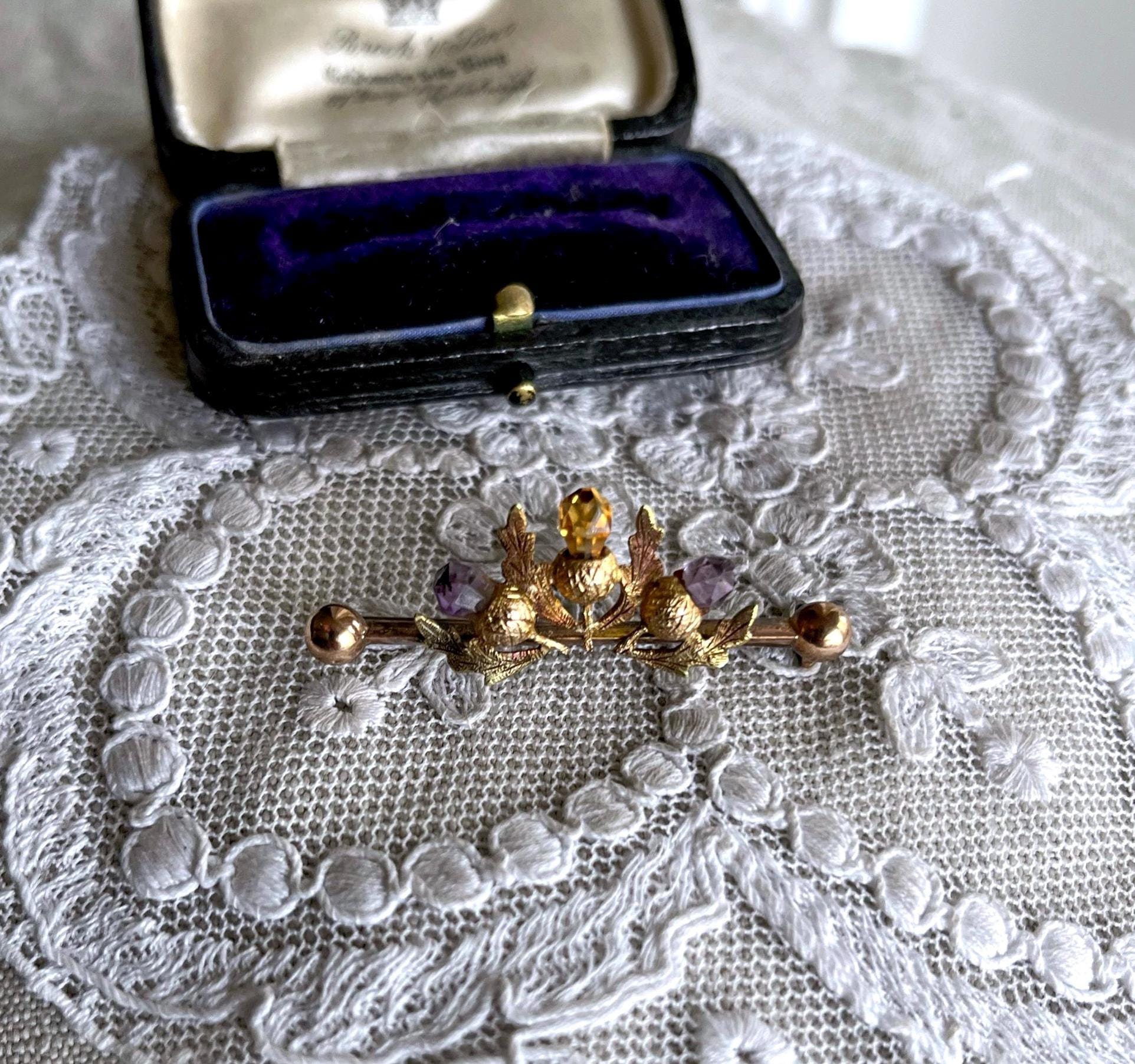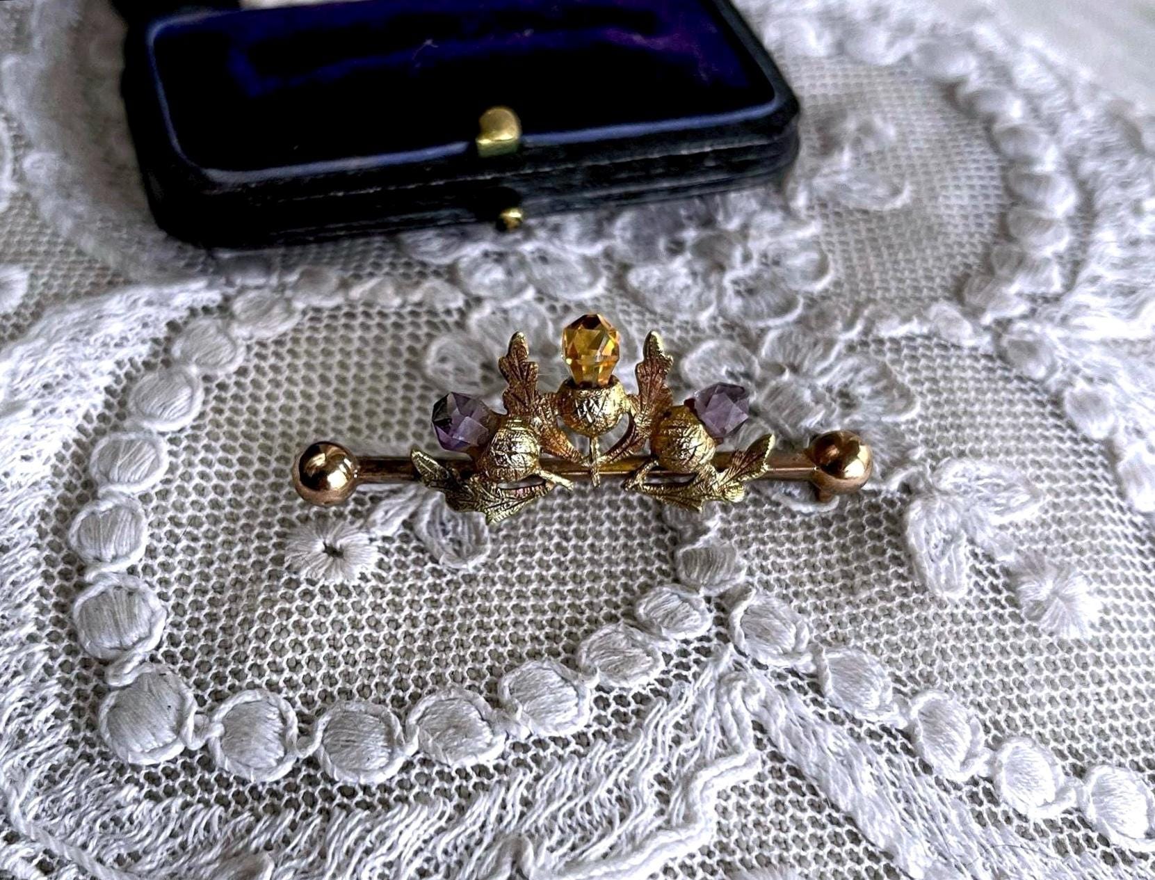 Featuring a lovely antique Scottish Thistle 9K 375 yellow gold Lapel brooch adorned with genuine faceted Amethyst and Citrine stones. Brooch measure approximately 1.6 inch’s long at 1.60 grams respectively and is in excellent antique condition, normal wear with all stones intact, hallmarks are faded tested as 9ct. A charming piece, ready to wear and pass on for generations.
