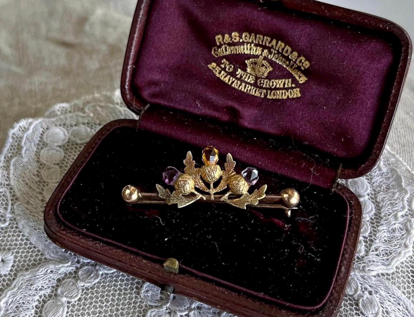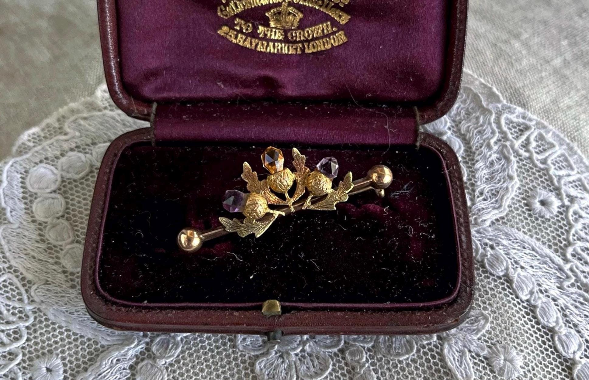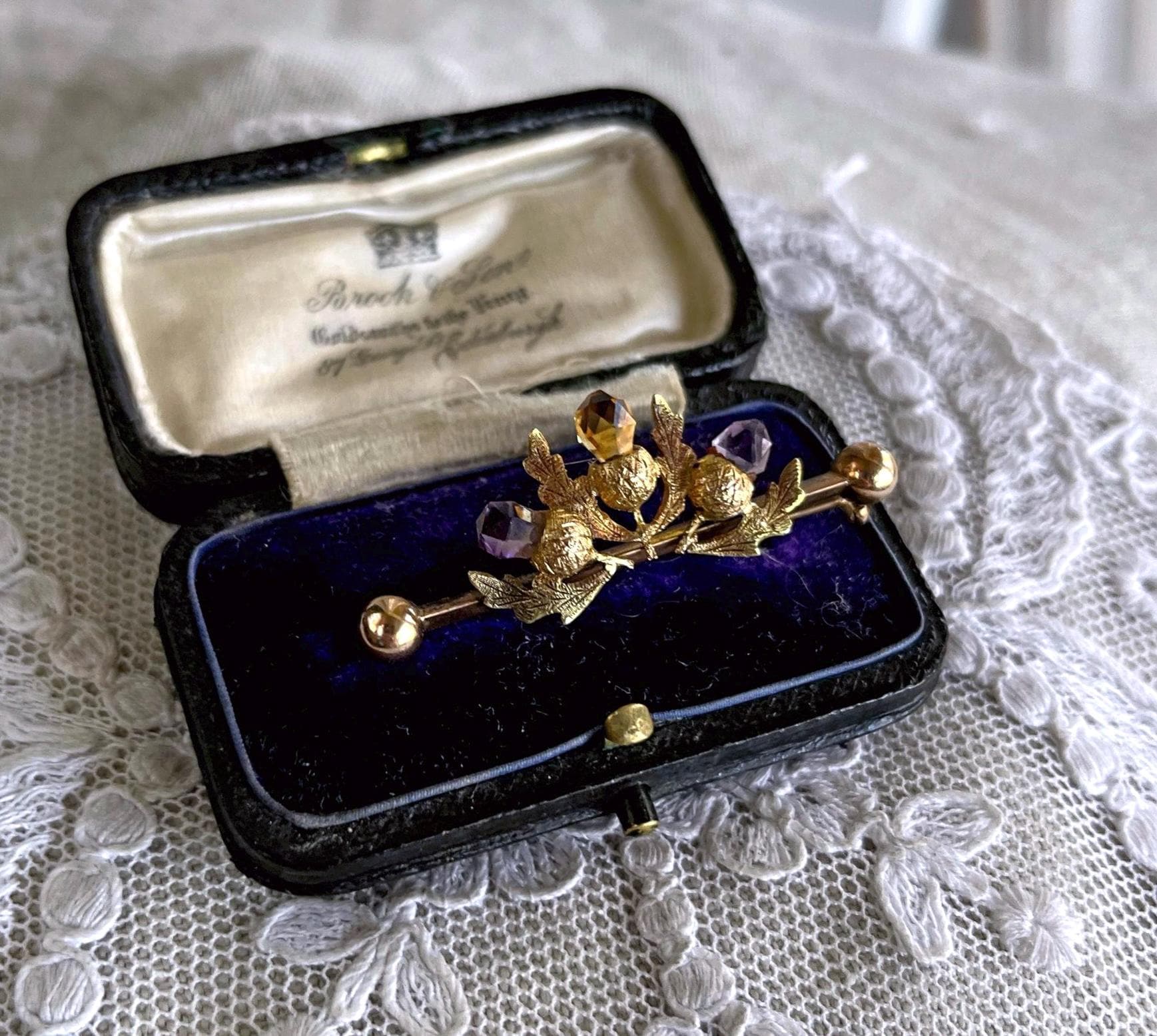 Featuring a lovely antique Scottish Thistle 9K 375 yellow gold Lapel brooch adorned with genuine faceted Amethyst and Citrine stones. Brooch measure approximately 1.6 inch’s long at 1.60 grams respectively and is in excellent antique condition, normal wear with all stones intact, hallmarks are faded tested as 9ct. A charming piece, ready to wear and pass on for generations.