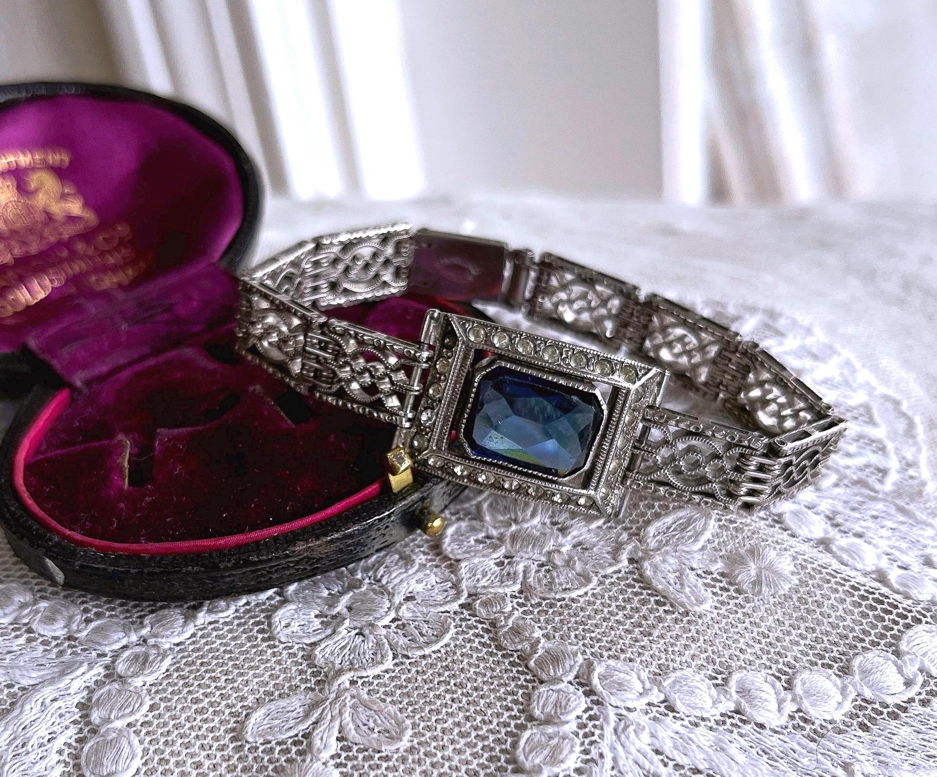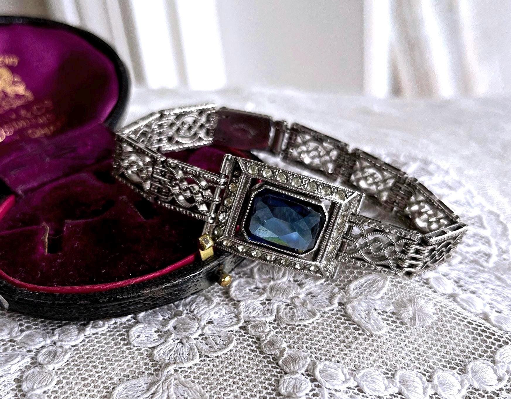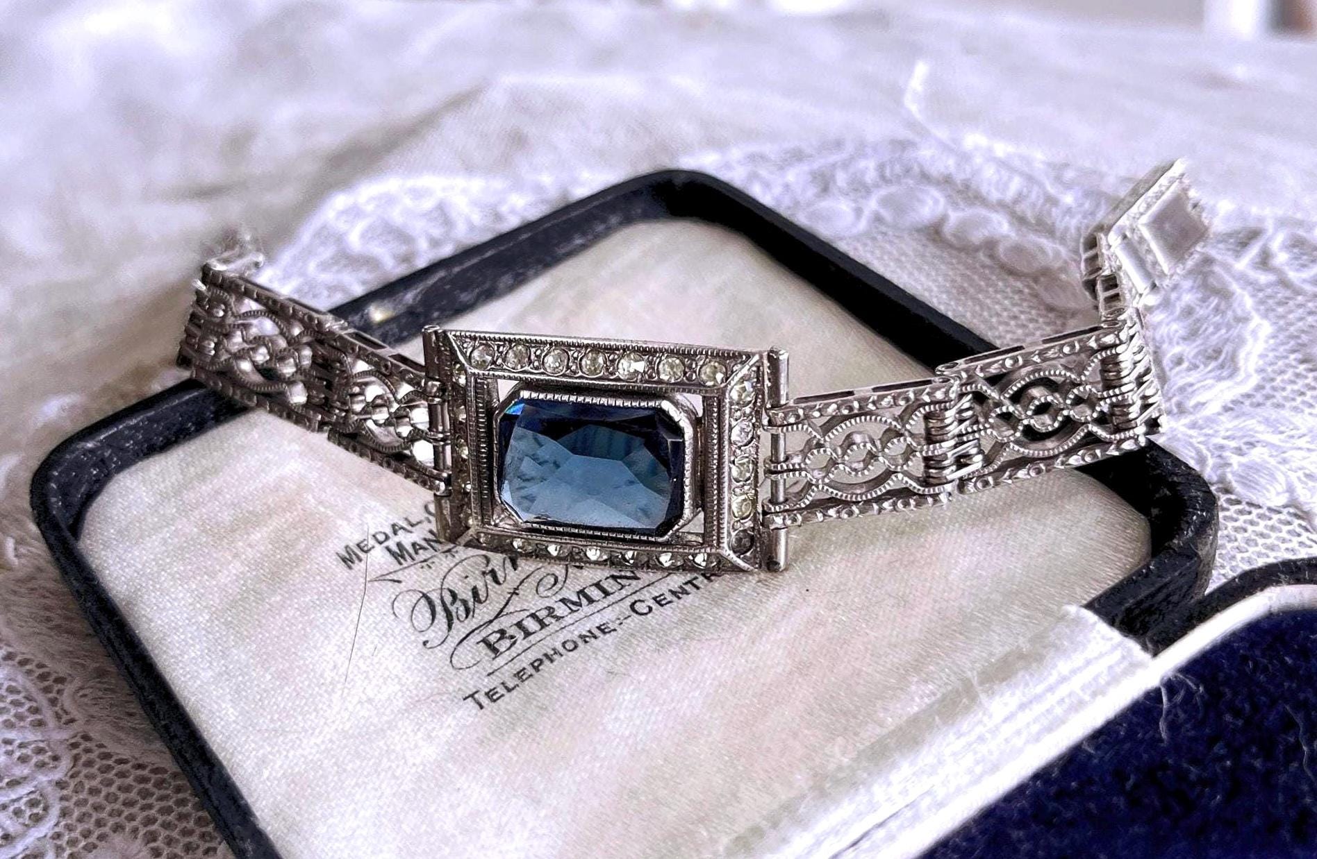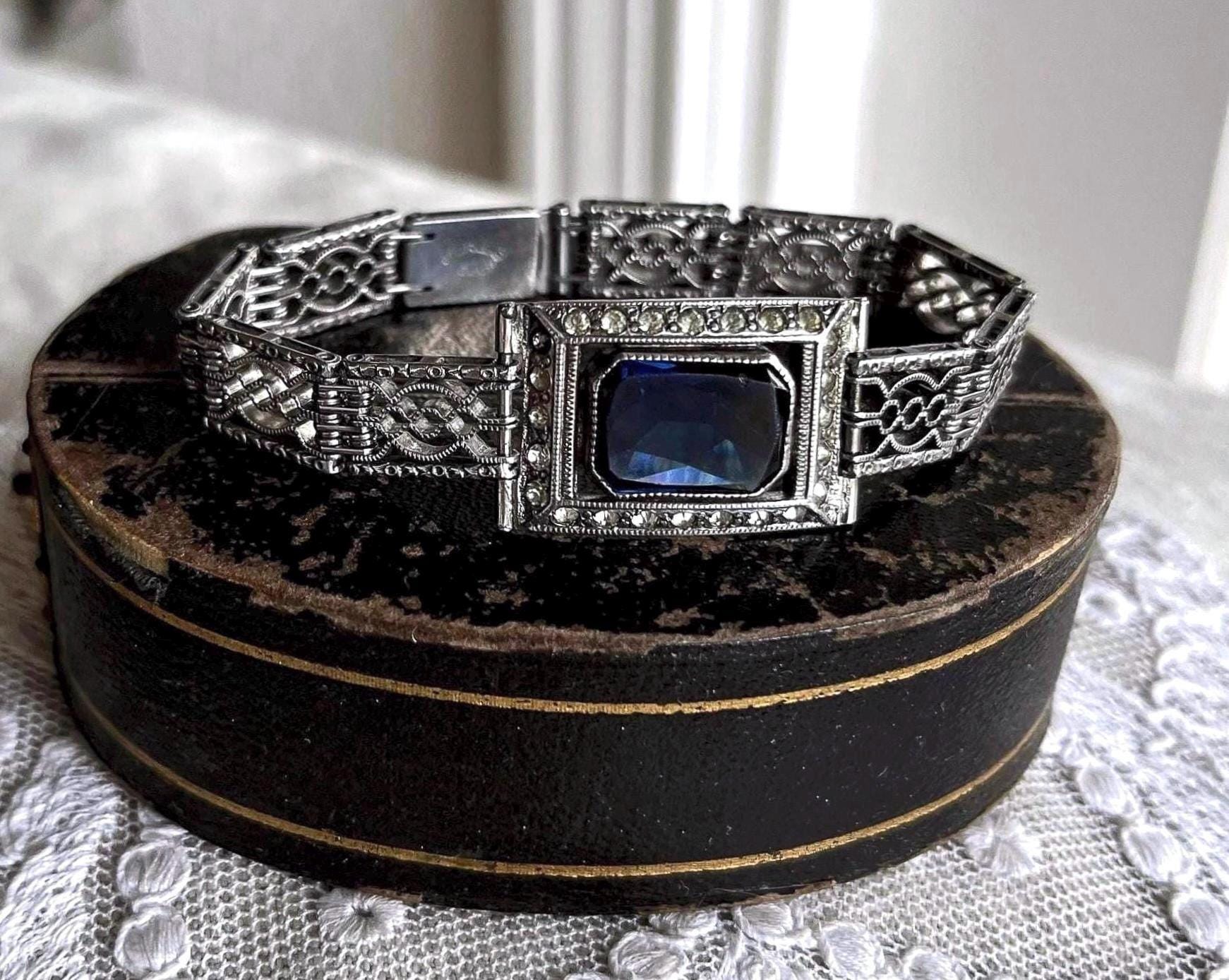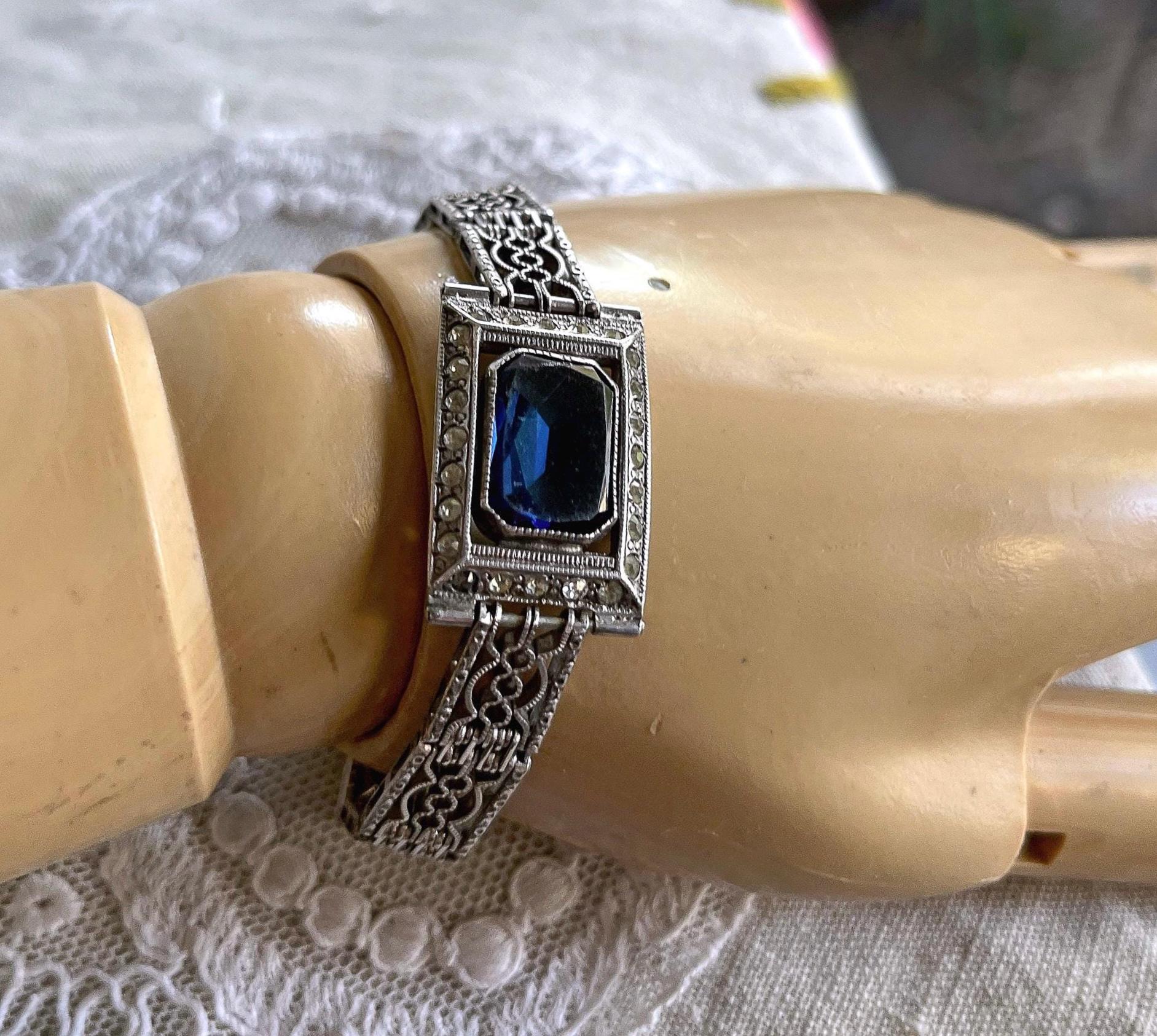 Featuring a beautiful vintage Wells Co. sterling silver rhodium plated Art Deco bracelet adorned with brilliant sapphire blue and white paste stones. Bracelet is in excellent vintage condition with normal wear, a nice patina with all stones accounted for. Measuring approximately 7 inches around 18 grams respectively, unsigned this beautiful piece is heavy and substantial , beautifully designed and ready to wear!