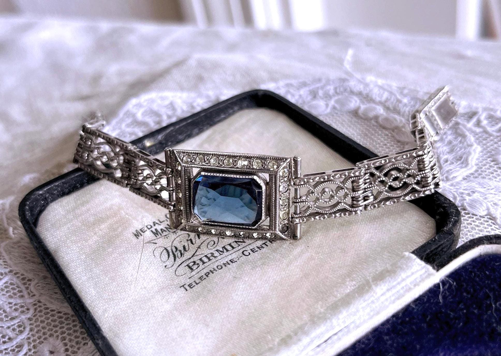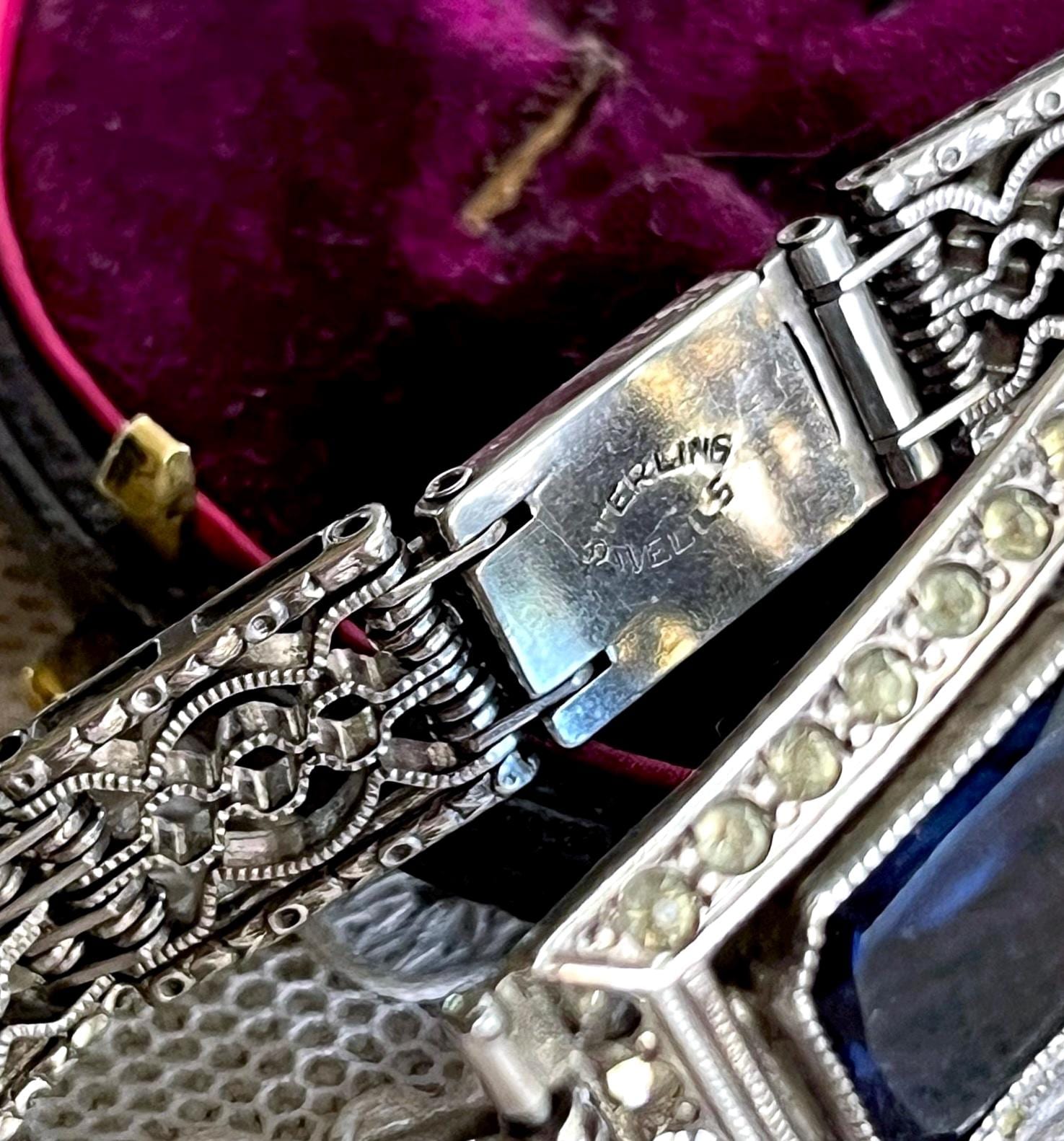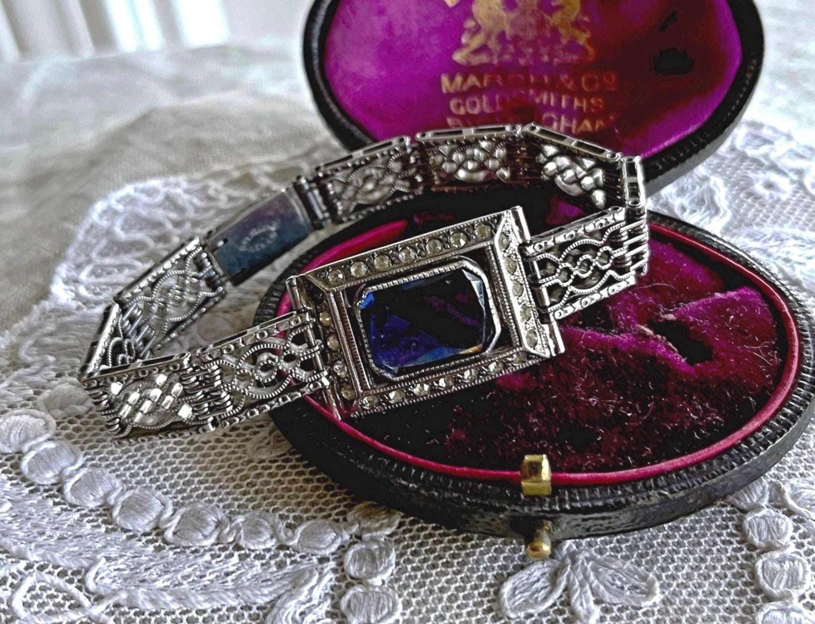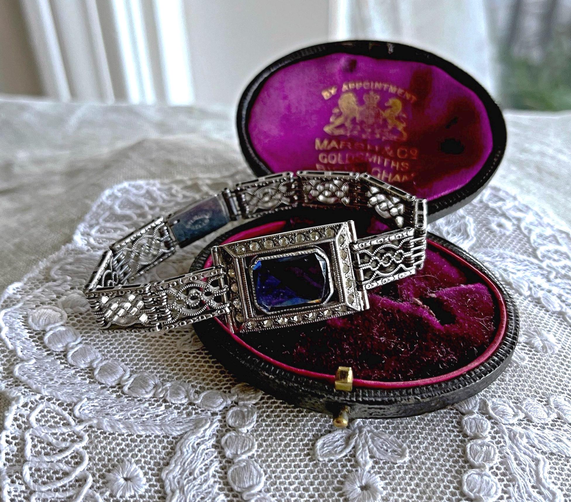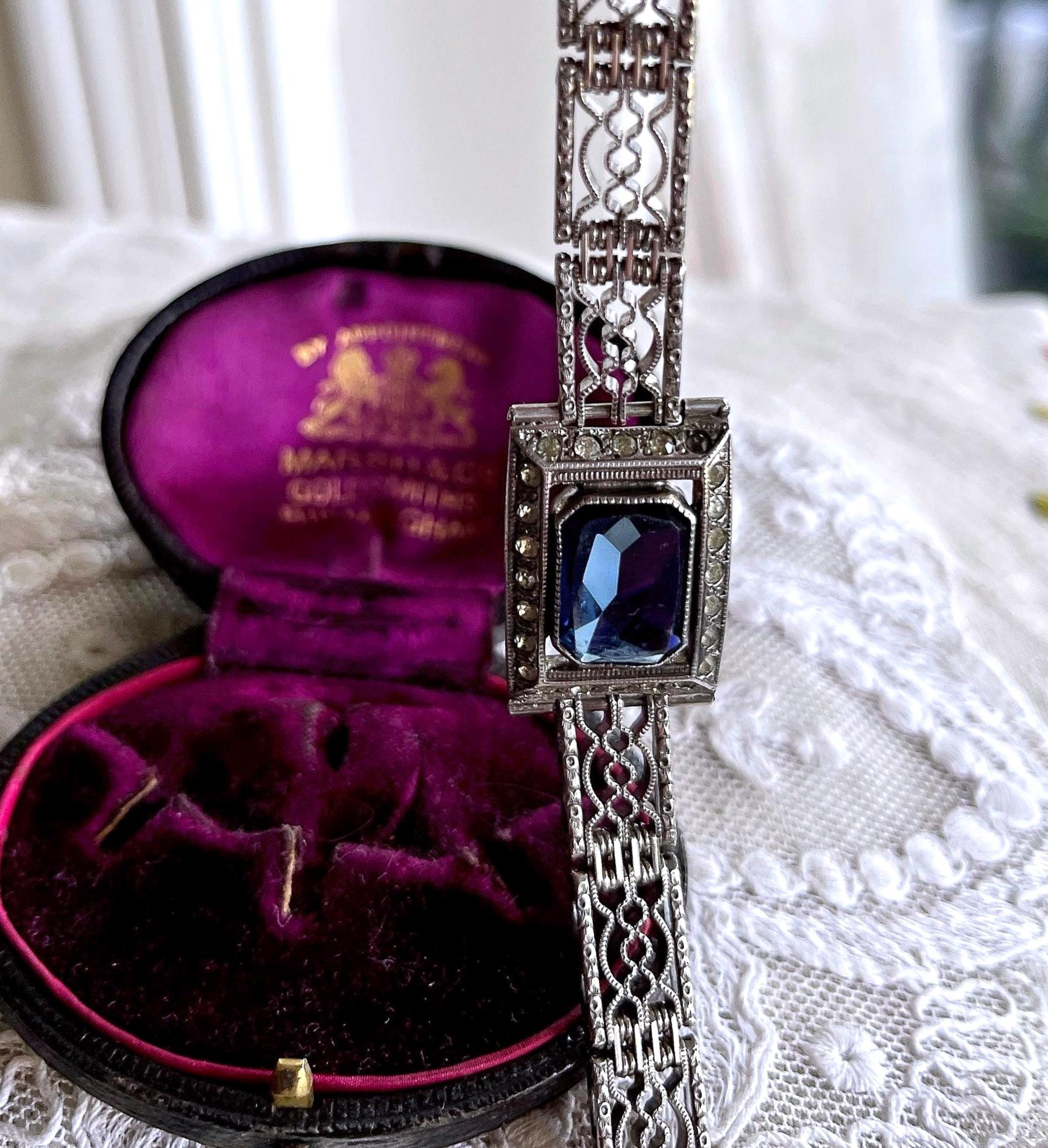 Featuring a beautiful vintage Wells Co. sterling silver rhodium plated Art Deco bracelet adorned with brilliant sapphire blue and white paste stones. Bracelet is in excellent vintage condition with normal wear, a nice patina with all stones accounted for. Measuring approximately 7 inches around 18 grams respectively, unsigned this beautiful piece is heavy and substantial , beautifully designed and ready to wear!