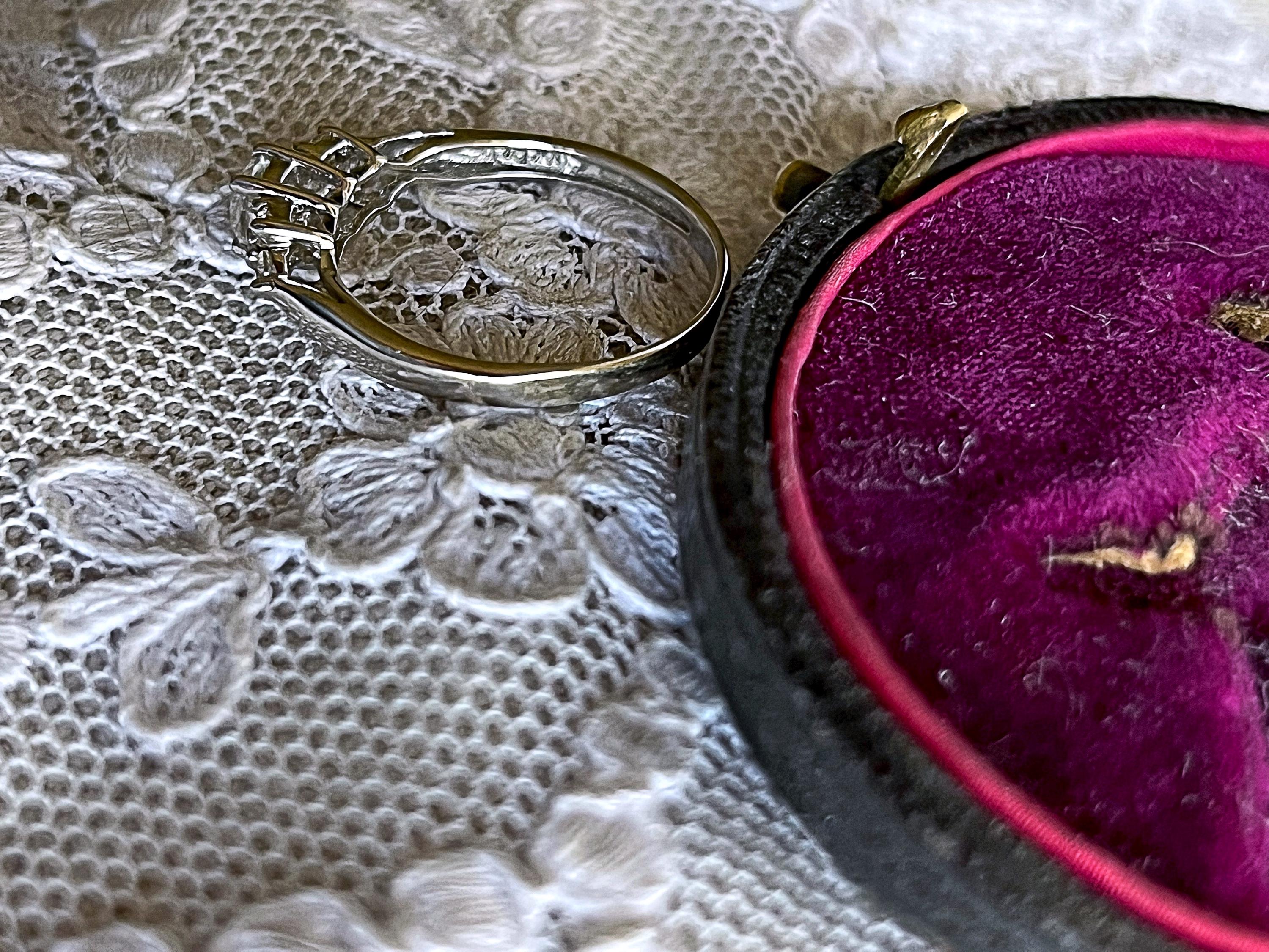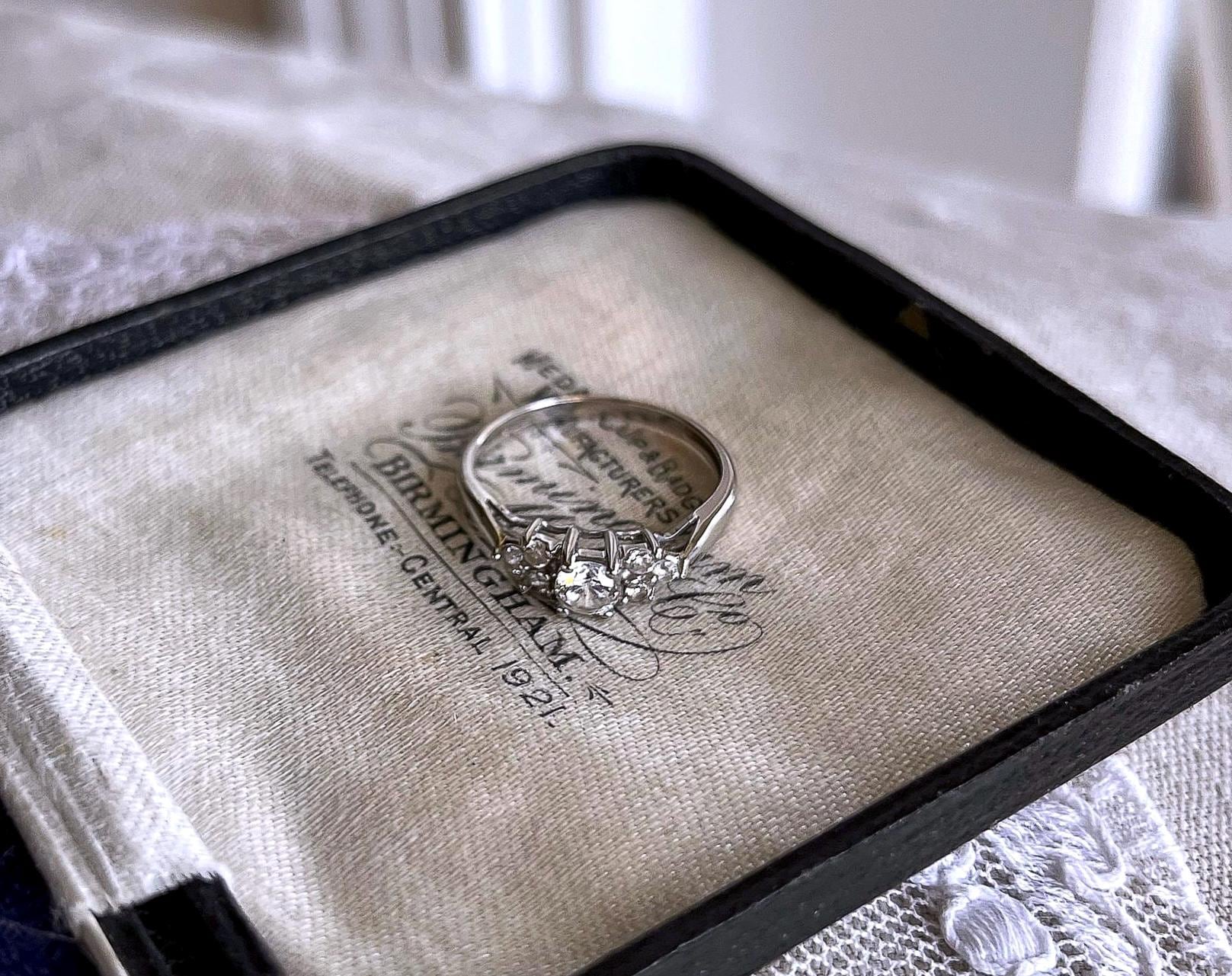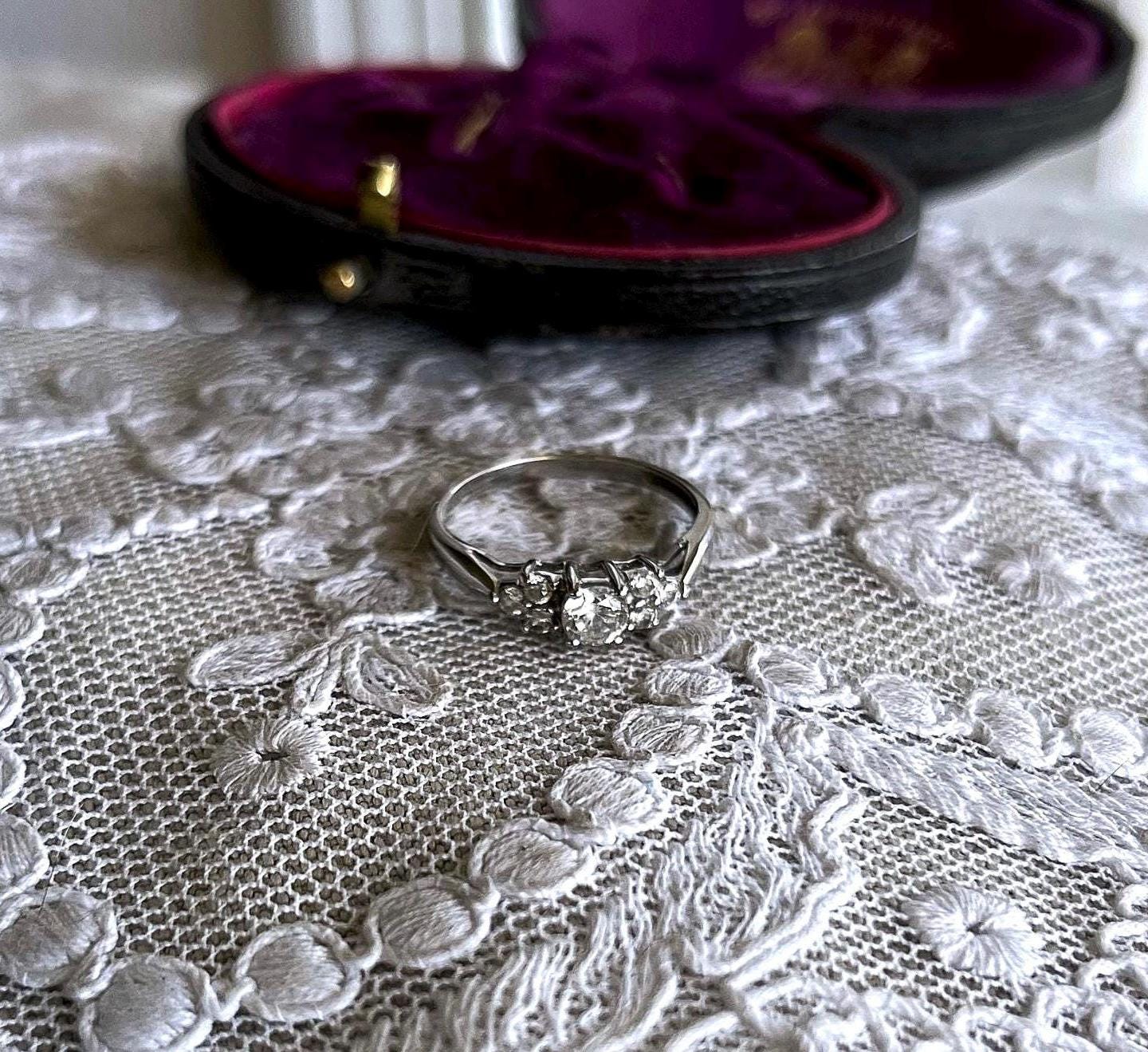 Featuring a beautiful vintage 10k white gold ring adorned with brilliant sparkling faceted CZ crystals set in pronged settings. Ring is in excellent condition with minimal wear, stamped 10k/CZ on the inside of band with all stones intact and accounted for. Approximately size 5.5 at 1.6 grams respectively. Beautifully made and ready to gift or wear!