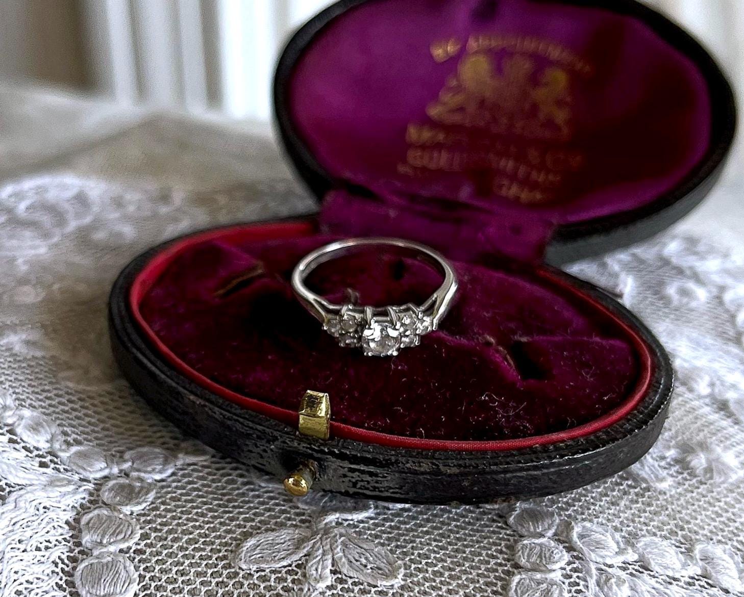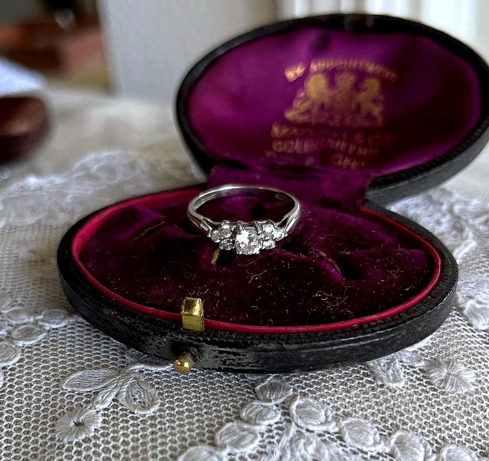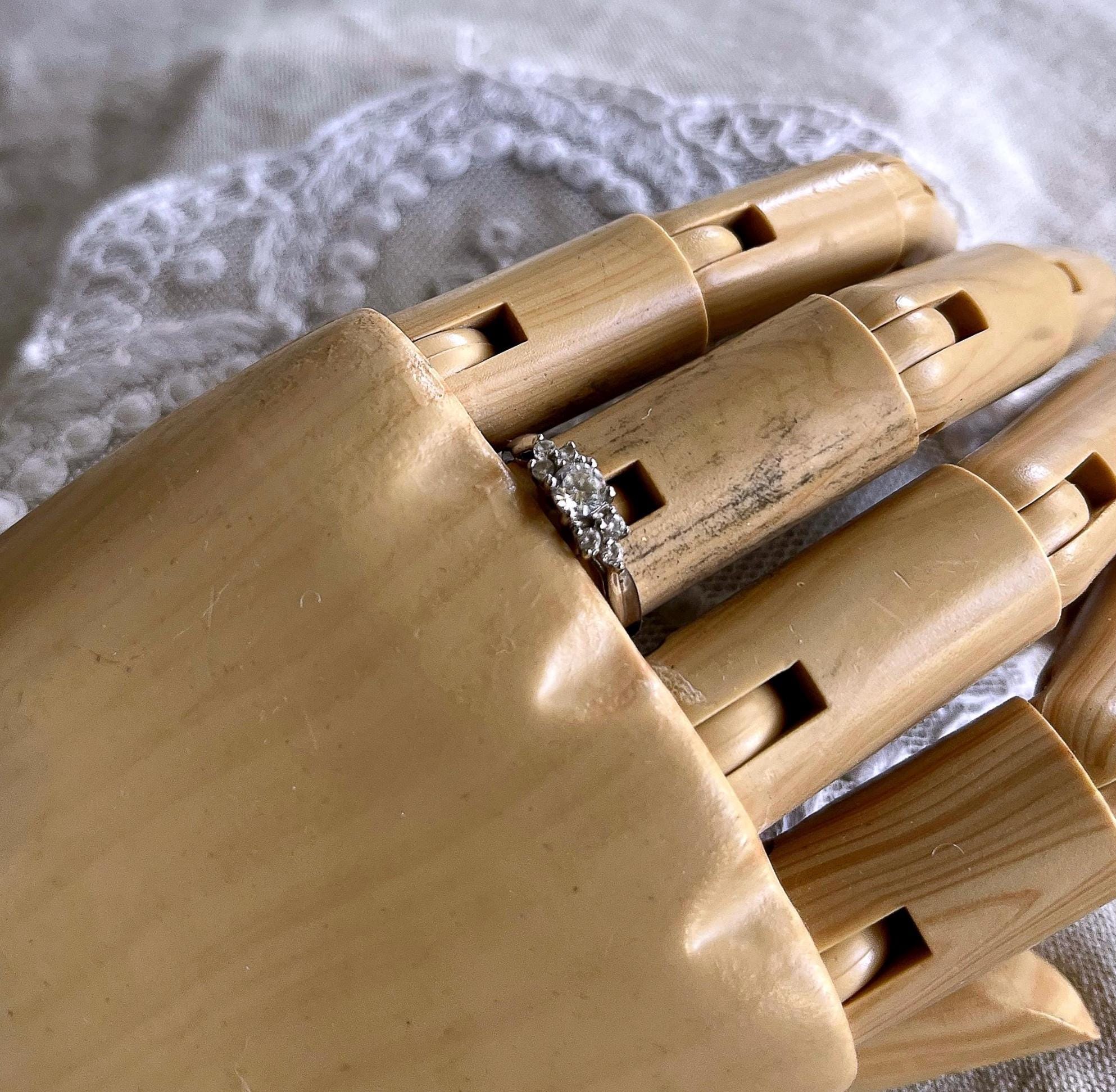 Featuring a beautiful vintage 10k white gold ring adorned with brilliant sparkling faceted CZ crystals set in pronged settings. Ring is in excellent condition with minimal wear, stamped 10k/CZ on the inside of band with all stones intact and accounted for. Approximately size 5.5 at 1.6 grams respectively. Beautifully made and ready to gift or wear!