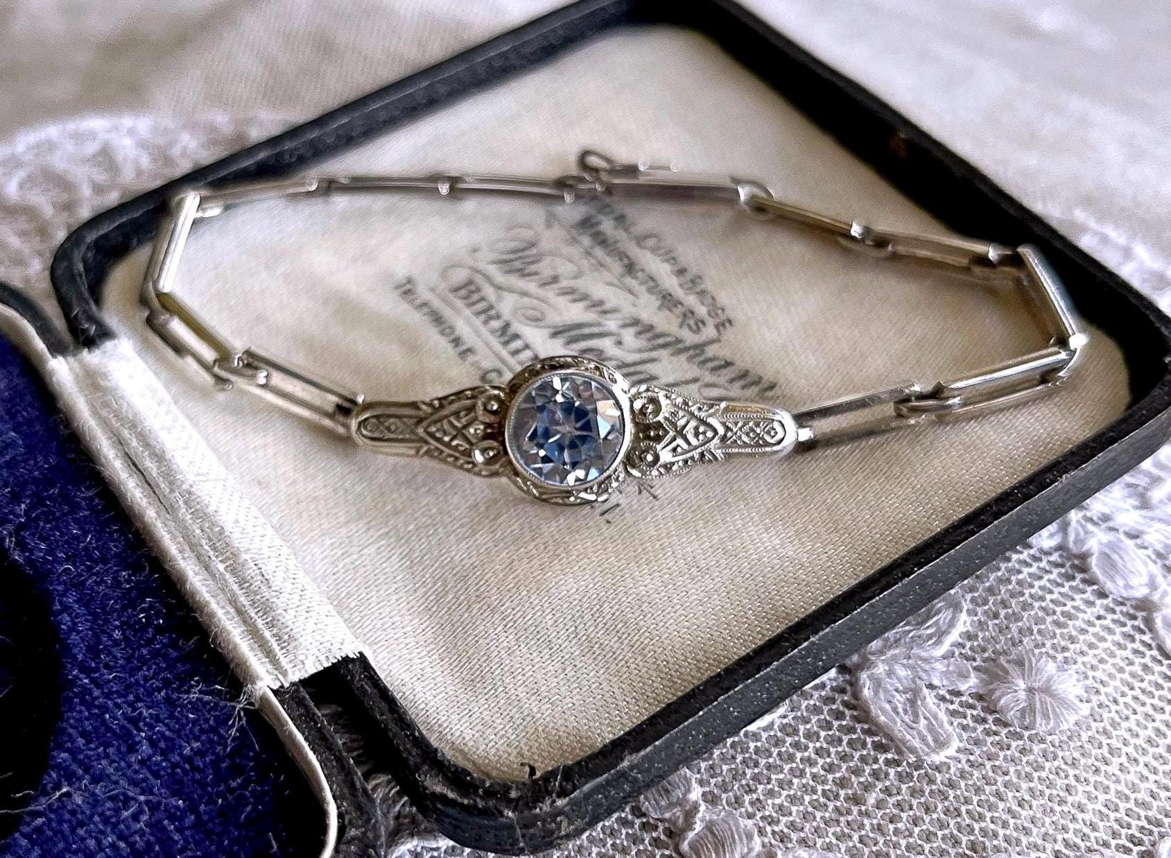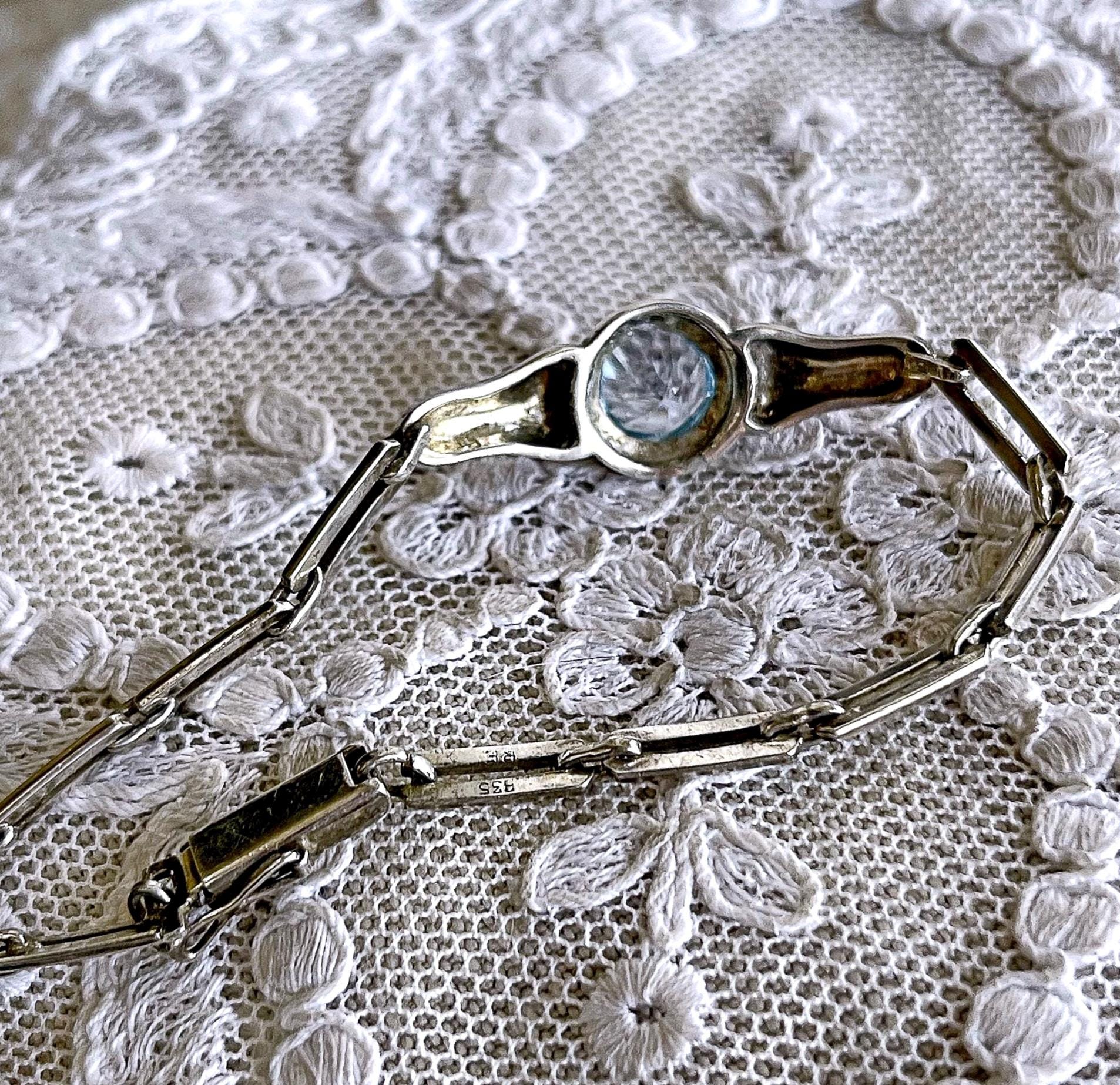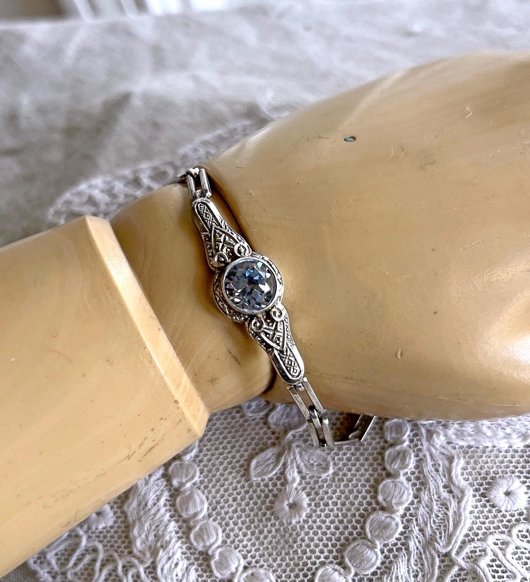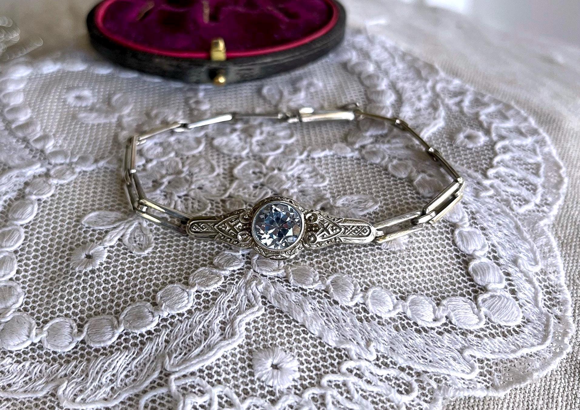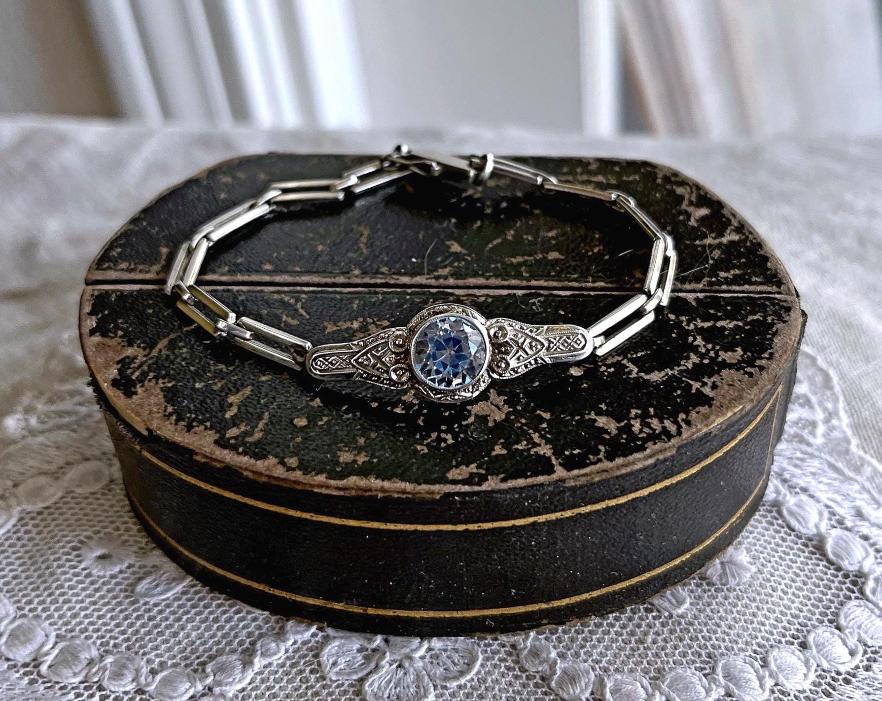 Featuring an absolutely gorgeous vintage Richard Friedel R.F. Germany Art Deco 835 silver link bracelet adorned with a dazzling blue spinel gemstone set in a beautiful decorative setting. Bracelet measures approximately 6.75 inches around at 7.5 grams respectively. In excellent antique condition with minimal wear, a functional clasped stamped 835 R.F. This stunning piece shines wonderfully, is completely wearable and ready to pass on for generations! A fabulous, unique something blue!