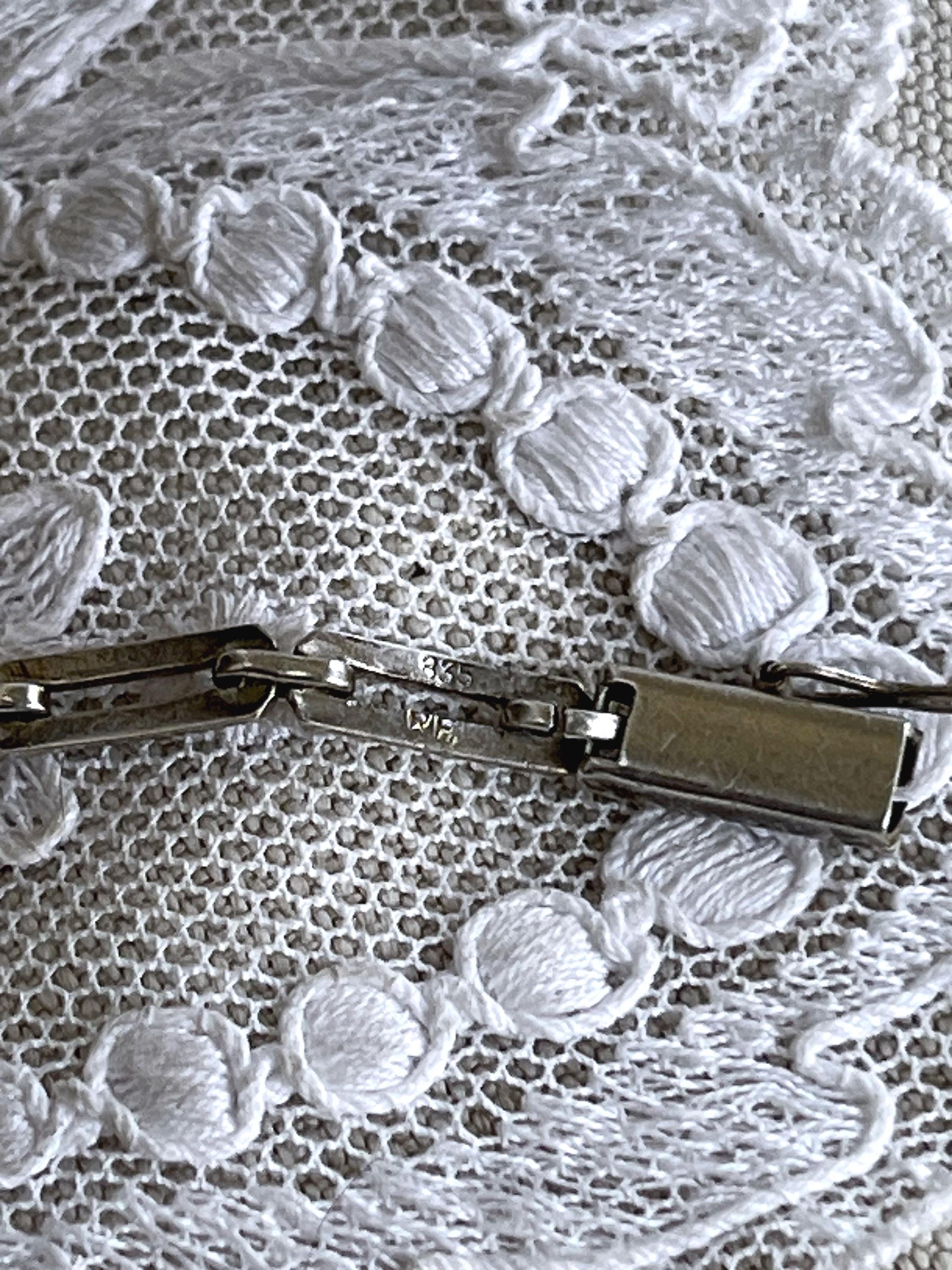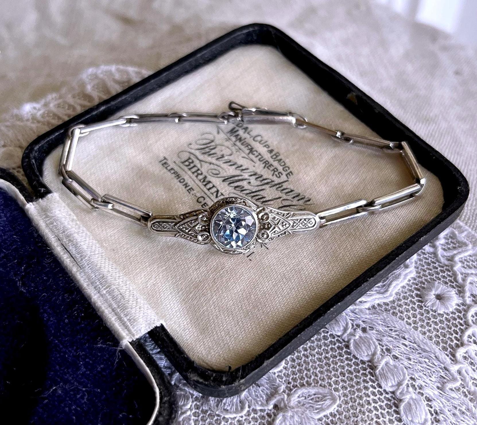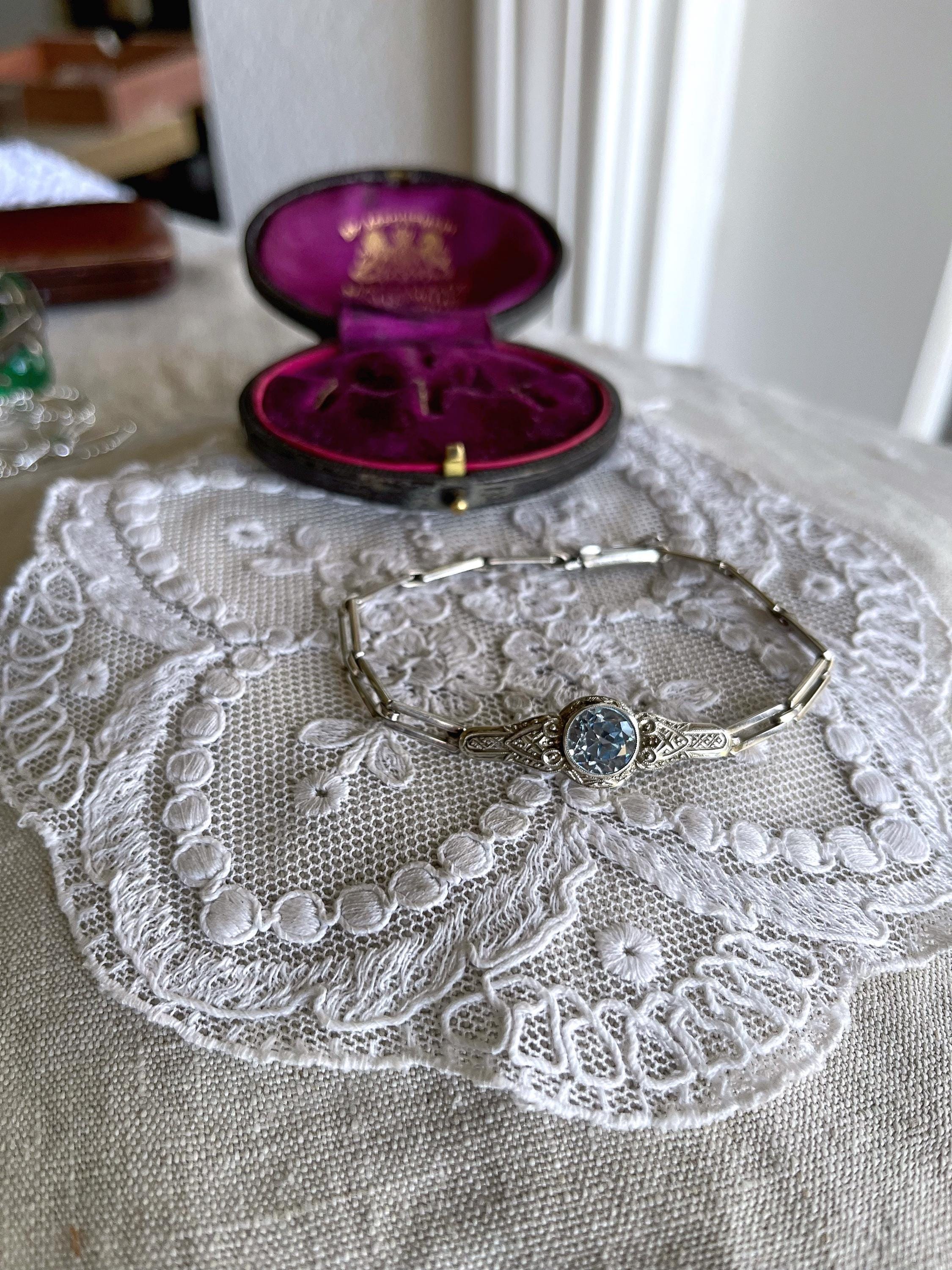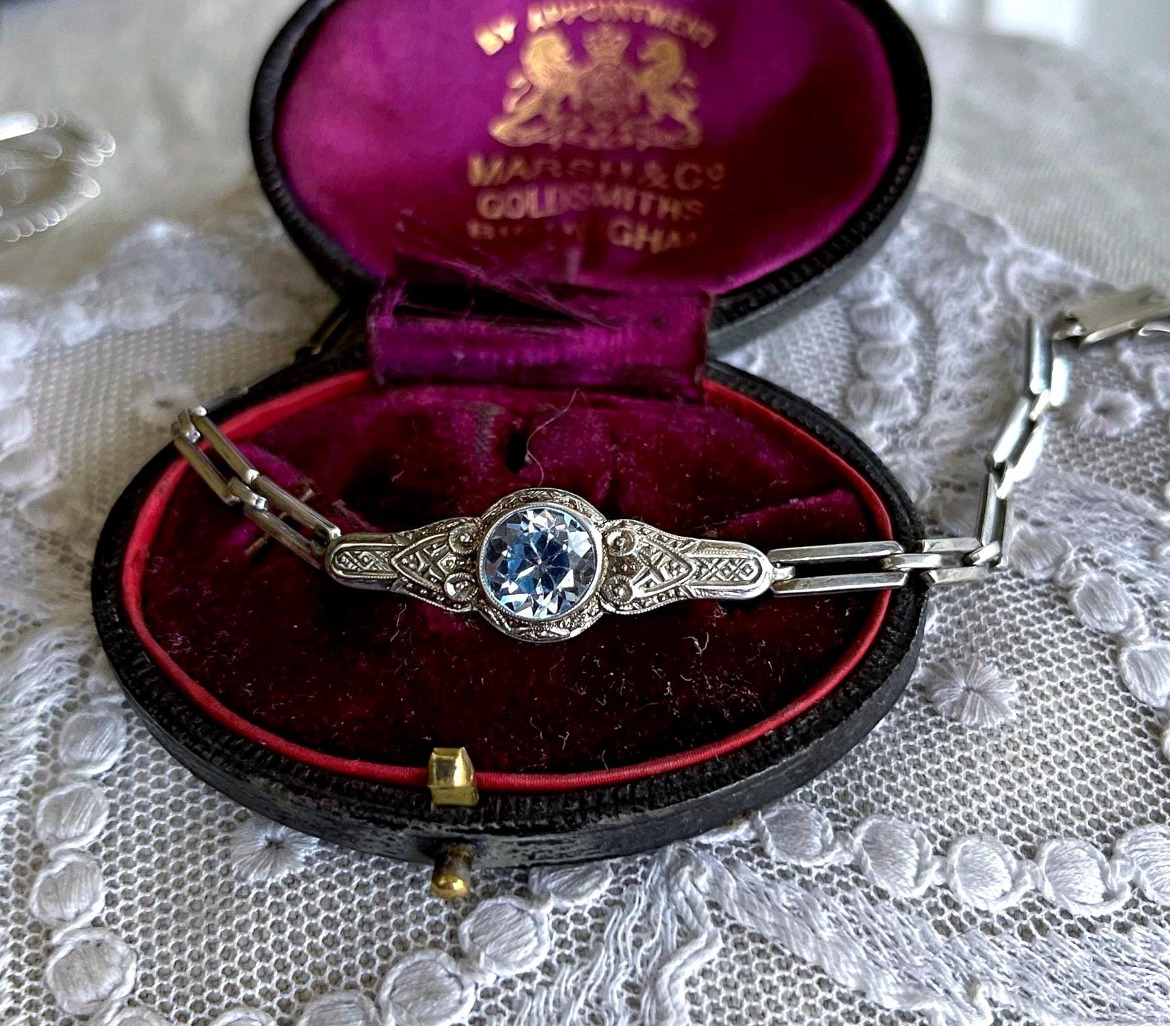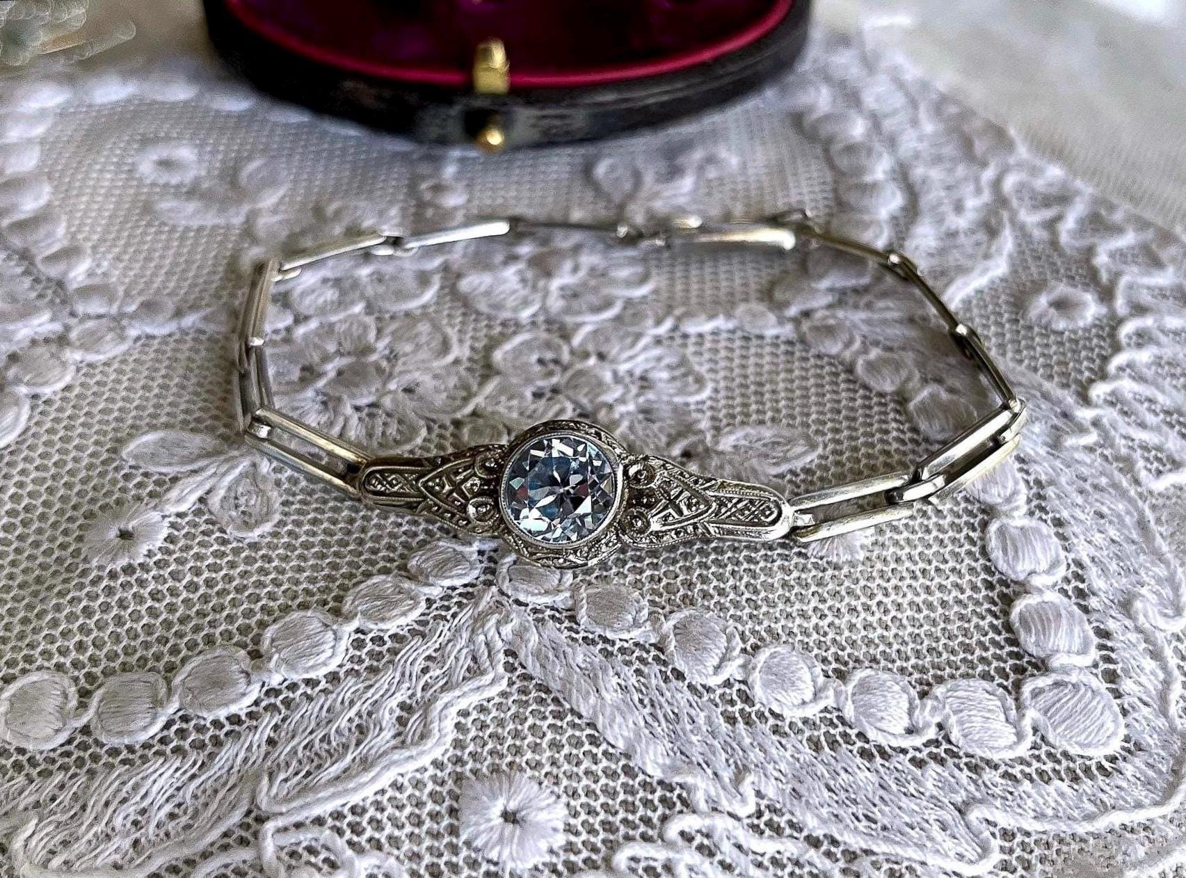 Featuring an absolutely gorgeous vintage Richard Friedel R.F. Germany Art Deco 835 silver link bracelet adorned with a dazzling blue spinel gemstone set in a beautiful decorative setting. Bracelet measures approximately 6.75 inches around at 7.5 grams respectively. In excellent antique condition with minimal wear, a functional clasped stamped 835 R.F. This stunning piece shines wonderfully, is completely wearable and ready to pass on for generations! A fabulous, unique something blue!