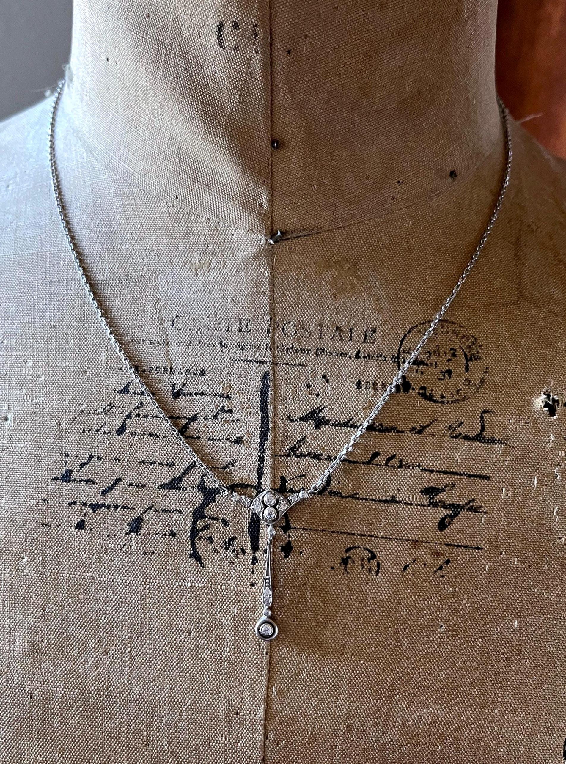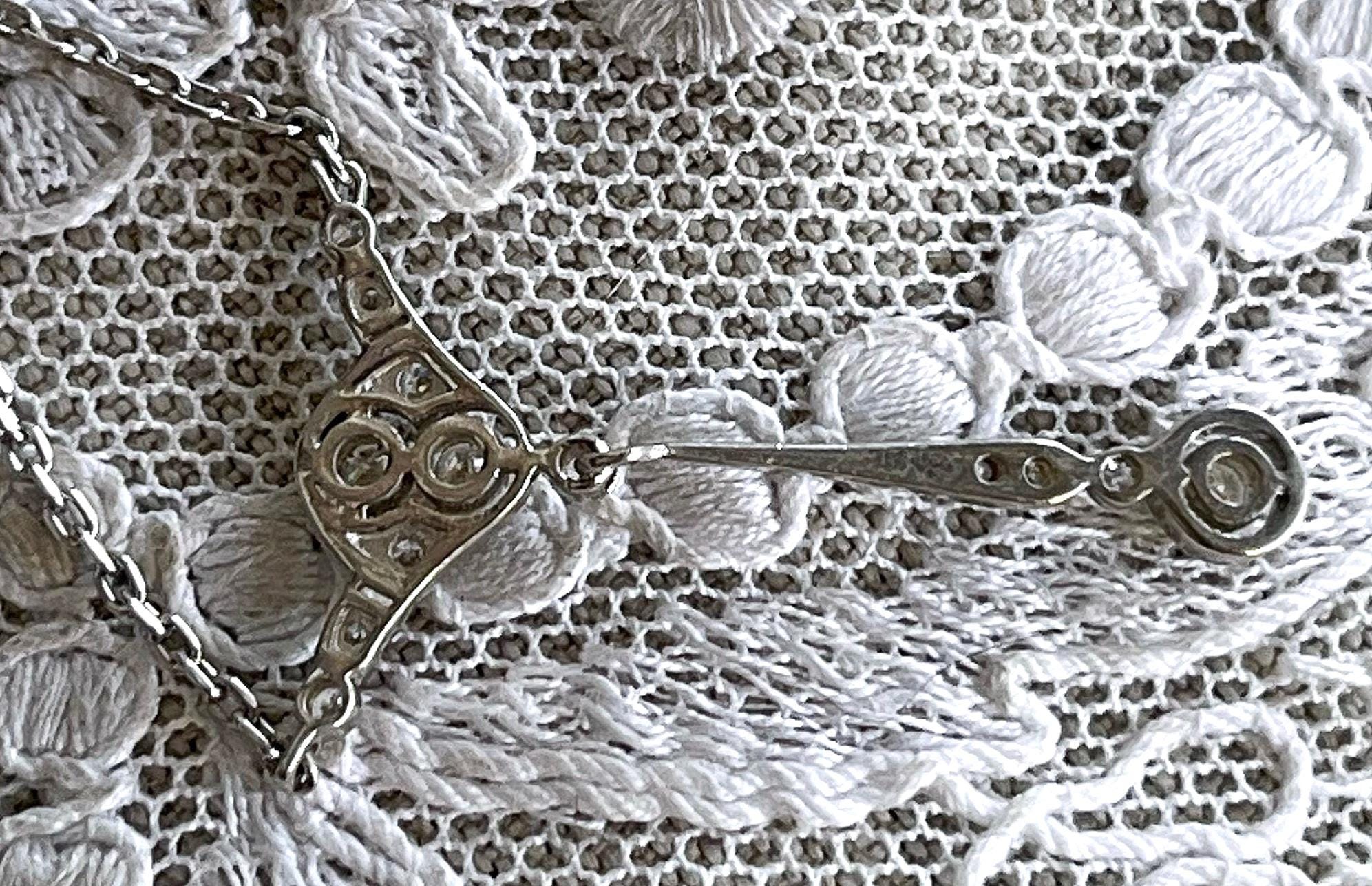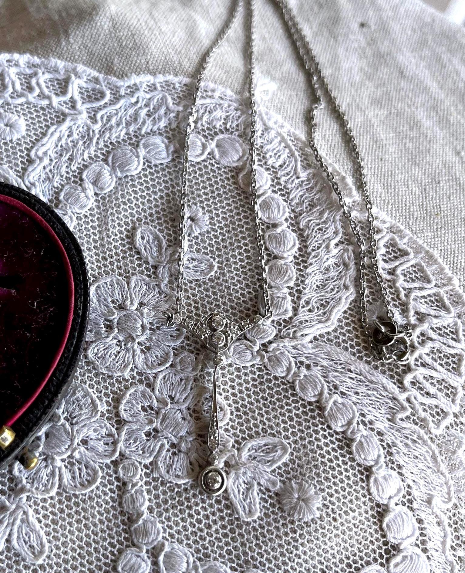 Featuring a beautiful vintage Edwardian Revival demure sterling silver lavaliere necklace adorned with an intricate sterling Edwardian style accented with brilliant sparkling CZ crystals set in closed back settings. Necklace measures approximately 18 inches around with a 1.5 inch pendant drop at 3.16 grams respectively. Stamped 925 on the clasp which in excellent working order. Necklace is in pristine condition , unique and ready to wear!