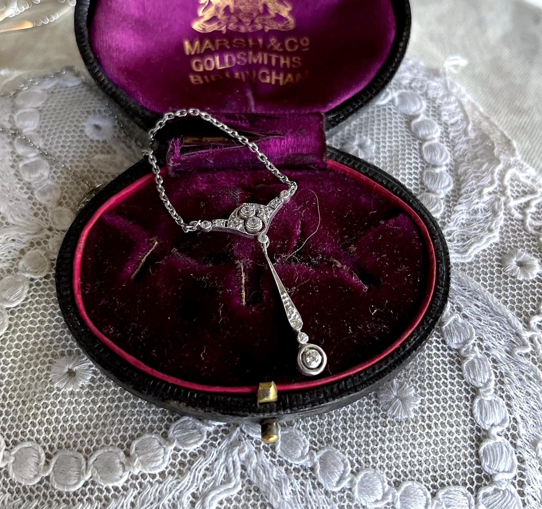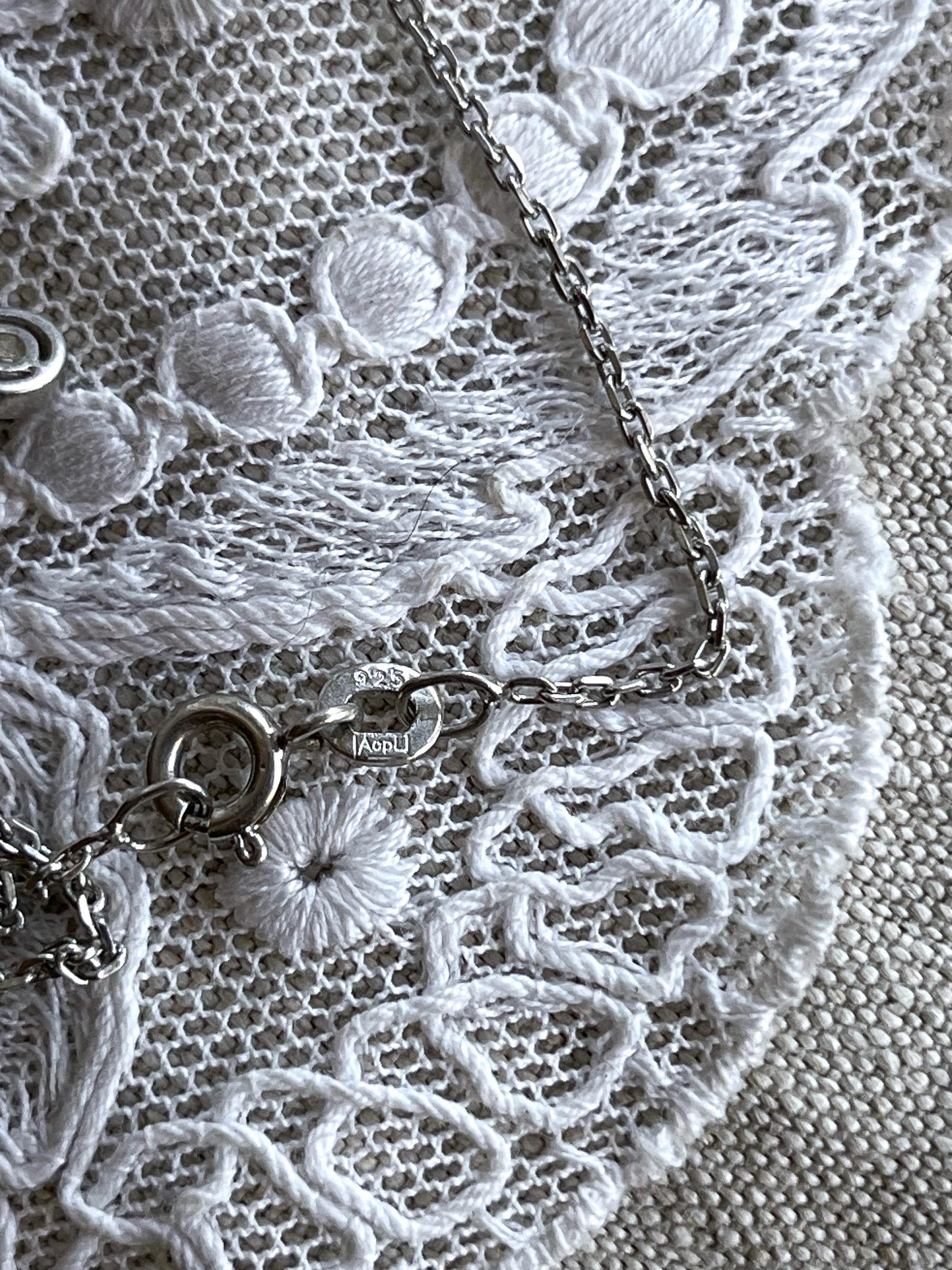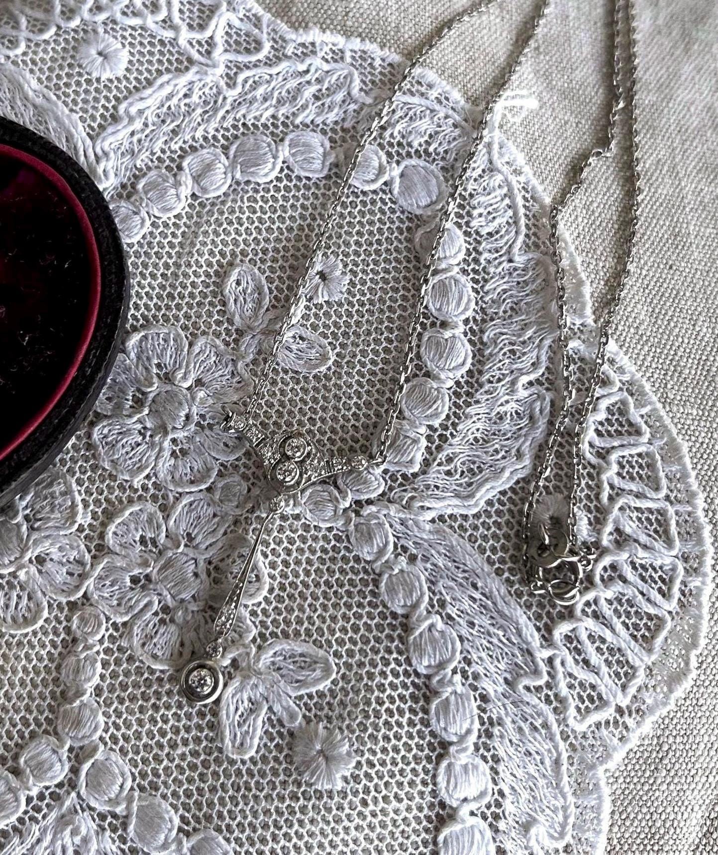 Featuring a beautiful vintage Edwardian Revival demure sterling silver lavaliere necklace adorned with an intricate sterling Edwardian style accented with brilliant sparkling CZ crystals set in closed back settings. Necklace measures approximately 18 inches around with a 1.5 inch pendant drop at 3.16 grams respectively. Stamped 925 on the clasp which in excellent working order. Necklace is in pristine condition , unique and ready to wear!