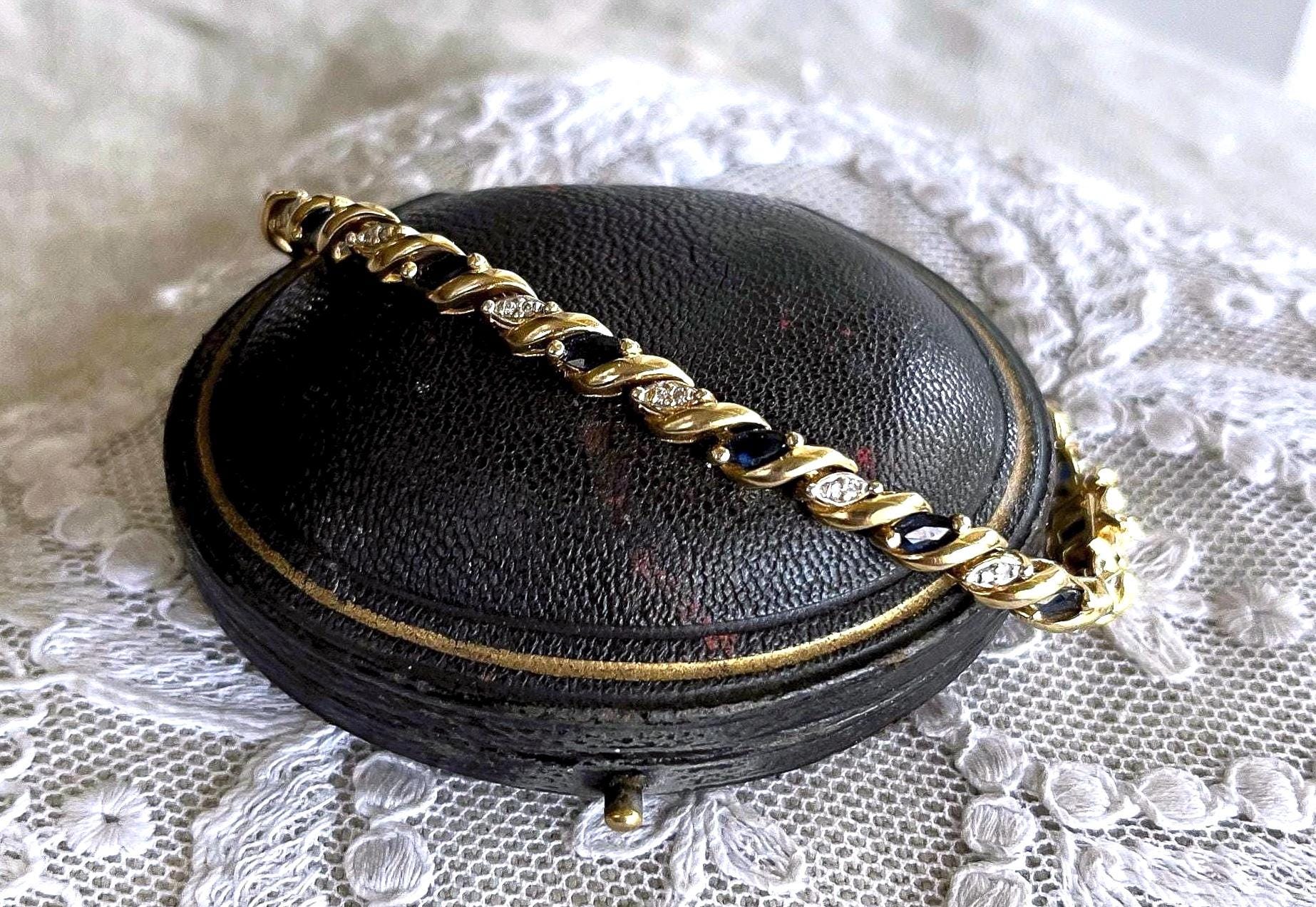Featuring a classy vintage circa 1990s solid 14k yellow gold fancy link tennis bracelet adorned with brilliant genuine sapphires and diamonds set in closed pronged settings with an intricate unique links. Bracelet is in fine condition with a functional diamond encrusted slide clasp hallmarked 14K. Bracelet measures approximately 7.2 inches around at 13.73 grams respectively. A beautiful piece, an investment worth wearing.