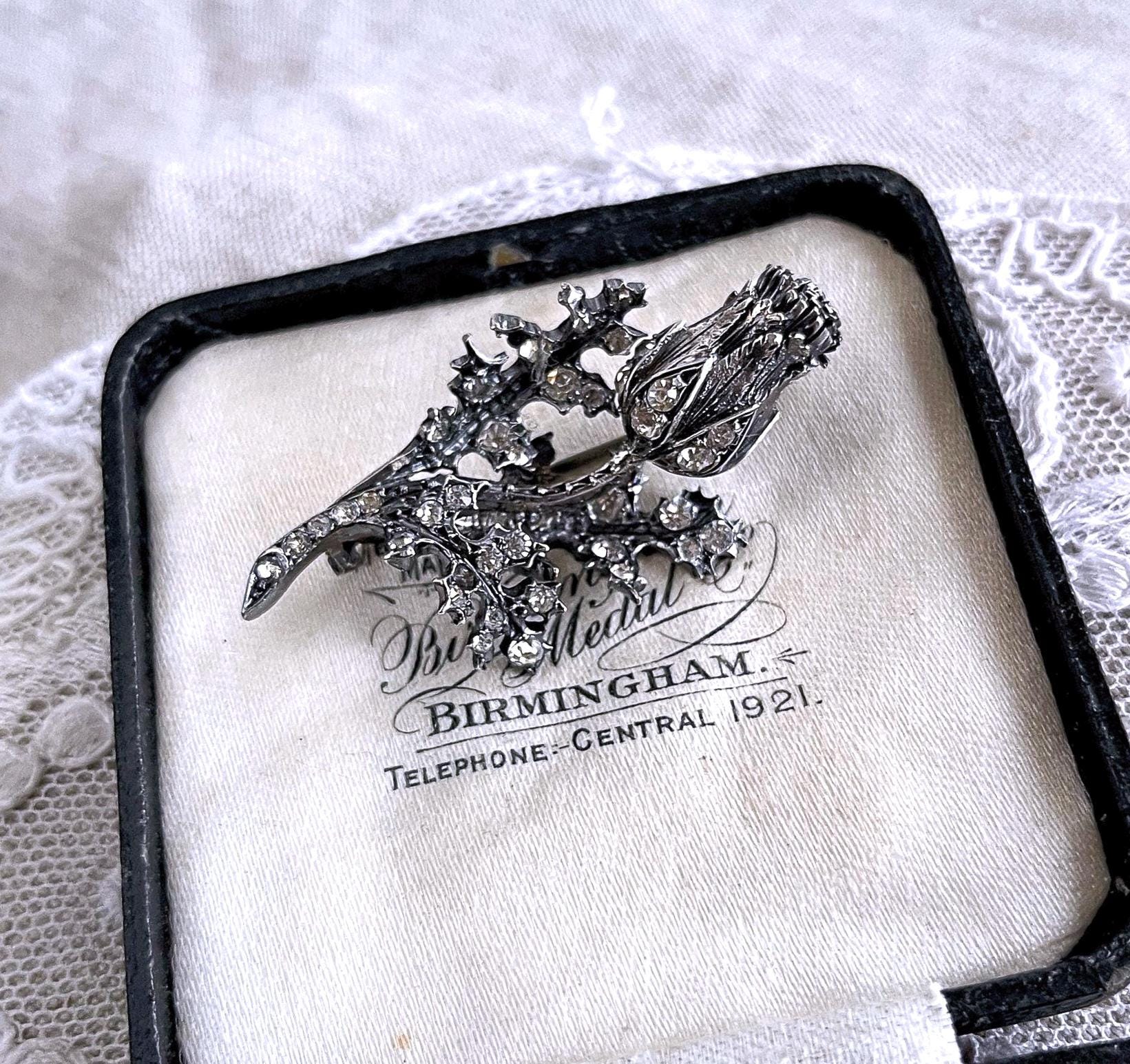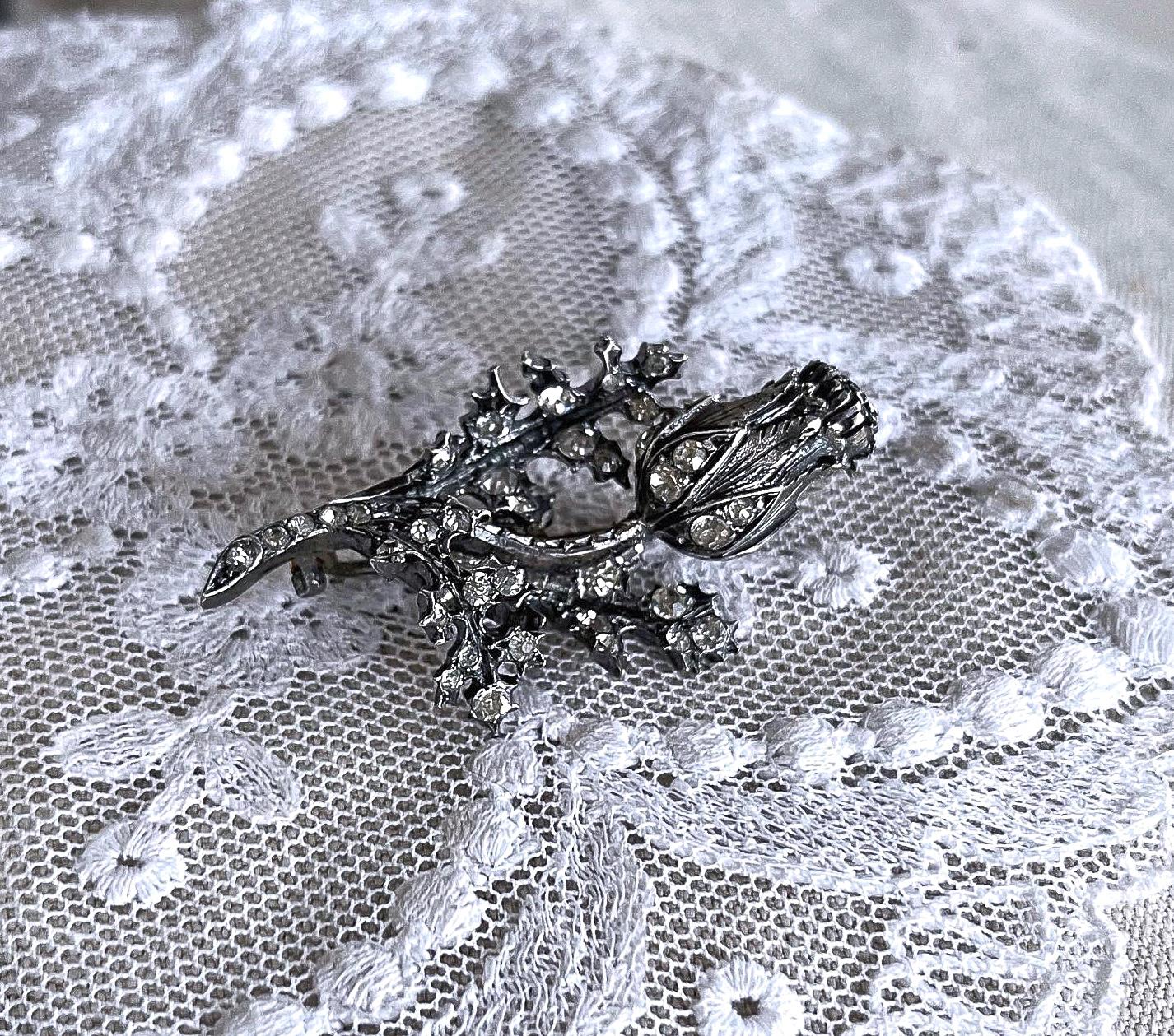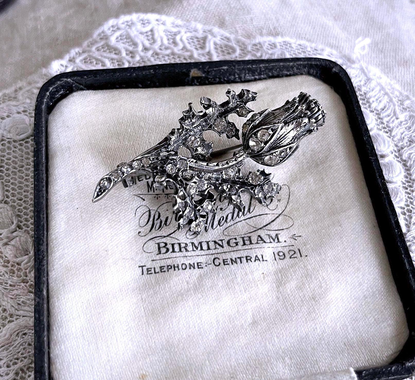 Featuring a gorgeous antique Victorian sterling silver sparkling Rose thistle brooch adorned with brilliant faceted closed foil back stones set in a decorative floral motif. Brooch is in excellent antique condition with functional antique C clasp, slight patina with all stones intact and accounted for, tested as STERLING. Brooch measures approximately 1.9 inches at 14.62 grams respectively and stones are clear and sparkle beautifully! .