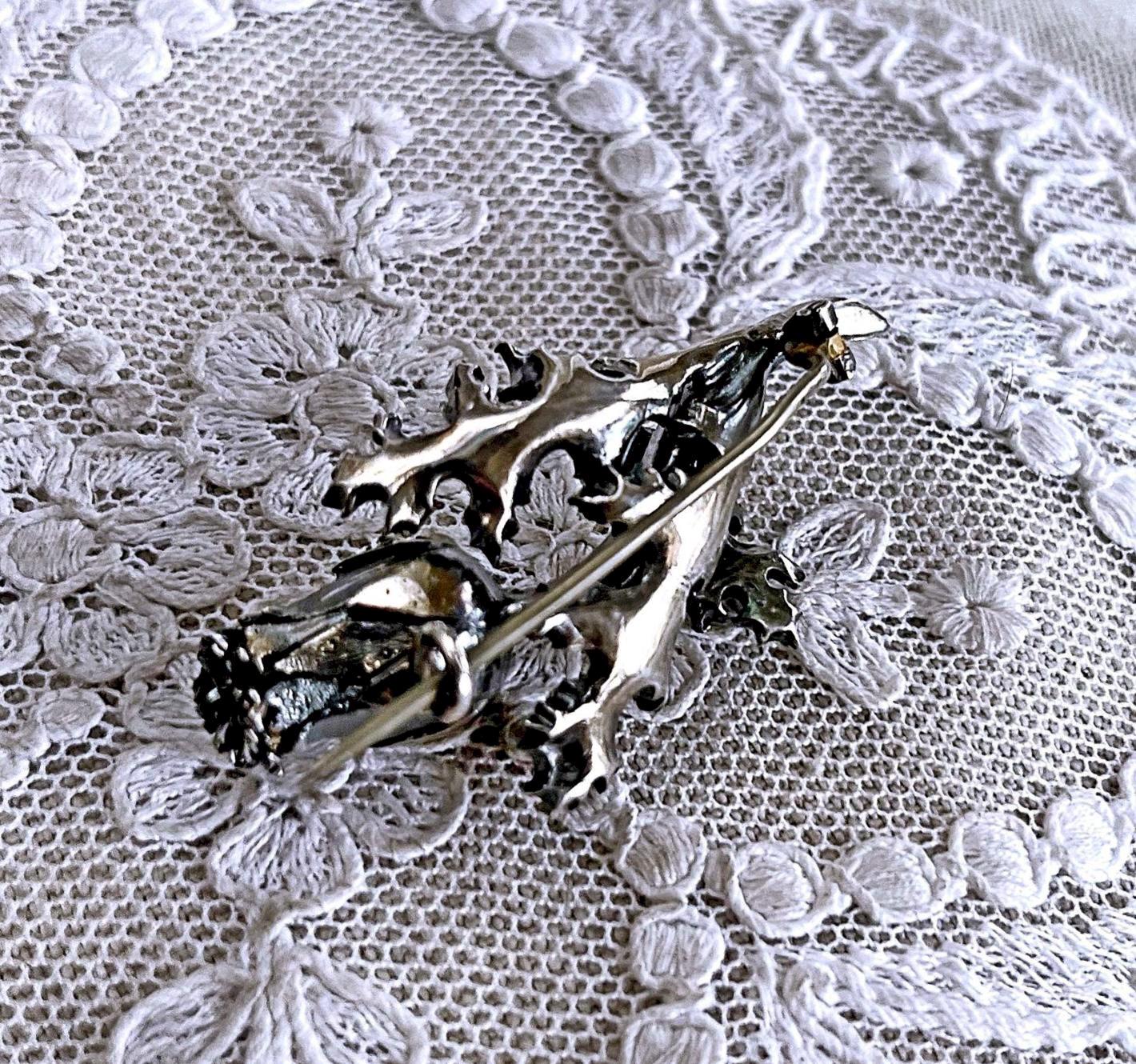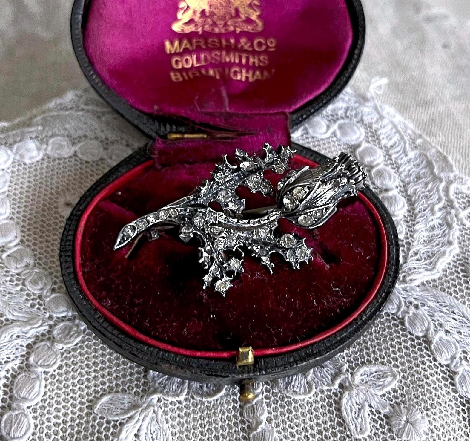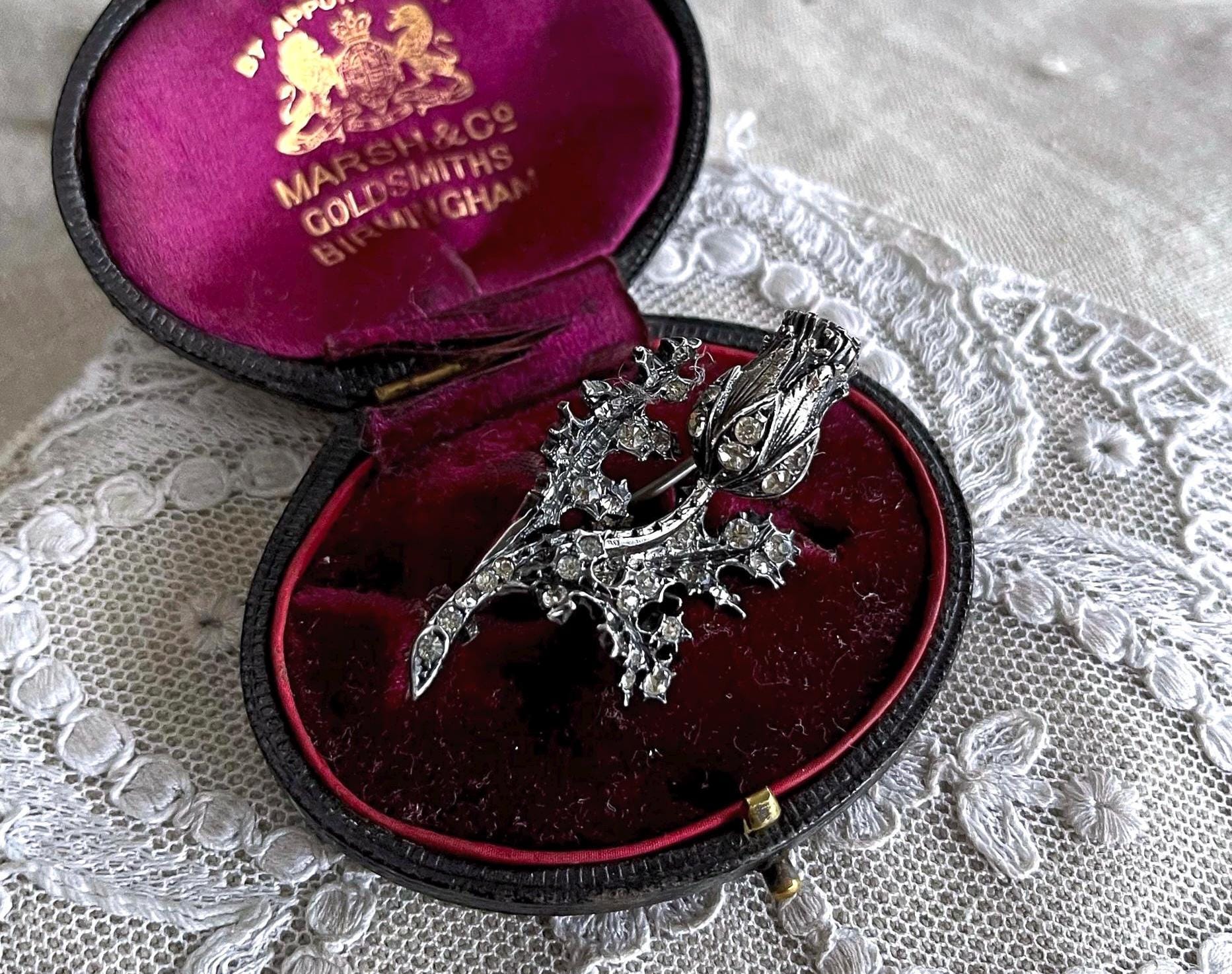 Featuring a gorgeous antique Victorian sterling silver sparkling Rose thistle brooch adorned with brilliant faceted closed foil back stones set in a decorative floral motif. Brooch is in excellent antique condition with functional antique C clasp, slight patina with all stones intact and accounted for, tested as STERLING. Brooch measures approximately 1.9 inches at 14.62 grams respectively and stones are clear and sparkle beautifully! .