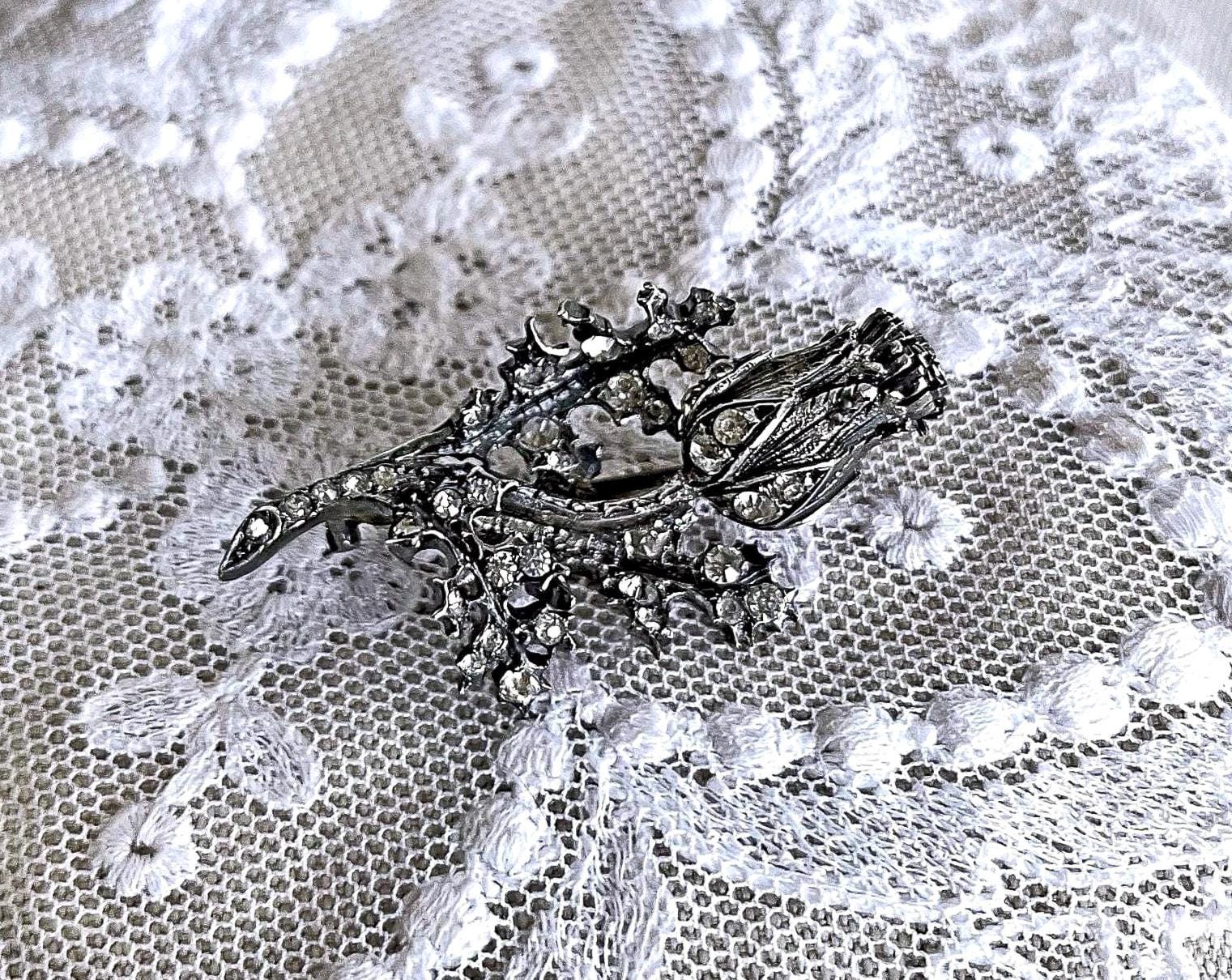 Featuring a gorgeous antique Victorian sterling silver sparkling Rose thistle brooch adorned with brilliant faceted closed foil back stones set in a decorative floral motif. Brooch is in excellent antique condition with functional antique C clasp, slight patina with all stones intact and accounted for, tested as STERLING. Brooch measures approximately 1.9 inches at 14.62 grams respectively and stones are clear and sparkle beautifully! .