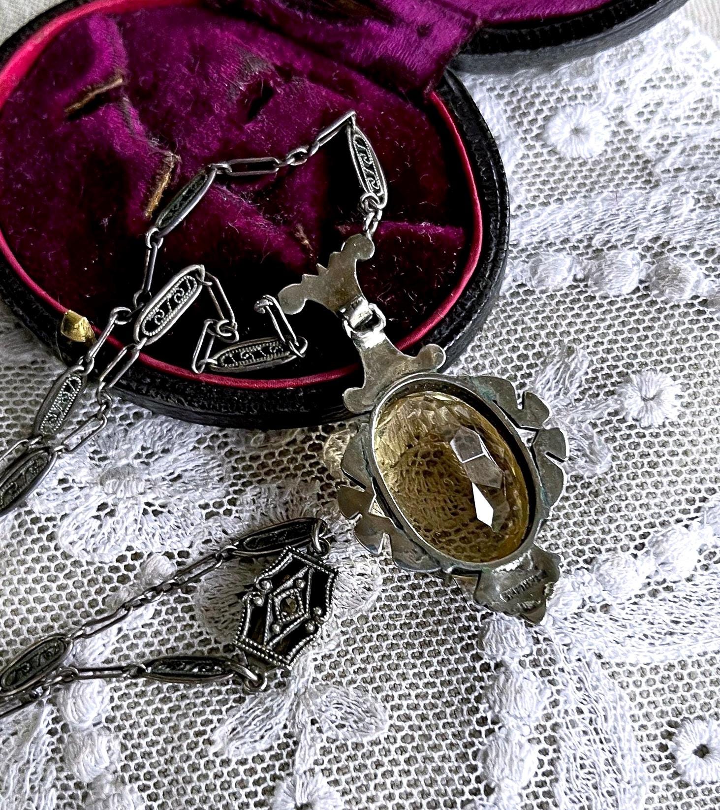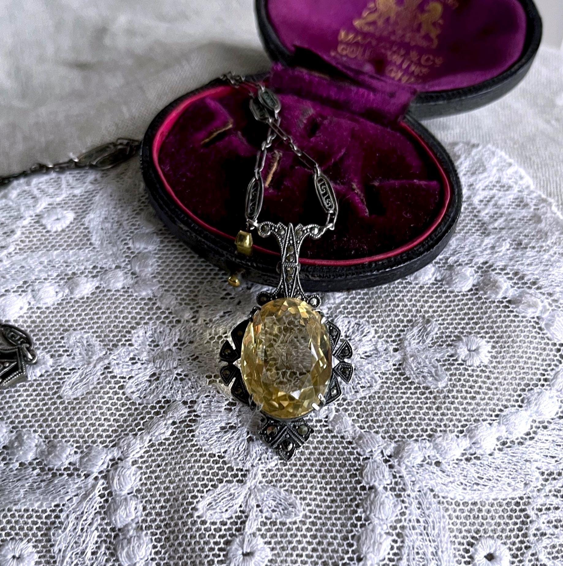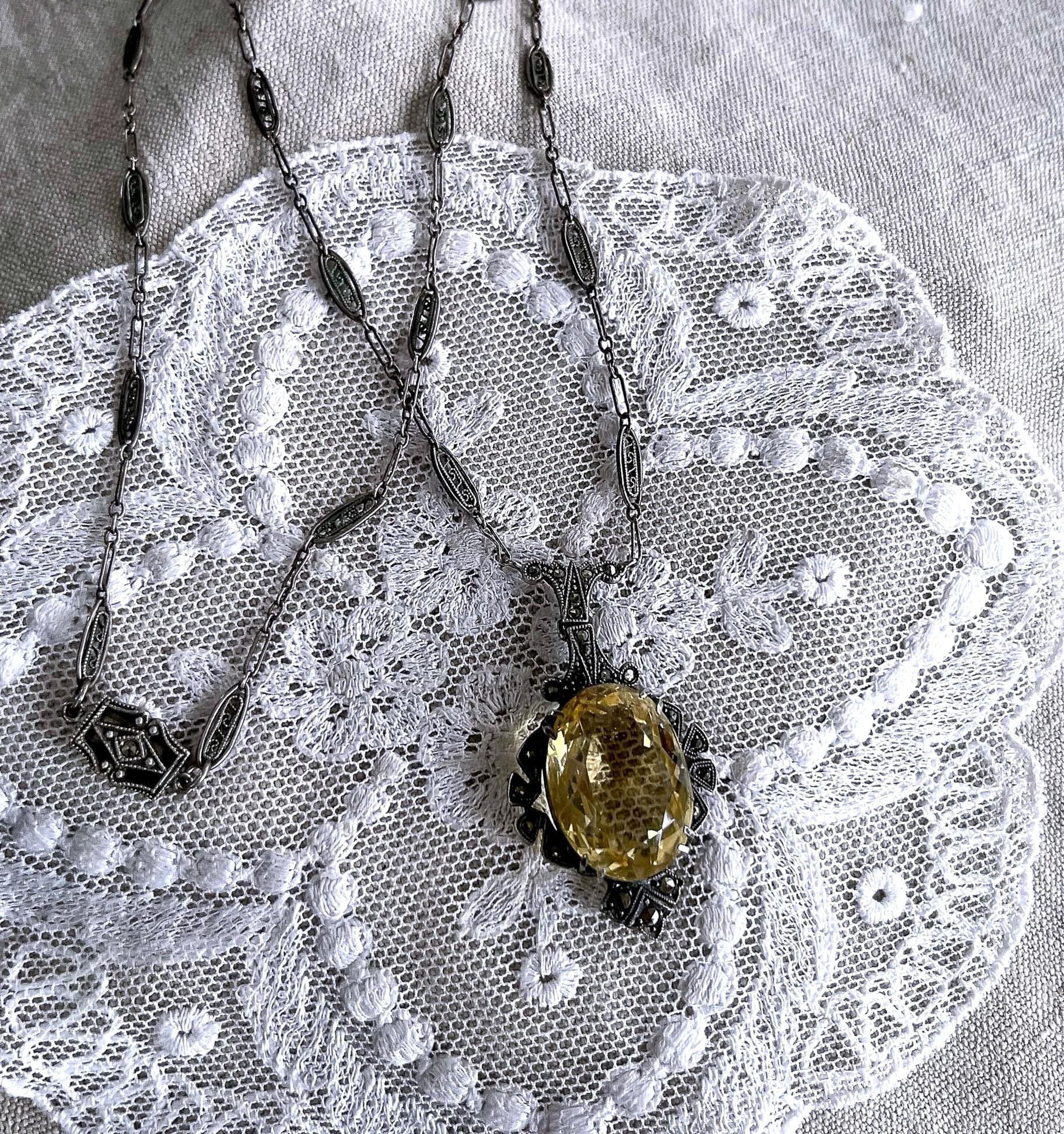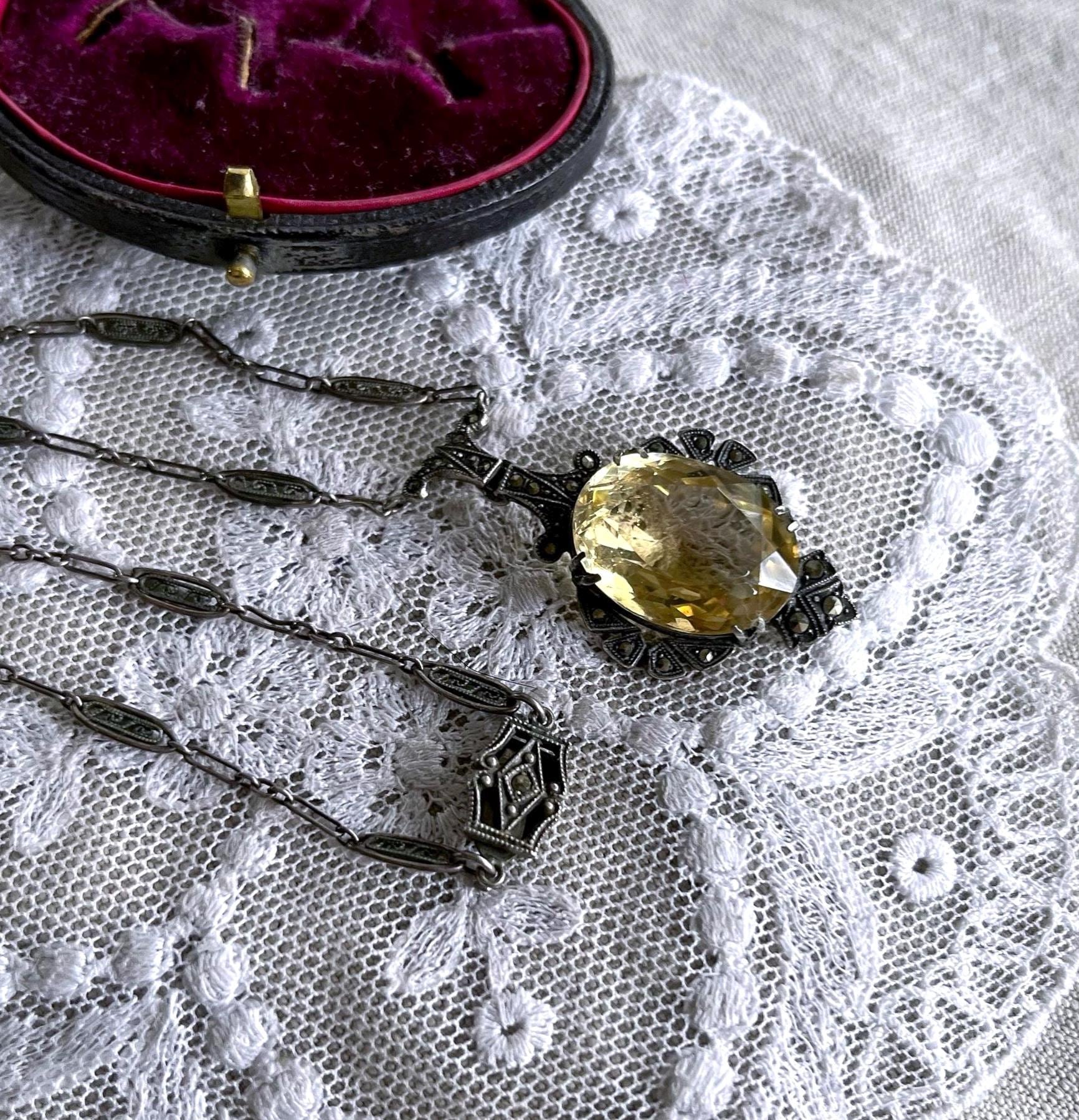 Featuring a spectacular antique Belle Époque Edwardian 1910s sterling silver lavaliere necklace adorned with a brilliant sparkling genuine citrine stone accented with beautiful Marcasite crystals. Necklace measures approximately 16 inches around with a 1.9 inch pendant drop at 6.92 grams respectively. This superb antique piece is in excellent antique condition with functional hallmarked box spring clasp hallmarked STERLING as well as on the reverse of center piece, a lovely patina with all stones intact and accounted for. A truly one of a kind Edwardian necklace, beautifully designed and handcrafted in the Belle Époque Era before World War I.