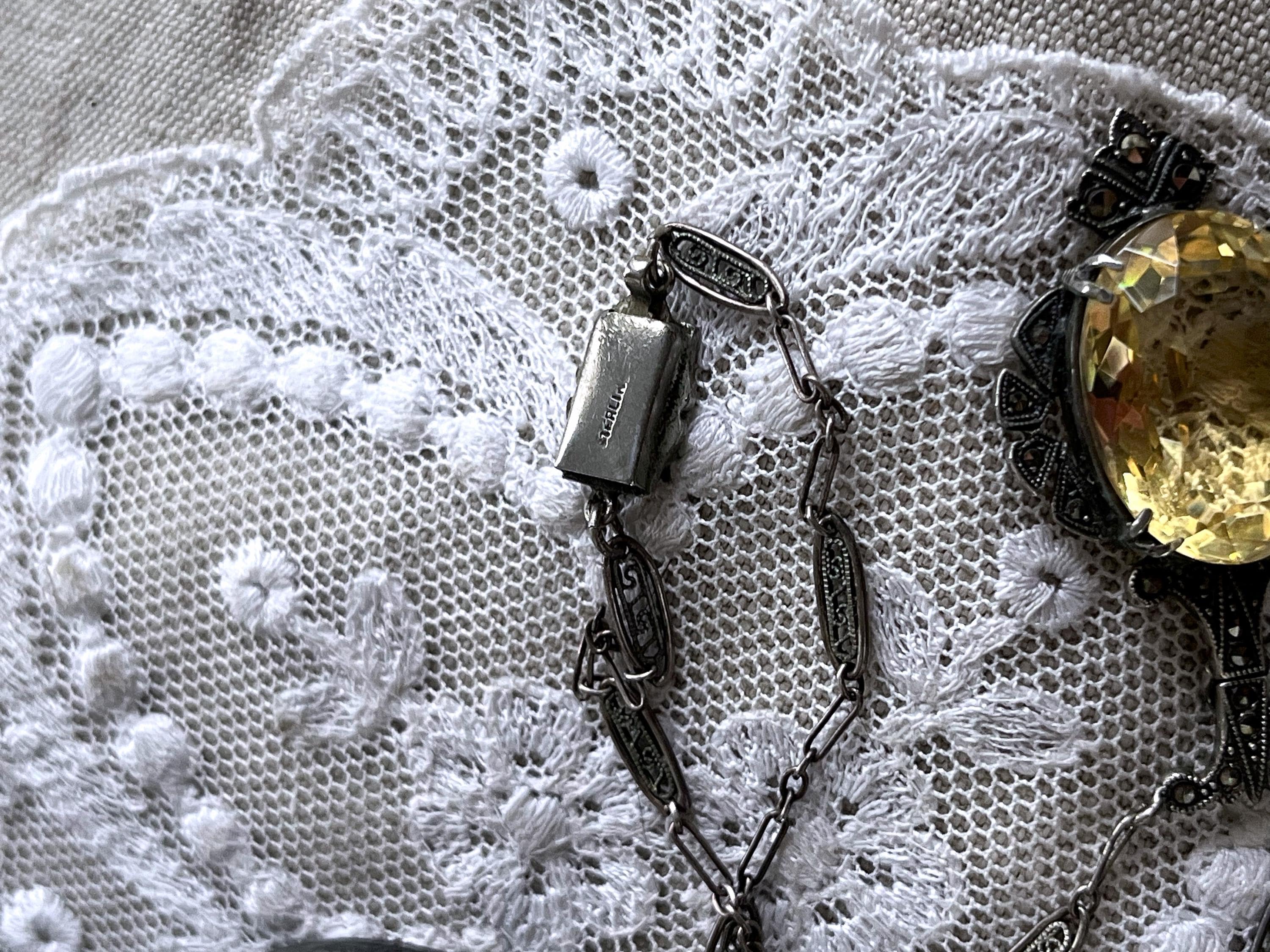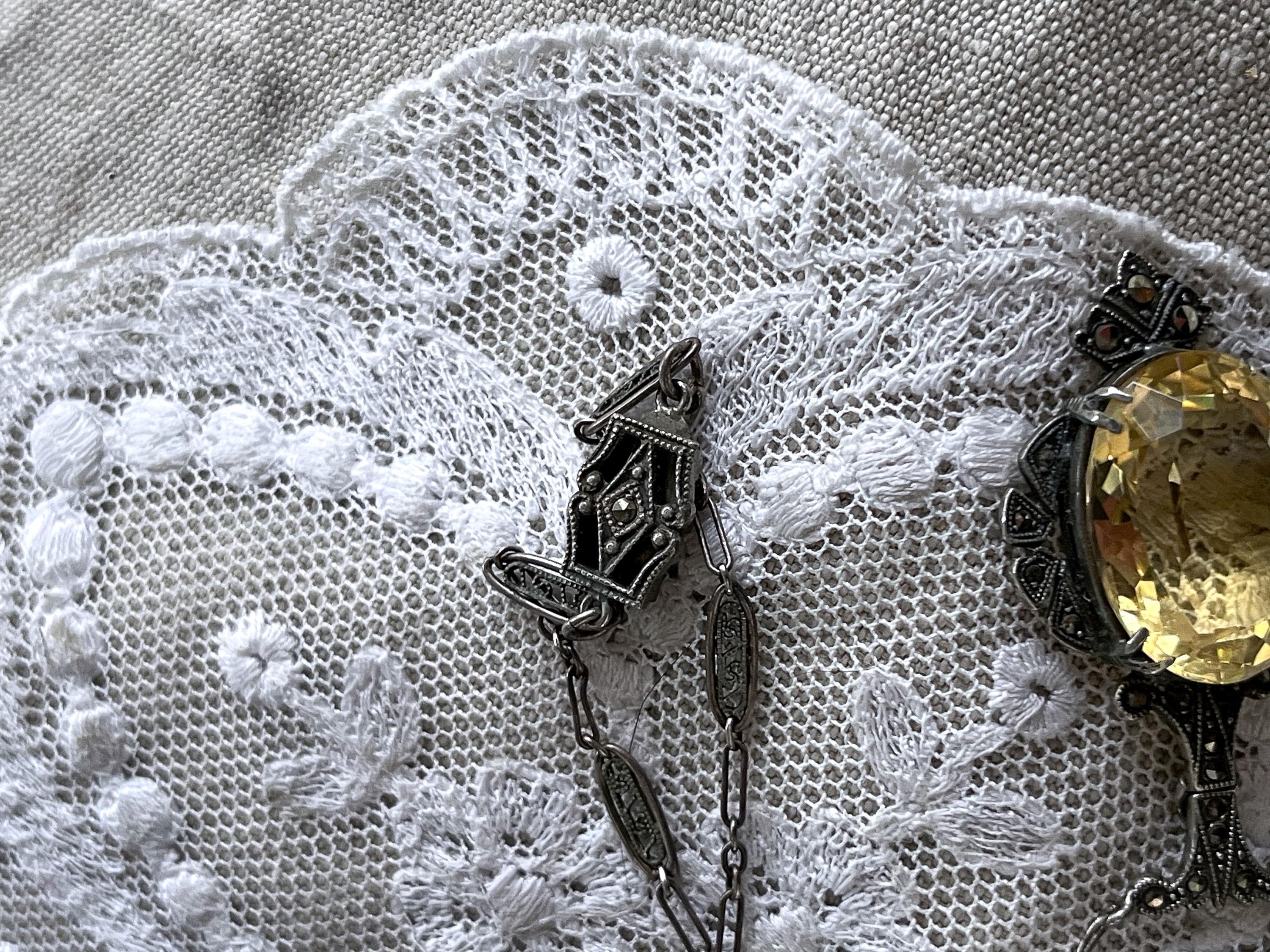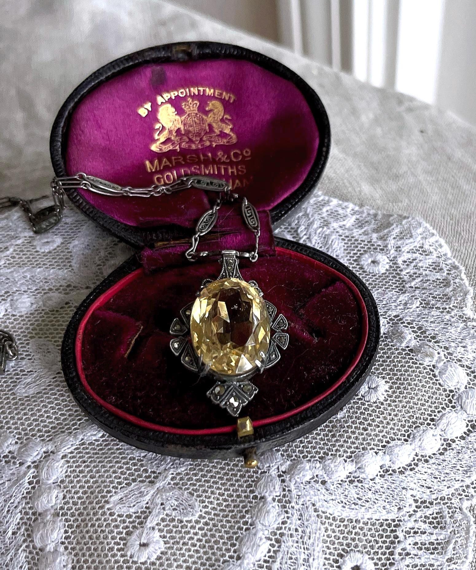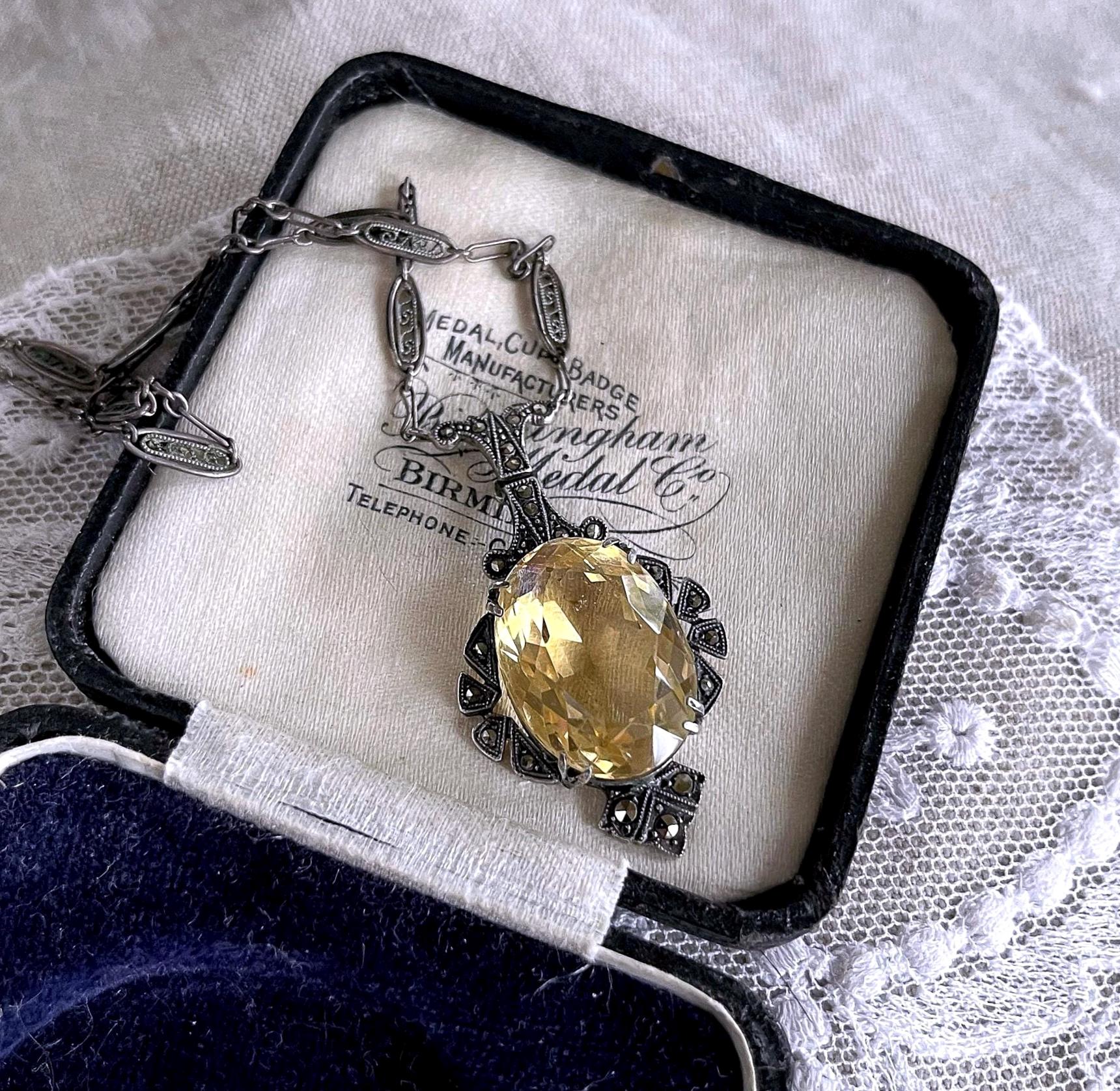 Featuring a spectacular antique Belle Époque Edwardian 1910s sterling silver lavaliere necklace adorned with a brilliant sparkling genuine citrine stone accented with beautiful Marcasite crystals. Necklace measures approximately 16 inches around with a 1.9 inch pendant drop at 6.92 grams respectively. This superb antique piece is in excellent antique condition with functional hallmarked box spring clasp hallmarked STERLING as well as on the reverse of center piece, a lovely patina with all stones intact and accounted for. A truly one of a kind Edwardian necklace, beautifully designed and handcrafted in the Belle Époque Era before World War I.