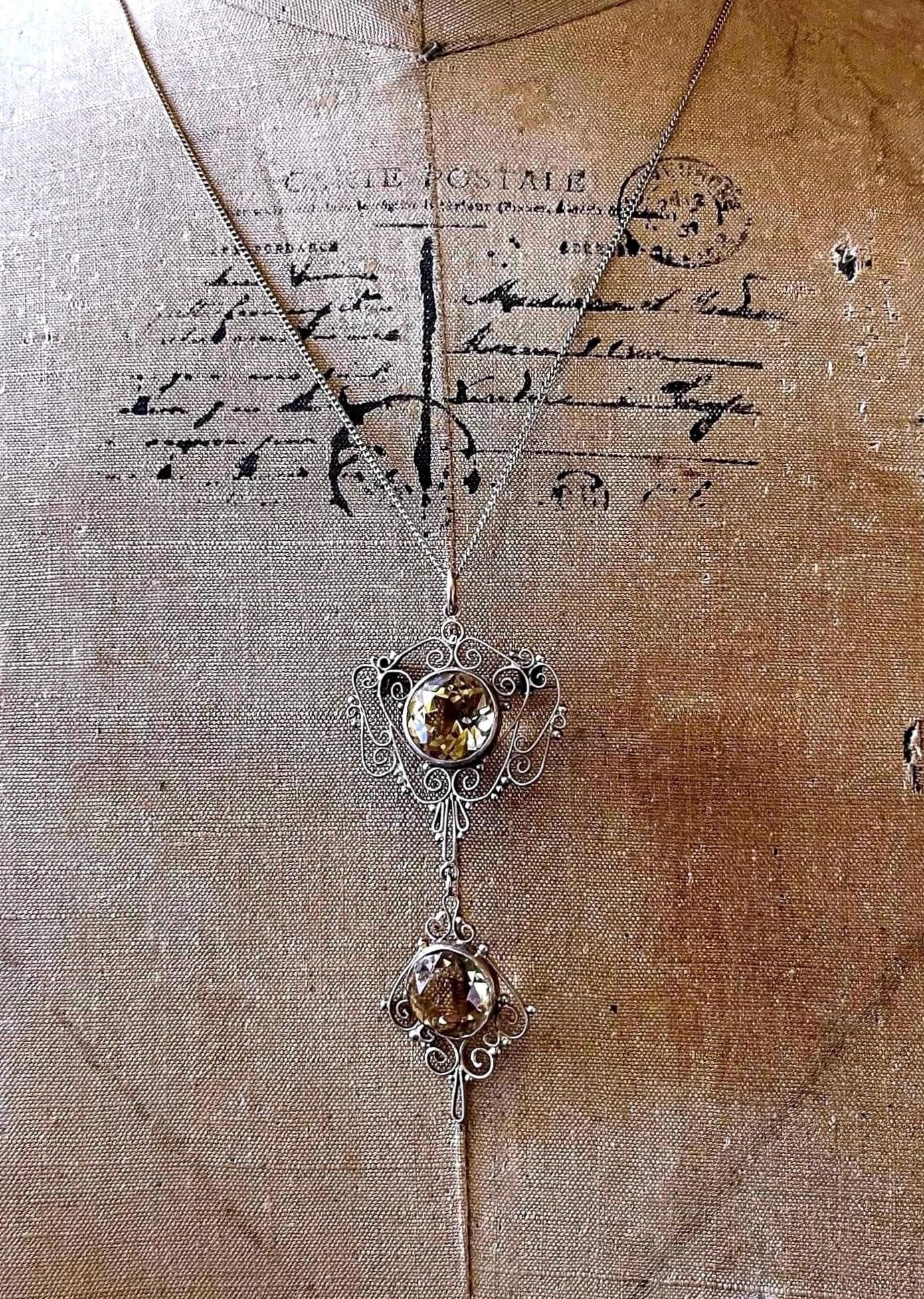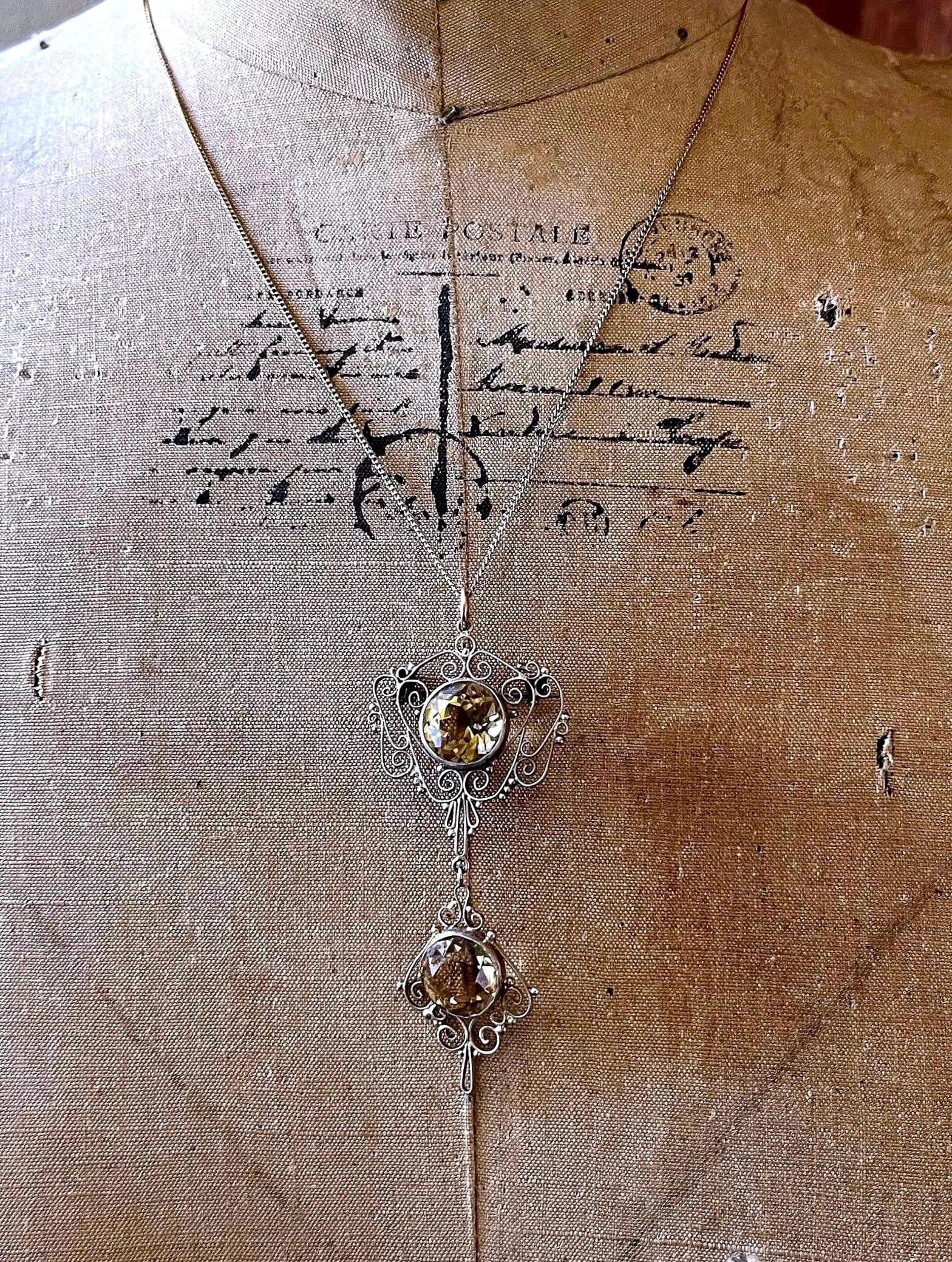 Featuring a gorgeous antique Bohemian Arts and Crafts gold rolled/filled 800 silver necklace adorned with a brilliant faceted Citrine Stone set in an ornate open back Cannetille settings. Necklace measures approximately 20 inches around with a 3 inch pendant drop at 7.2 grams respectively. Necklace and pendant are in excellent antique condition with a functional doll filled C spring clasp, a lovely patina with all components intact and accounted for. Beautifully designed and handcrafted over 120 years ago, collectible and wearable!