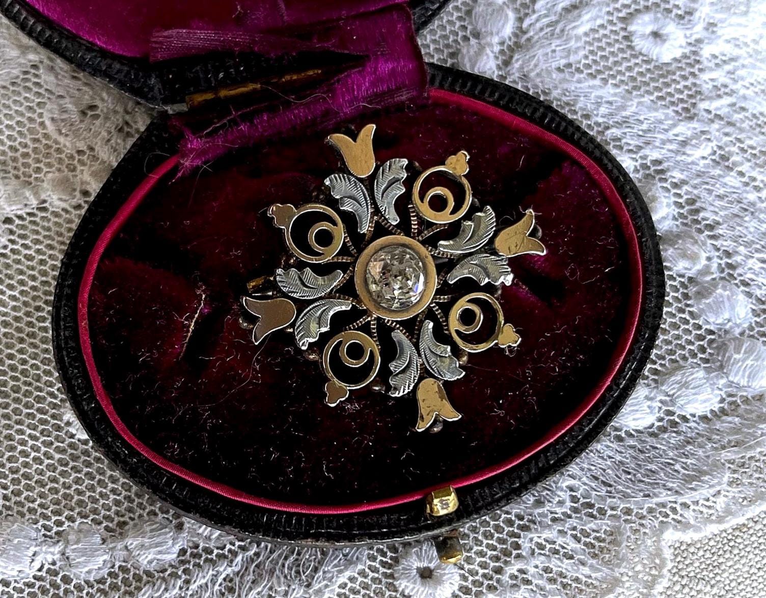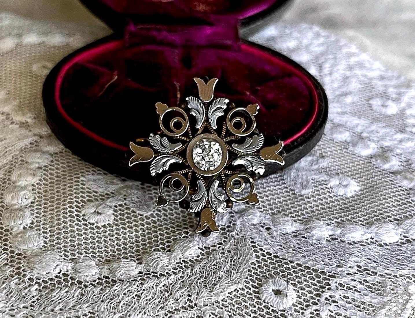 Featuring a dazzling antique Late Victorian sterling silver gold filled lapel brooch adorned with a gorgeous antique rise cut diamond foil back paste stone accented with delicate two tone scroll work with a star flower motif . Brooch is in excellent antique condition with normal wear with a functional antique clasp. Brooch measures approximately 1.9 inches long at 4.72 grams respectively . Hallmarked STERLING/GF on the reverse , this is a splendid, collectible, wearable piece.