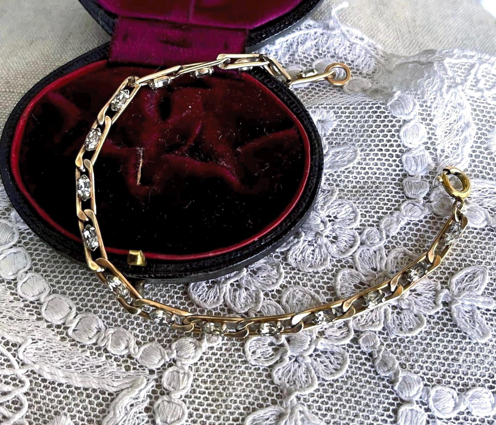 Featuring a fine vintage Krementz solid 12K yellow gold fancy link hallmarked bracelet adorned with brilliant genuine white sapphires set in closed settings. Bracelet is in excellent vintage condition with a replaced functional C spring clasp, hallmared connector ring. Bracelet measures approximately 7 inches around at 4.7 grams respectively, tested as 12k. A beautiful delicate feminine piece, an investment worth wearing.