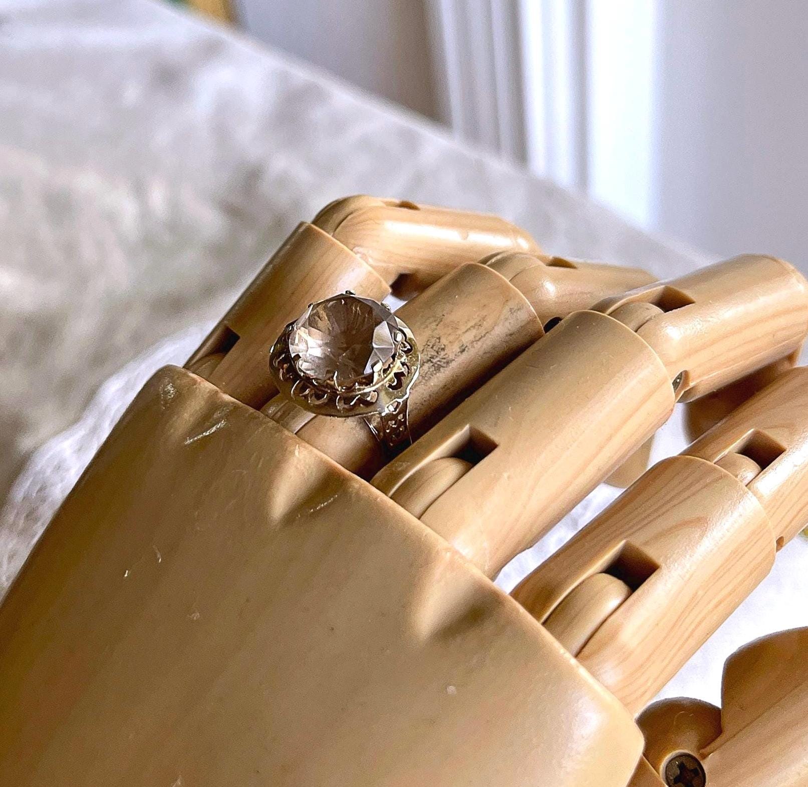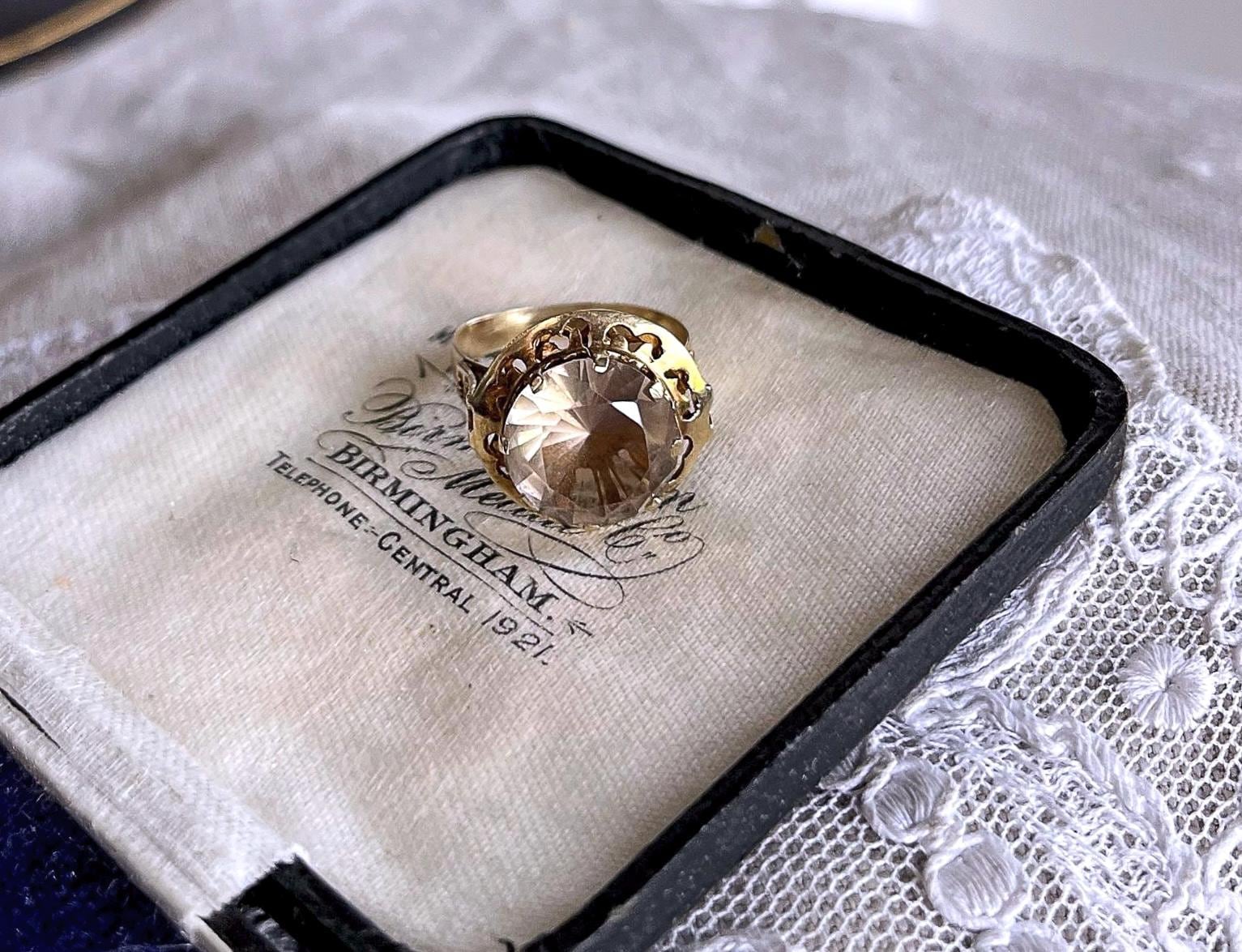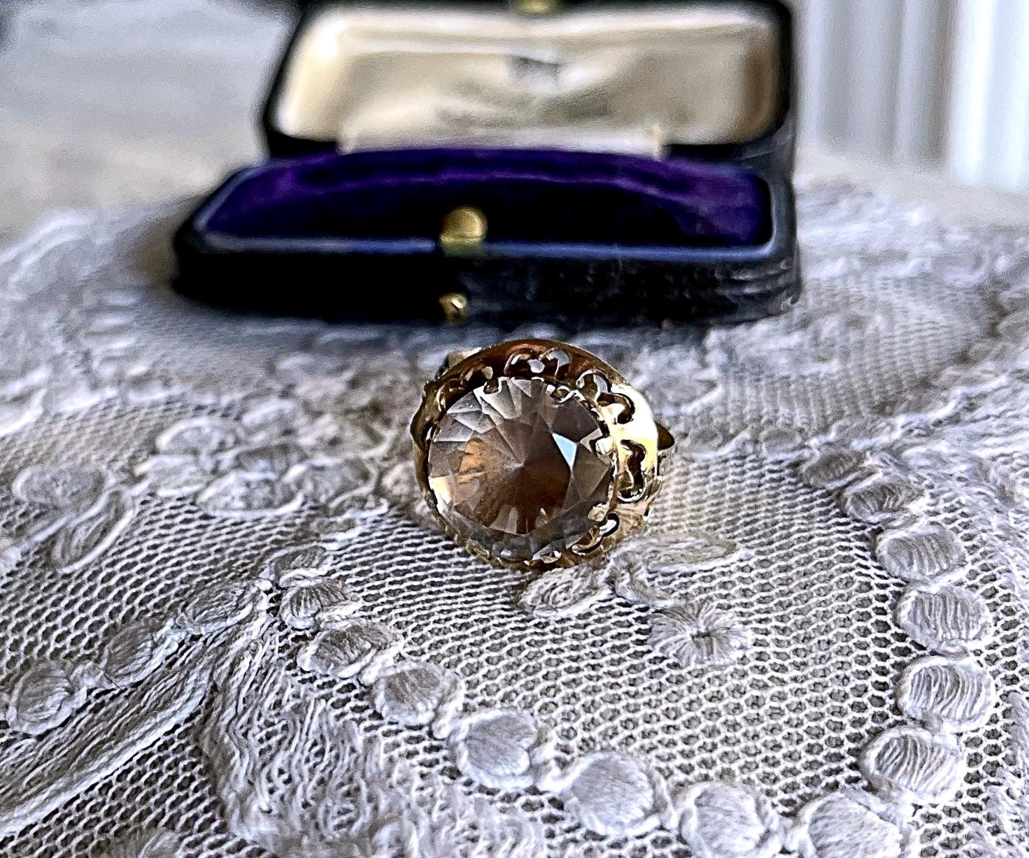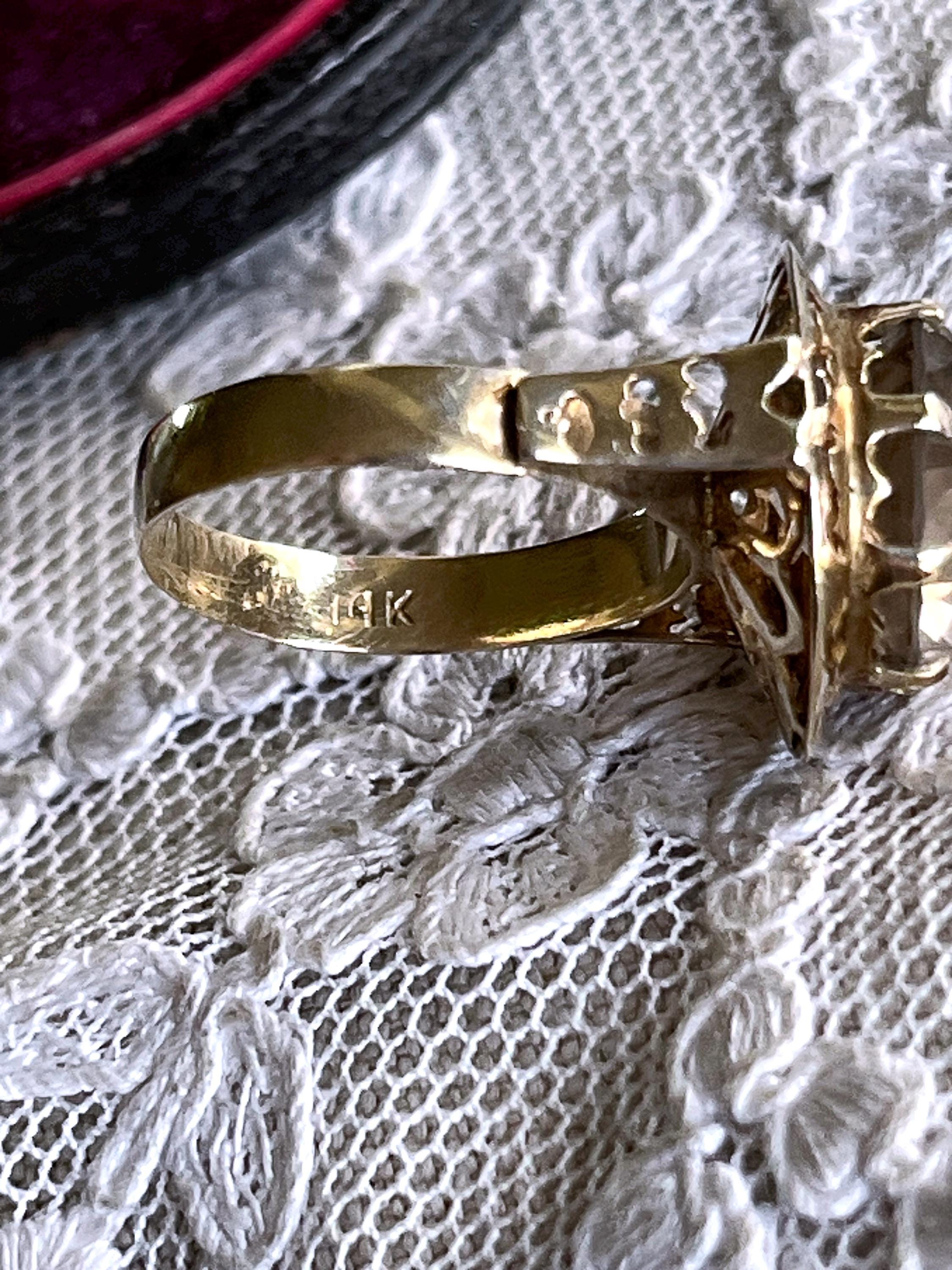 Featuring a magnificent vintage size 7 solid 10k yellow gold decorative Art Deco design statement ring adorned with a 12mm by 8mm genuine prong set faceted Rock Quartz Crystal gemstone. This beautiful unique statement piece is in excellent vintage condition with minimal wear, stamped 10k on the inside of band with all components intact. Ring is approximately size 7 at 3.6 grams respectively. So beautiful and so hard to let go, sparkles like crazy and sits beautifully on the hand!