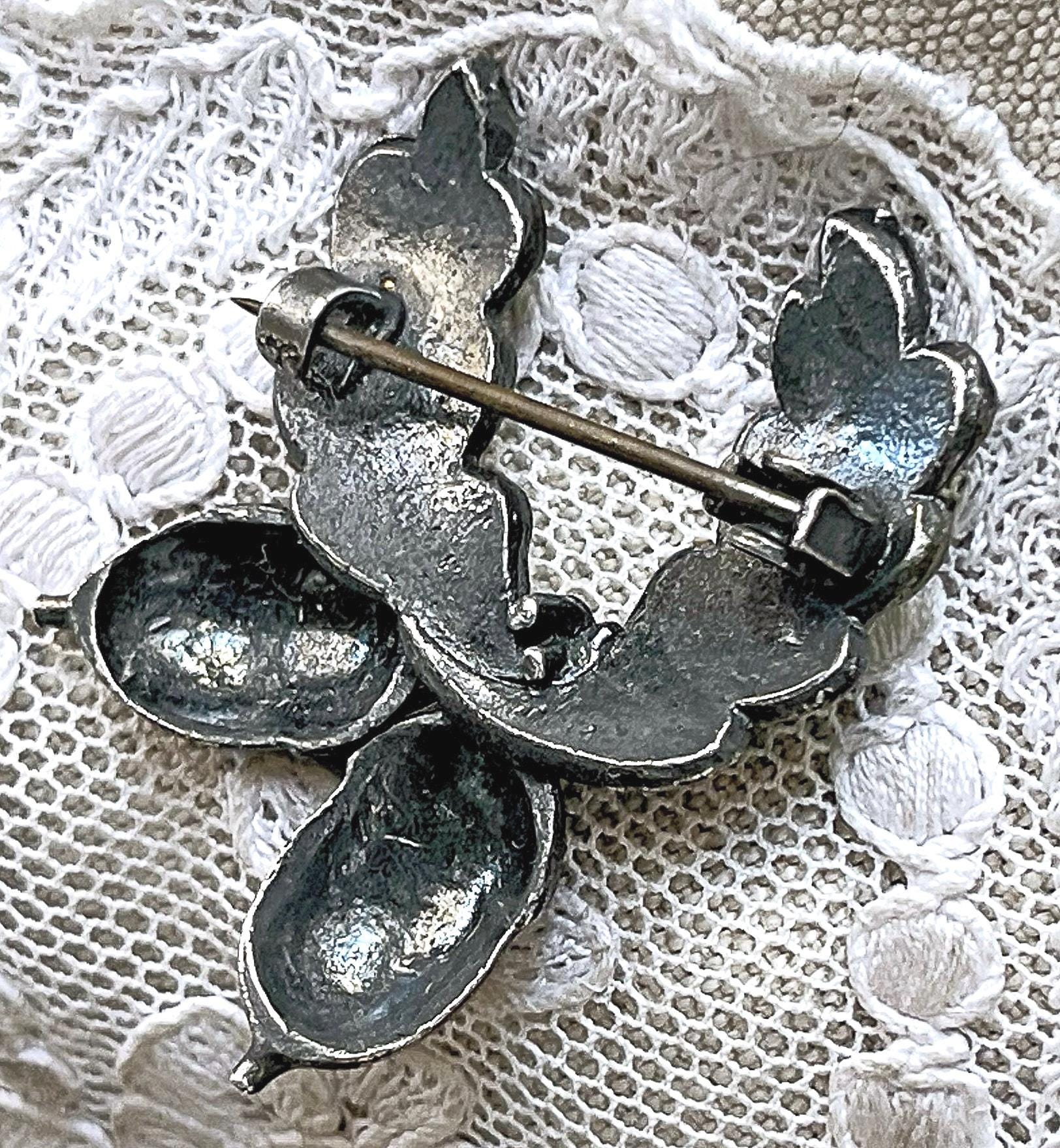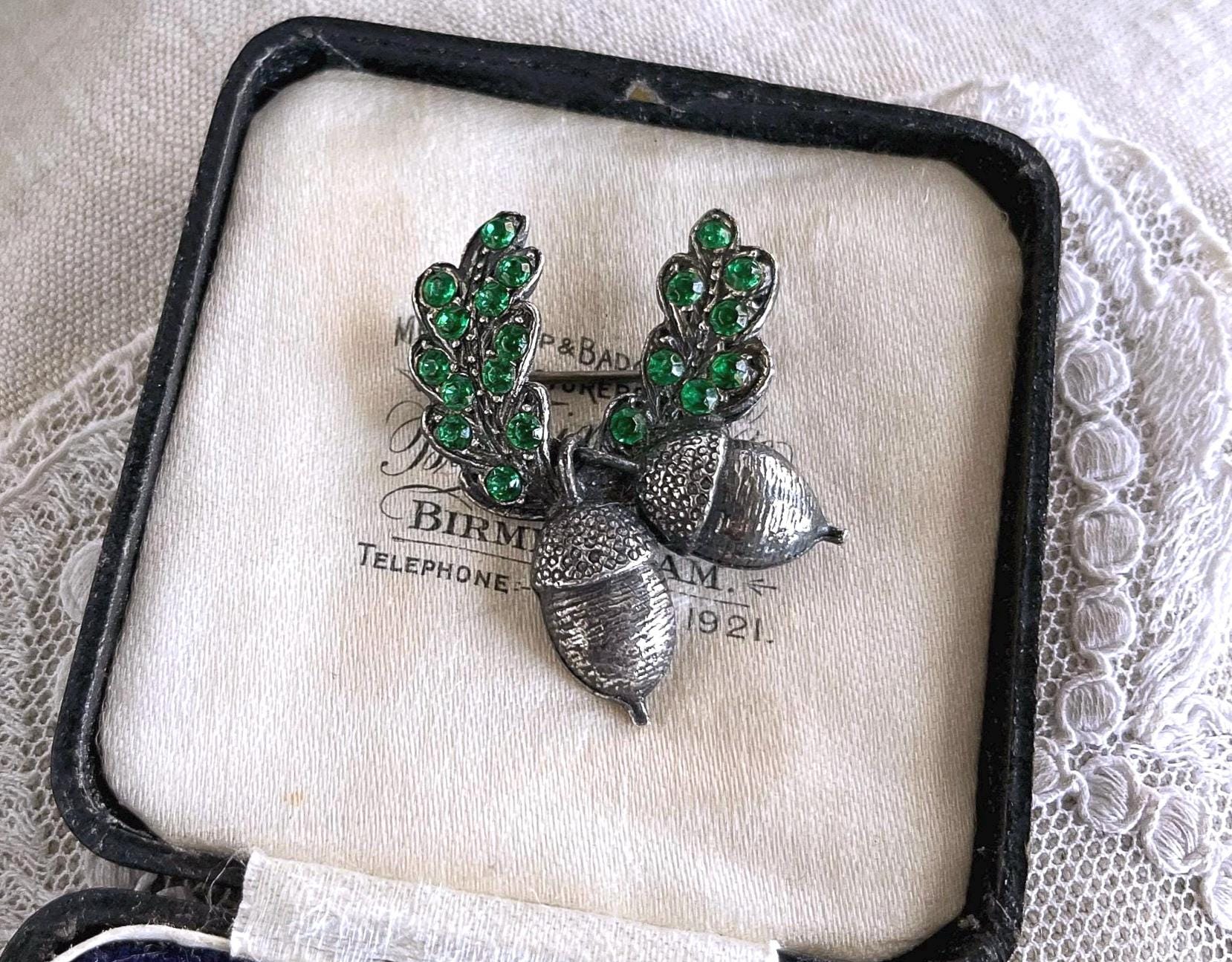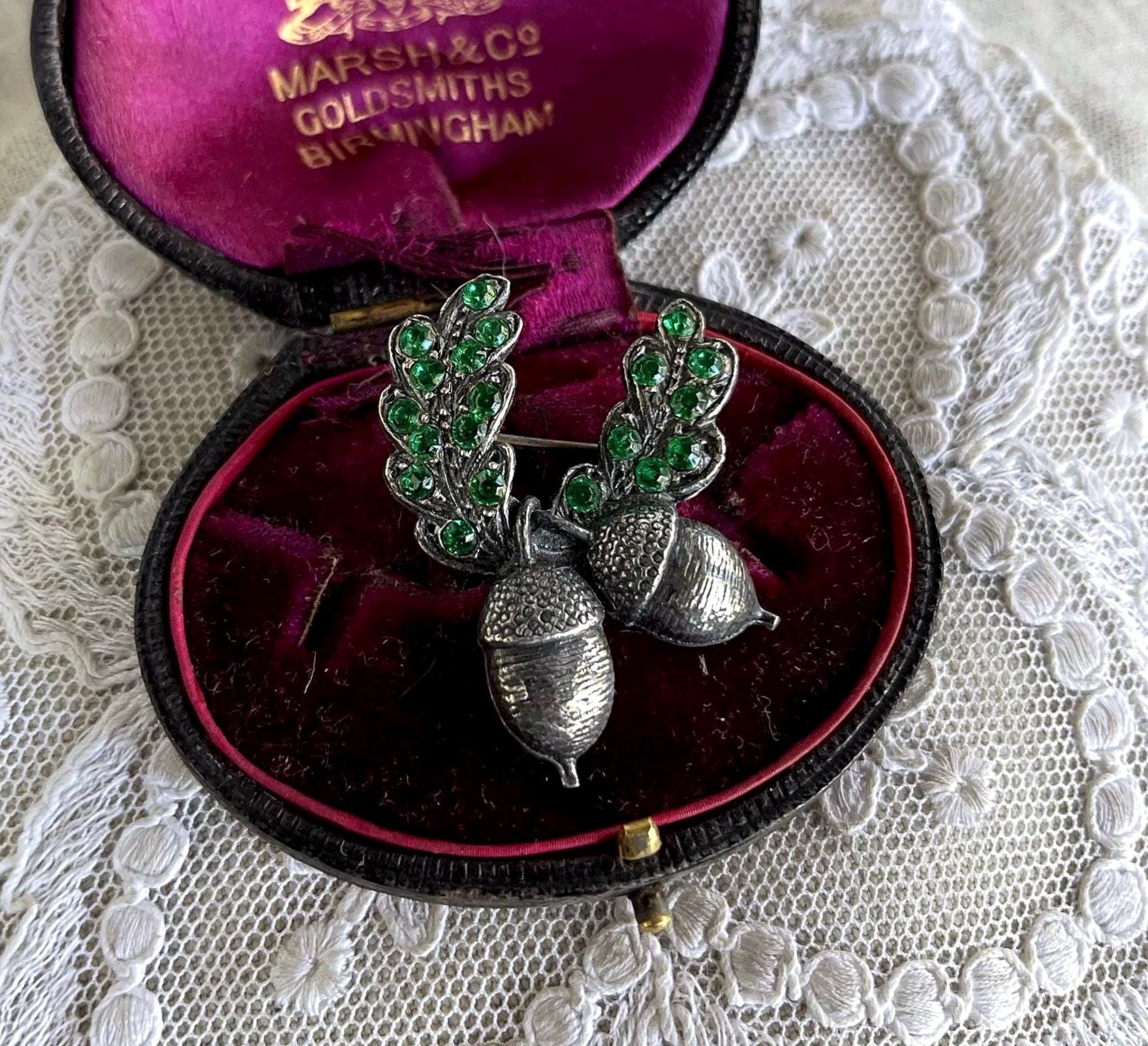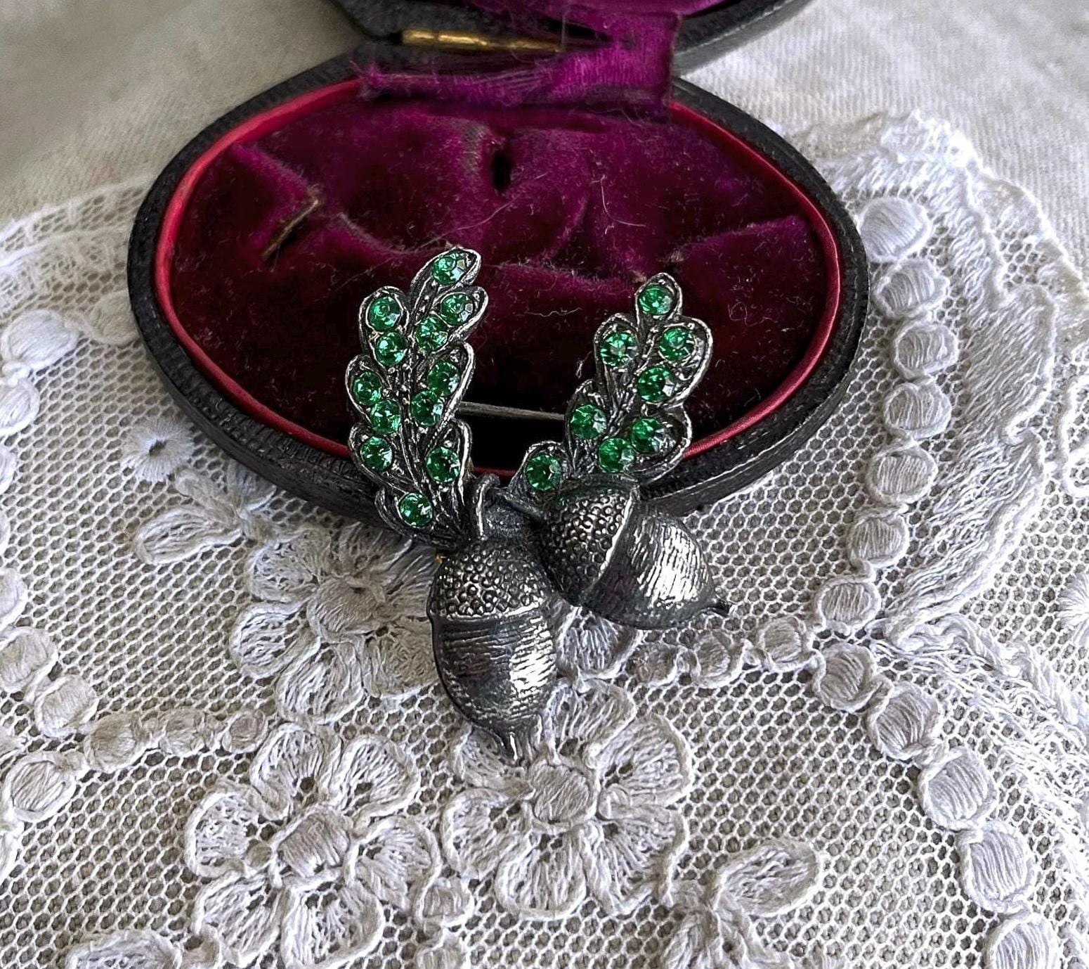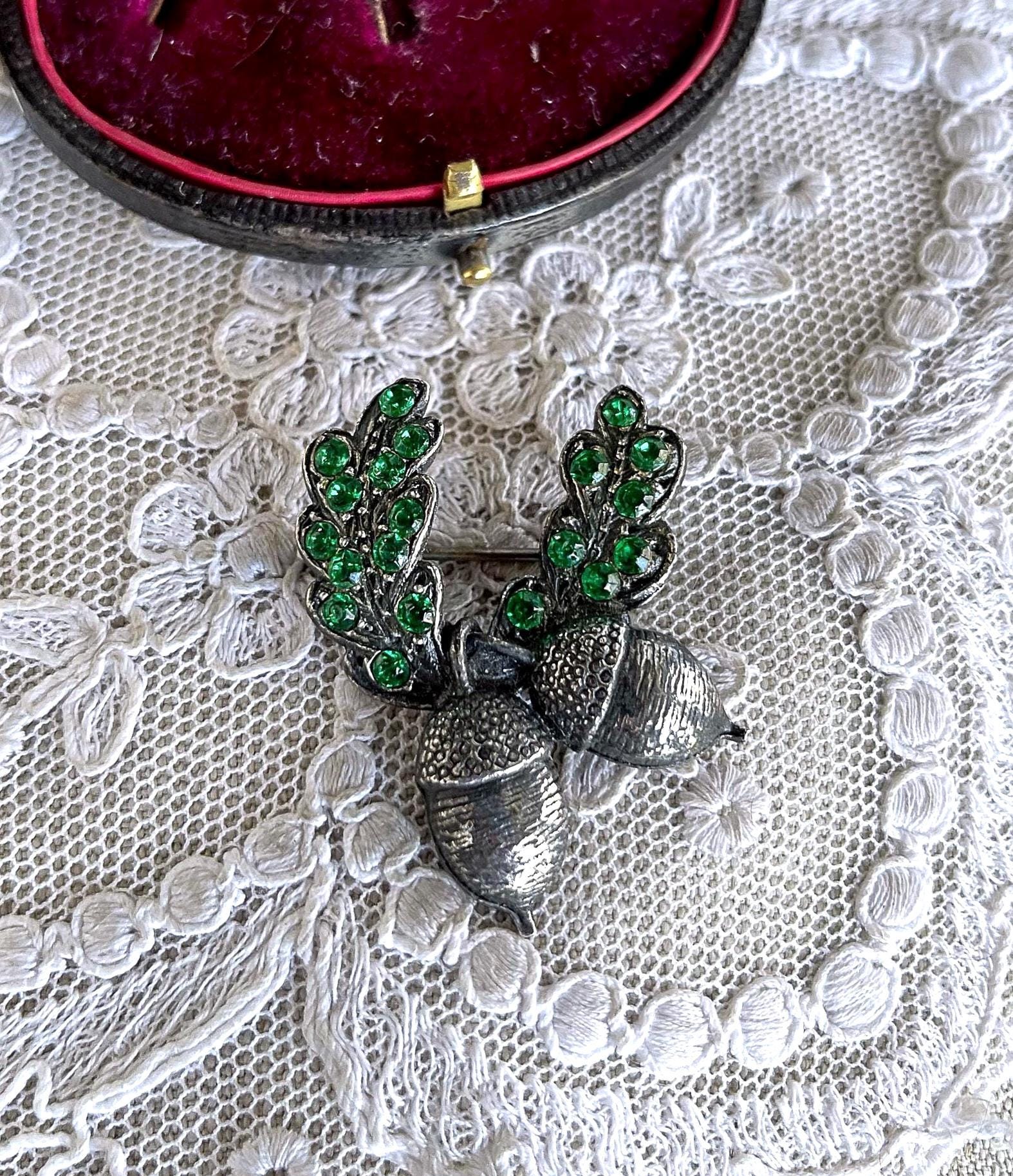 Featuring a lovely antique Victorian Aesthetic sterling silver Acorn lapel brooch accented with luminous emerald green pastes stones with brilliant faceted marcasite crystals. Brooch is in lovely antique condition with a beautiful patina, functional antique C clasp , with all stones intact and accounted for. Measuring approximately 2 inches long at 6 grams respectively, tested as STERLING, faintly hallmarked on the reverse, this is a wonderful collectible wearable investment!