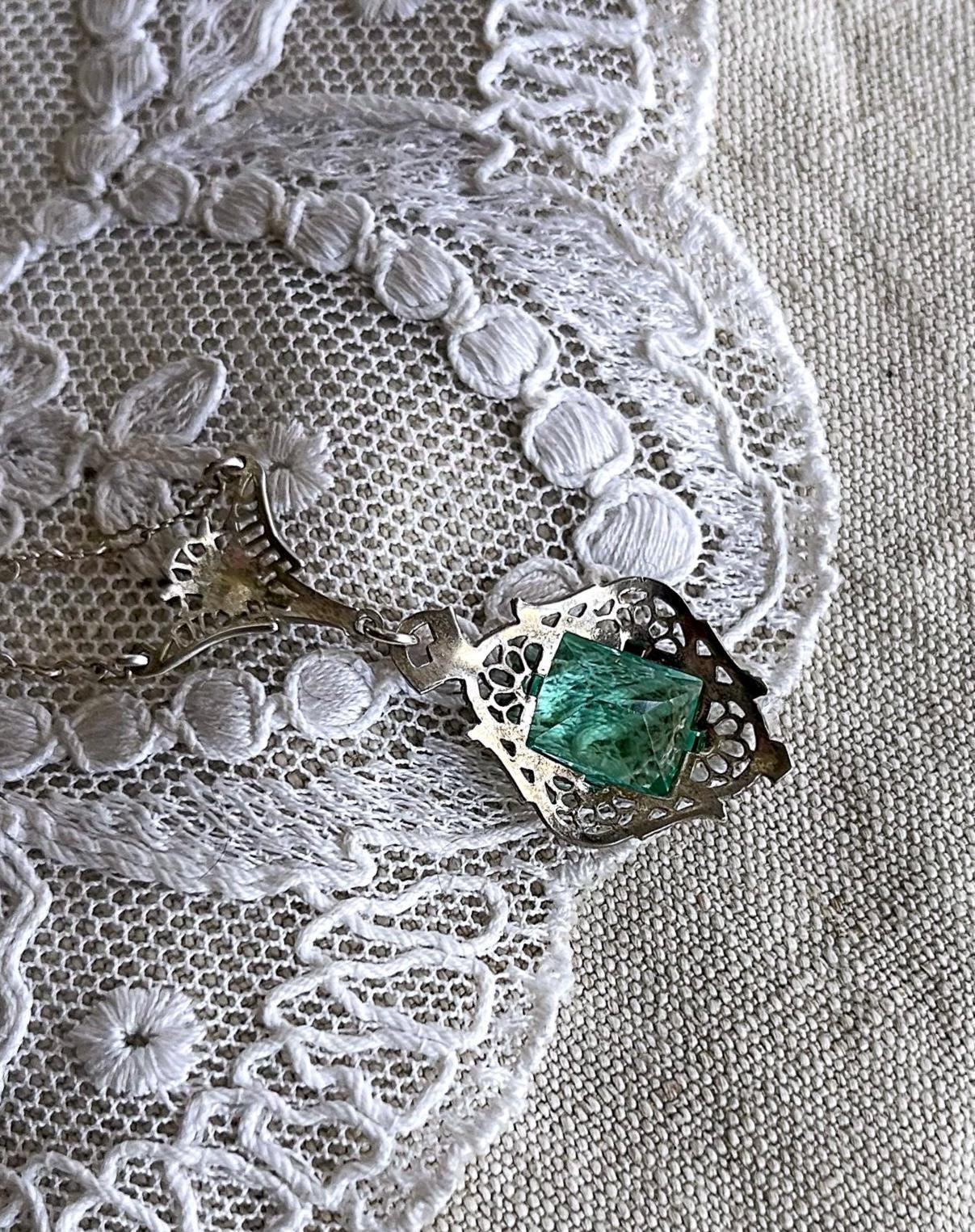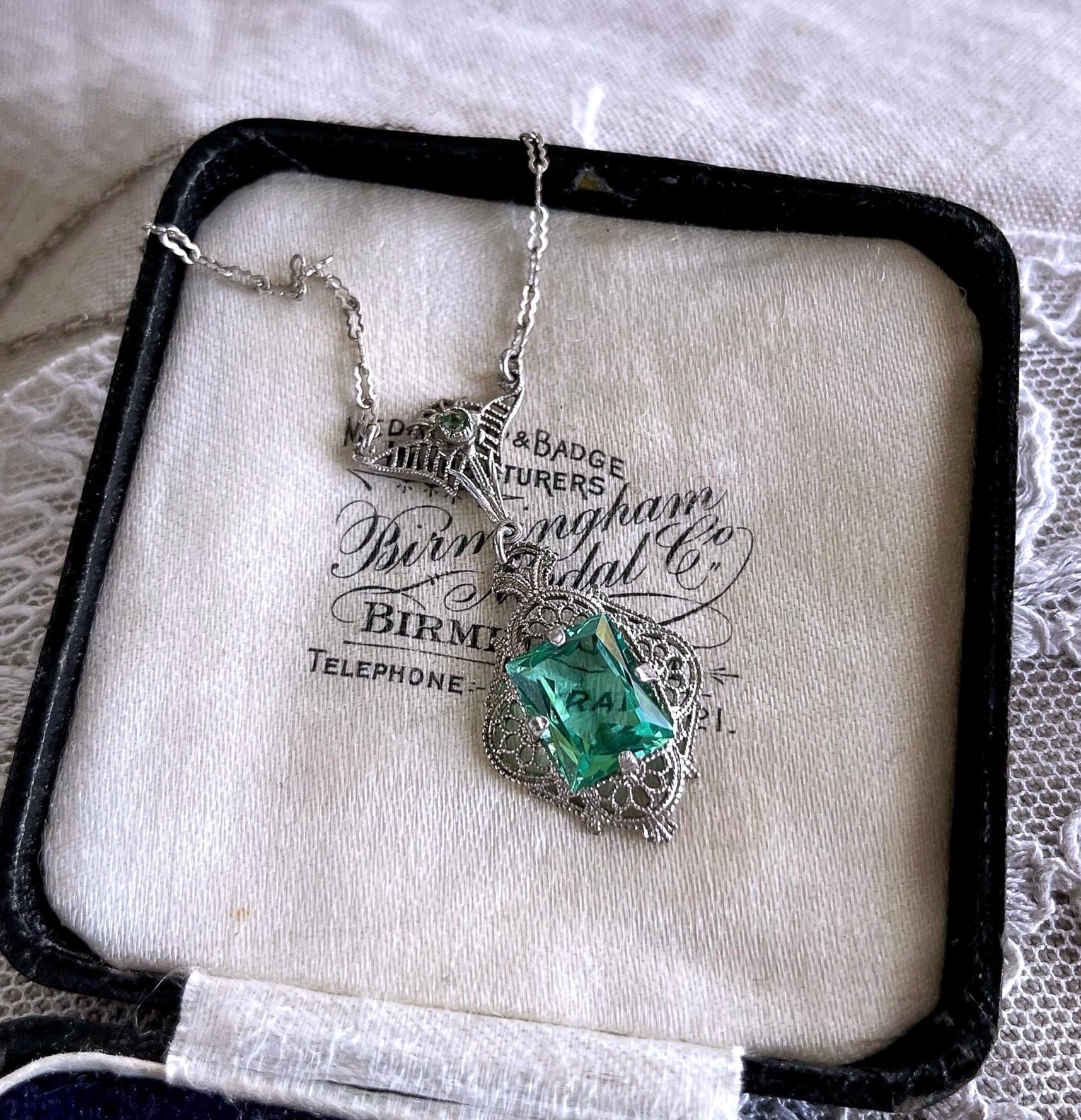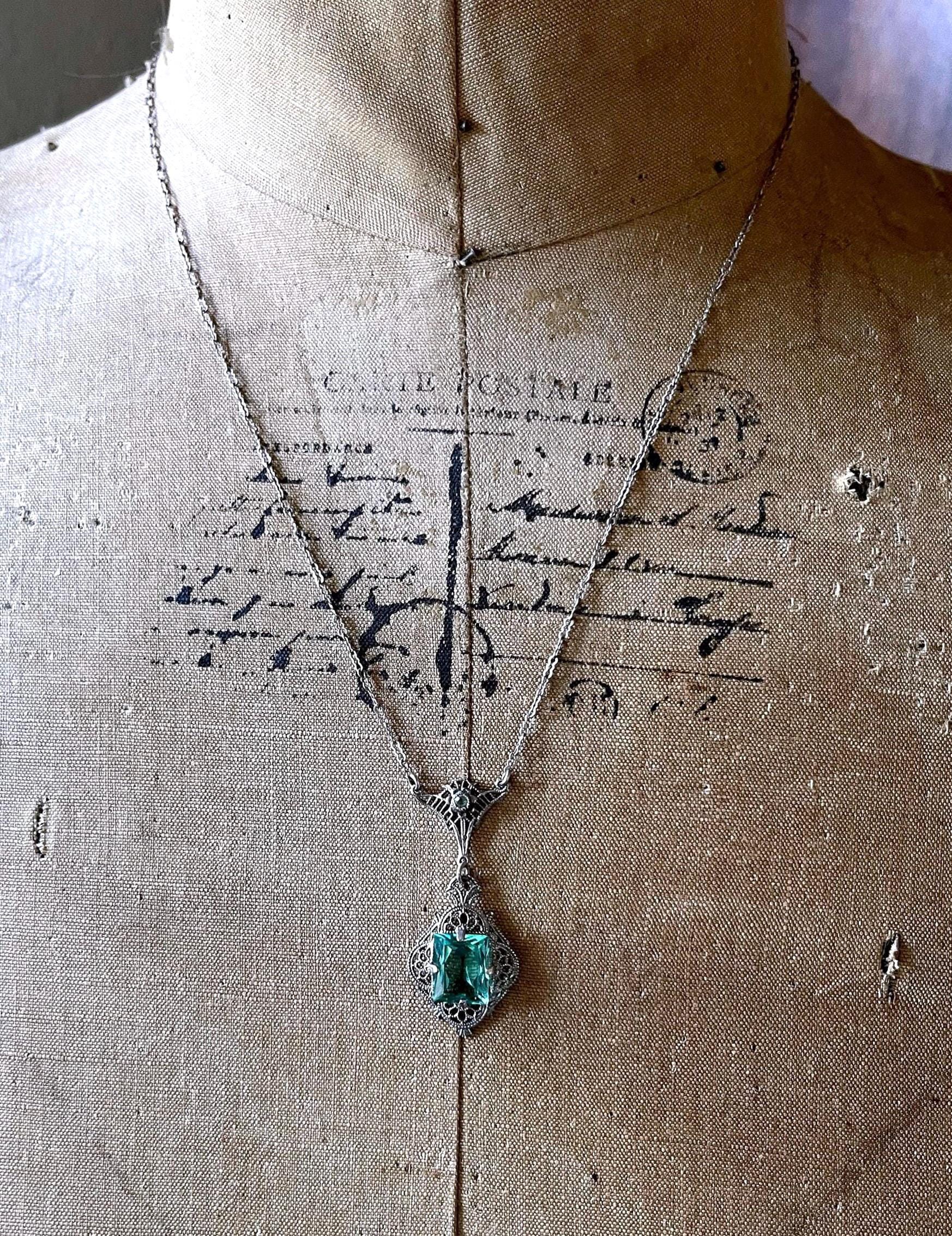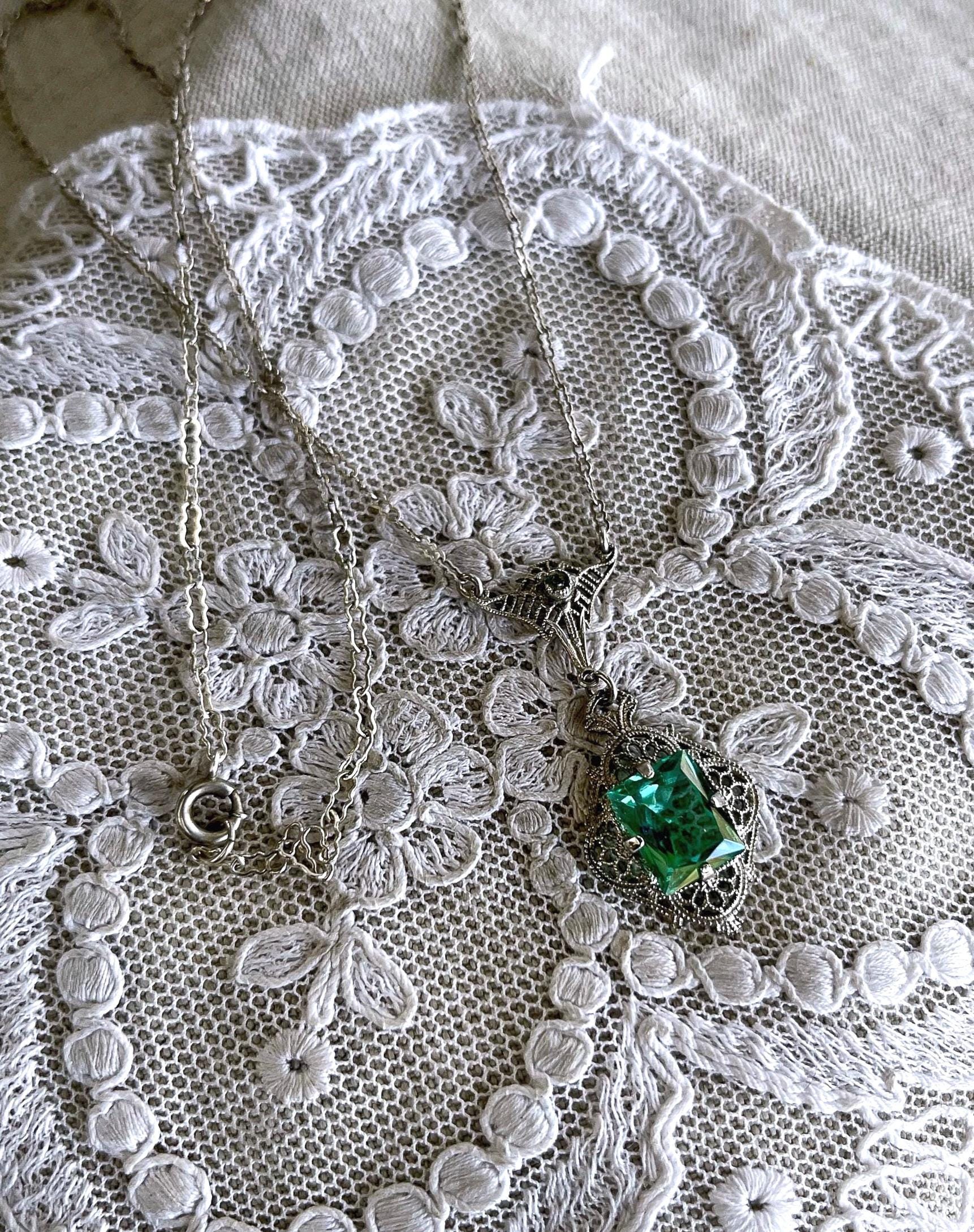 Featuring a fine antique Edwardian Era Rhodium plated sterling silver filigree lavaliere necklace adorned with a striking bright emerald green faceted paste stones. Necklace measures approximately 18 inches around with pendant drop measuring around 1.5 inches at 3.51 grams respectively, faintly hallmarked on clasp tested as Sterling. Necklace is in excellent antique condition with a functional antique thumbless clasp, minimal wear with stone shiny and intact. A wonderful feminine piece, delicate and ready to wear!