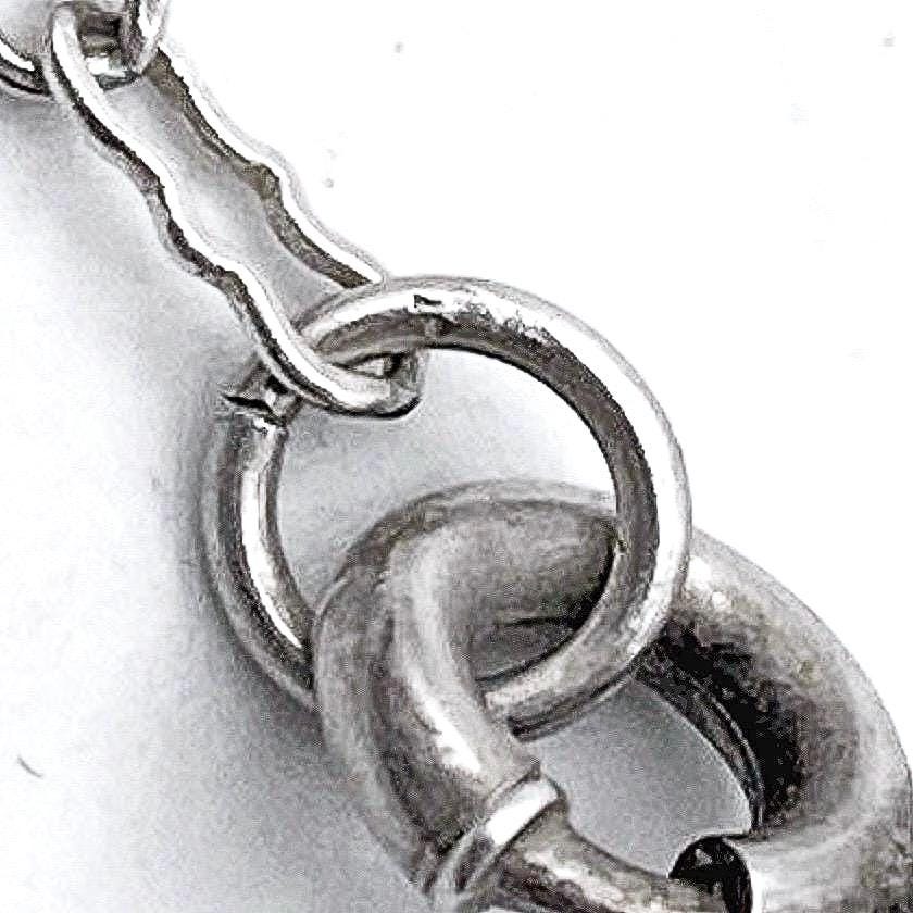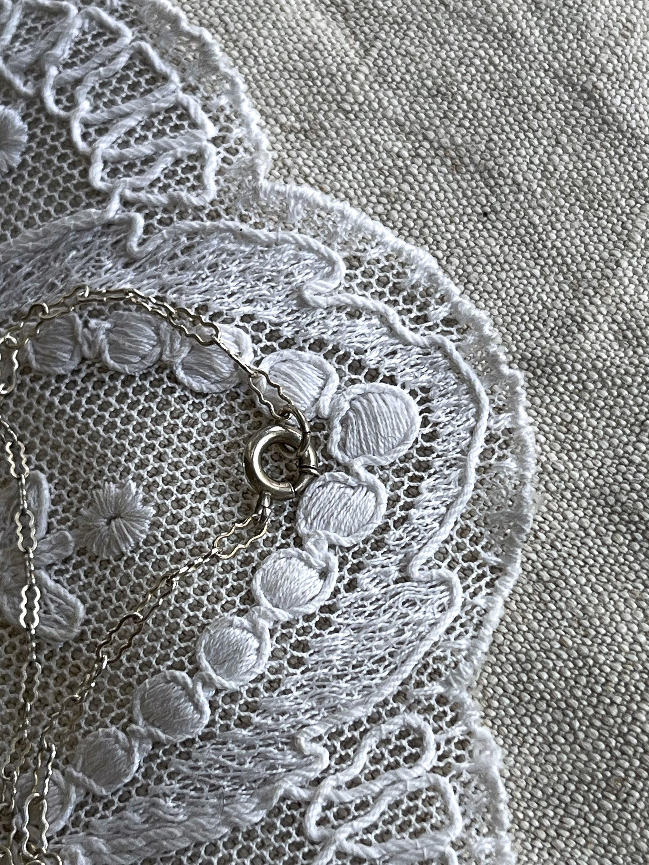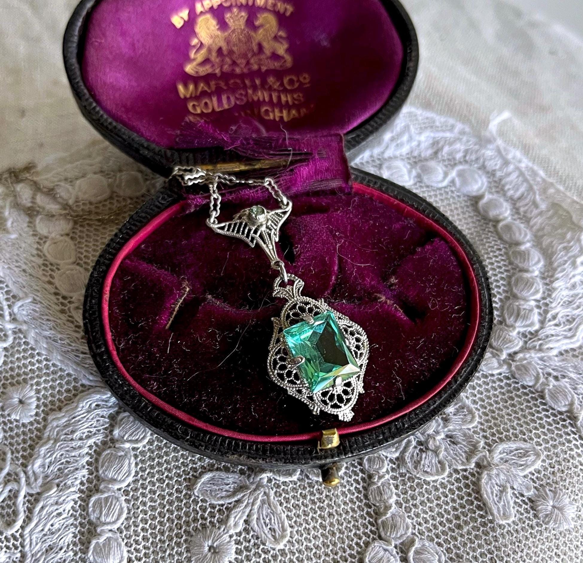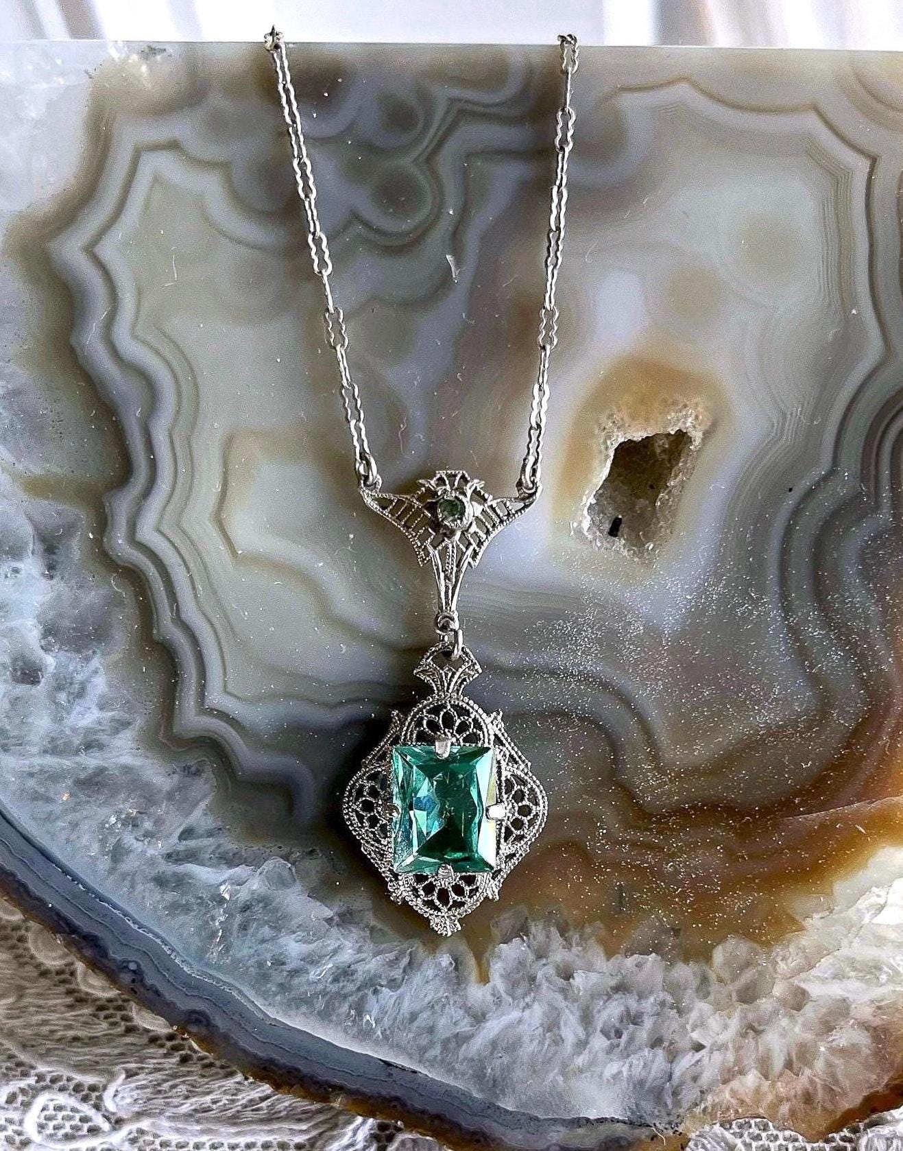 Featuring a fine antique Edwardian Era Rhodium plated sterling silver filigree lavaliere necklace adorned with a striking bright emerald green faceted paste stones. Necklace measures approximately 18 inches around with pendant drop measuring around 1.5 inches at 3.51 grams respectively, faintly hallmarked on clasp tested as Sterling. Necklace is in excellent antique condition with a functional antique thumbless clasp, minimal wear with stone shiny and intact. A wonderful feminine piece, delicate and ready to wear!