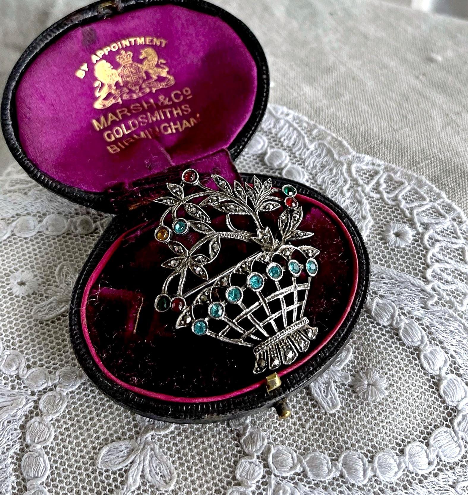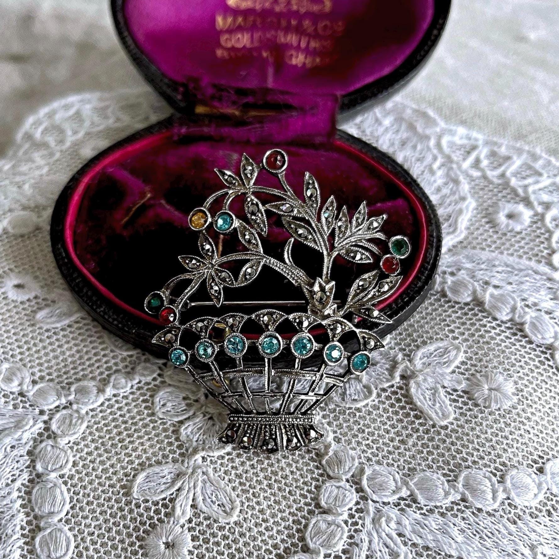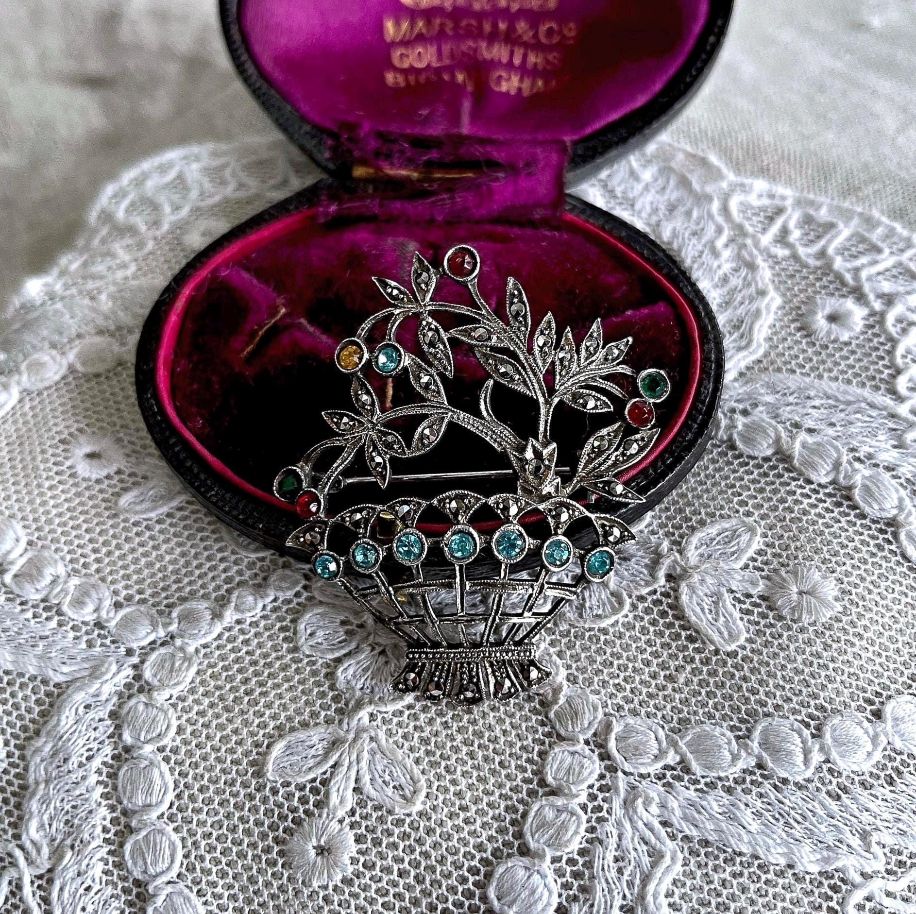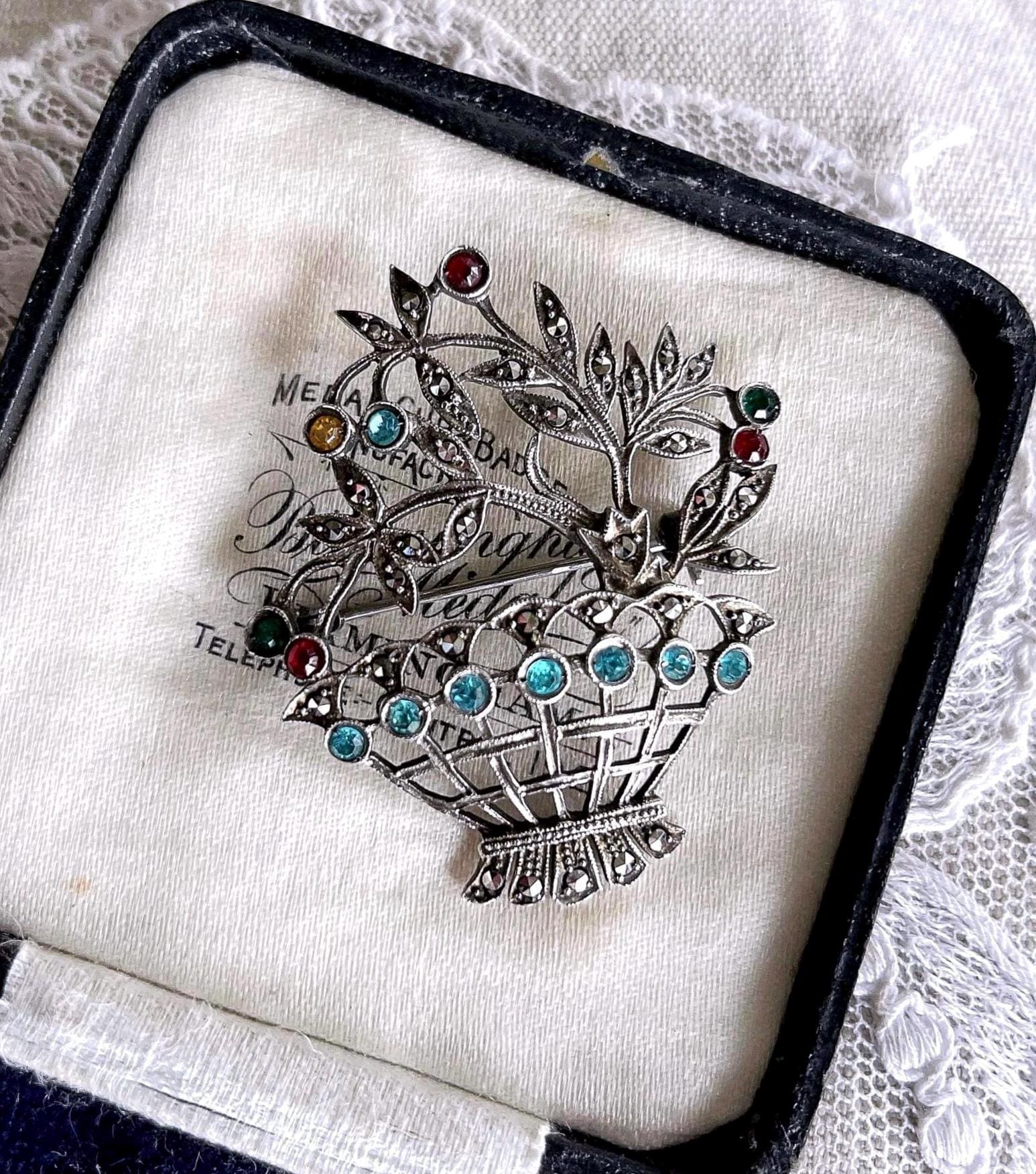 Featuring a beautiful vintage Giardinetti “small Garden brooch” Edwardian revival 800 silver Floral Basket brooch adorned with brilliant sparkling faceted Paste Stones and Marcasite crystals . Brooch measures approximately 1.7 inches at 6.8 grams respectively. This beautifully designed antique brooch is in excellent antique condition with functional clasp, minimal wear with all stones intact and accounted for, marked 800 on the reverse . A unique and rare beauty!