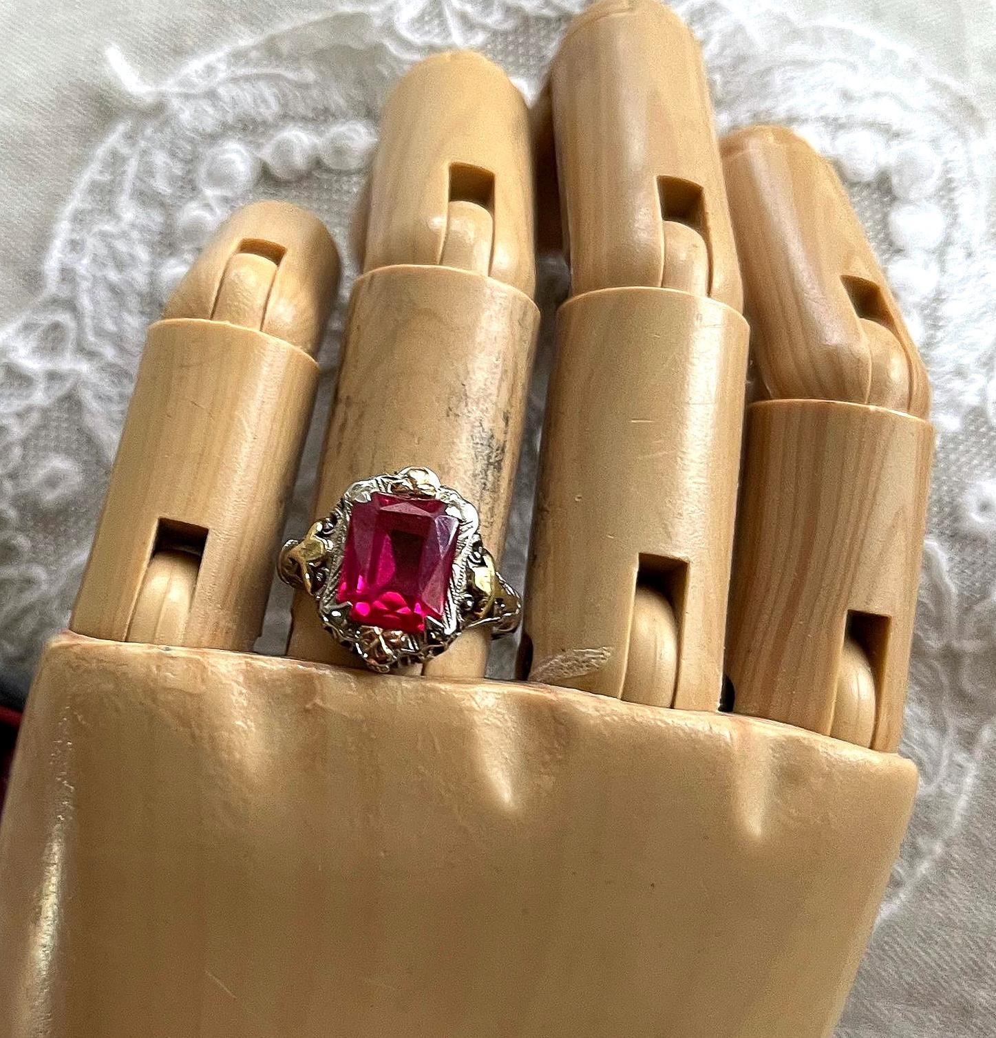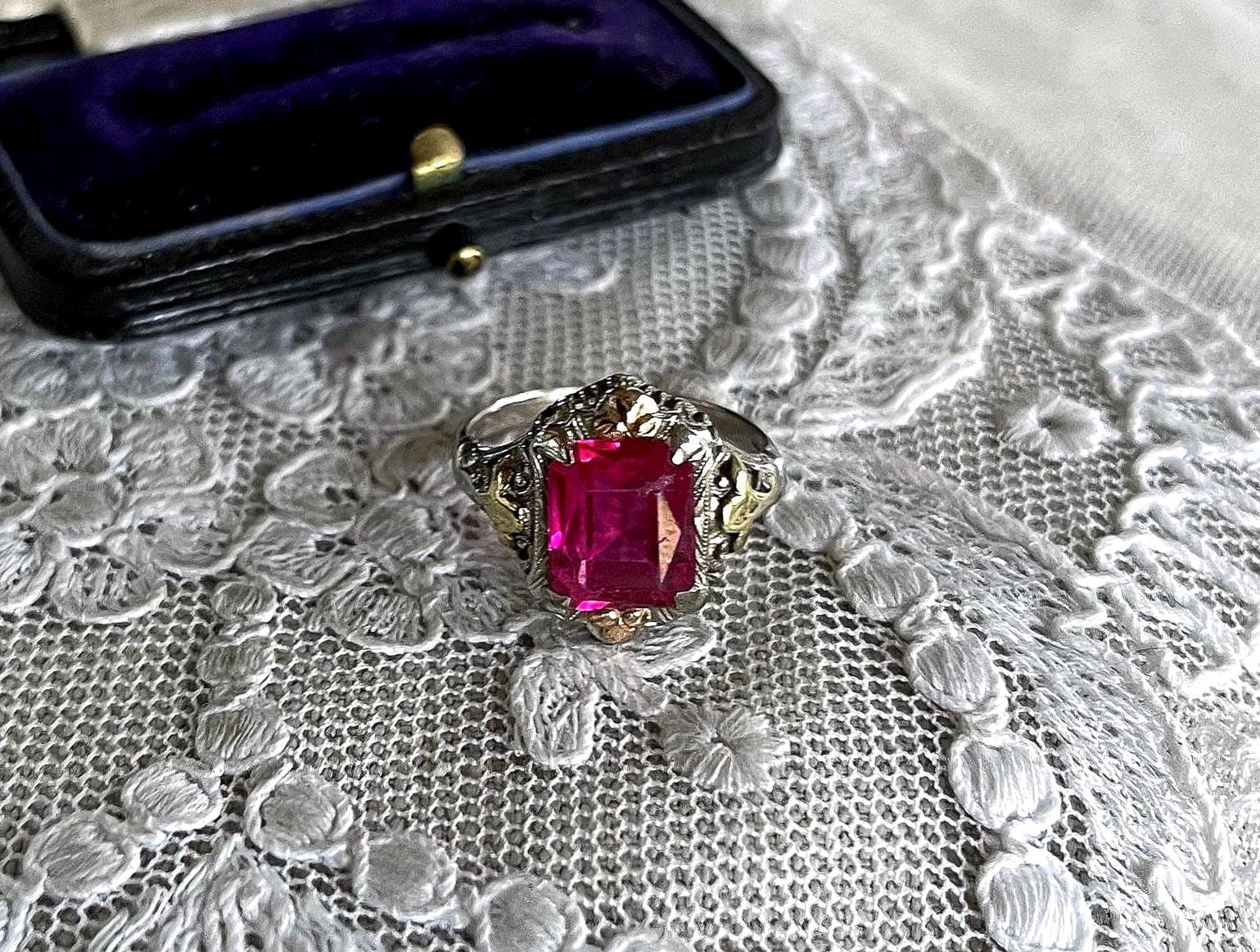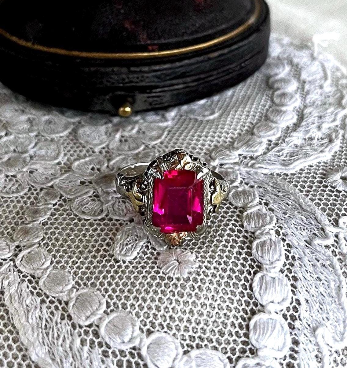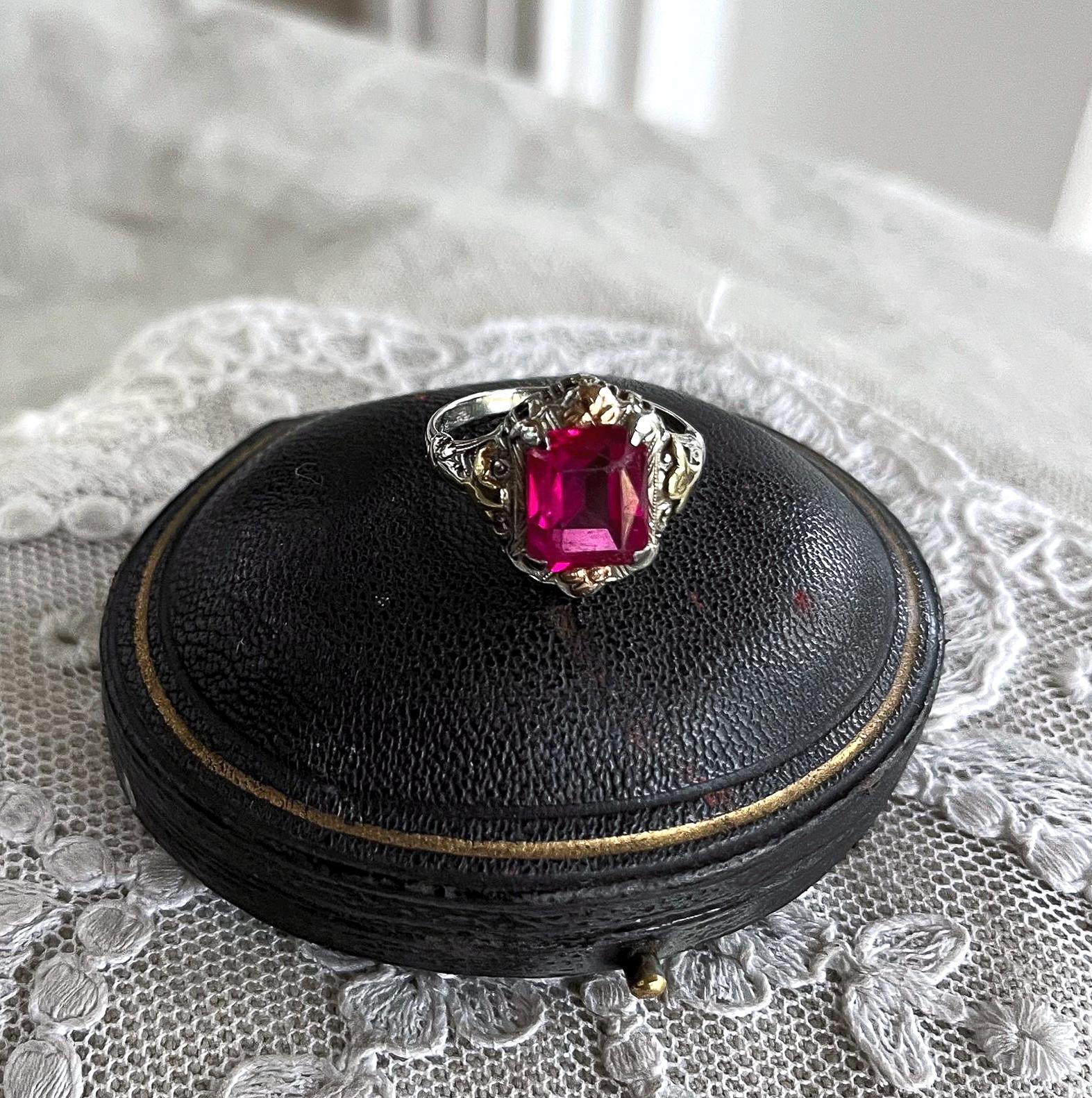 Featuring a fine antique Art Deco hallmarked 10k white and yellow gold cocktail Ring accented with a luminous simulated ruby gemstone set in an open back pronged setting. This gorgeous piece is in excellent antique condition with normal wear, hallmarked 10k on the inside of band with stone intact. Ring is approximately size 6 at 2.8 grams respectively. A wonderful wearable antique ring to pass on for generations.