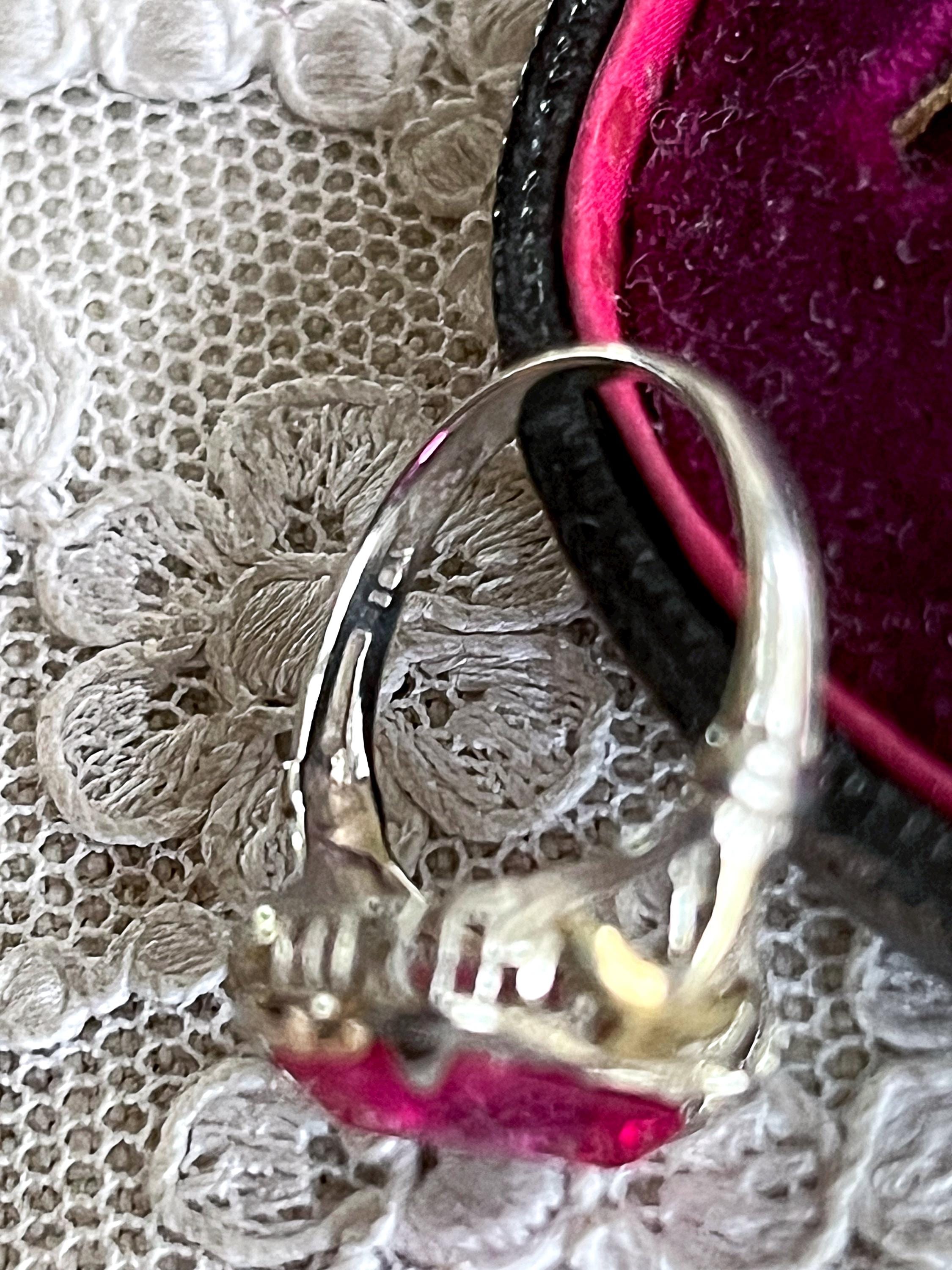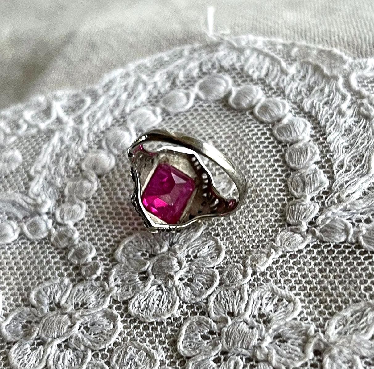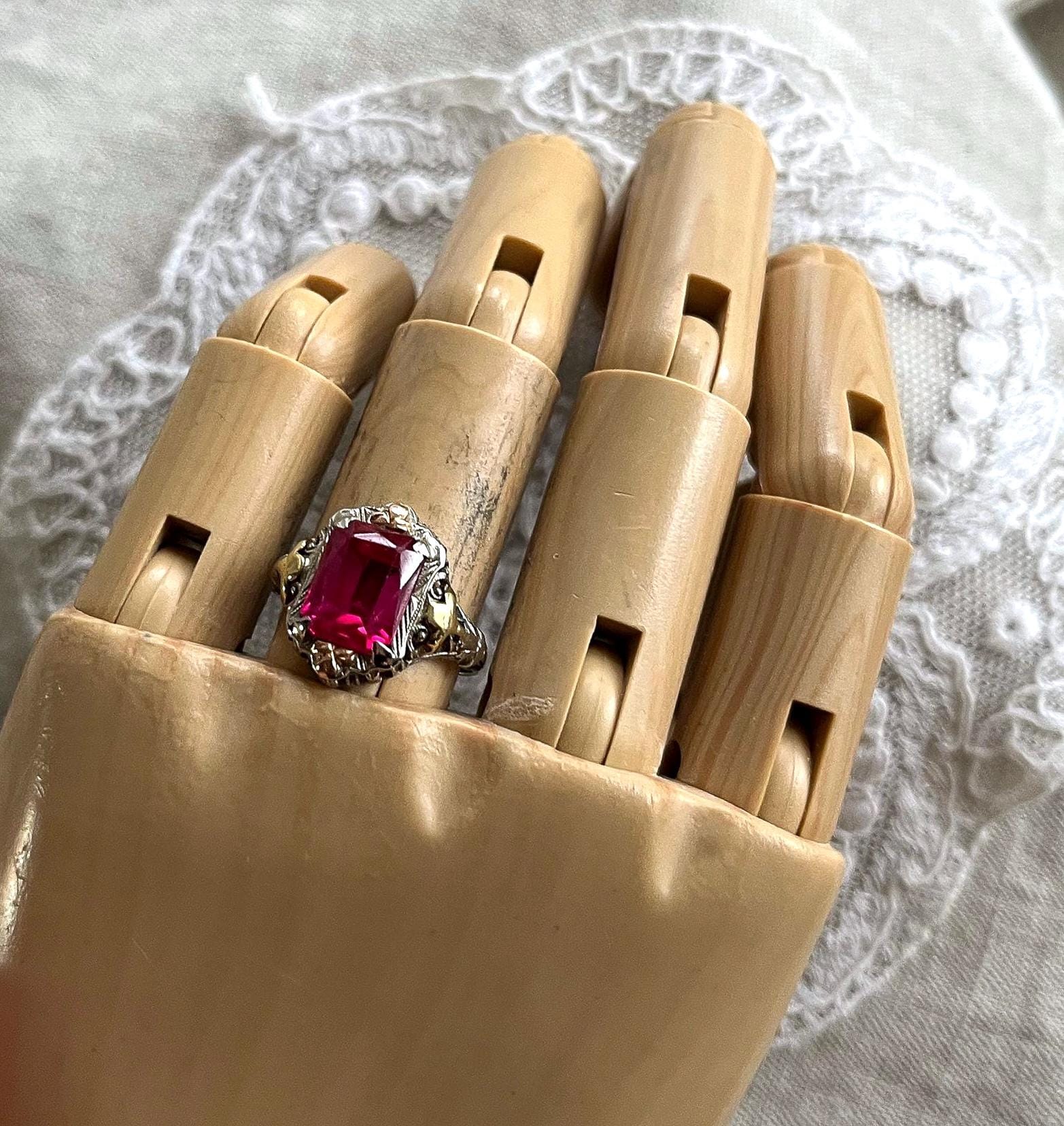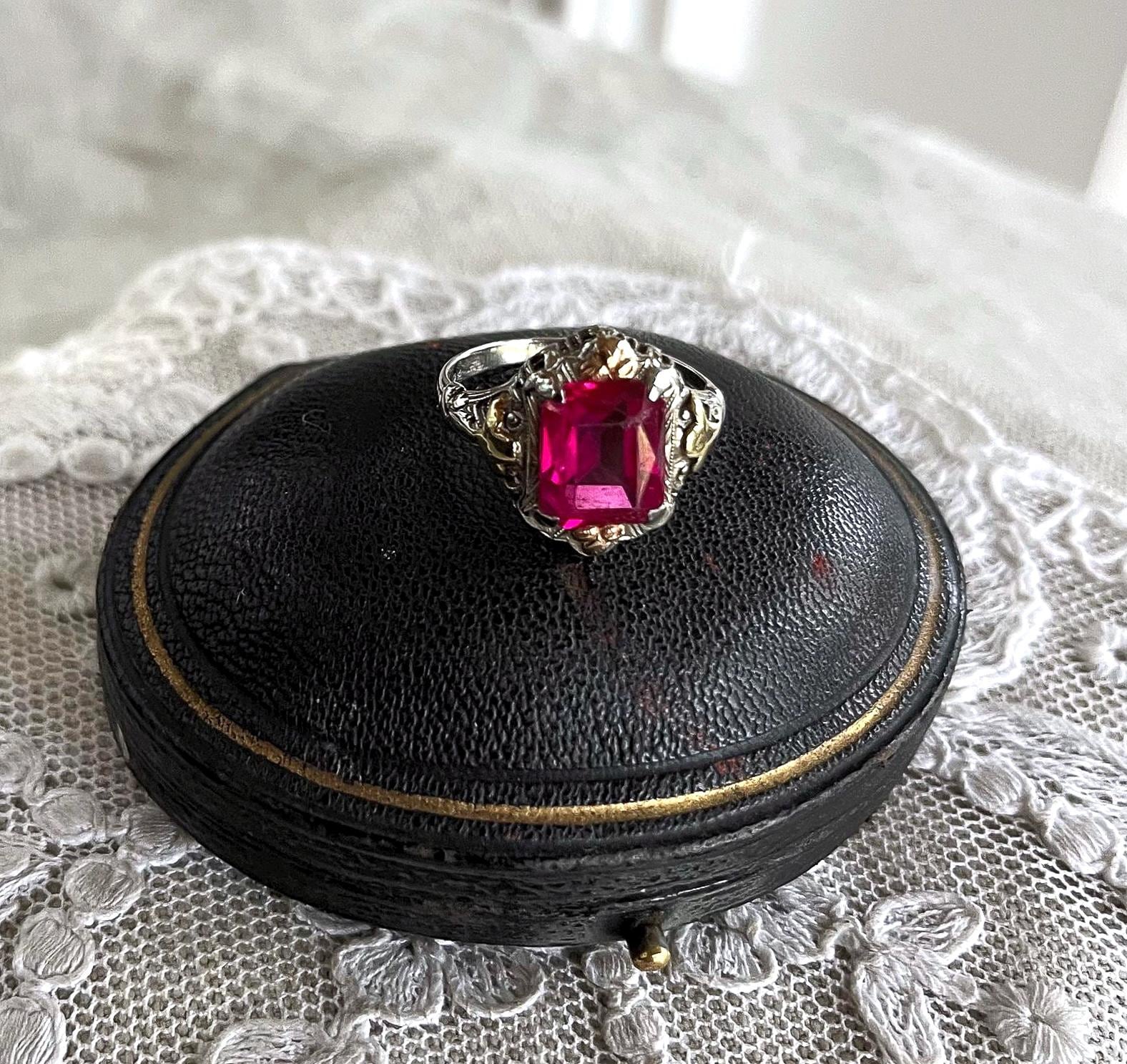 Featuring a fine antique Art Deco hallmarked 10k white and yellow gold cocktail Ring accented with a luminous simulated ruby gemstone set in an open back pronged setting. This gorgeous piece is in excellent antique condition with normal wear, hallmarked 10k on the inside of band with stone intact. Ring is approximately size 6 at 2.8 grams respectively. A wonderful wearable antique ring to pass on for generations.