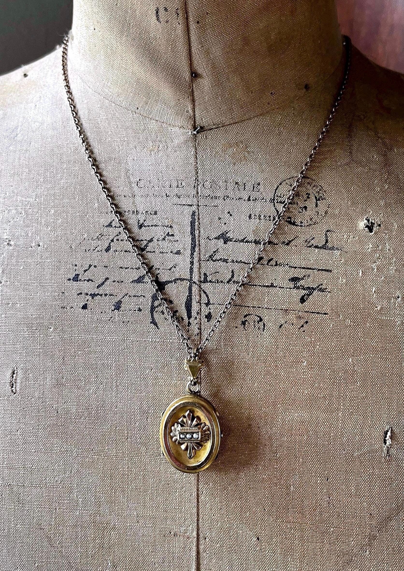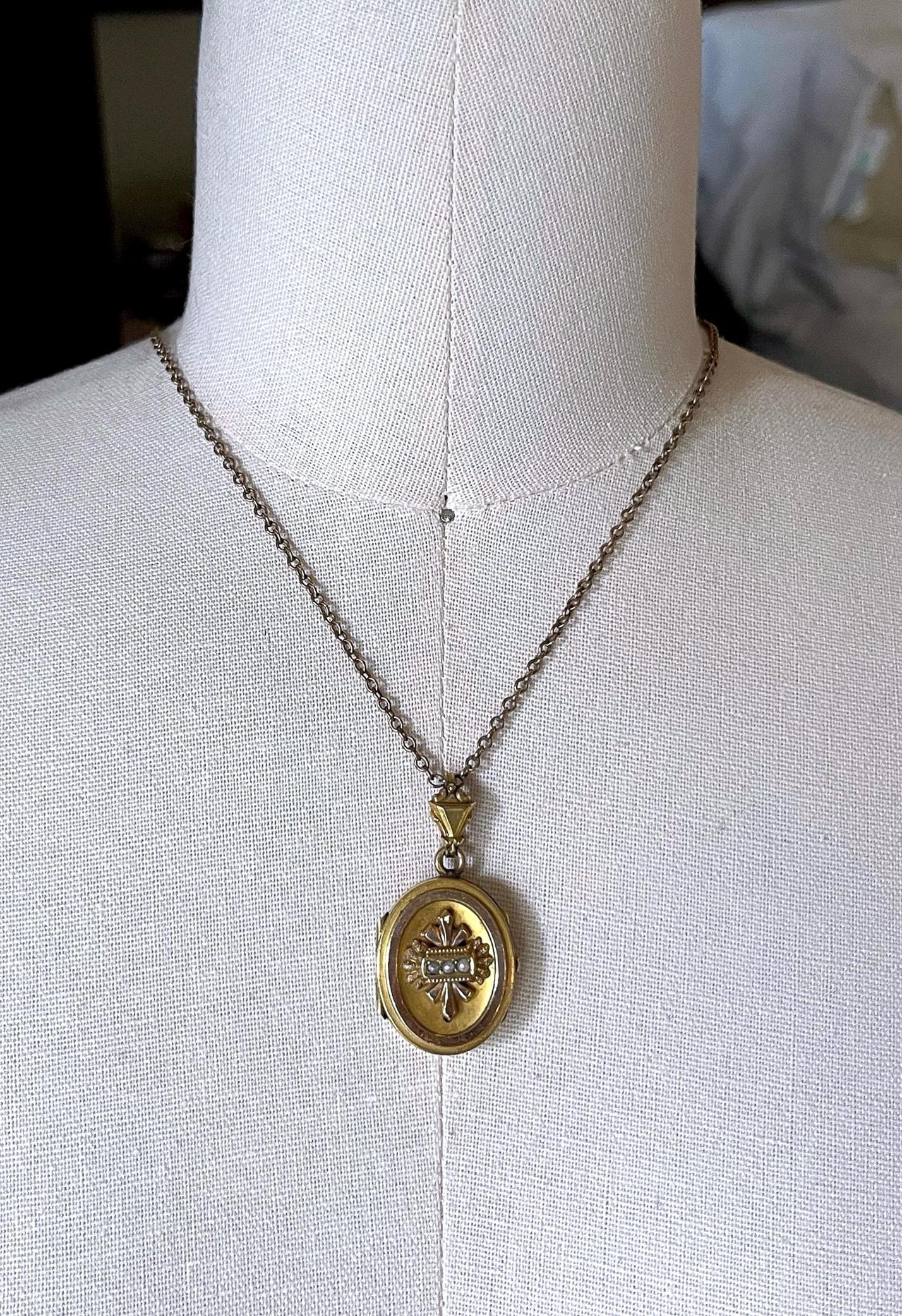 Featuring a beautiful antique Victorian Aesthetic gold filled Pinchbeck necklace adorned with a lovely oval locket accented with genuine seed pearls set in a decorative setting. Necklace measures approximately 22 inches around with locket measuring 1.9 inches at 11.91 grams respectively. In excellent antique condition with normal wear, functional antique thumbless clasp and locking mechanism with all stones intact and accounted for, necklace is unsigned. Beautifully designed and handcrafted over 120 years ago, ready to wear and pass on for generations!