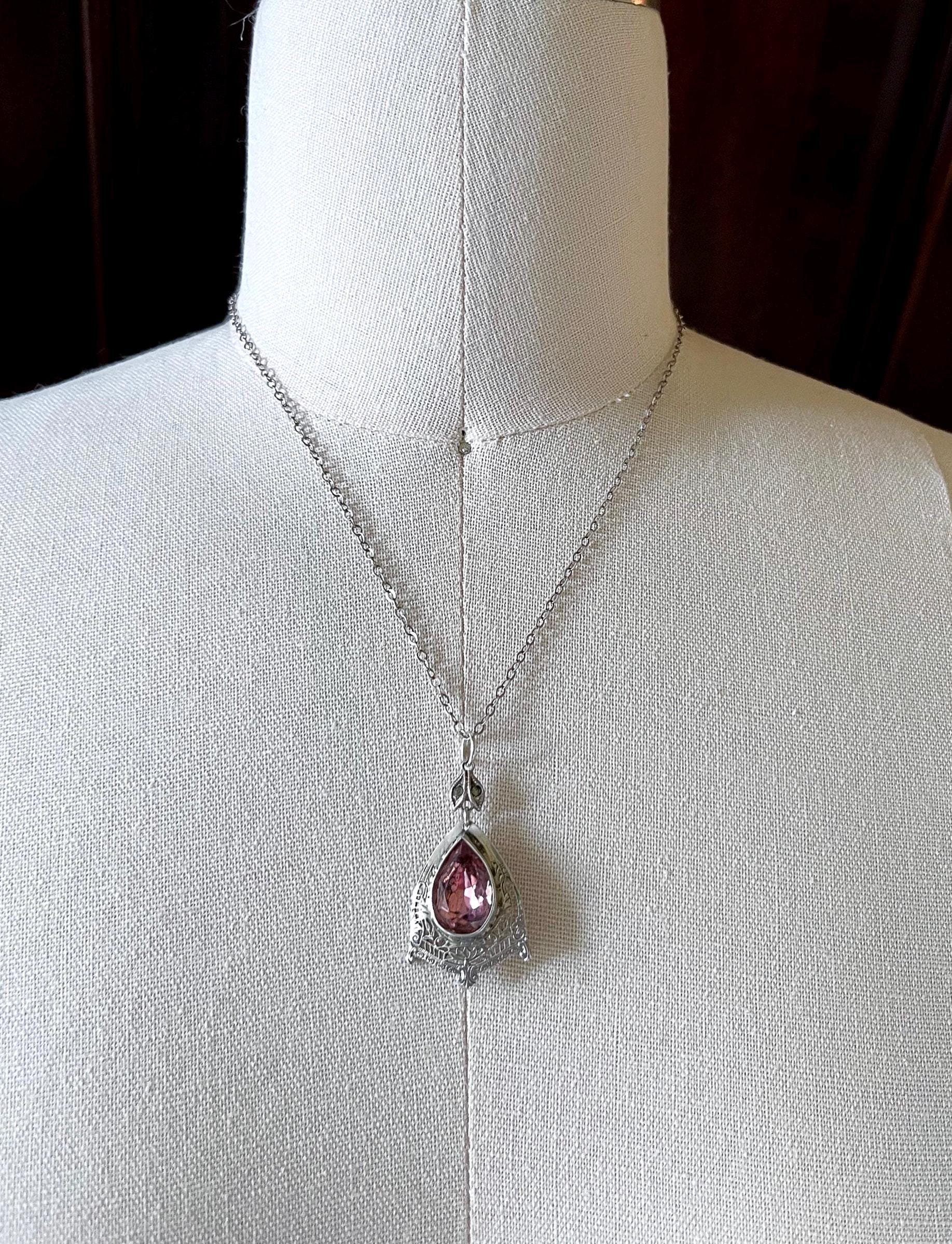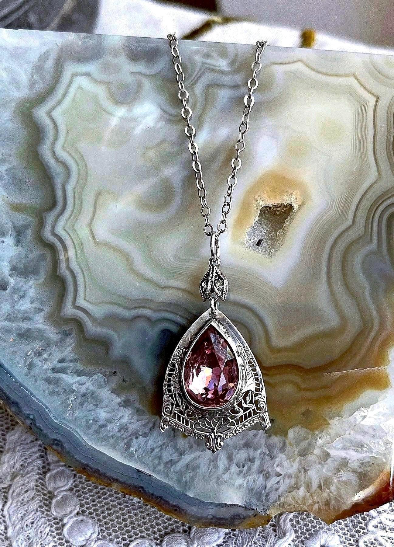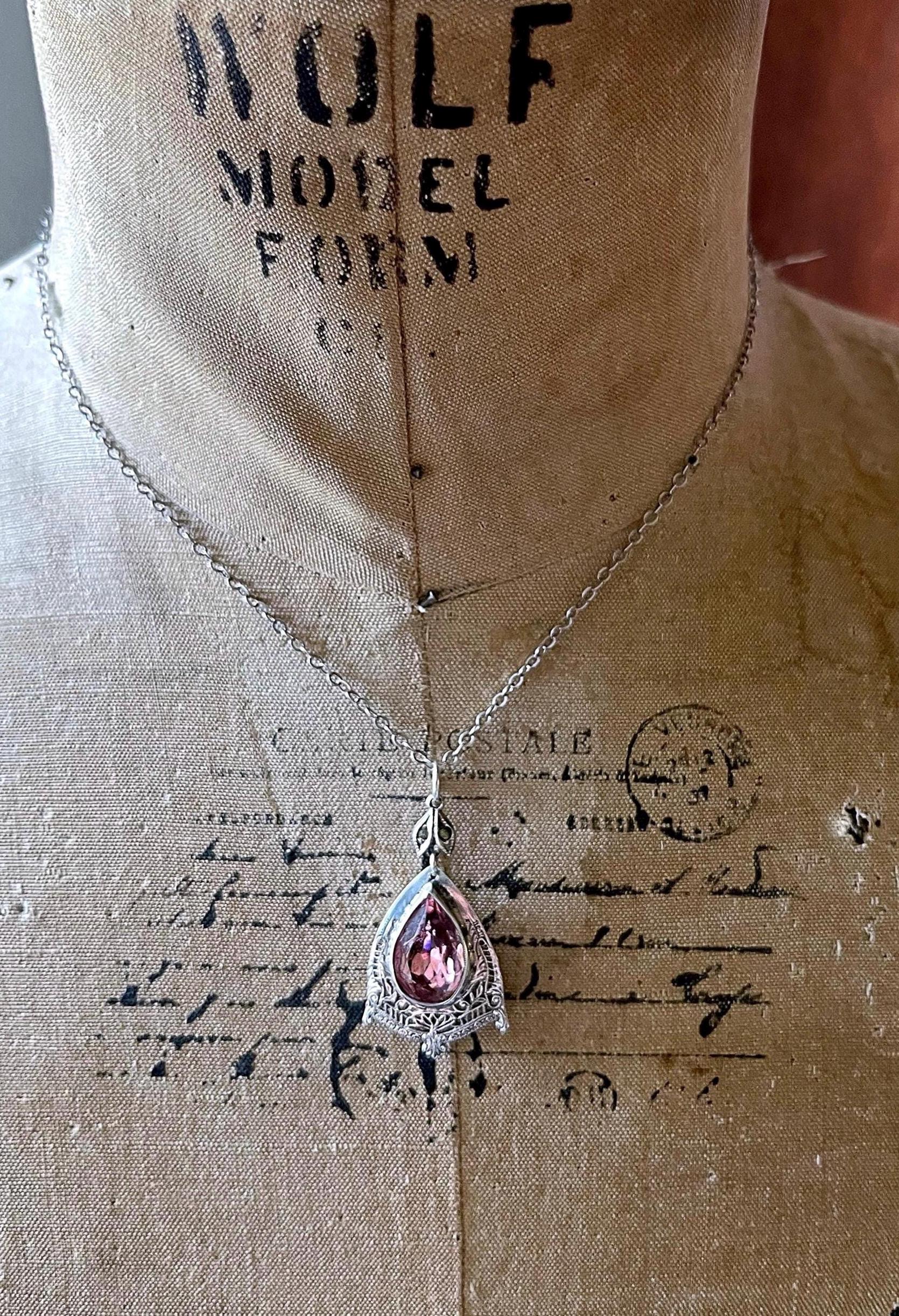 Featuring a gorgeous Edwardian Belle Époque antique 1910s-20s Edwardian sterling silver rhodium plated intricate filigree pendant necklace adorned with an ornate filigree pendant accented with a faceted deep rose pink Paste Stone set in a sterling bubble back bezel setting. Necklace is in superb antique condition with a stamped functional antique fold clasp, minimal wear with stone intact. Measuring approximately 16 inches around with a 1.75 inch pendant drop at 2.73 grams respectively this is a beautiful example of the intricate designs of this era, hallmarked STERLING on the reverse of pendant and on clasp . Beautifully designed and crafted over 100 years ago and is ready to wear!