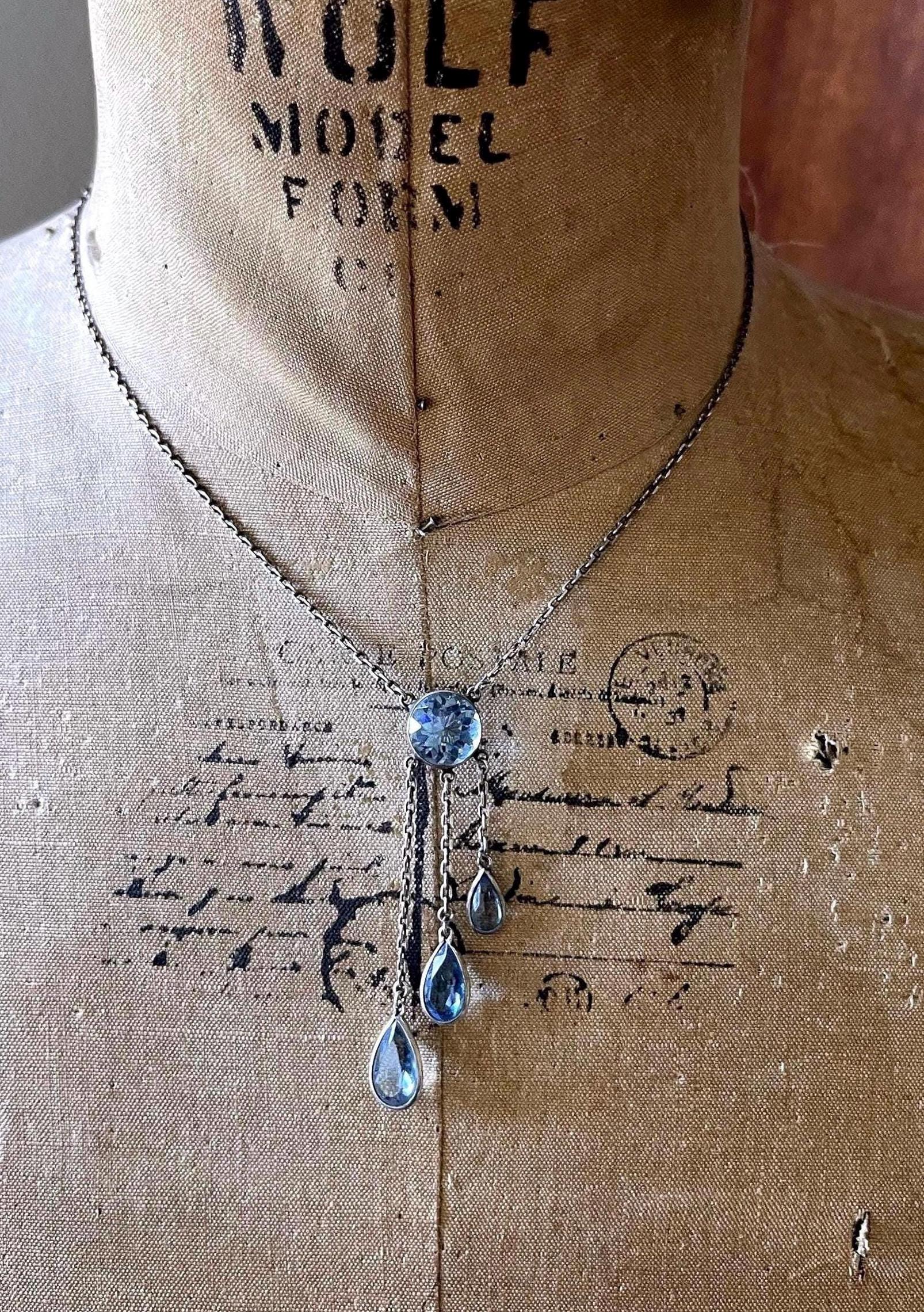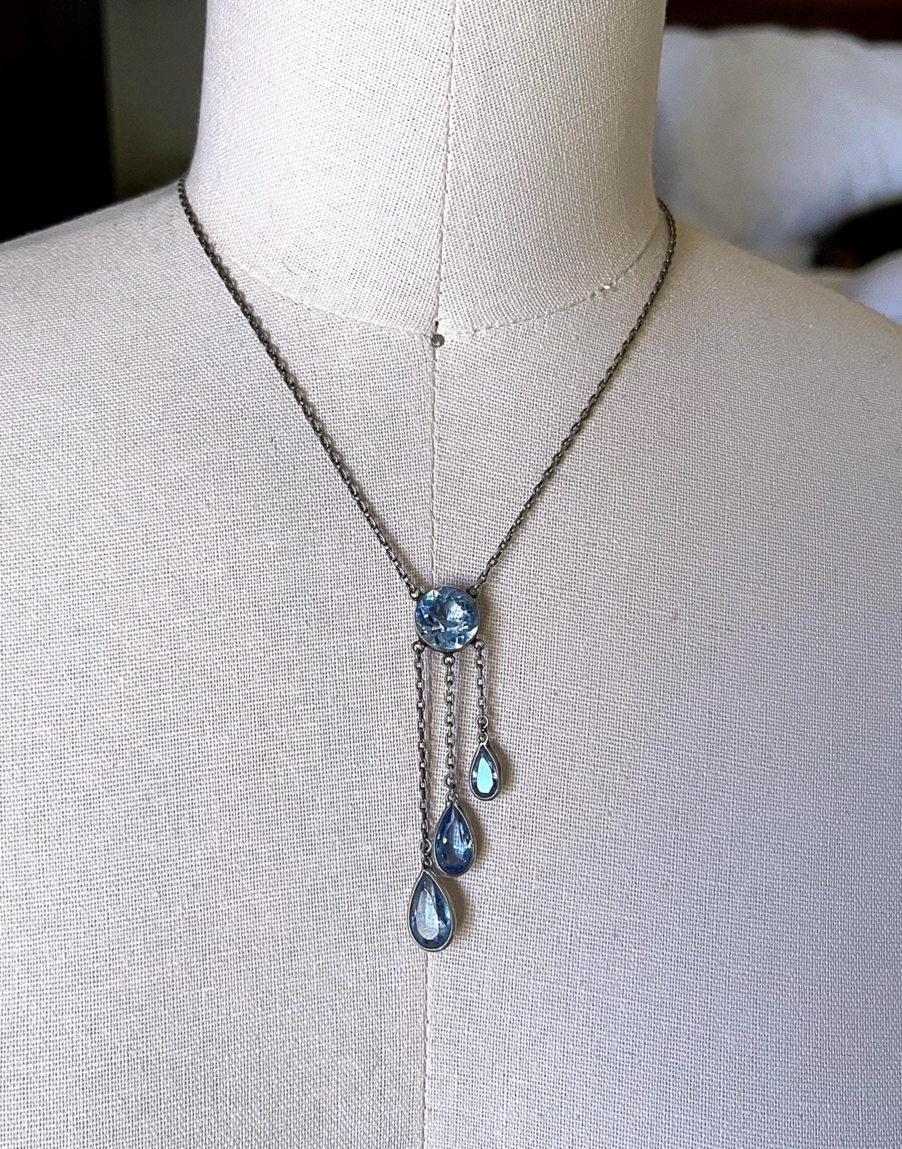 Featuring a gorgeous antique Art Deco sterling silver lovely negligee necklace adorned with brilliant open back bezel set topaz blue Paste stones. Necklace measures approximately 16 inches around with a 2.5 inch pendant drop at 5.66 grams respectively and is in excellent antique condition with functional c spring clasp , minimal wear with all stones intact and accounted for. Necklace sparkles like mad and sits beautifully on the neck. Surprise someone special or yourself with this elegant antique necklace! Stamped on the clasp, ready to wear!