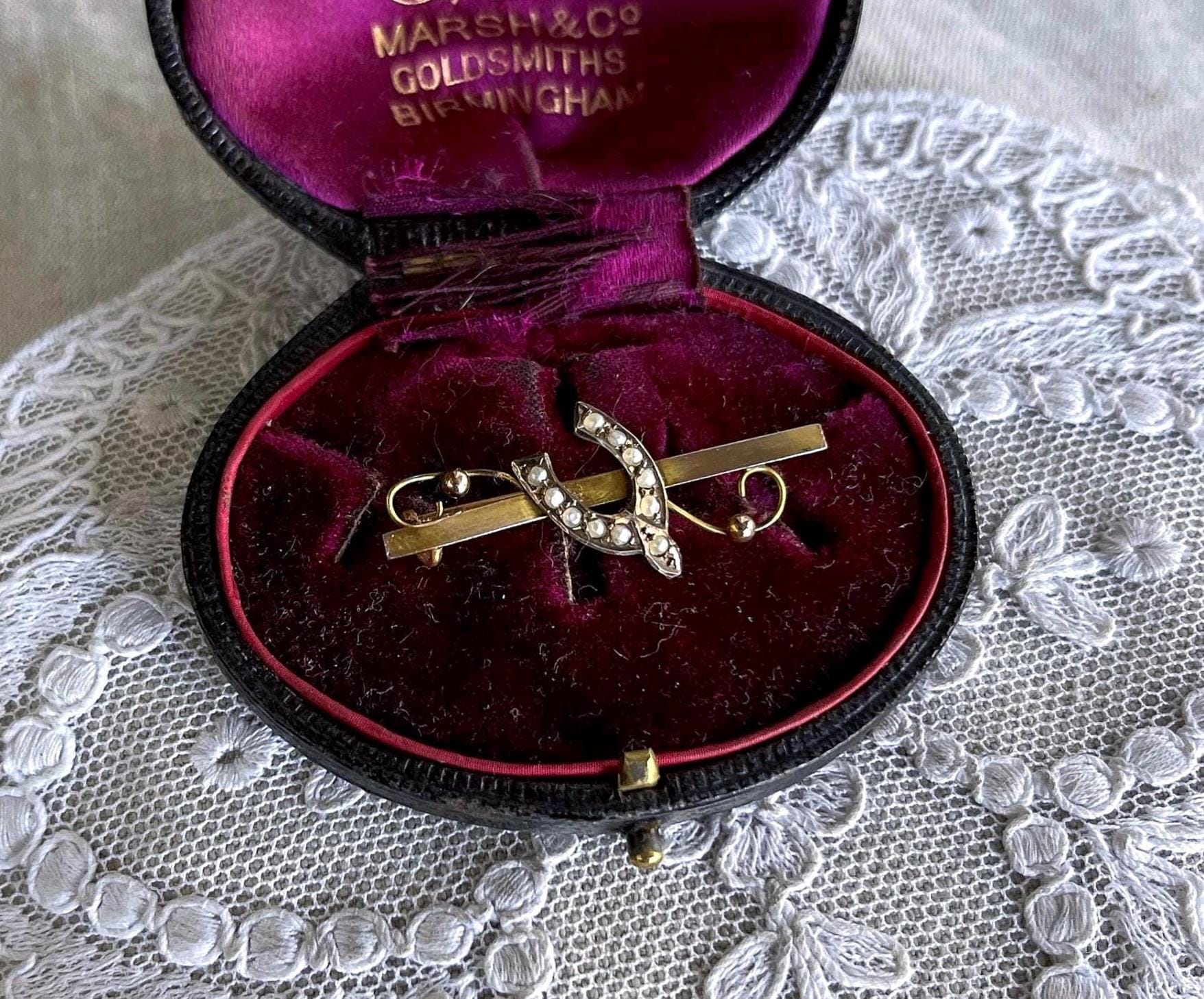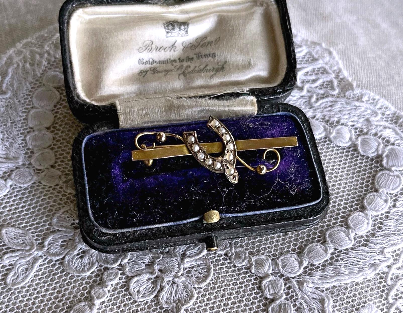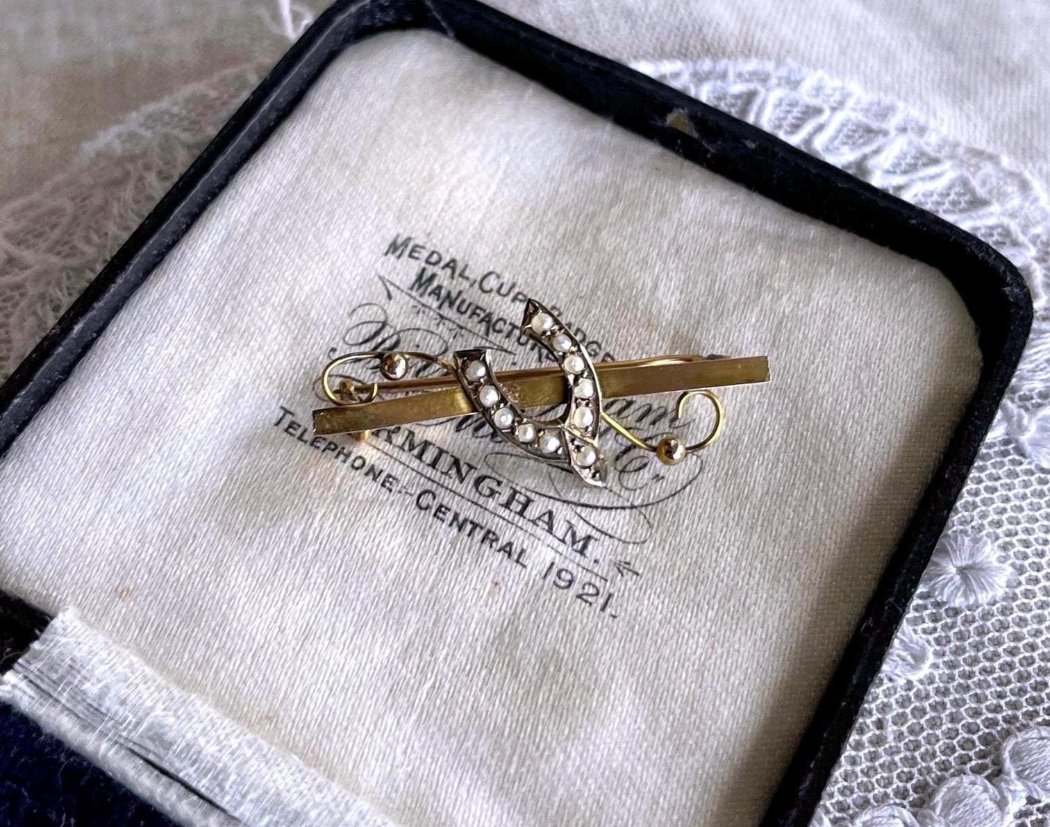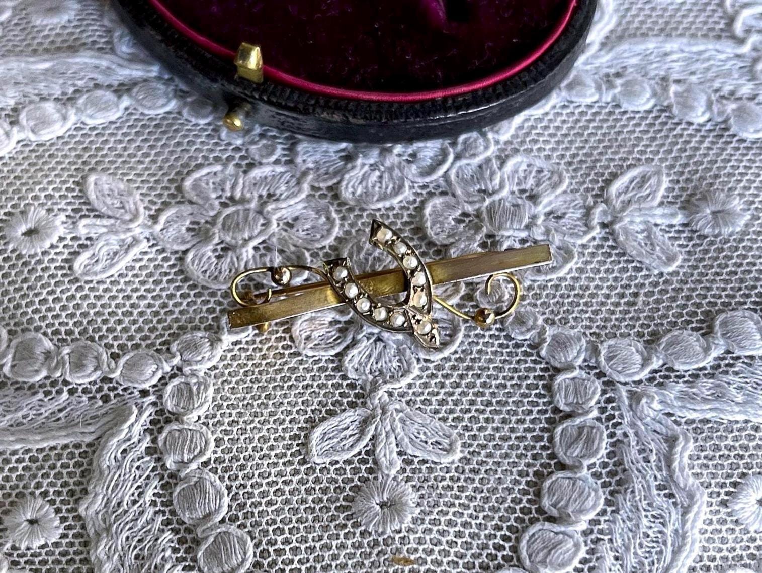 Featuring a lovely antique Victorian 9K 375 yellow gold Horseshoe Lapel brooch adorned with luminous genuine seed pearls set in closed back settings. Brooch measure approximately 1 inch long at 1.36 grams respectively and is in excellent vintage condition, with all stones intact, hallmarked on the reverse. A charming piece, ready to wear and pass on for generations.