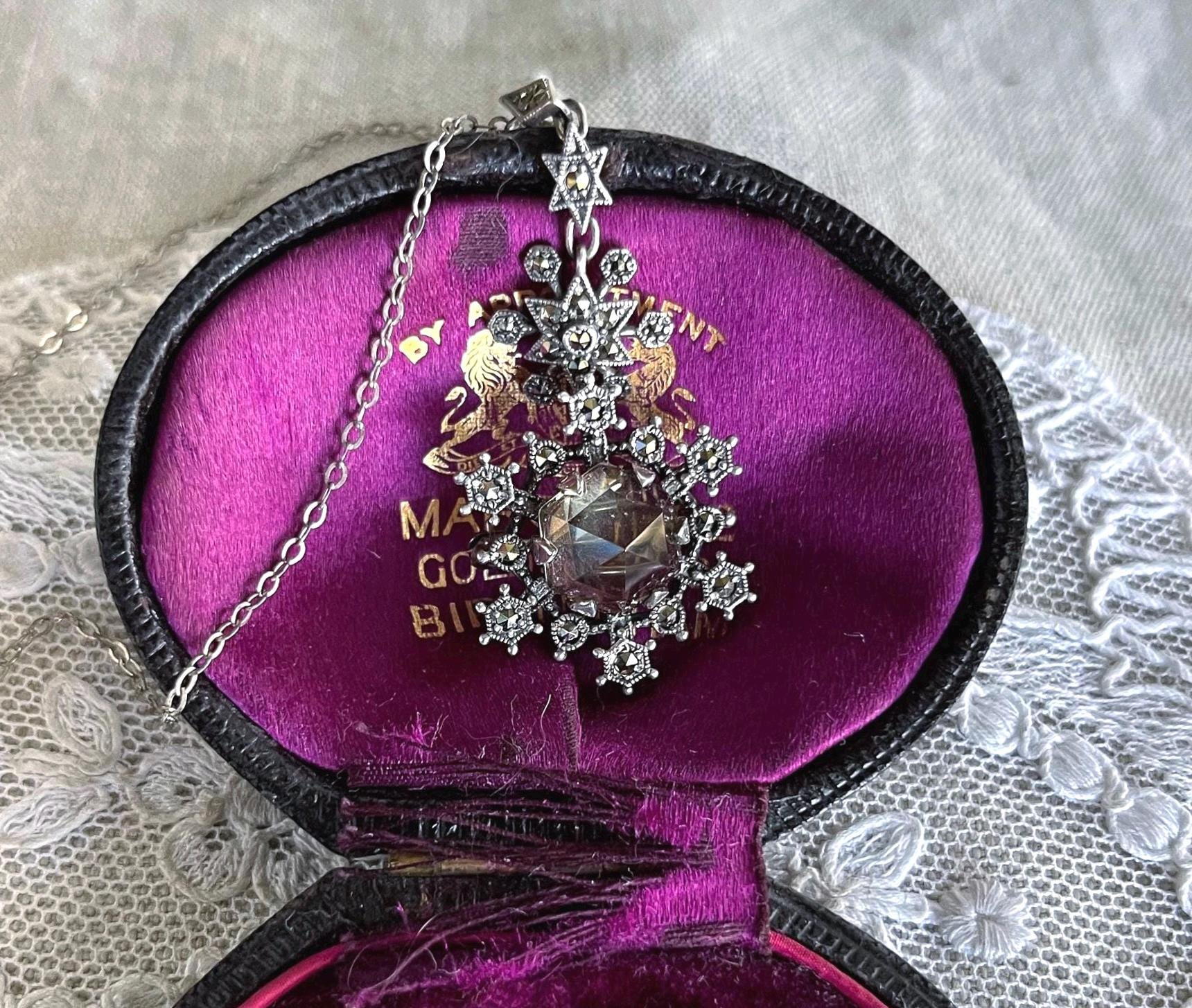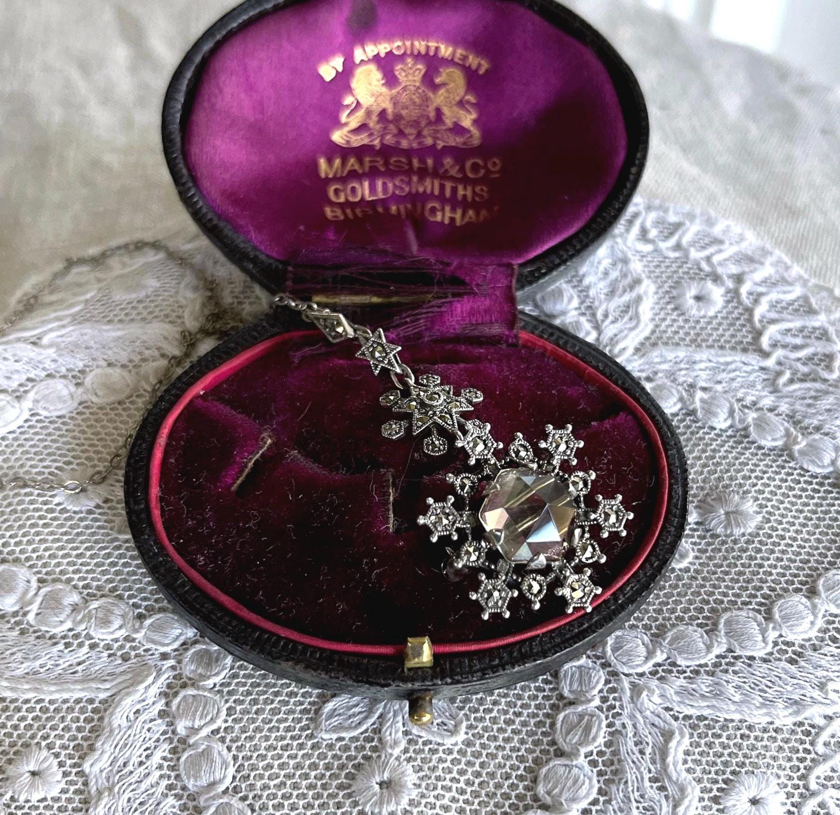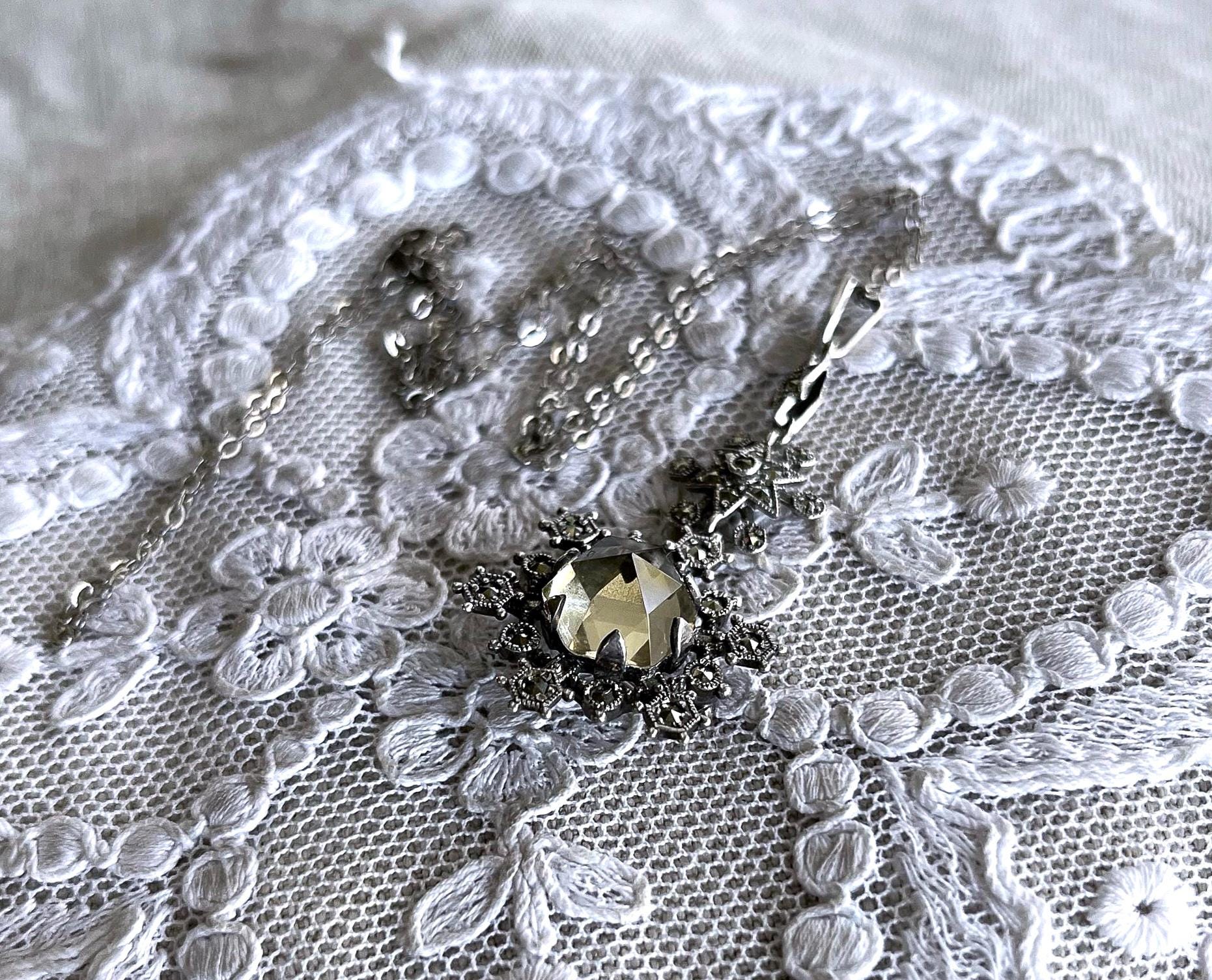 Featuring a beautiful ornate vintage Edwardian revival sterling silver dazzling Brooch pendant necklace adorned with luminous genuine Citrine gemstone accented with sparkling Marcasite crystals set in an amazing ornate setting. Necklace measures approximately 18 inches around with pendant measuring 2.2 inches at 5.92 grams respectively. In excellent vintage condition with a functional clasp on brooch and chain, a nice patina with all stones intact and accounted for. Beautifully designed, collectible and always appreciating! Wear as an amazing necklace or as a majestic brooch, ready to pass on for generations.