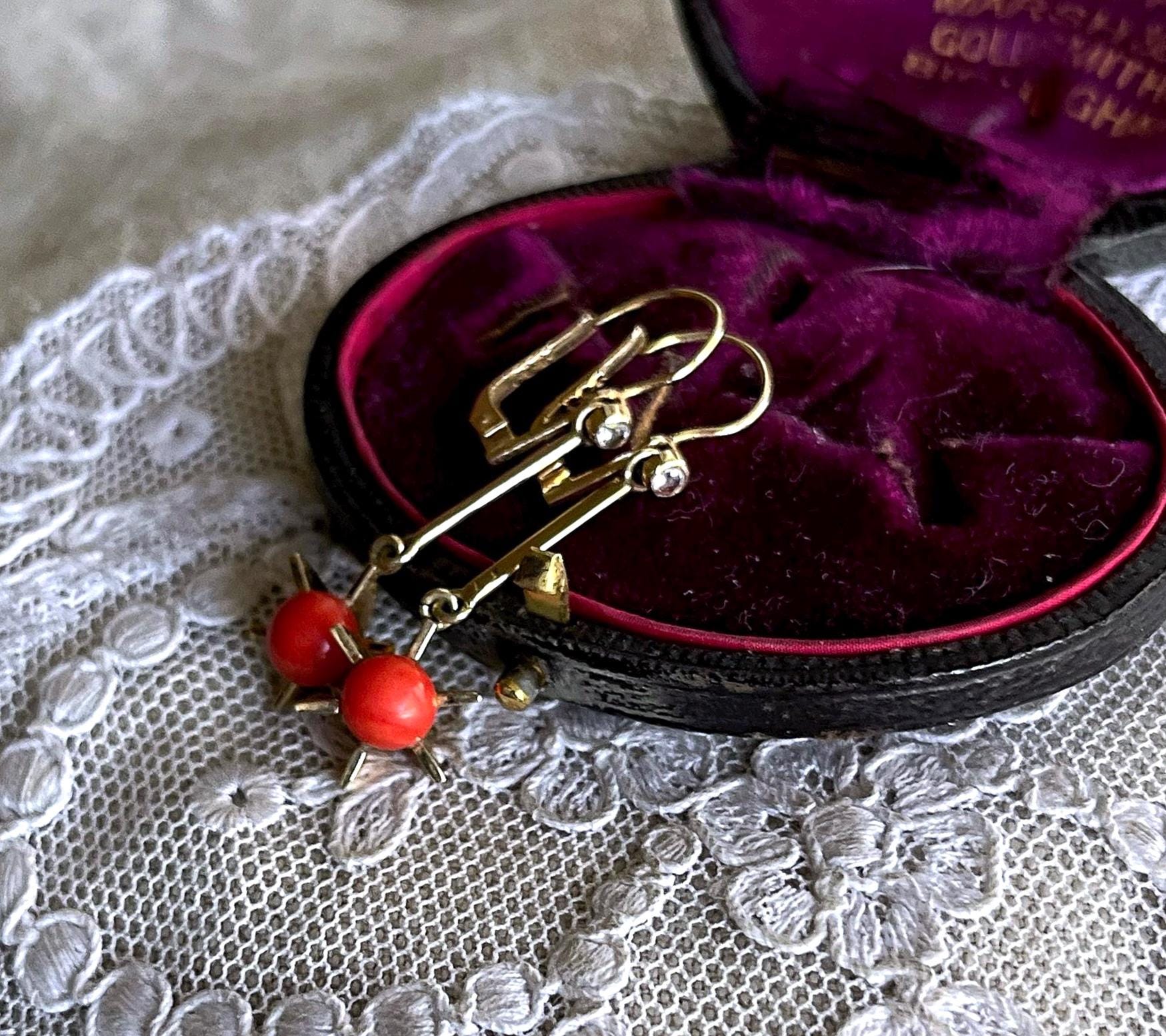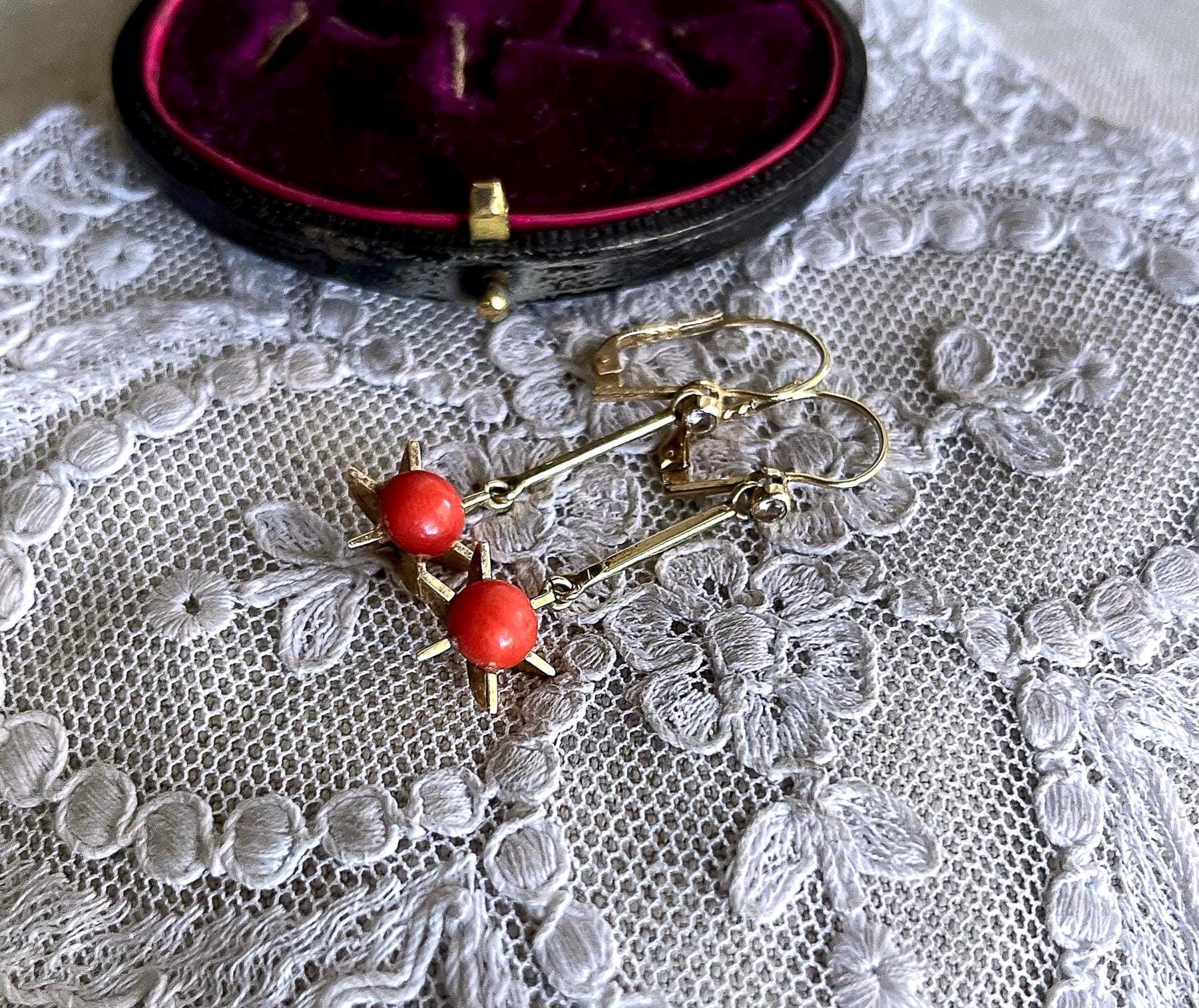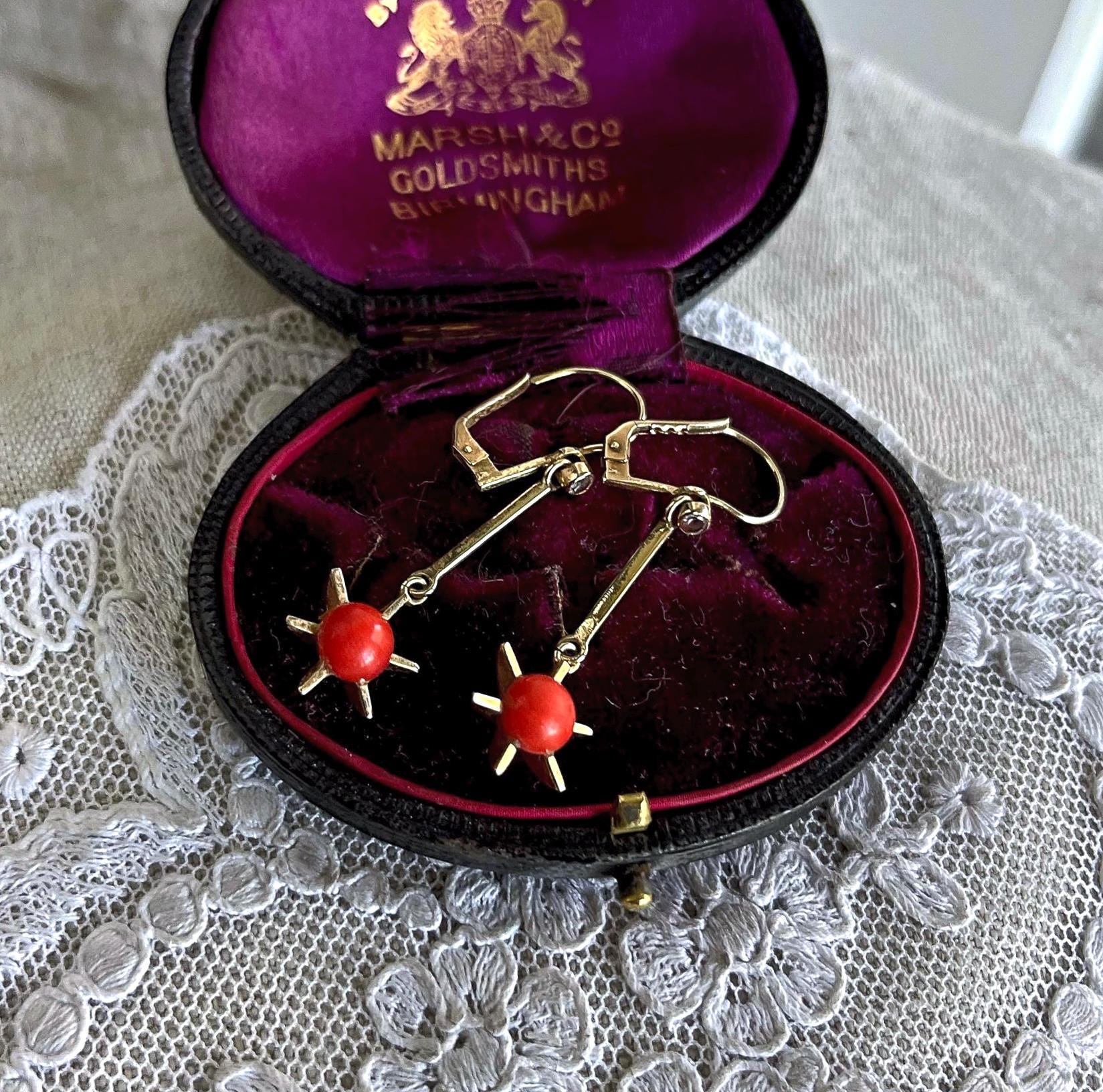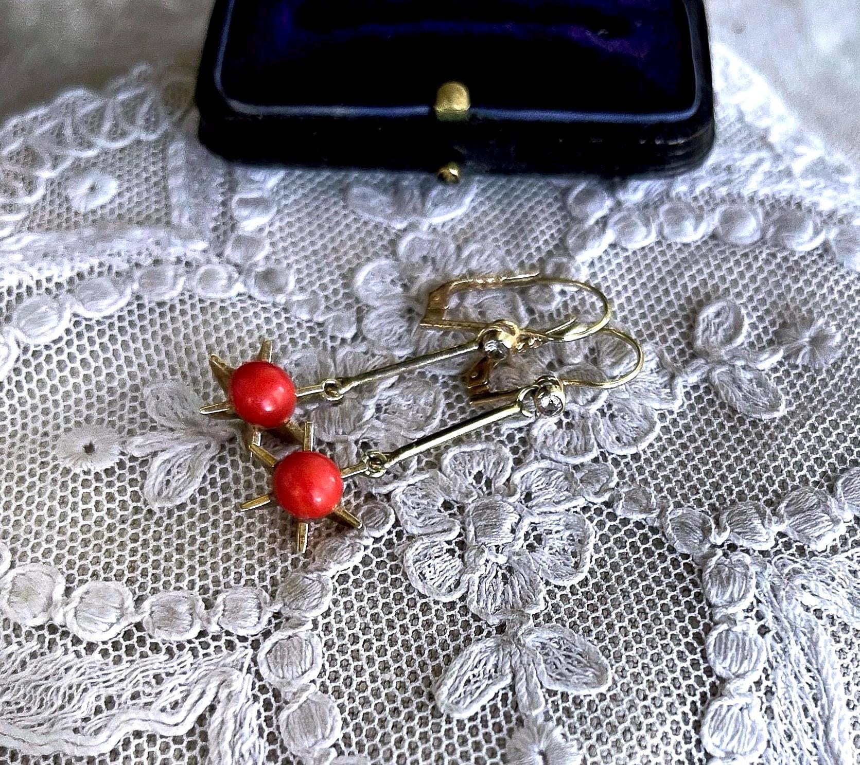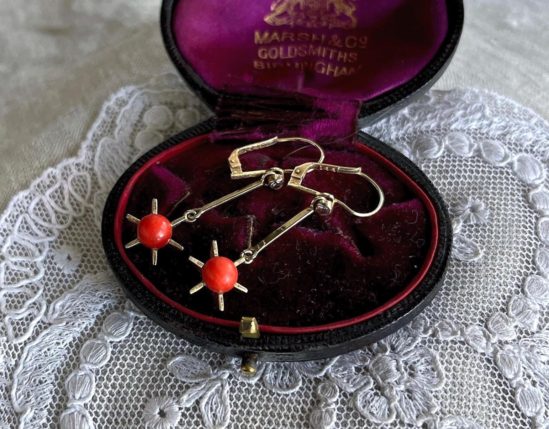 Featuring a fabulous pair of 12K yellow gold pierced starburst drop earrings adorned with genuine luminous Coral stones accented with brilliant sparkling white spinel gemstones. Earrings measure approximately 1.4 inches long at 3.38 grams respectively. Both pieces are in excellent condition with normal wear with all stones intact and accounted for, faintly hallmarked on clasps, tested as 12k. An elegant collectible pair of beautifully designed earrings!