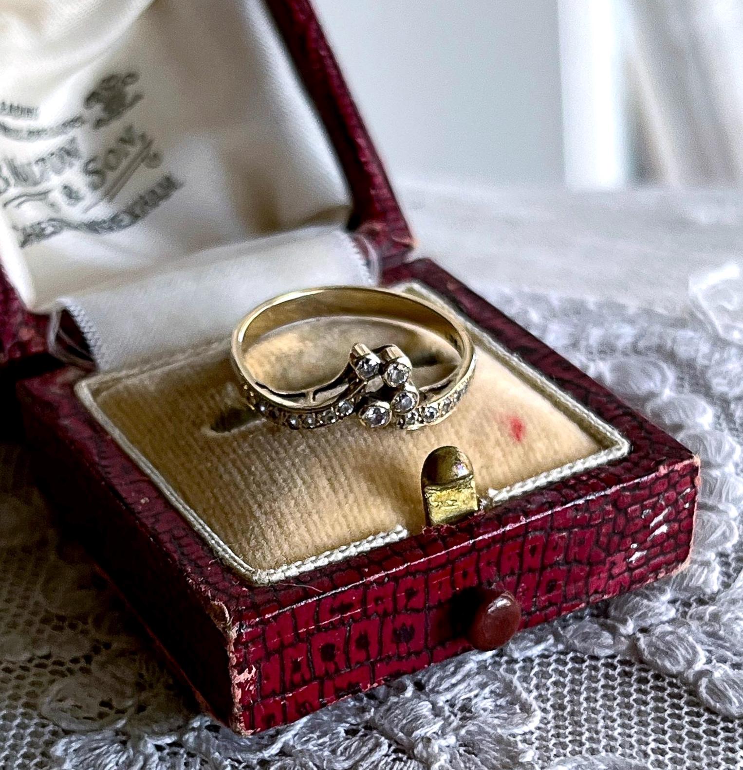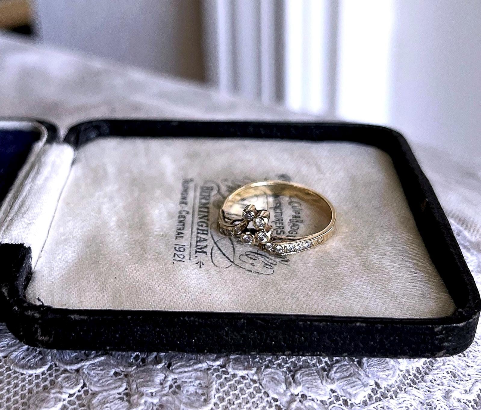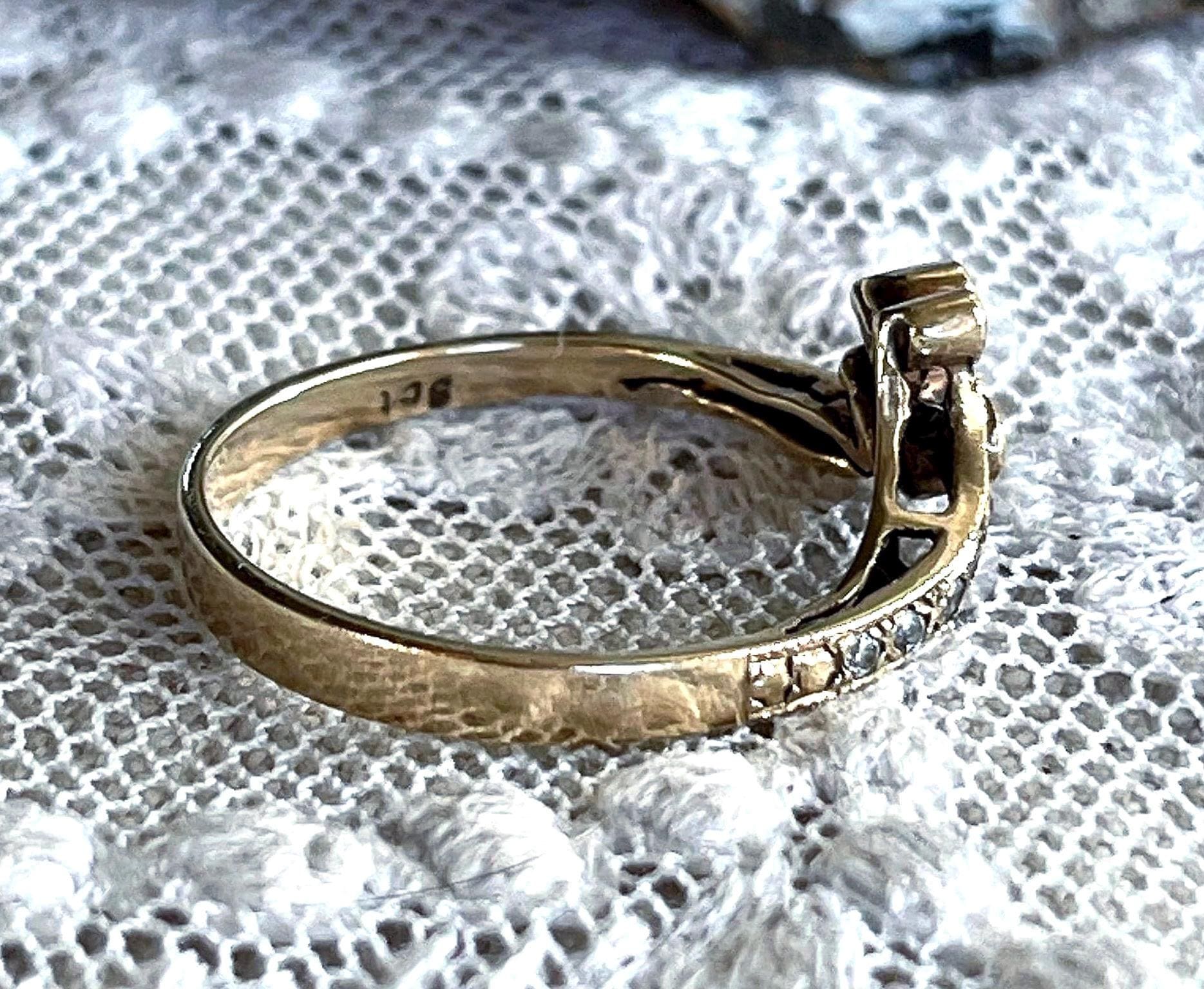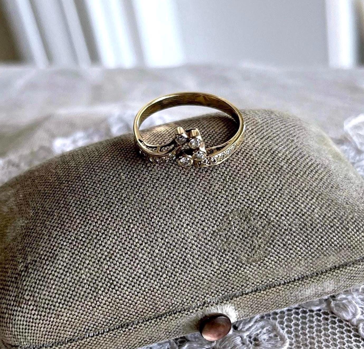 Featuring a beautiful vintage hallmarked 9k yellow gold size 7.5 cocktail ring adorned with genuine faceted Moissanite gemstones set in a decorative bezel settings. Ring is in excellent vintage condition with normal wear and all stones intact. Ring is approximately size 7.5 at 1.8 grams respectively and is hallmarked on the inside of band. A wonderful way to invest, a dazzling, unique piece.