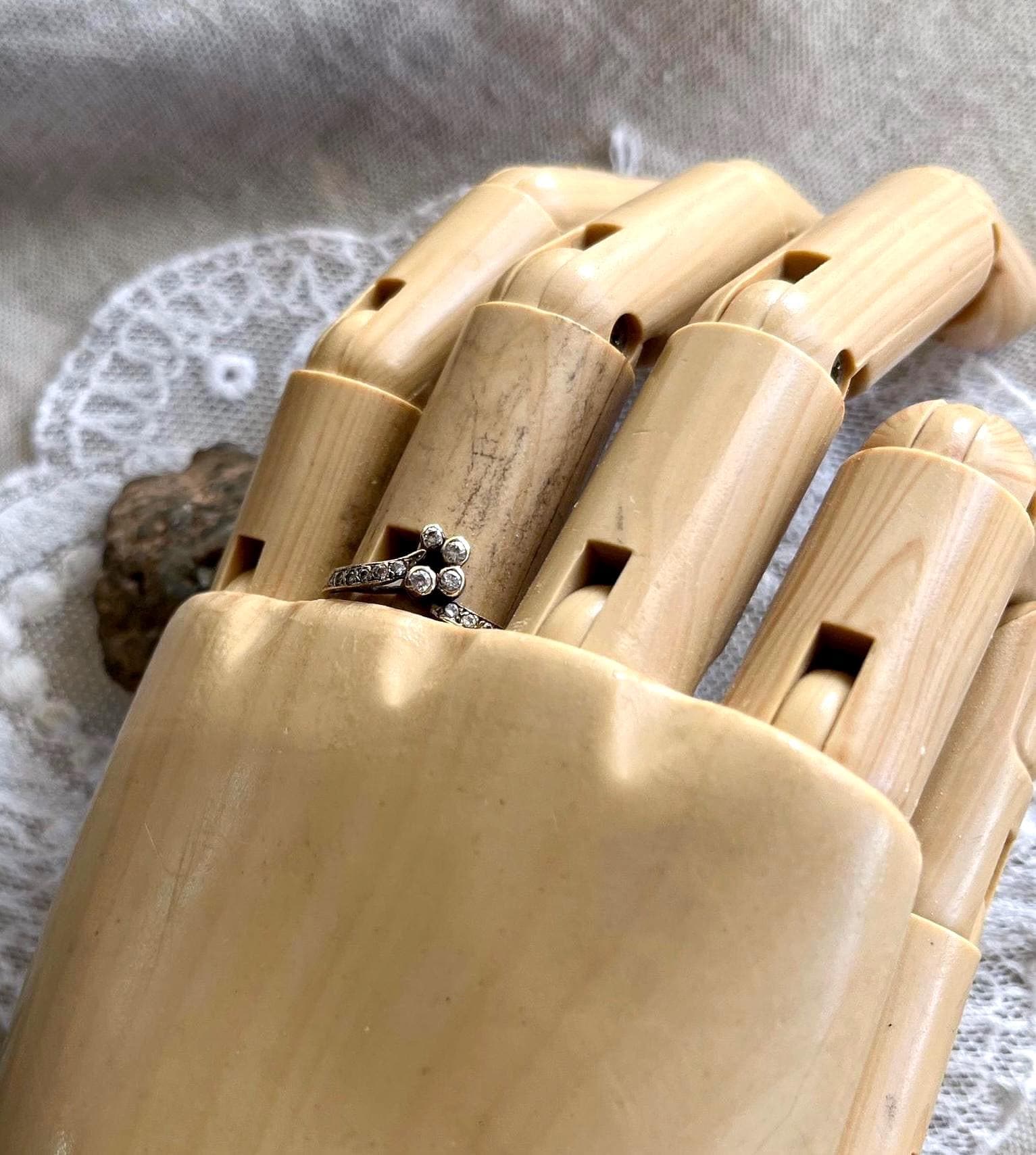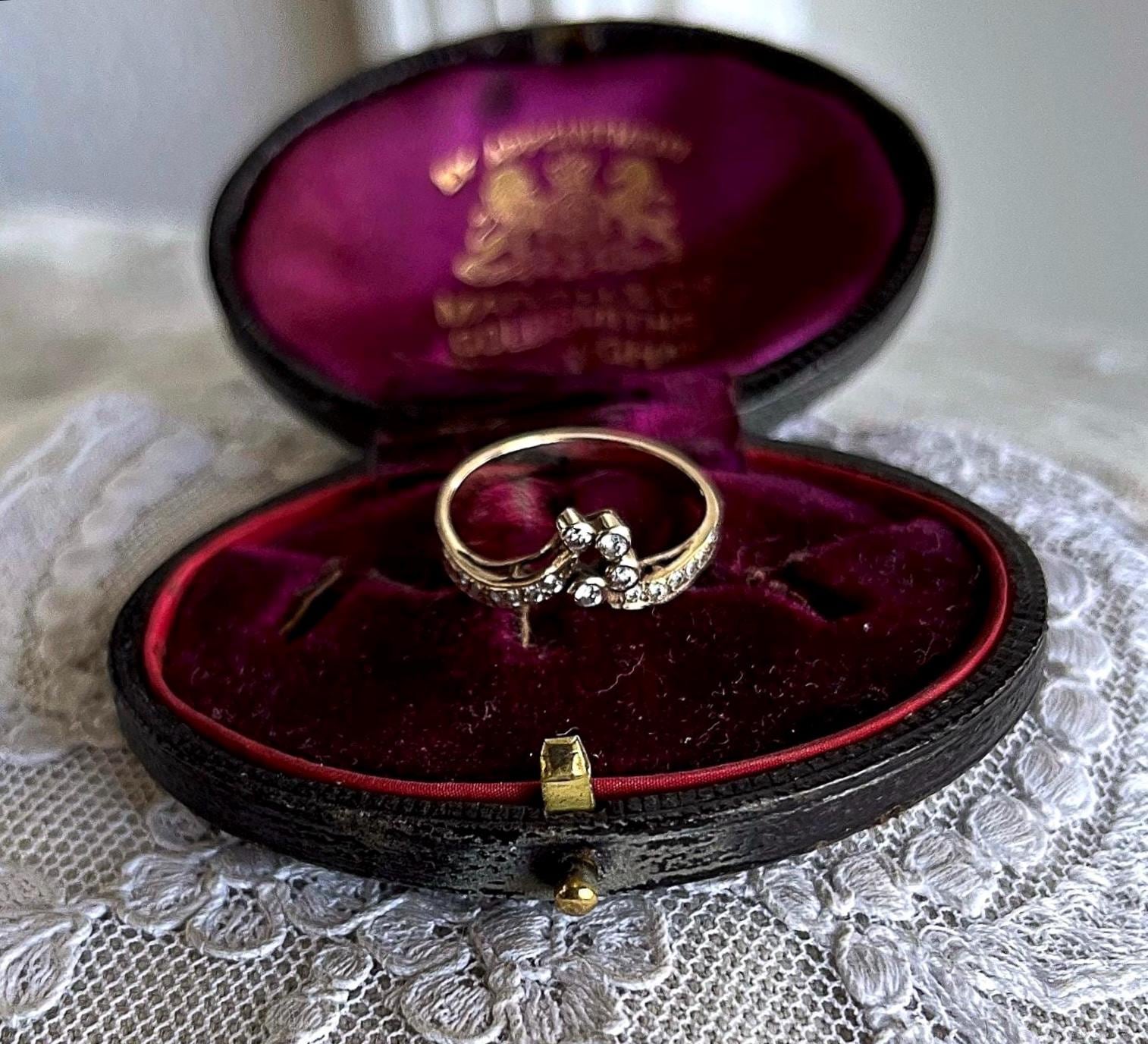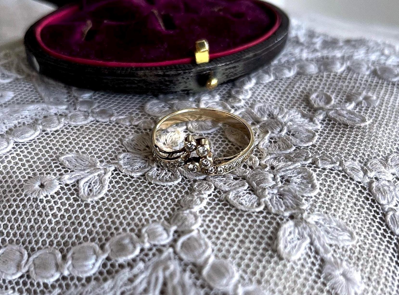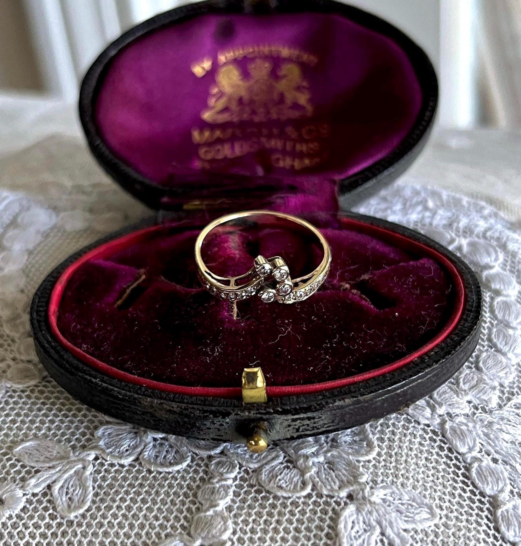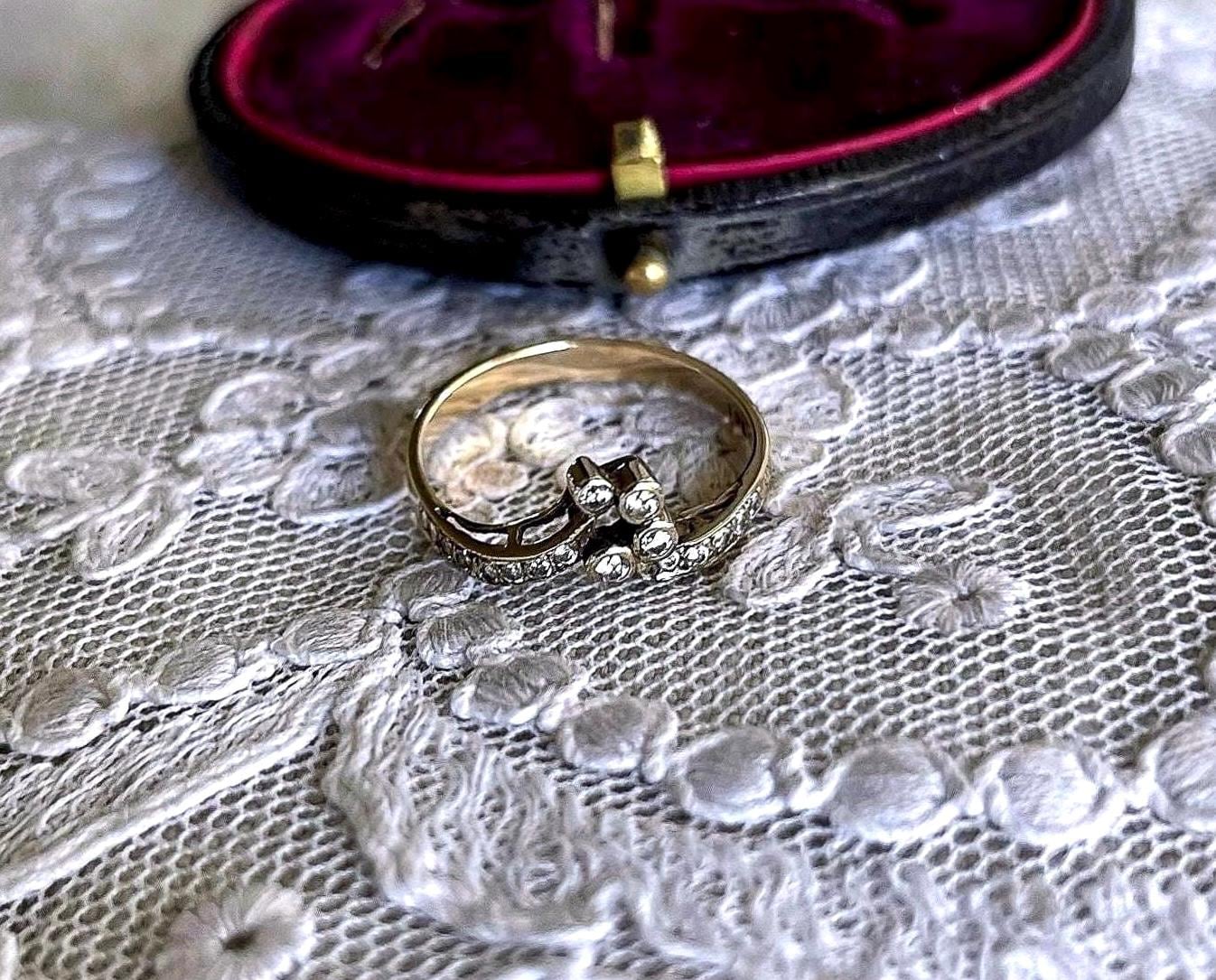 Featuring a beautiful vintage hallmarked 9k yellow gold size 7.5 cocktail ring adorned with genuine faceted Moissanite gemstones set in a decorative bezel settings. Ring is in excellent vintage condition with normal wear and all stones intact. Ring is approximately size 7.5 at 1.8 grams respectively and is hallmarked on the inside of band. A wonderful way to invest, a dazzling, unique piece.