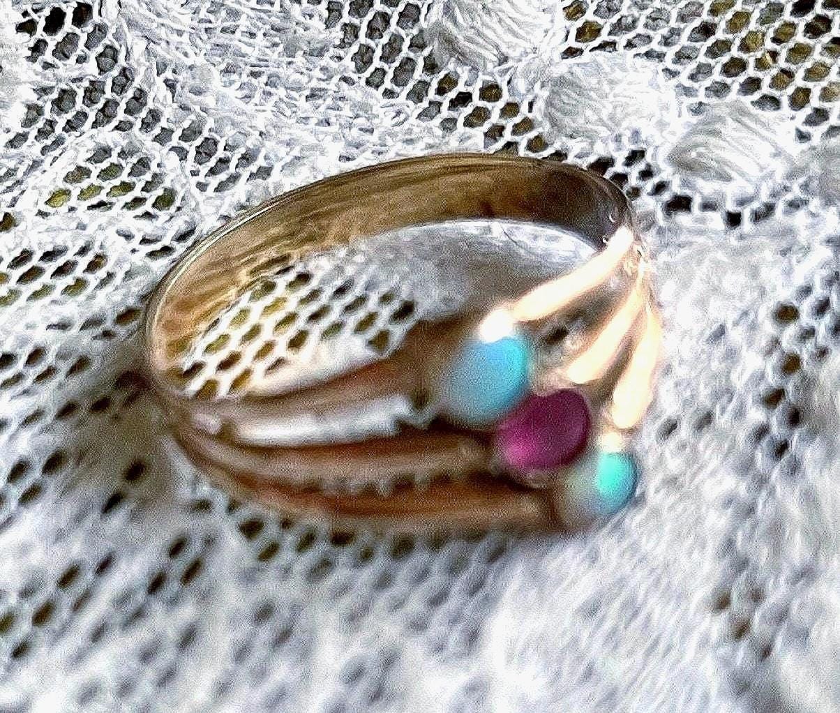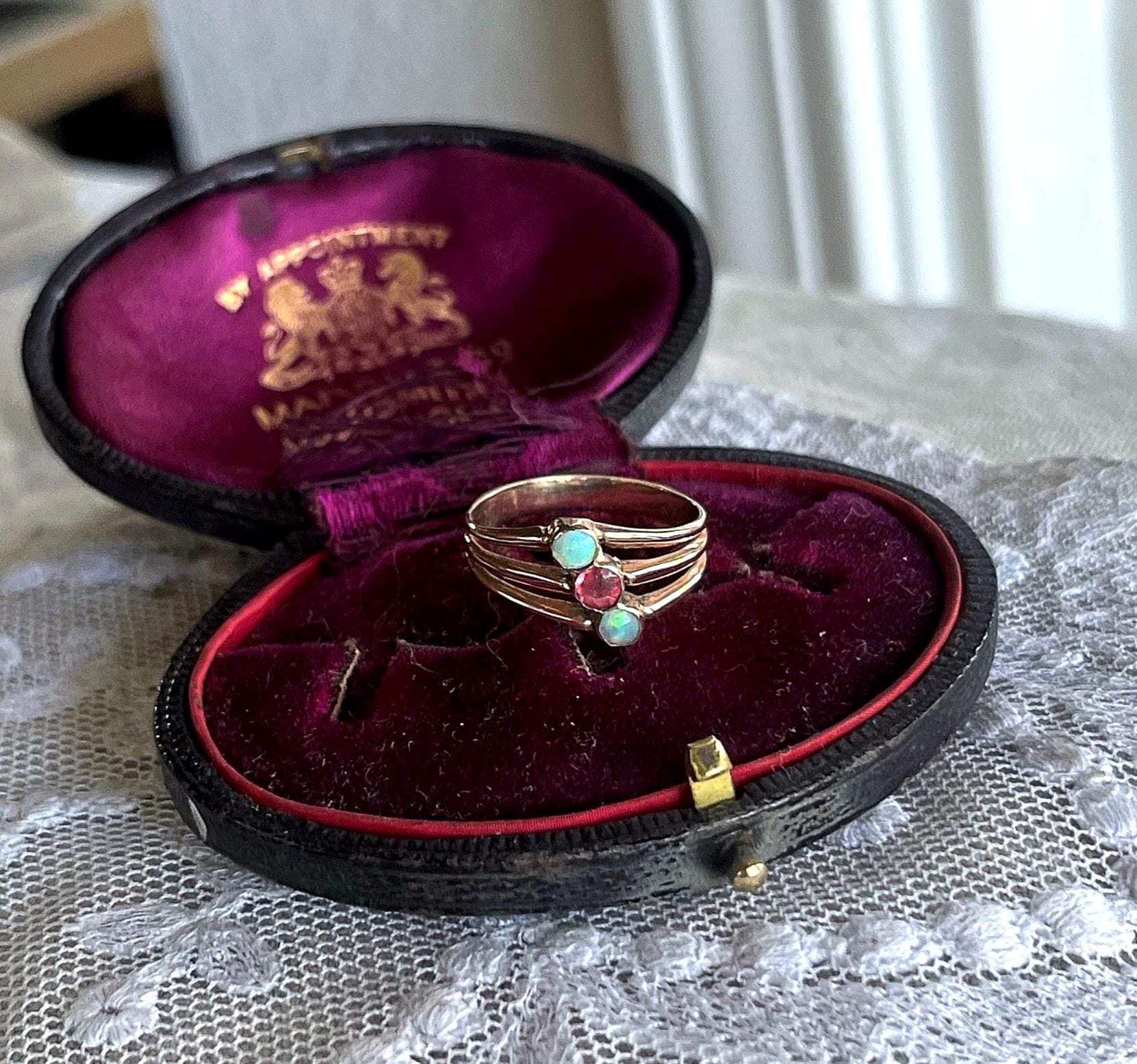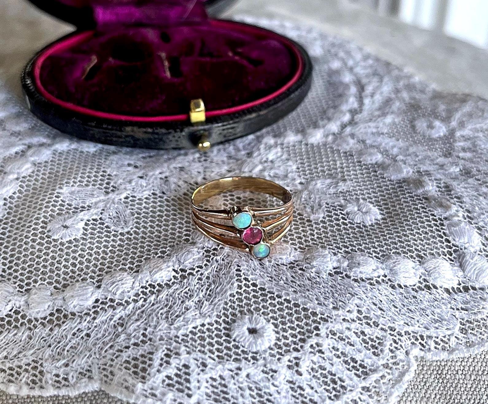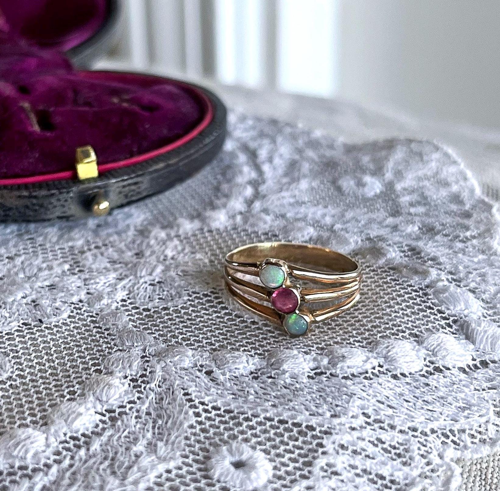 Featuring an absolutely gorgeous antique Victorian Era c. 1800s-1900 tested 10k rose gold size 6 multi stone ring adorned with two luminous genuine opals flanking a beautiful ruby seed bead. Ring is in excellent antique condition with normal wear with stones intact and accounted for. At approximately size 6 at 1.6 grams this wonderful piece has a worn hallmark and tested at 10k. Beautifully crafted over 120 years ago, ready to wear and pass on for generations!