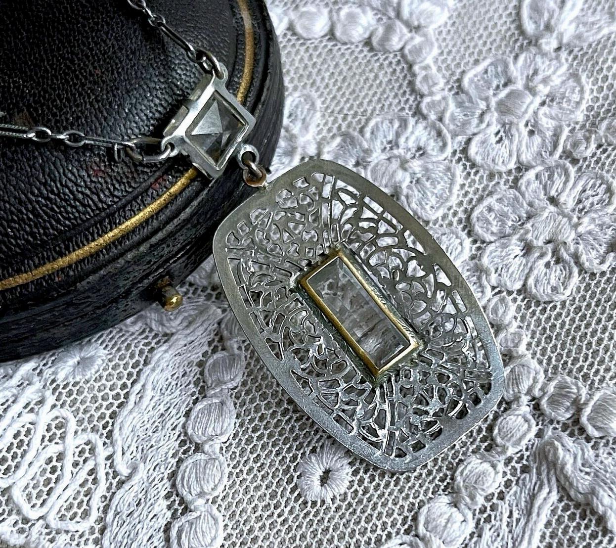 Featuring a decorative vintage Art Deco rhodium plated filigree and chain adorned with a beautiful faceted emerald cut clear crystal and a brilliant square crystal accent. Necklace is in excellent condition with working C spring clasp, minimal wear with all stones intact. Measuring approximately 17 inches around with a 2 inch pendant drop at 5.73 grams respectively,this is a lovely vintage piece, delicate yet bold! Collectible and wearable!