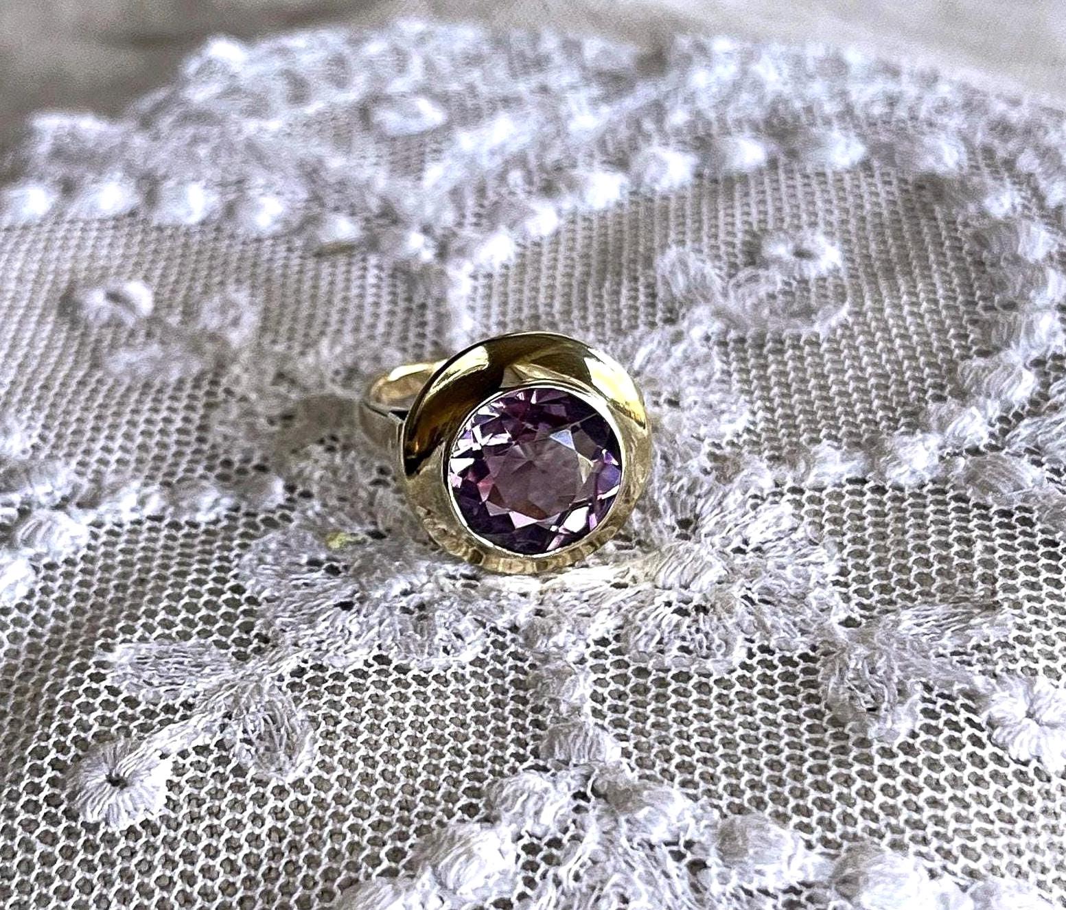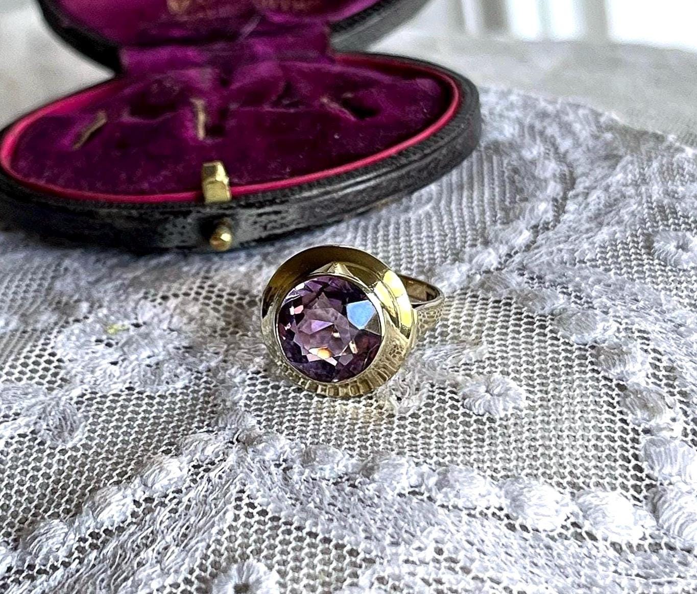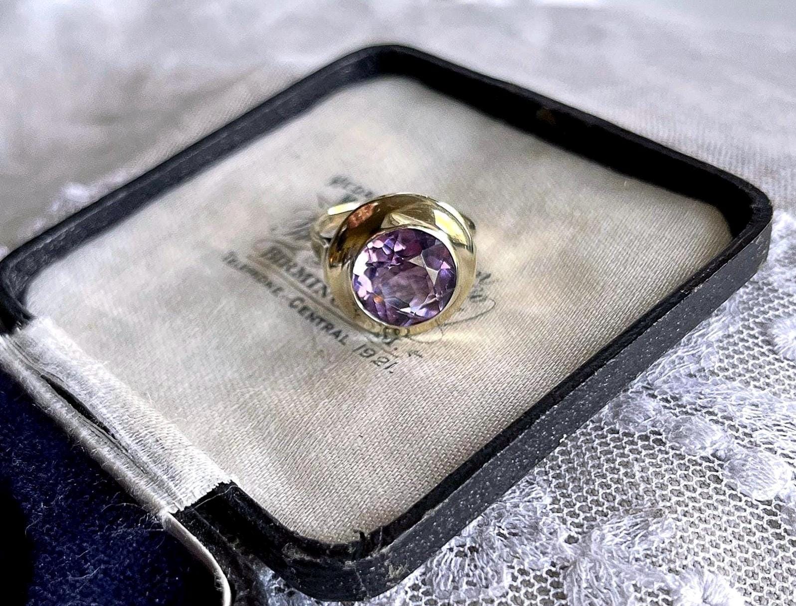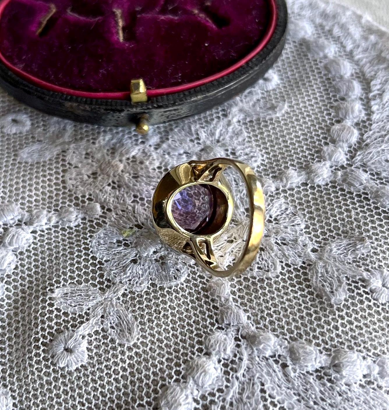 Featuring a gorgeous Mid Century vintage 8K 333 yellow gold Cocktail ring adorned with a genuine faceted Amethyst gemstone stone set in a beautiful open back bezel setting. Ring is in beautiful condition with normal wear, stamped 333 on the inside of band with stone intact and brilliant. Approximately size 6 at 3.5 grams respectively this is a collectible wearable Heirloom piece, beautifully designed!