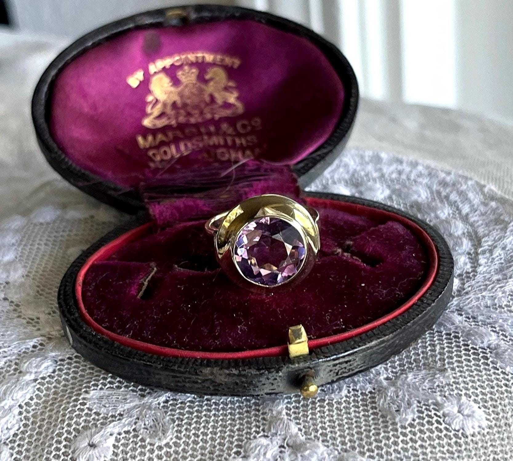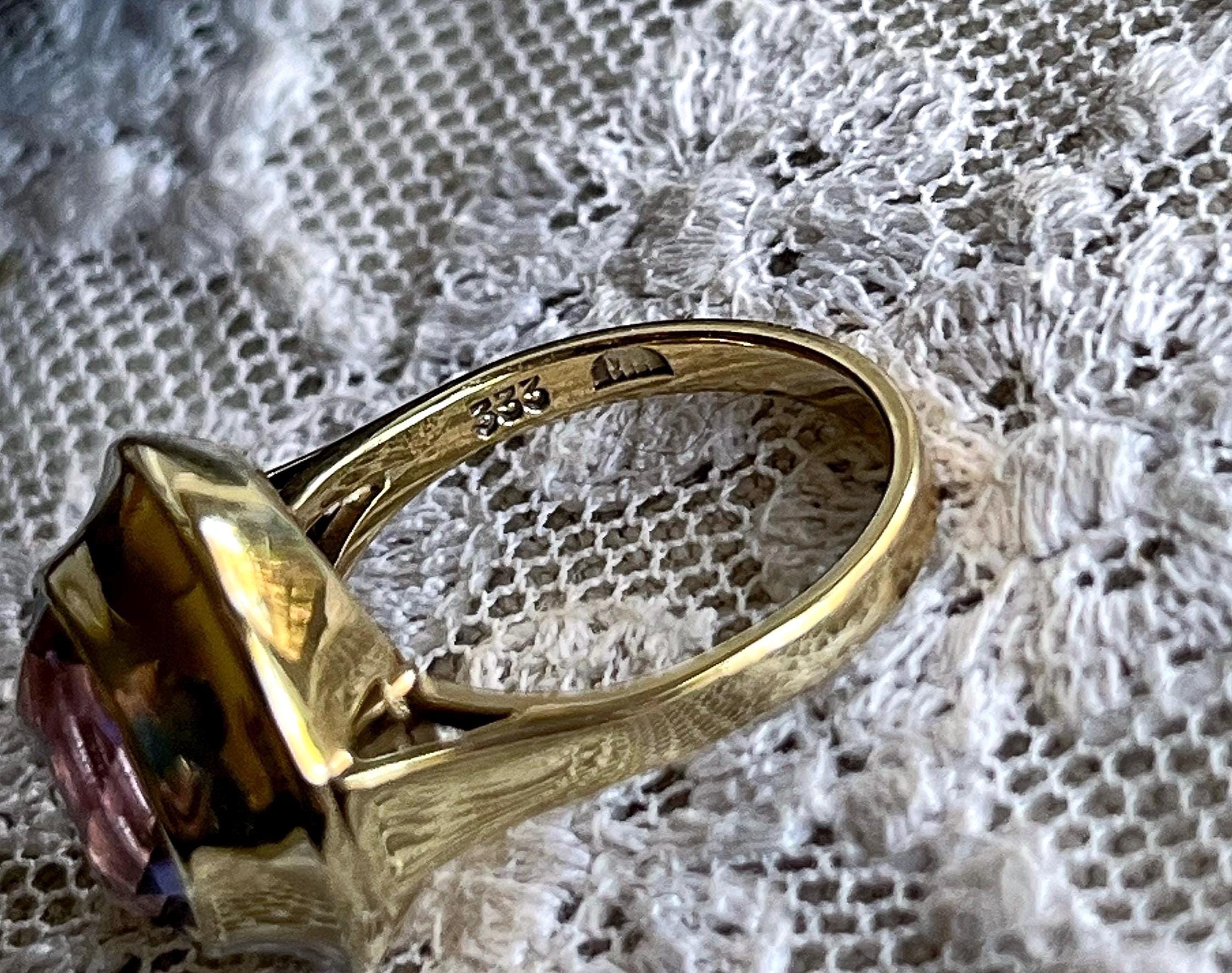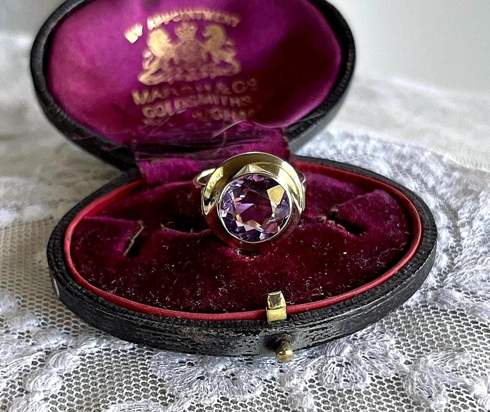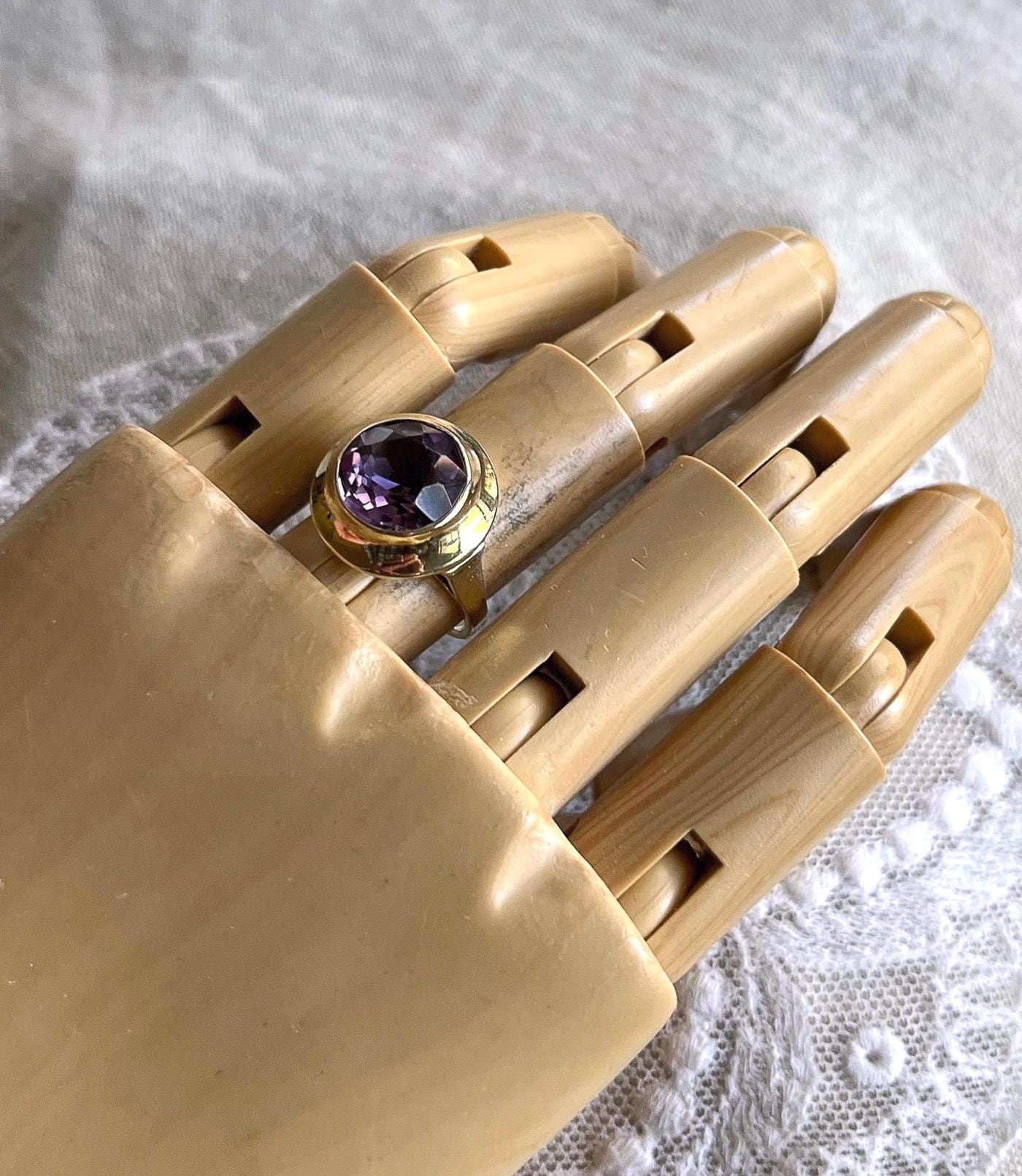 Featuring a gorgeous Mid Century vintage 8K 333 yellow gold Cocktail ring adorned with a genuine faceted Amethyst gemstone stone set in a beautiful open back bezel setting. Ring is in beautiful condition with normal wear, stamped 333 on the inside of band with stone intact and brilliant. Approximately size 6 at 3.5 grams respectively this is a collectible wearable Heirloom piece, beautifully designed!