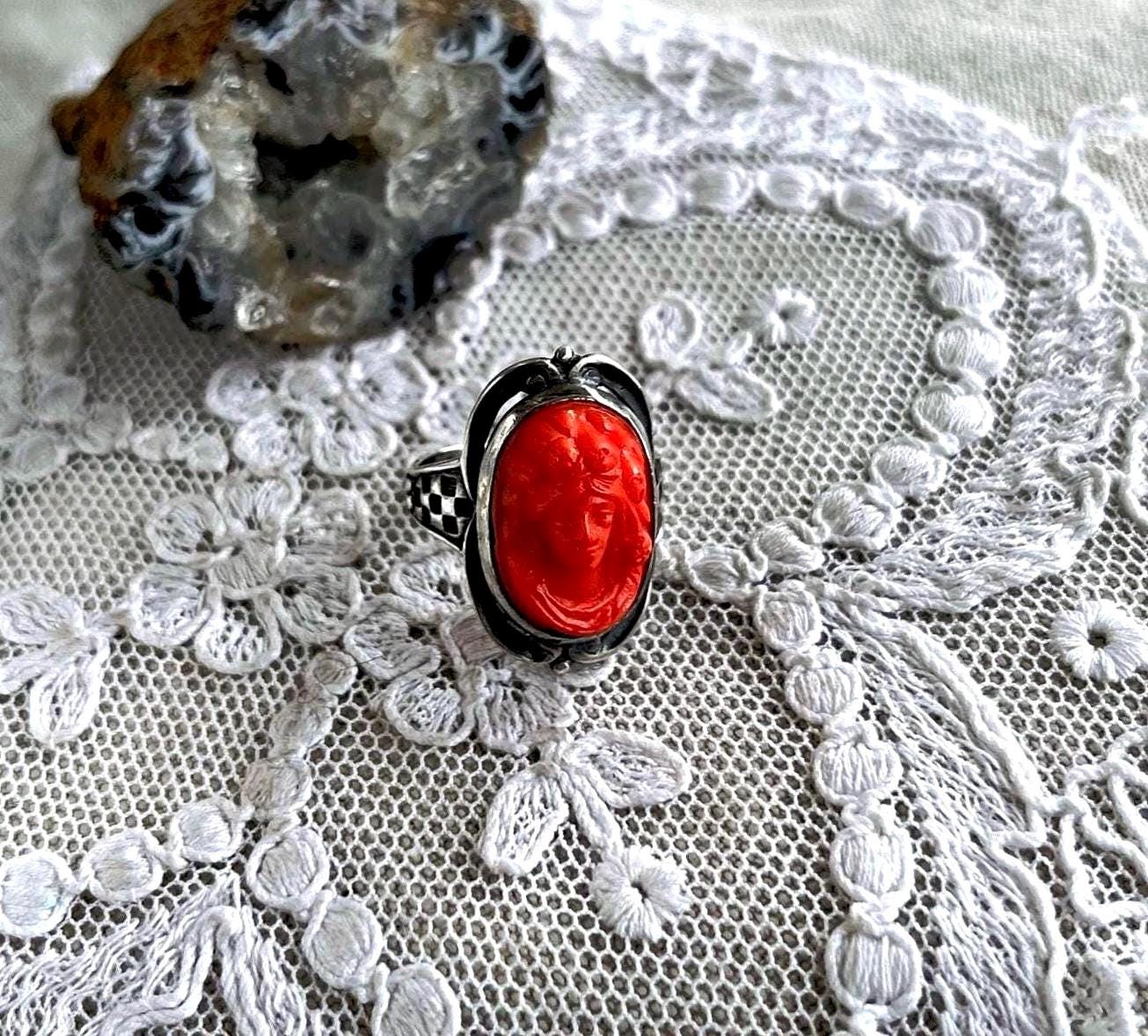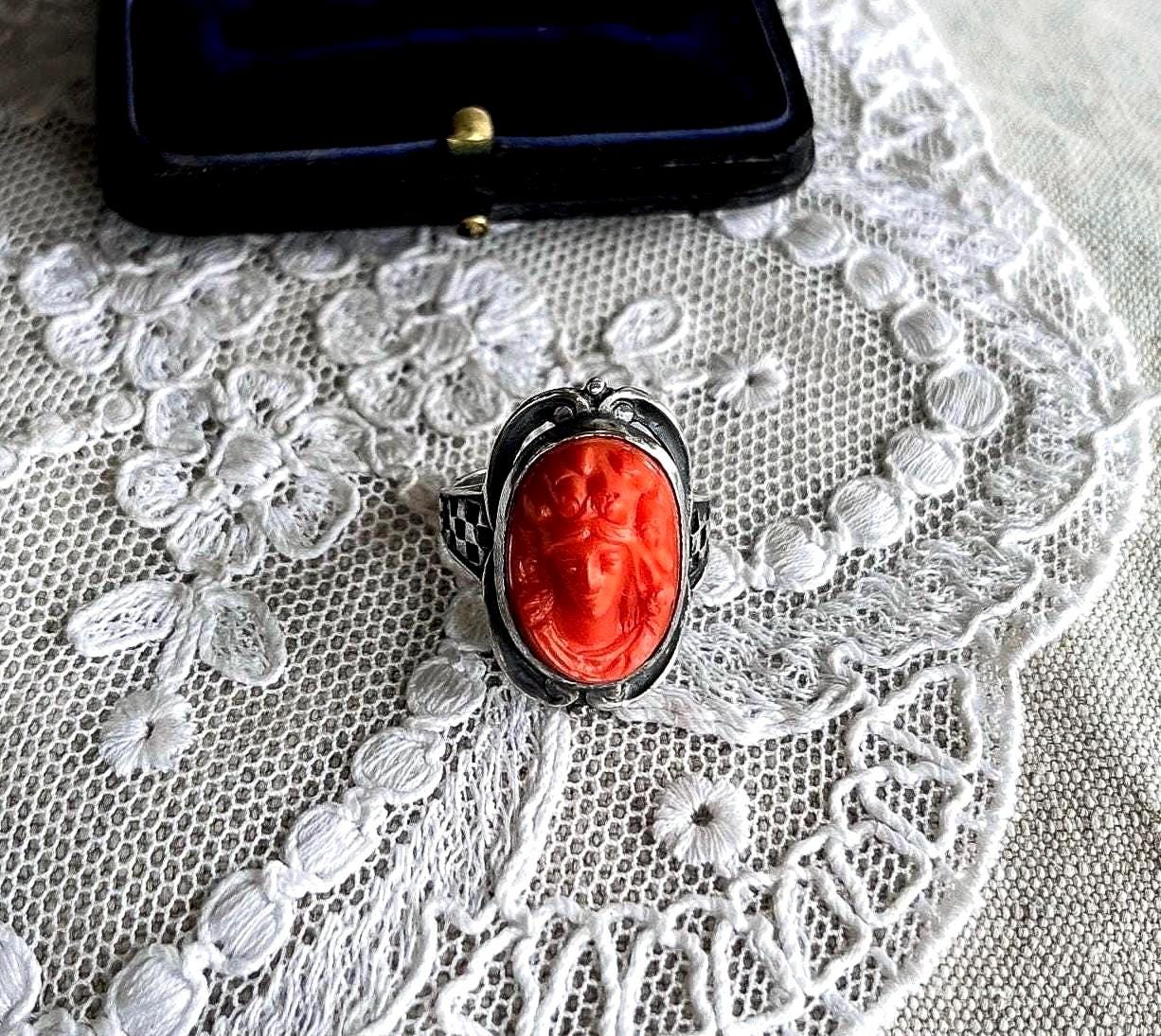 Featuring a distinctive antique Victorian 1880s sterling silver ring adorned with a beautifully carved Coral Glass Cameo set in a closed back setting. Ring is in excellent antique condition with a lovely patina, normal wear with Cameo intact. Ring is approximately size 5.5 at 3.7 grams respectively hallmarked on the inside of band. Beautifully designed, a truly unique antique piece, collectible and wearable!