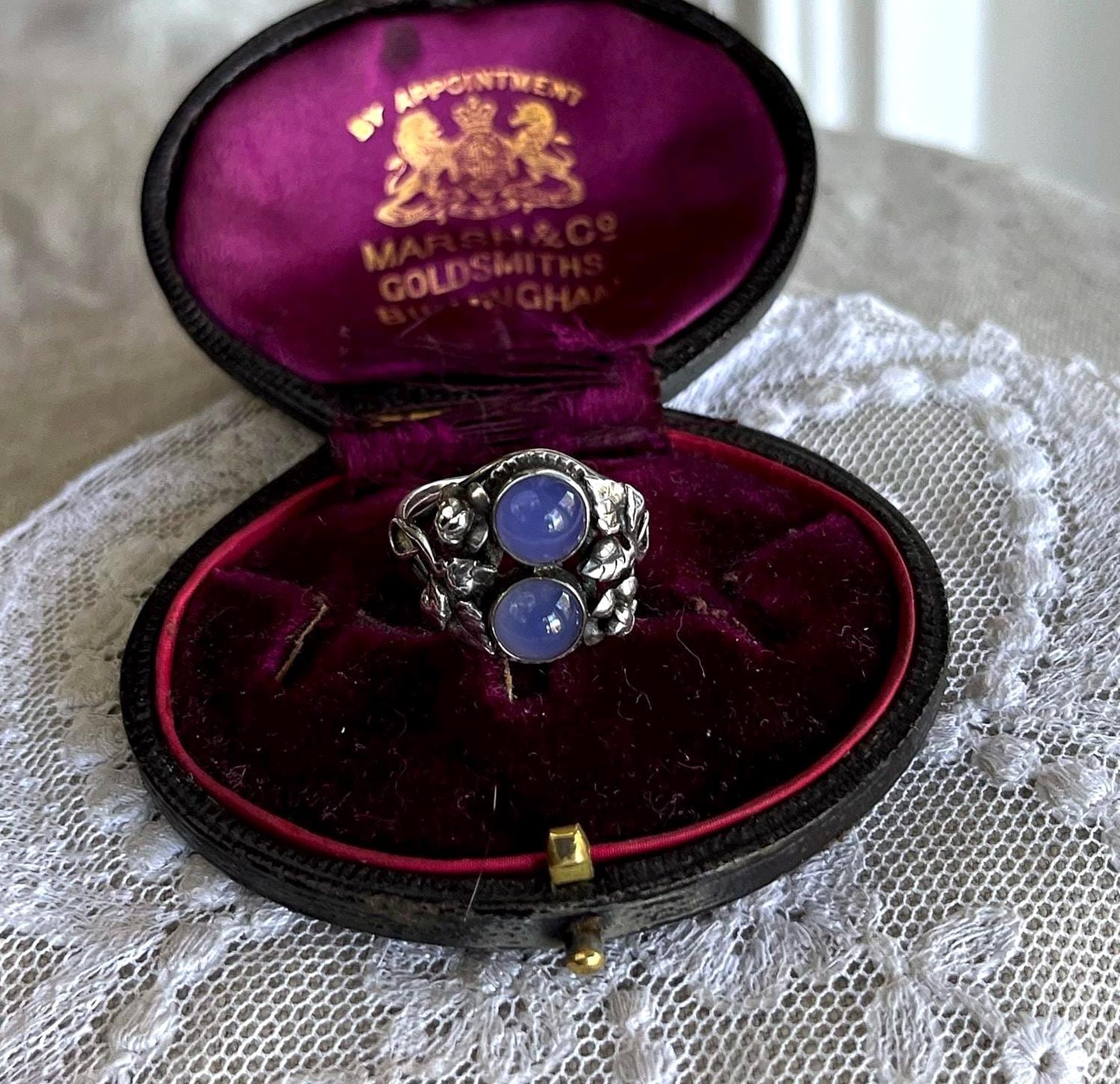 Featuring an amazing antique German Arts and Crafts Sterling Silver floral motif statement Ring adorned with a spectacular luminous Blue Chalcedony cabochons set in an organic floral sterling setting. Ring is approximately size 5.5 at 2.77 grams respectively and is in excellent antique condition with a beautiful patina and all components intact, stamped STERLING/GERMANY on the inside of band. This unique antique piece is absolutely stunning!