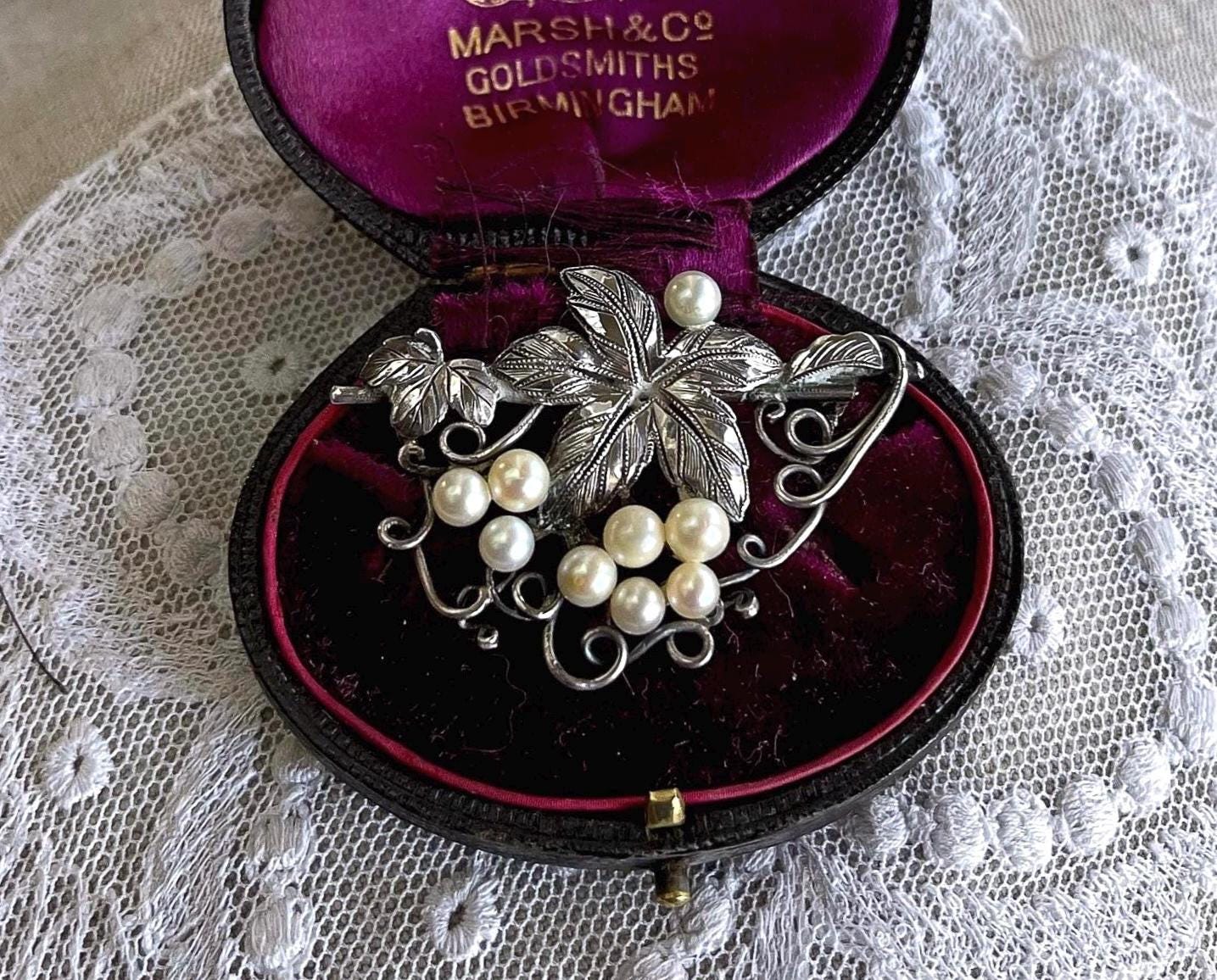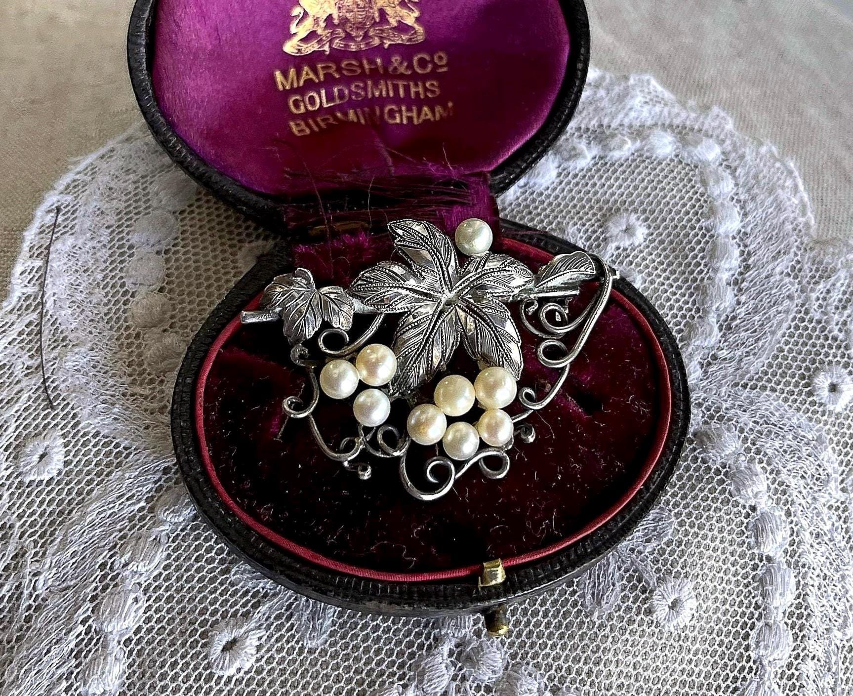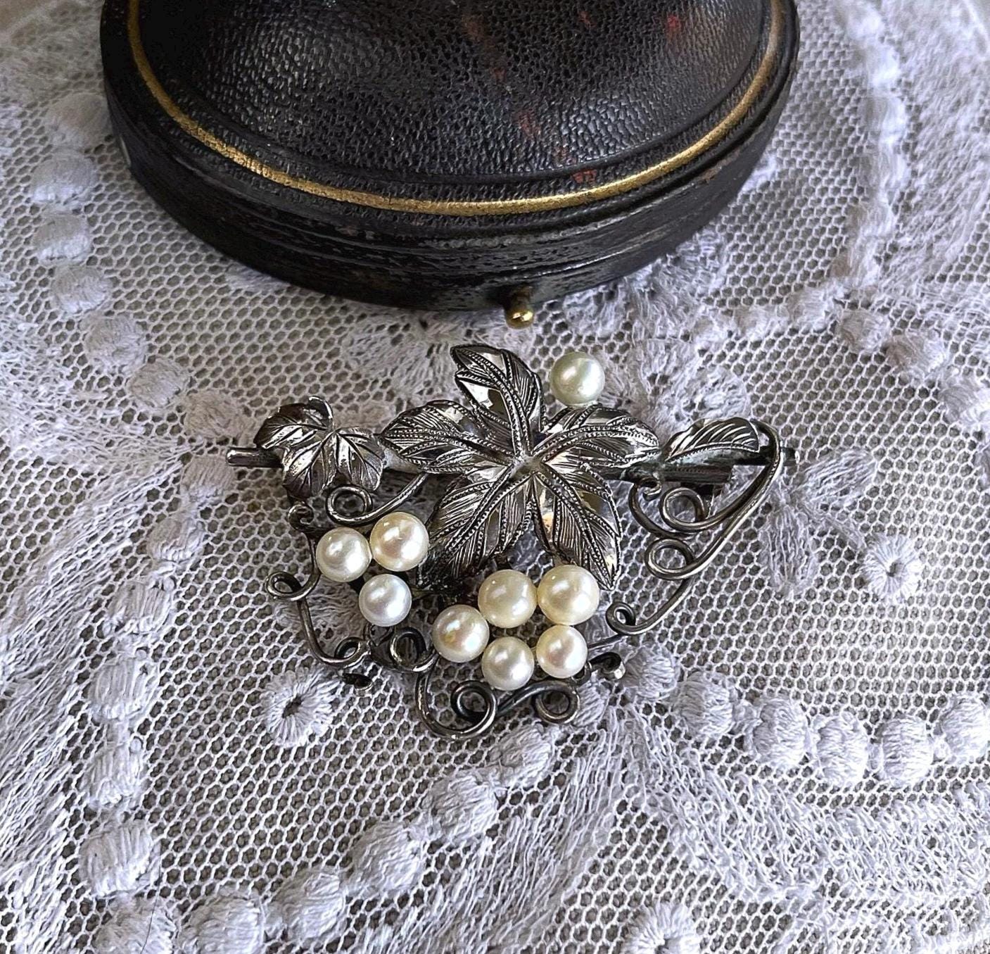 Featuring a charming vintage Mid Century 1940s Floral Motif solid sterling silver handcrafted brooch adorned with luminous genuine Cultured Pearls set in a decorative ornate sterling setting. Brooch measures approximately 2 inches at 9.1 grams respectively and is in excellent vintage condition with functional clasp, faintly signed on the reverse, tested as sterling . A lovely romantic vintage piece, ready to wear!